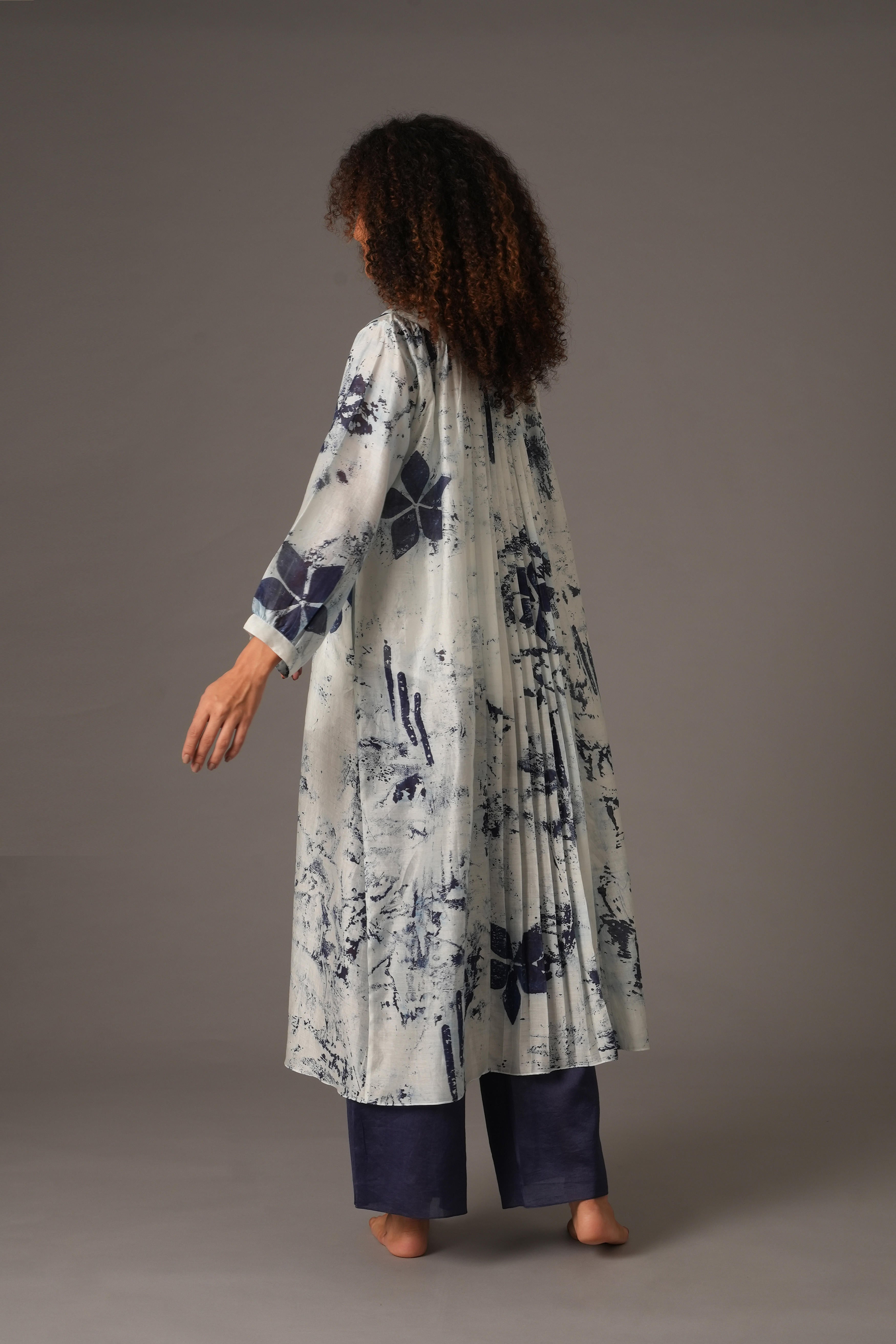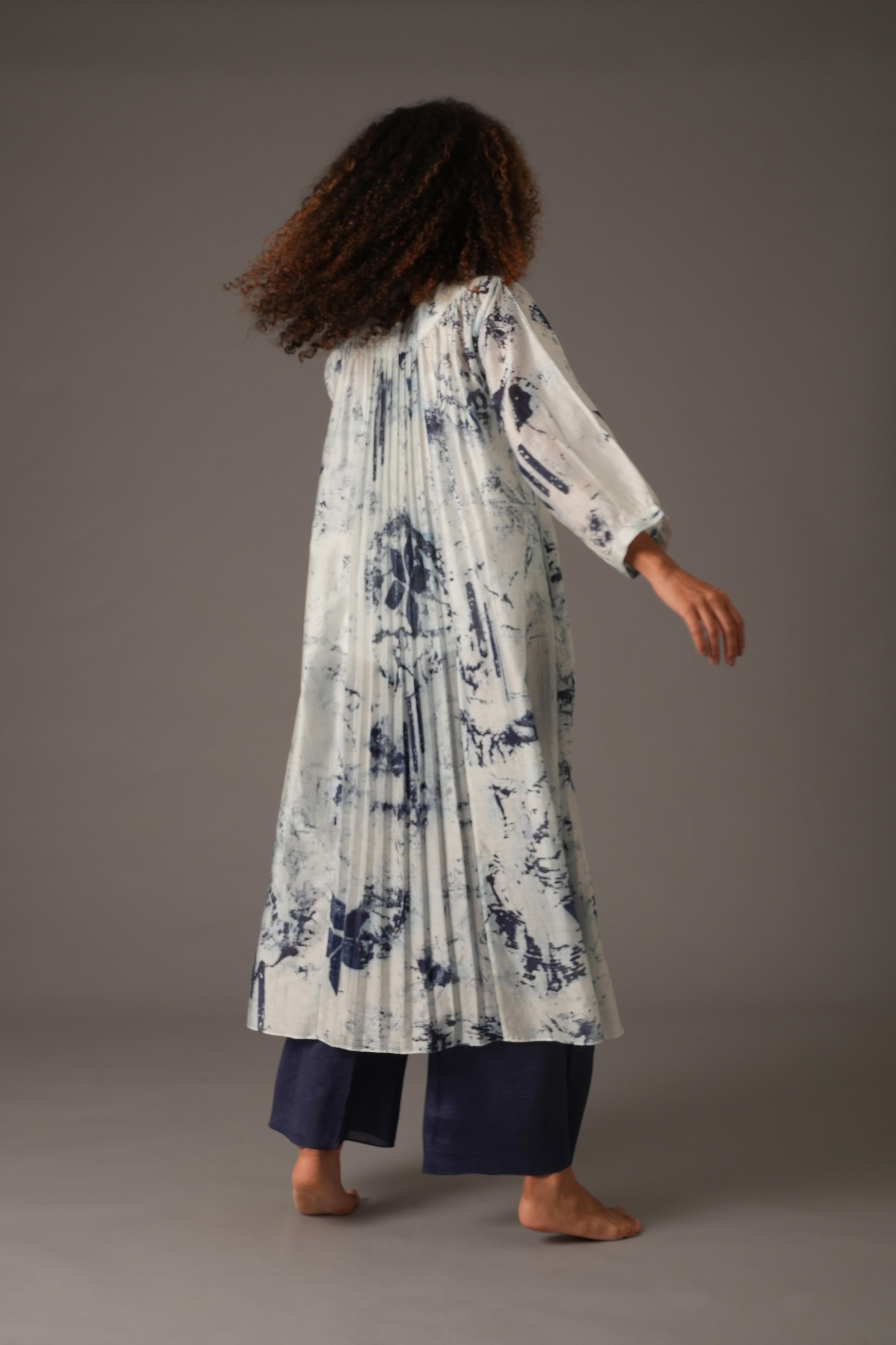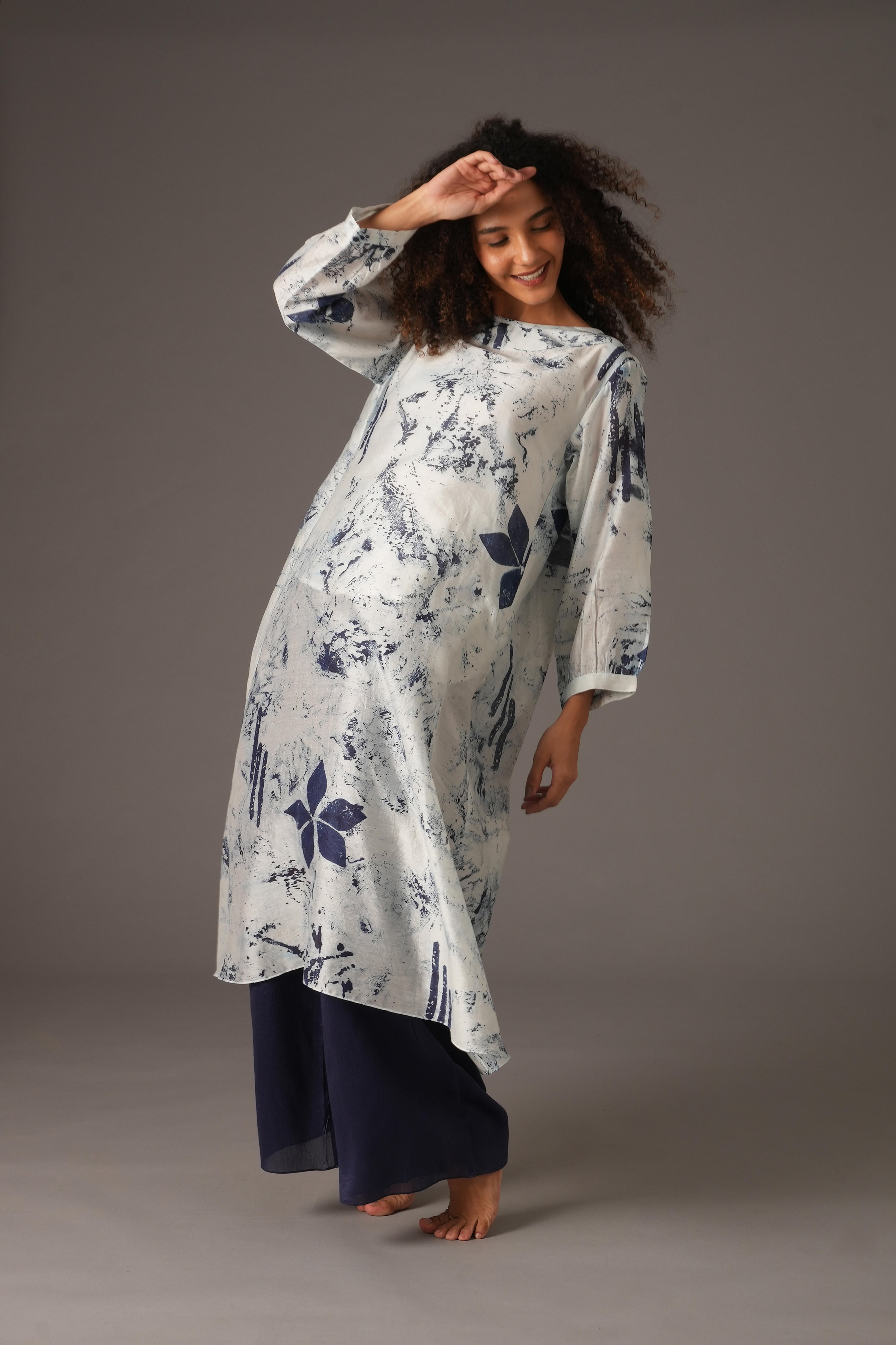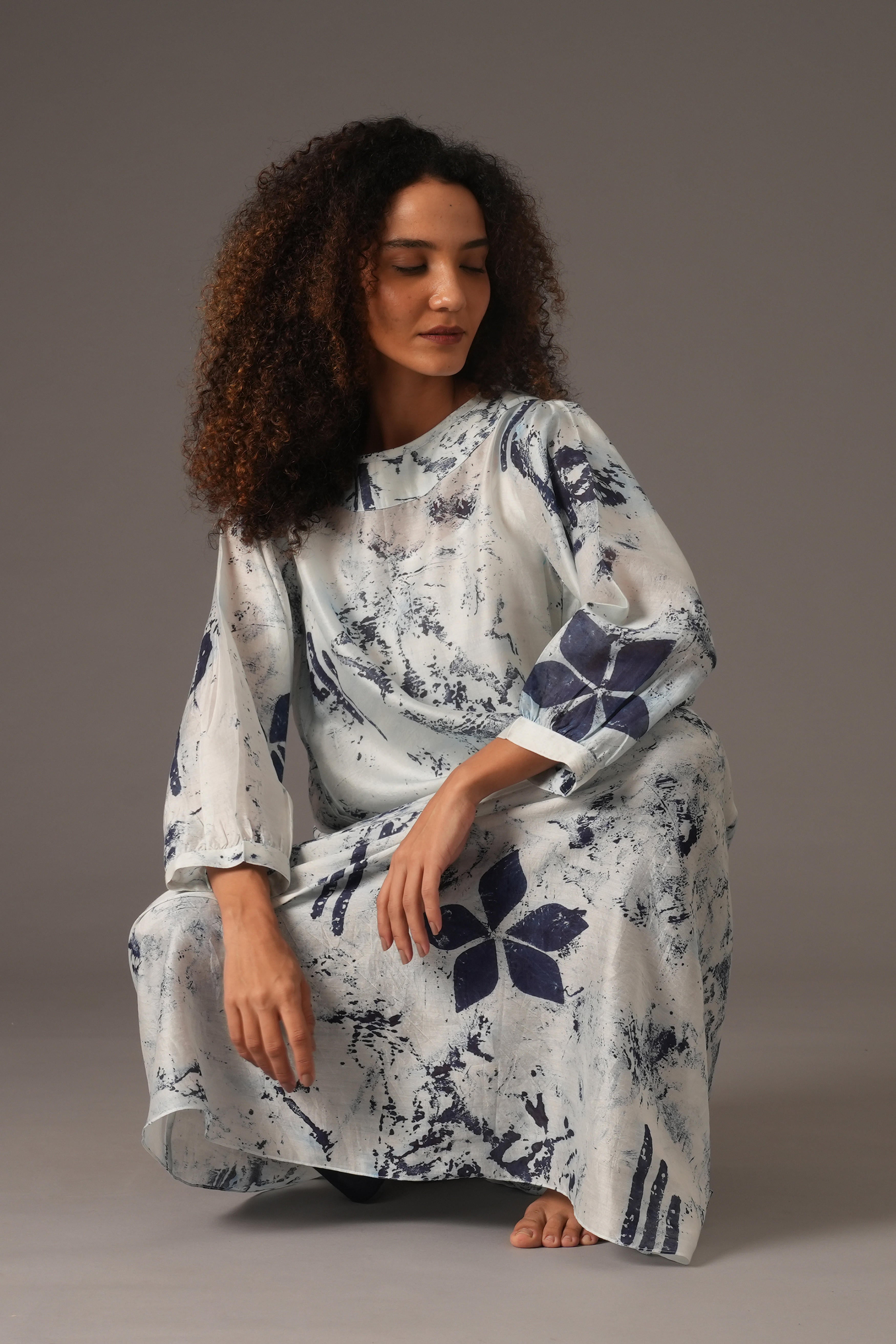 This luxurious Chanderi Silk set includes 3 pieces: Dress, Slip, and Bottom in a stunning Navy. The dress features a full length of 47 inches, 19-inch long sleeves with 1-inch cuffs, and pockets on both sides. The pants have a 38-inch length with a 26-inch waist and 26-inch mohri. Our model, standing 5'8", is wearing a size S.