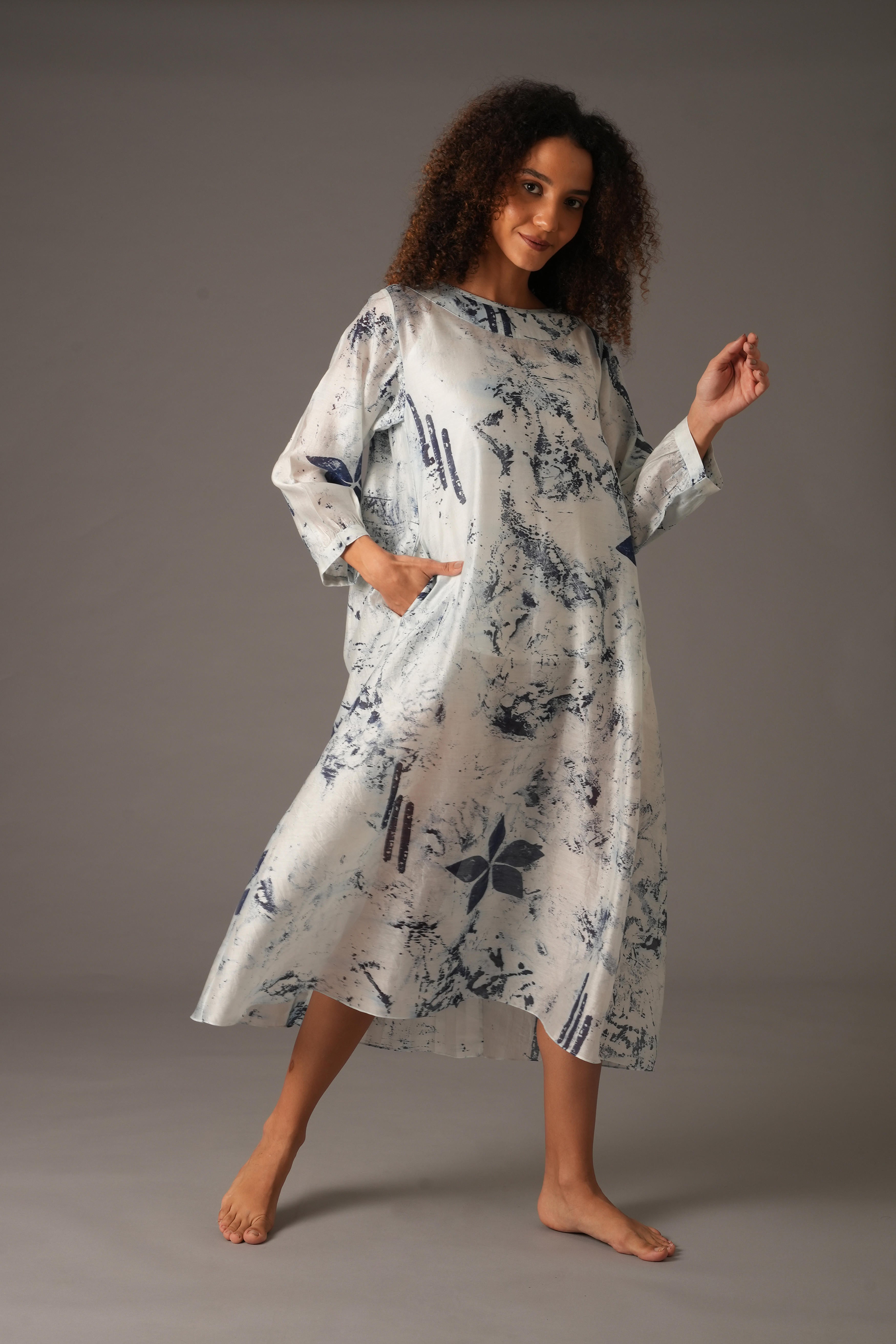 This elegant Chanderi Silk set includes 2 pieces: Dress and Slip in white and blue. The dress has a full length of 47 inches, 19-inch long sleeves with 1-inch cuffs, and pockets on both sides for added convenience and style. Our model, standing 5'8", is wearing a size S.