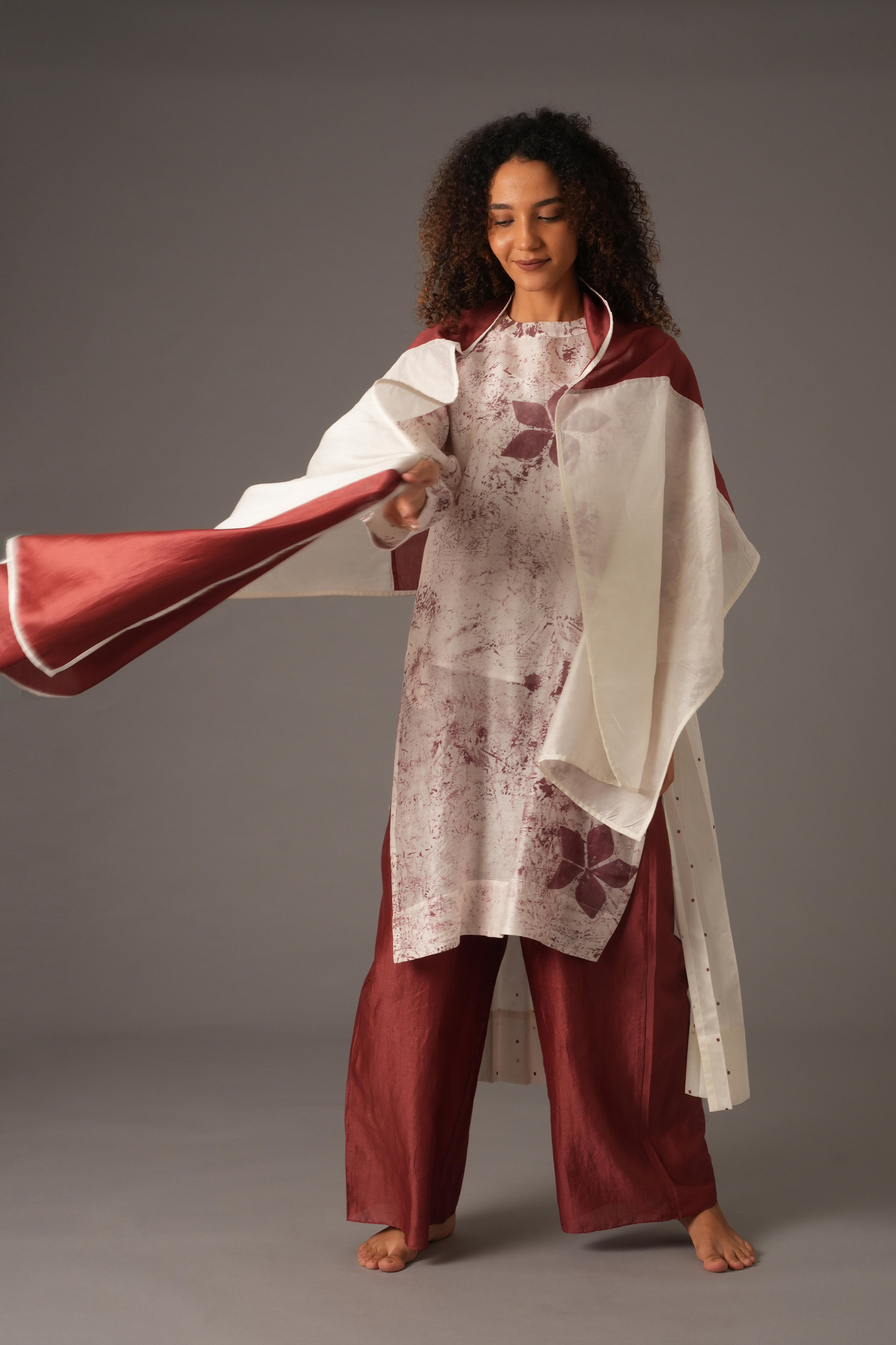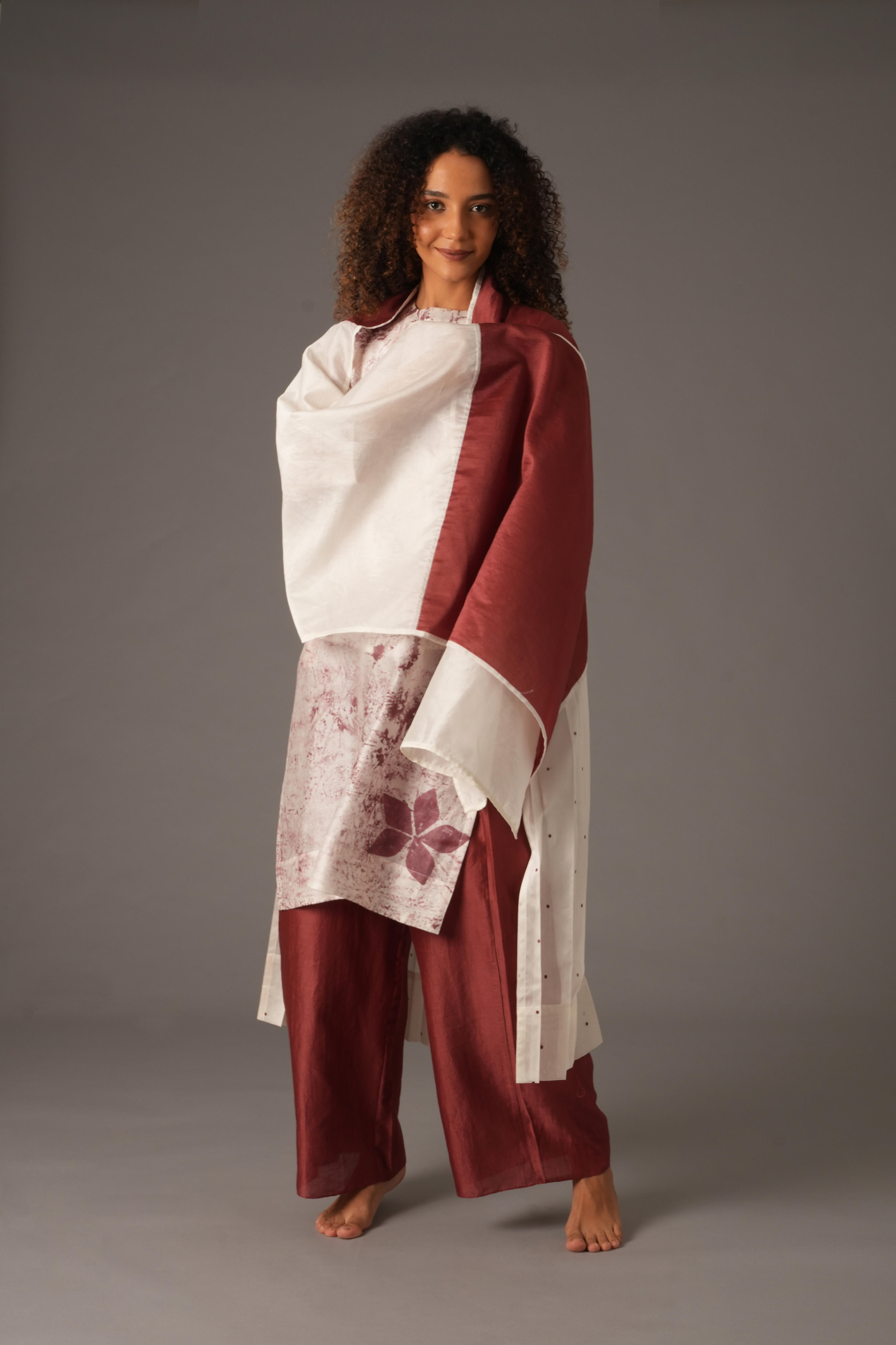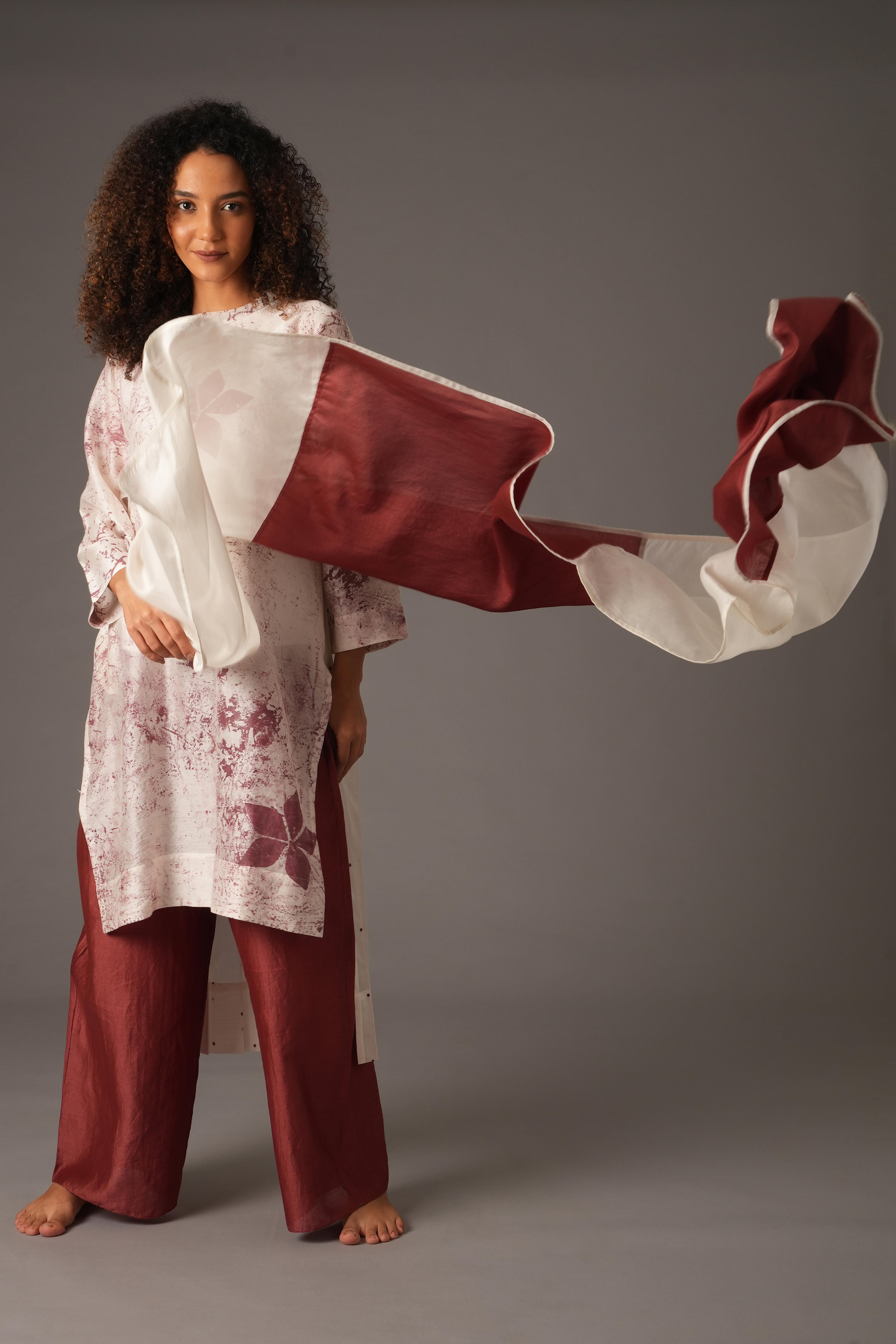 This elegant Chanderi Silk set includes 4 pieces: Dress, Slip, Bottom, and Scarf in a beautiful Cherry Red colour. The dress has a front length of 40 inches and a back length of 44 inches. It features 16-inch long sleeves, with a pants length of 38 inches, a waist of 26 inches, and 26-inch Mohri. The scarf is 82 inches in length and 25 inches in width. The design includes pockets on both sides and a side slit for added style. Our model, standing 5'8", is wearing a size S.