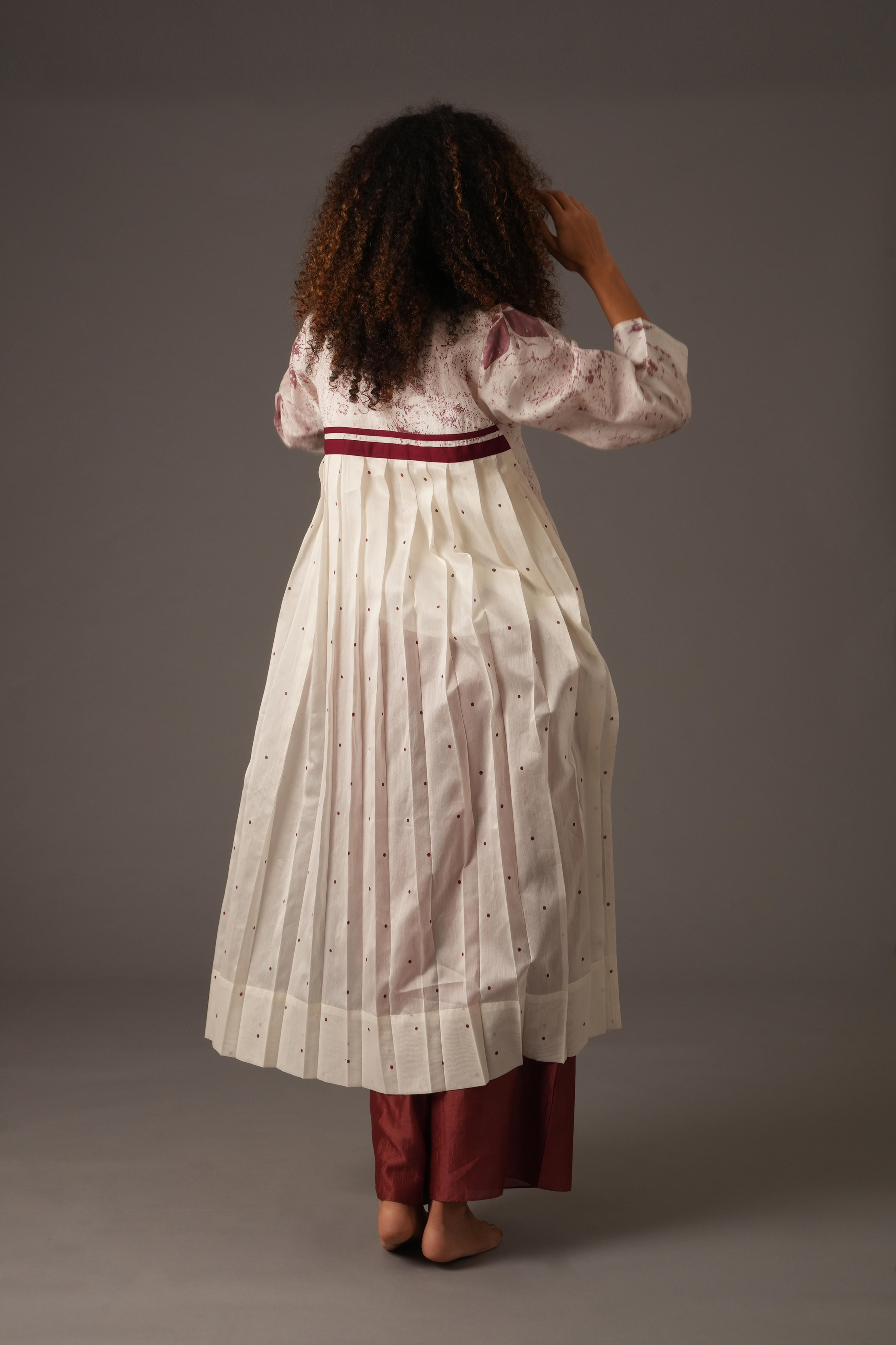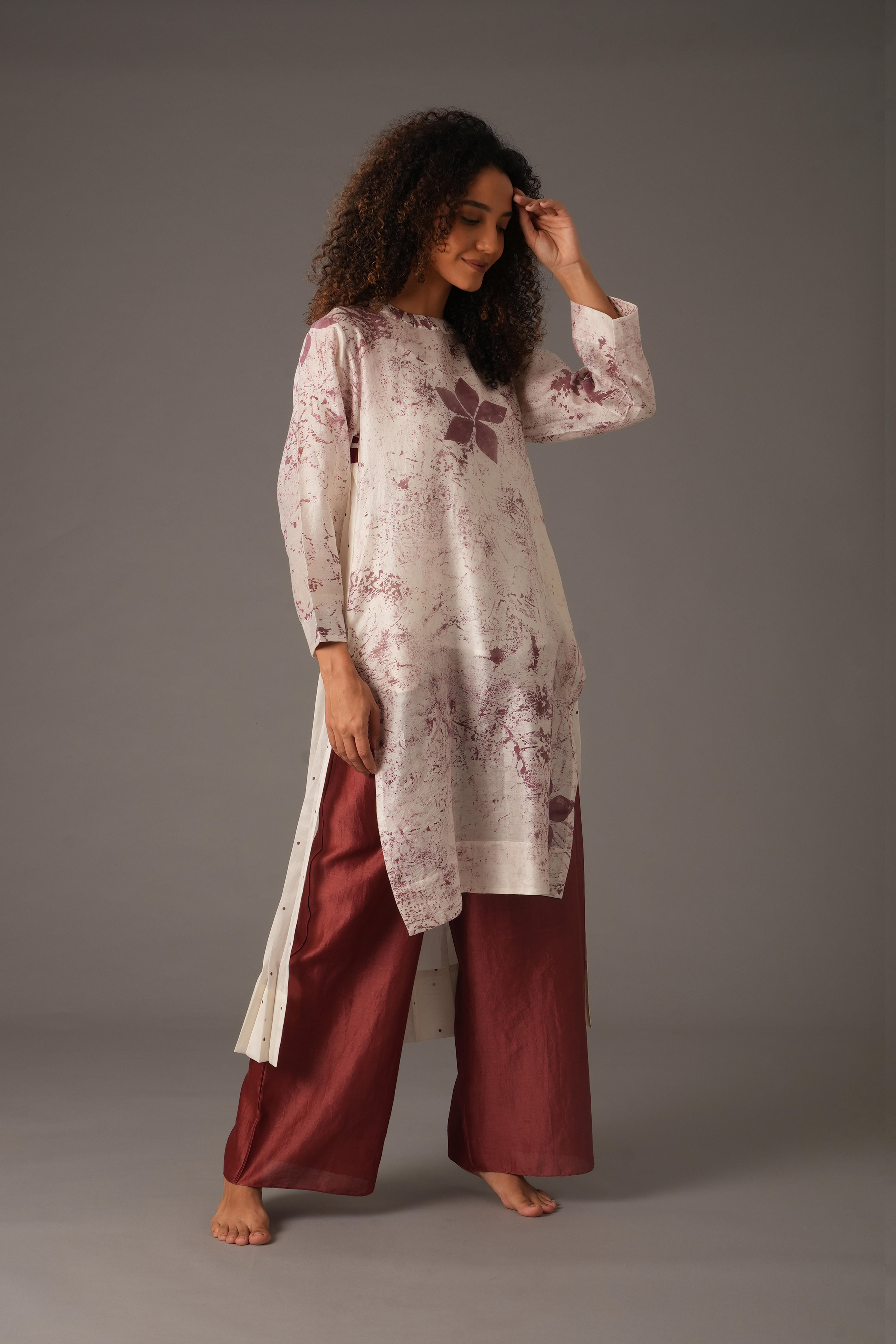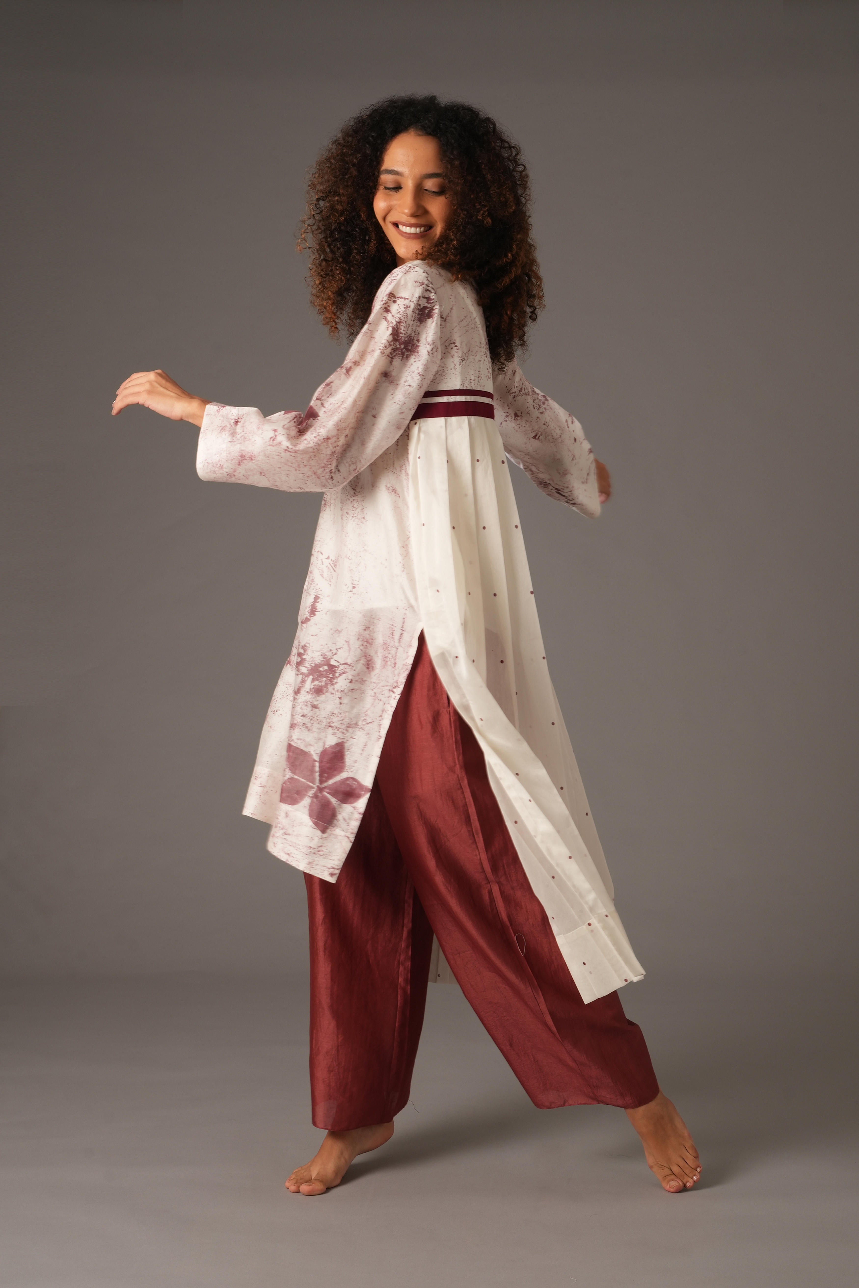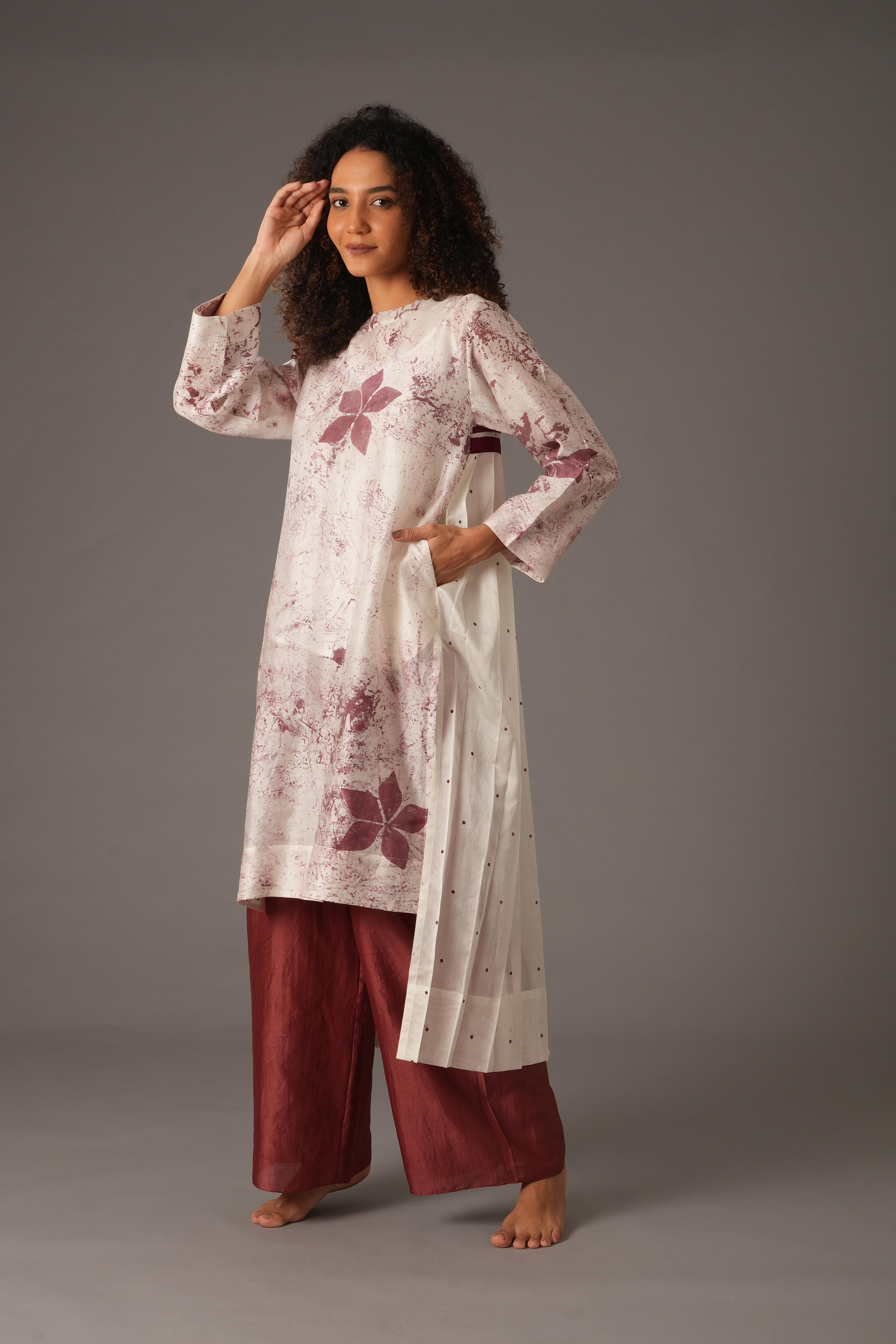 This elegant Chanderi Silk set includes 4 pieces: Dress, Slip, Bottom, and Scarf in a beautiful Cherry Red colour. The dress has a front length of 40 inches and a back length of 44 inches. It features 16-inch long sleeves, with a pants length of 38 inches, a waist of 26 inches, and 26-inch Mohri. The scarf is 82 inches in length and 25 inches in width. The design includes pockets on both sides and a side slit for added style. Our model, standing 5'8", is wearing a size S.