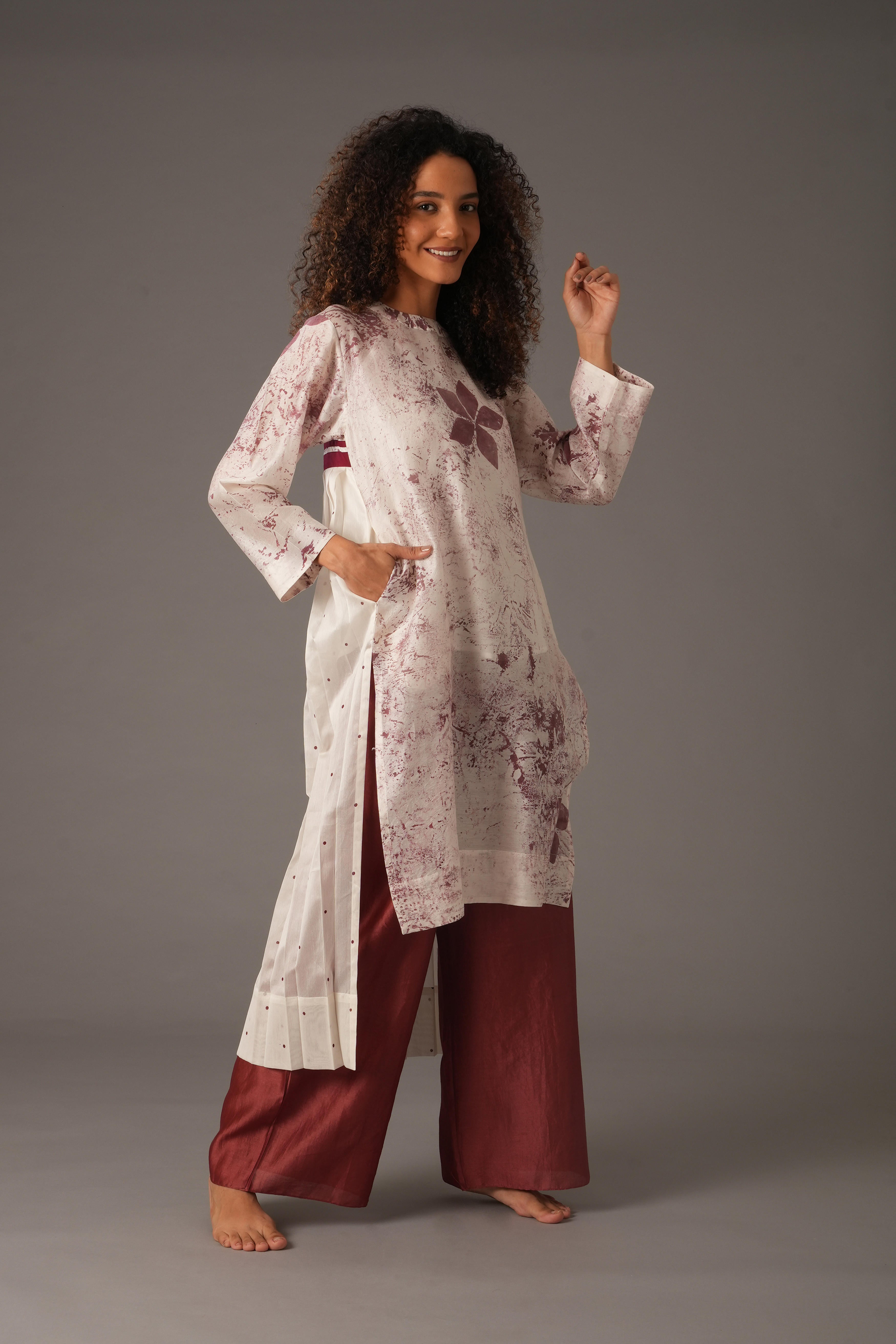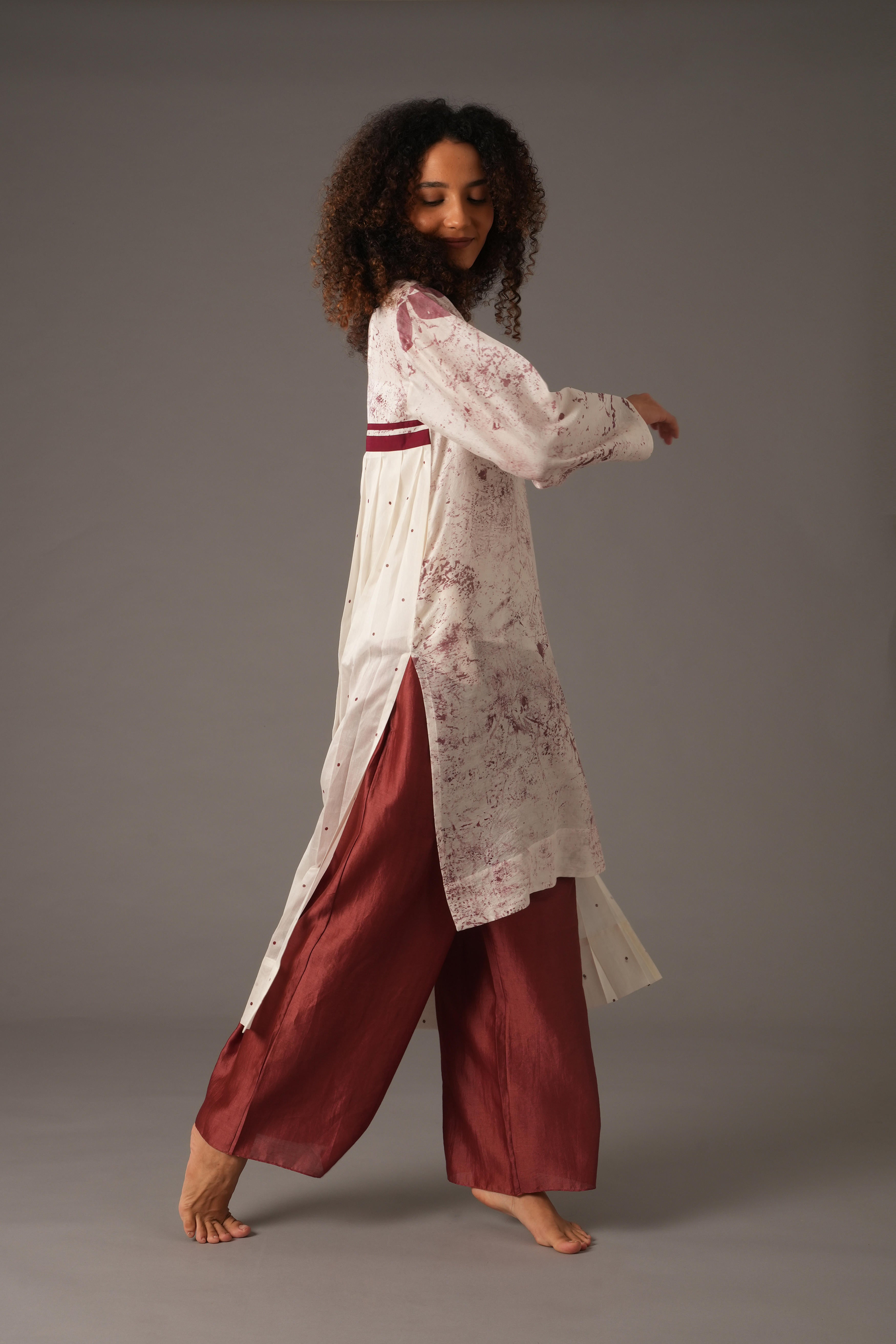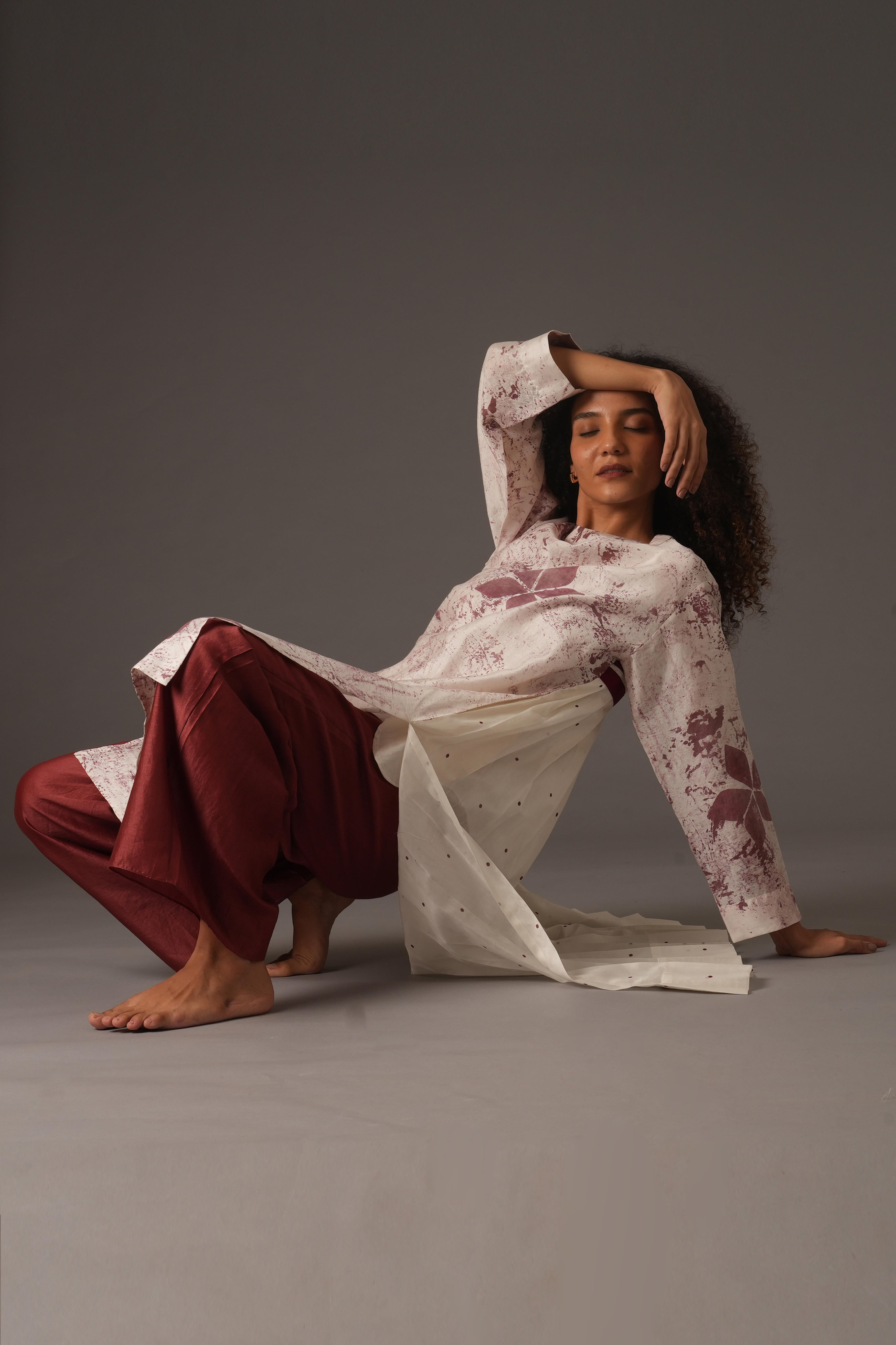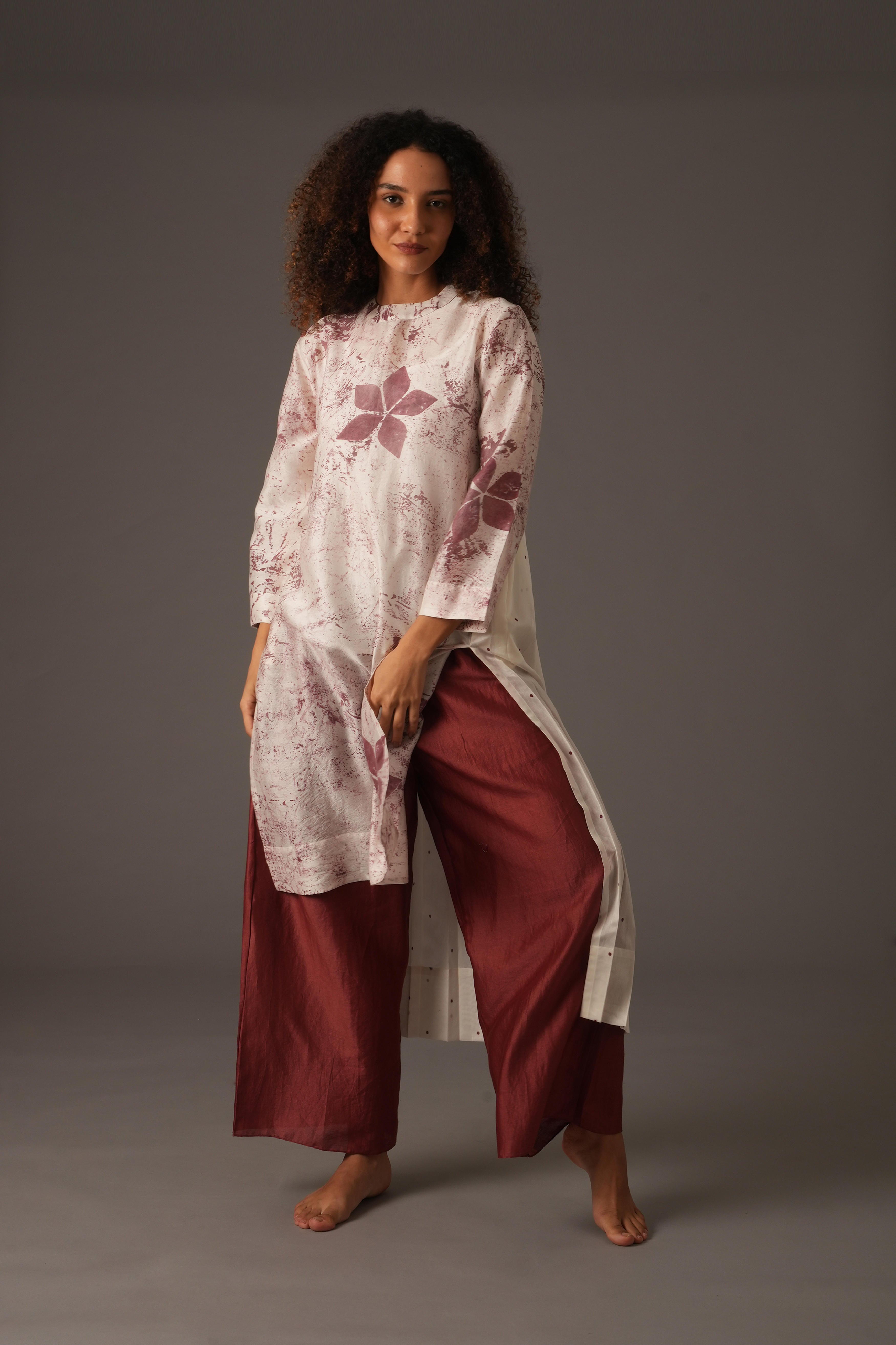 This stunning Chanderi Silk set includes 3 pieces: Top, Slip, and Bottom in an elegant Cherry Red colour. The top features a front length of 40 inches and a back length of 44 inches with 16-inch long sleeves. The pants have a length of 38 inches, a waist of 26 inches, and a 26-inch Mohri. The design includes pockets on both sides and a side slit for added flair. Our model, standing 5'8", is wearing a size S.
