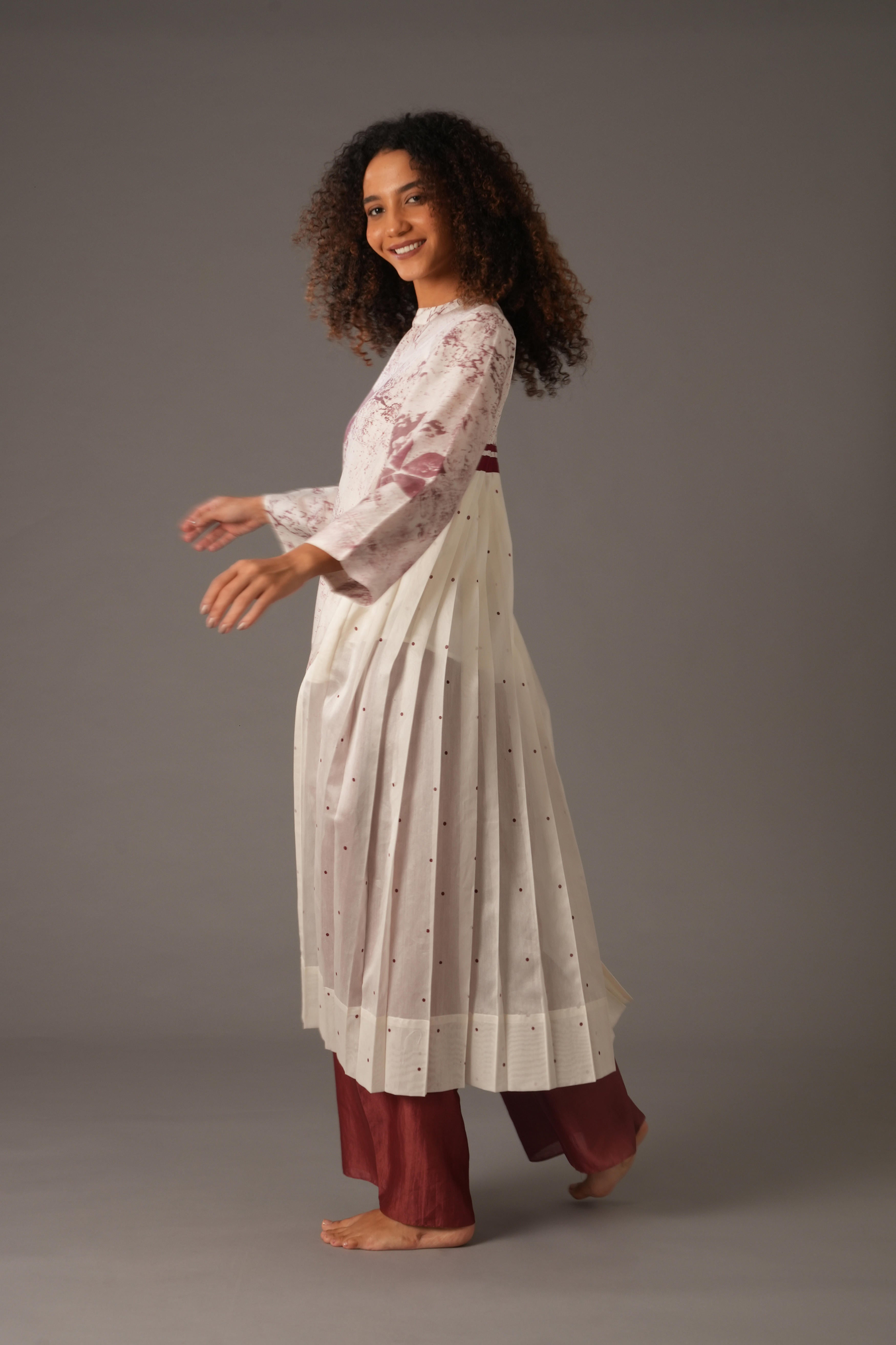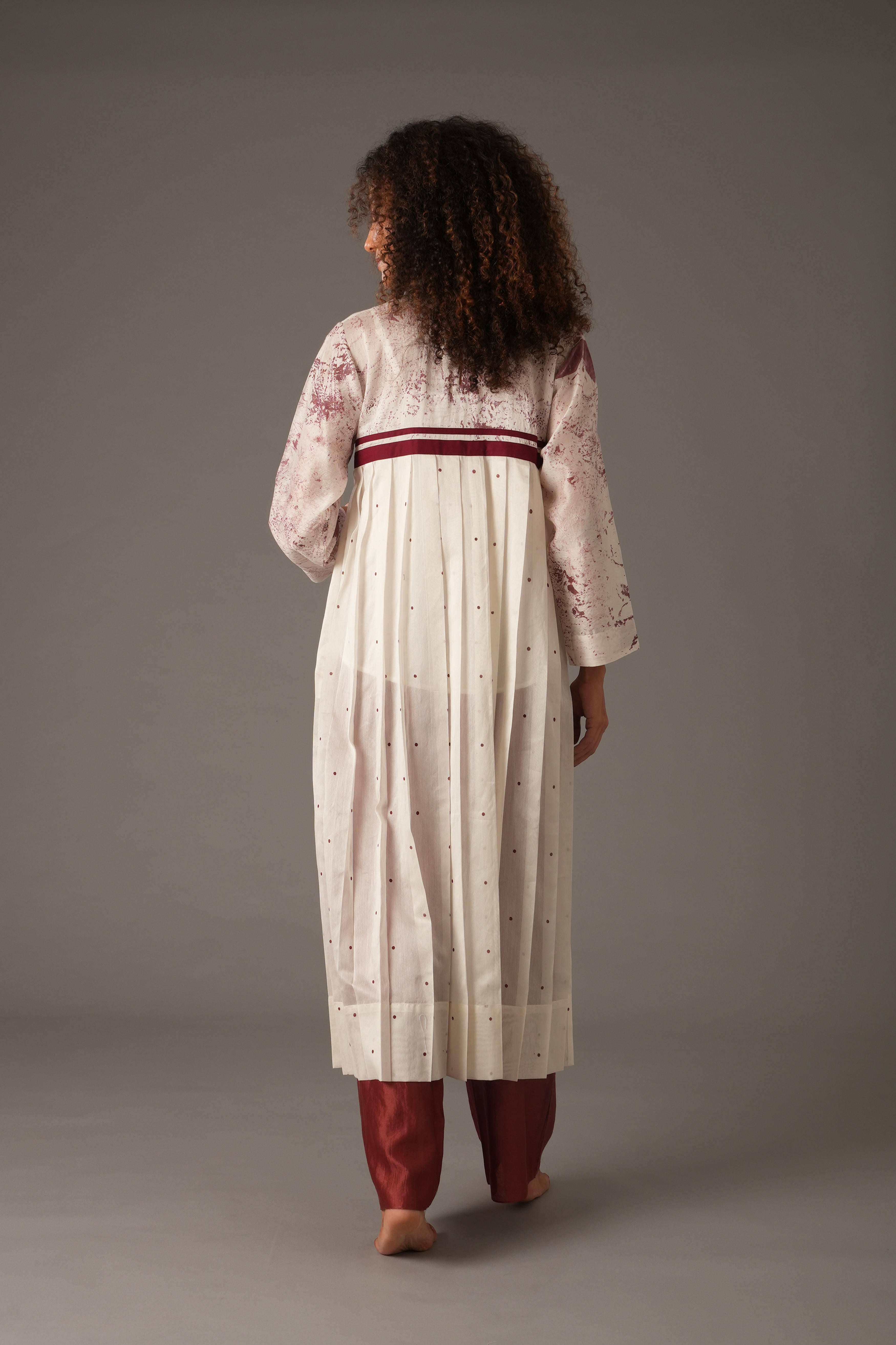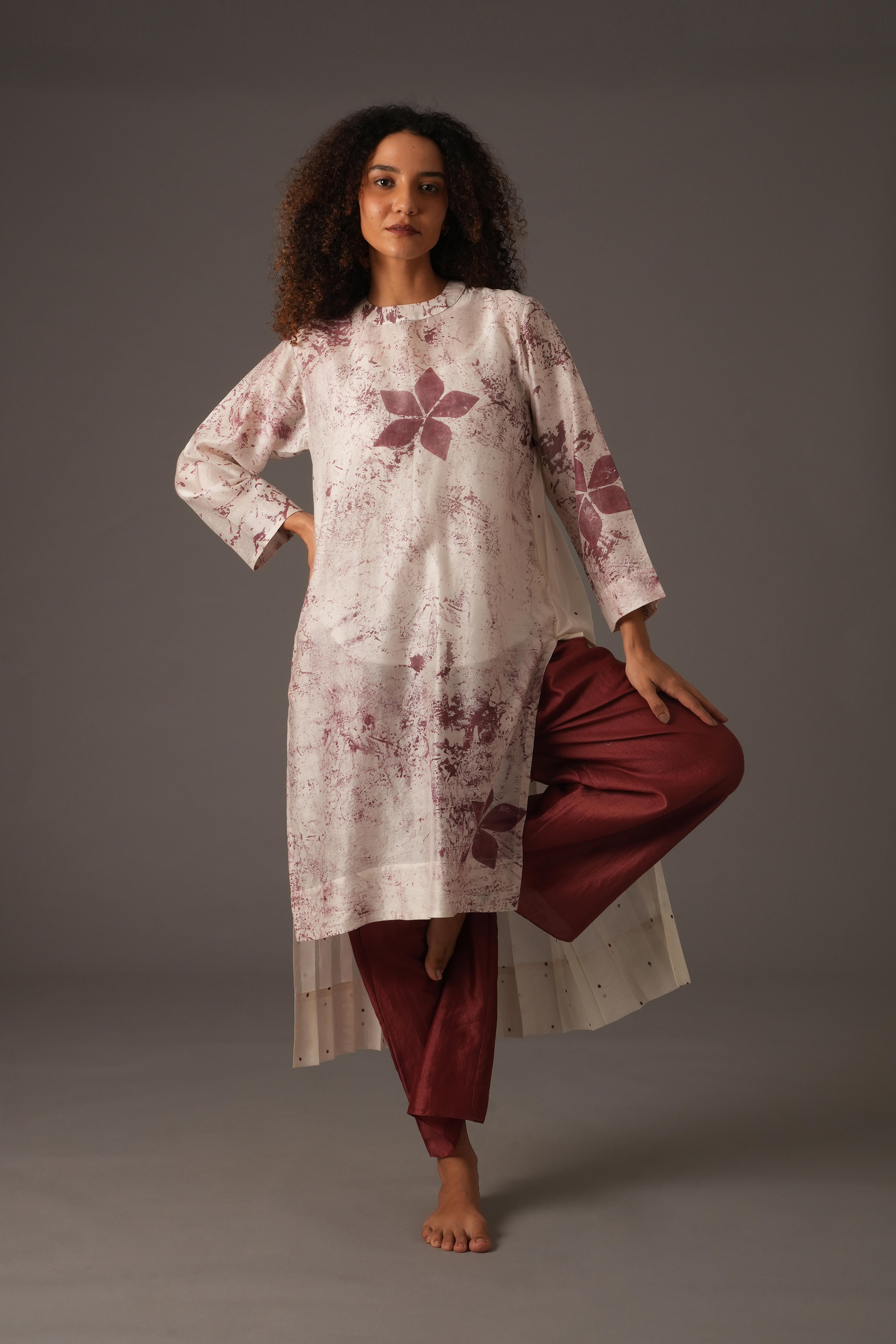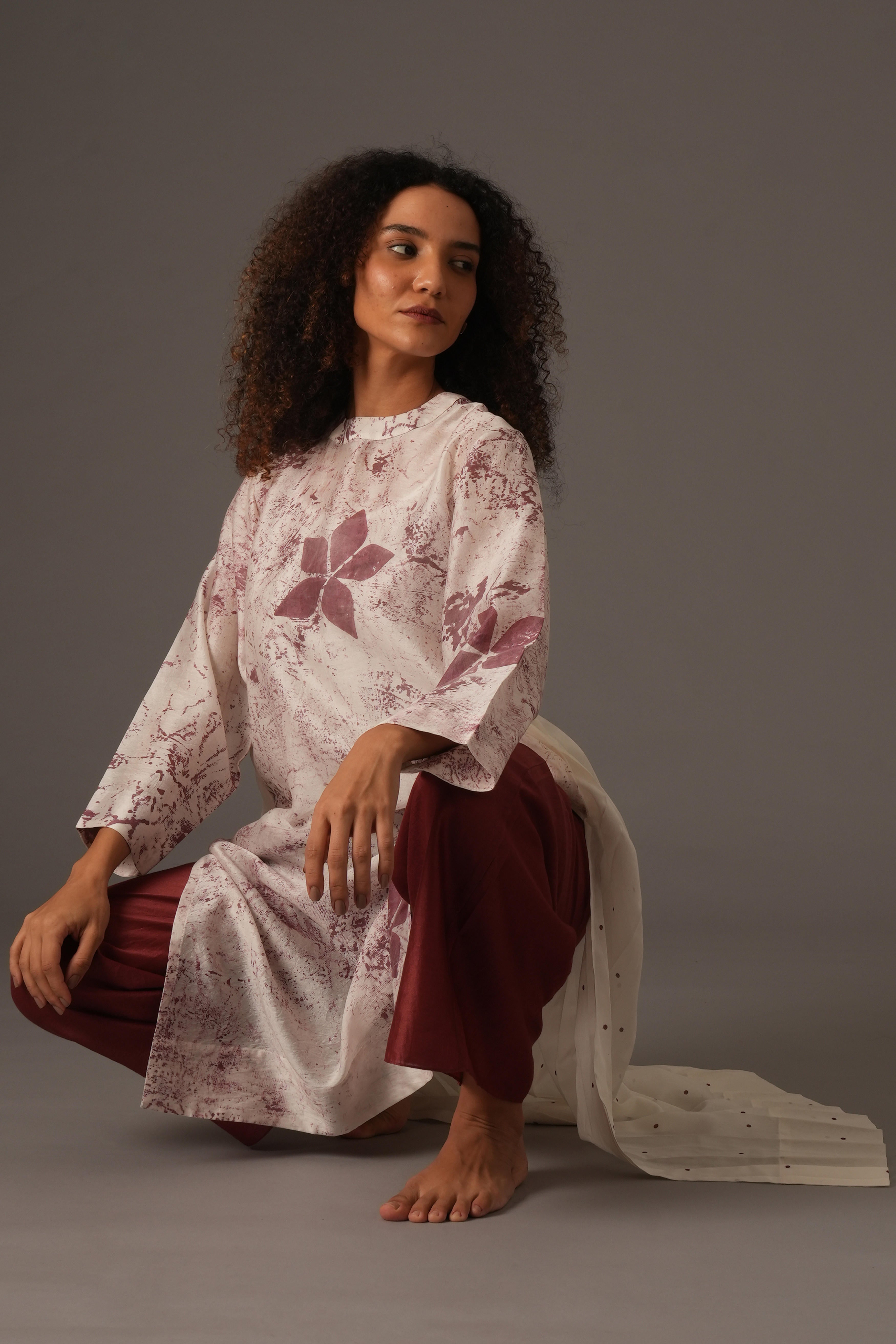 This stunning Chanderi Silk set includes 3 pieces: Top, Slip, and Bottom in an elegant Cherry Red colour. The top features a front length of 40 inches and a back length of 44 inches with 16-inch long sleeves. The pants have a length of 38 inches, a waist of 26 inches, and a 26-inch Mohri. The design includes pockets on both sides and a side slit for added flair. Our model, standing 5'8", is wearing a size S.