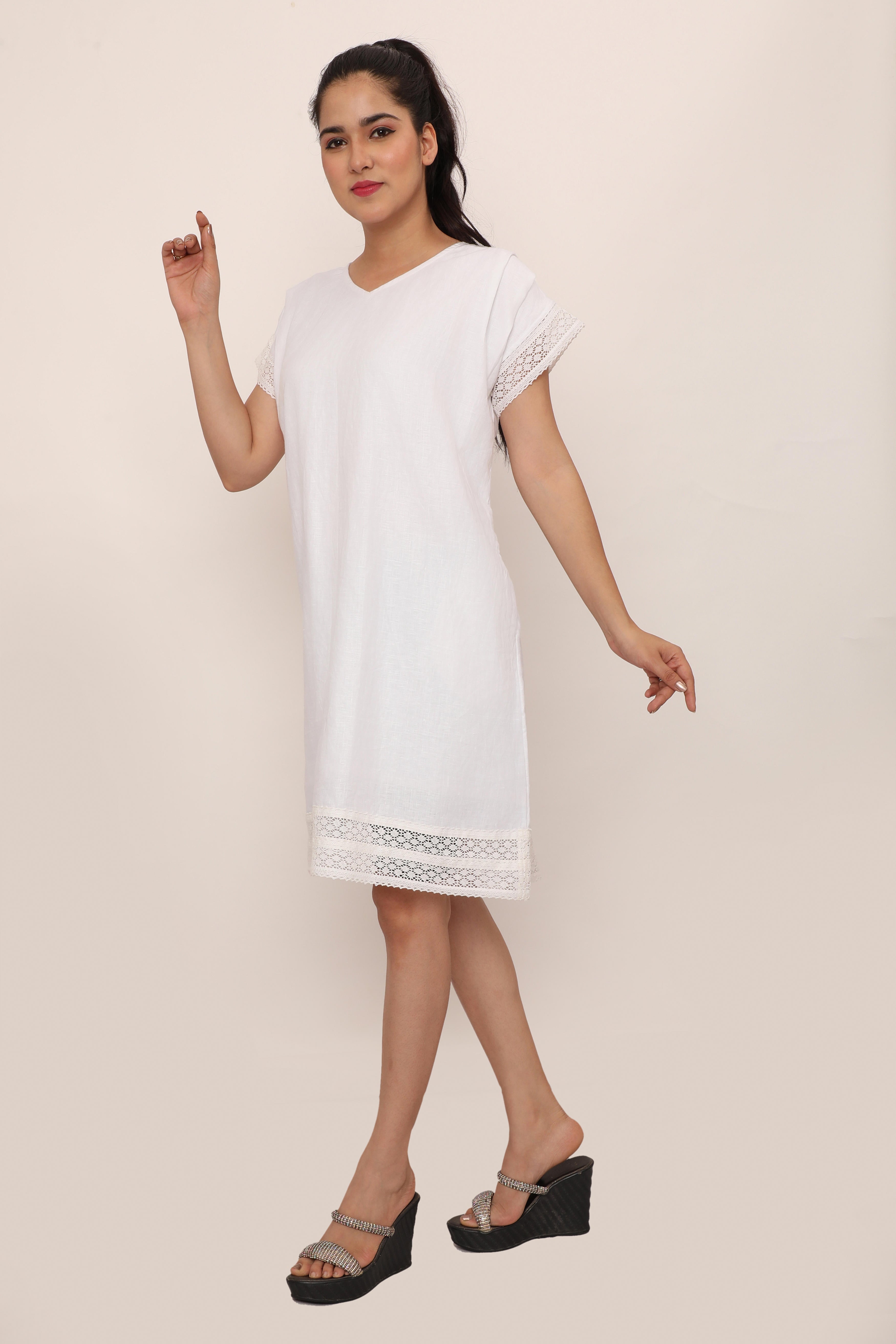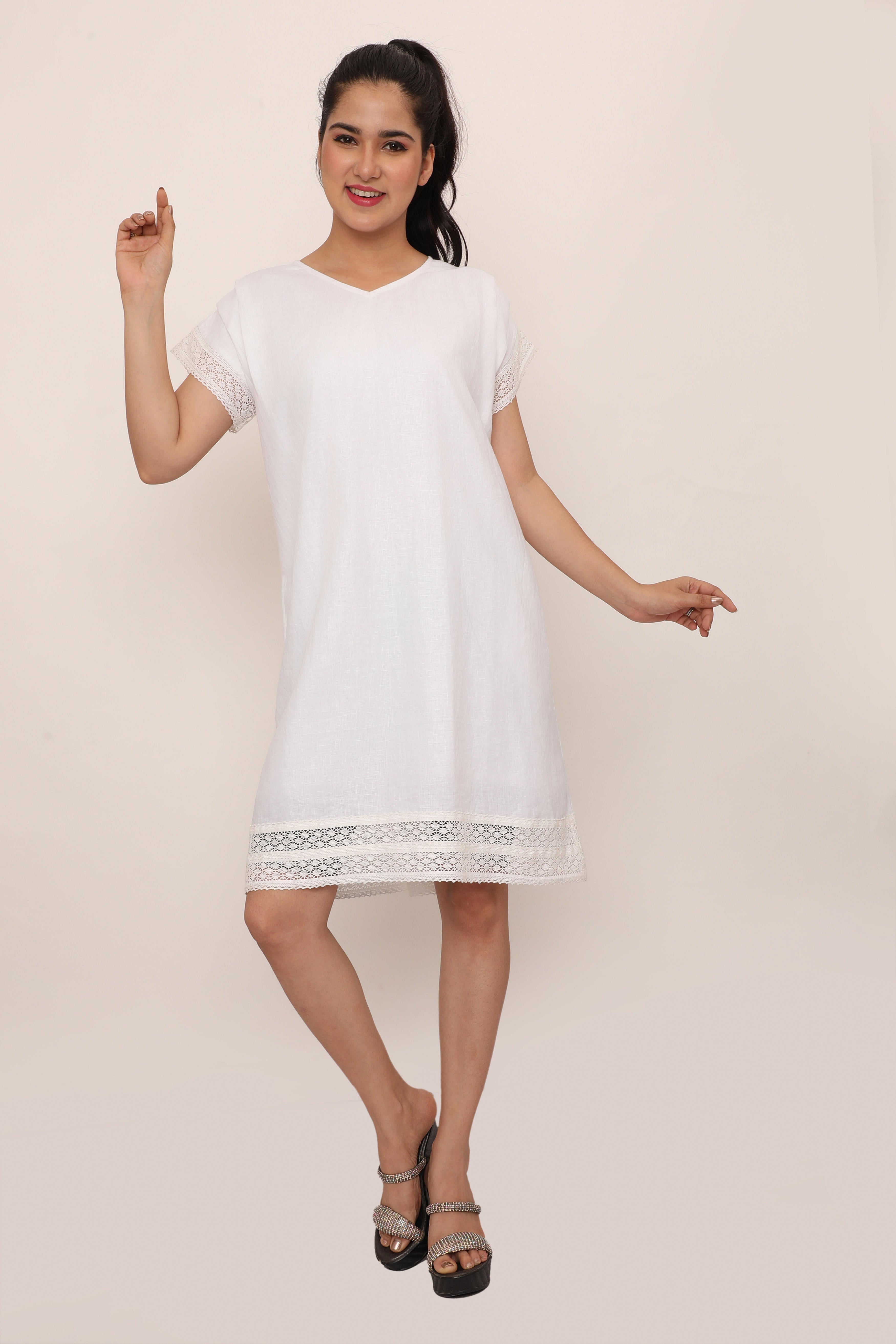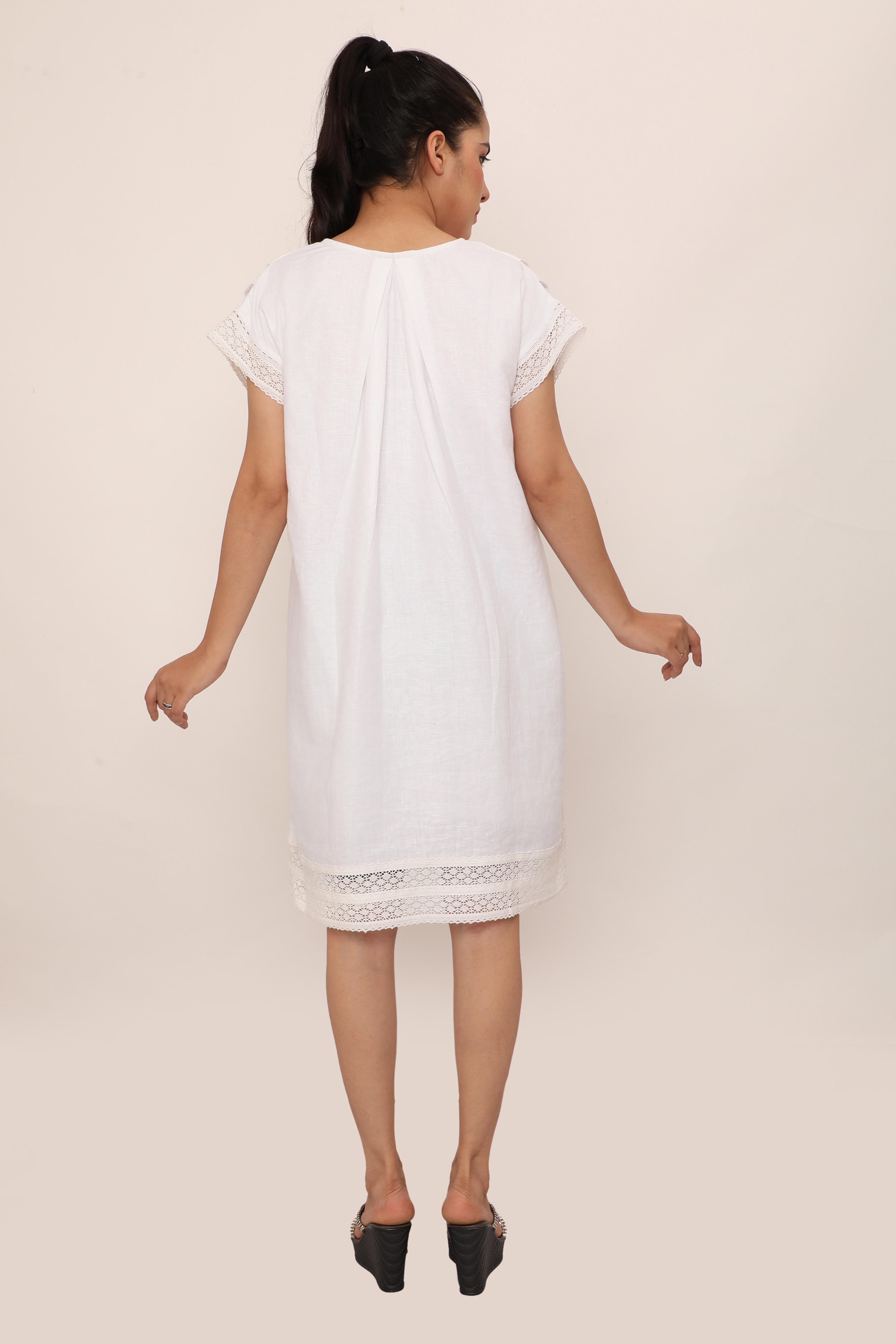 The Thalia Dress features a relaxed silhouette with a V-neckline that adds a touch of simplicity and elegance. The short sleeves are detailed with delicate lace trims, adding a feminine touch to the overall look. The hemline is also adorned with matching lace, creating a cohesive design that exudes understated sophistication. A single inverted pleat at the back adds subtle structure and movement to the dress, enhancing its flowy and comfortable fit.
