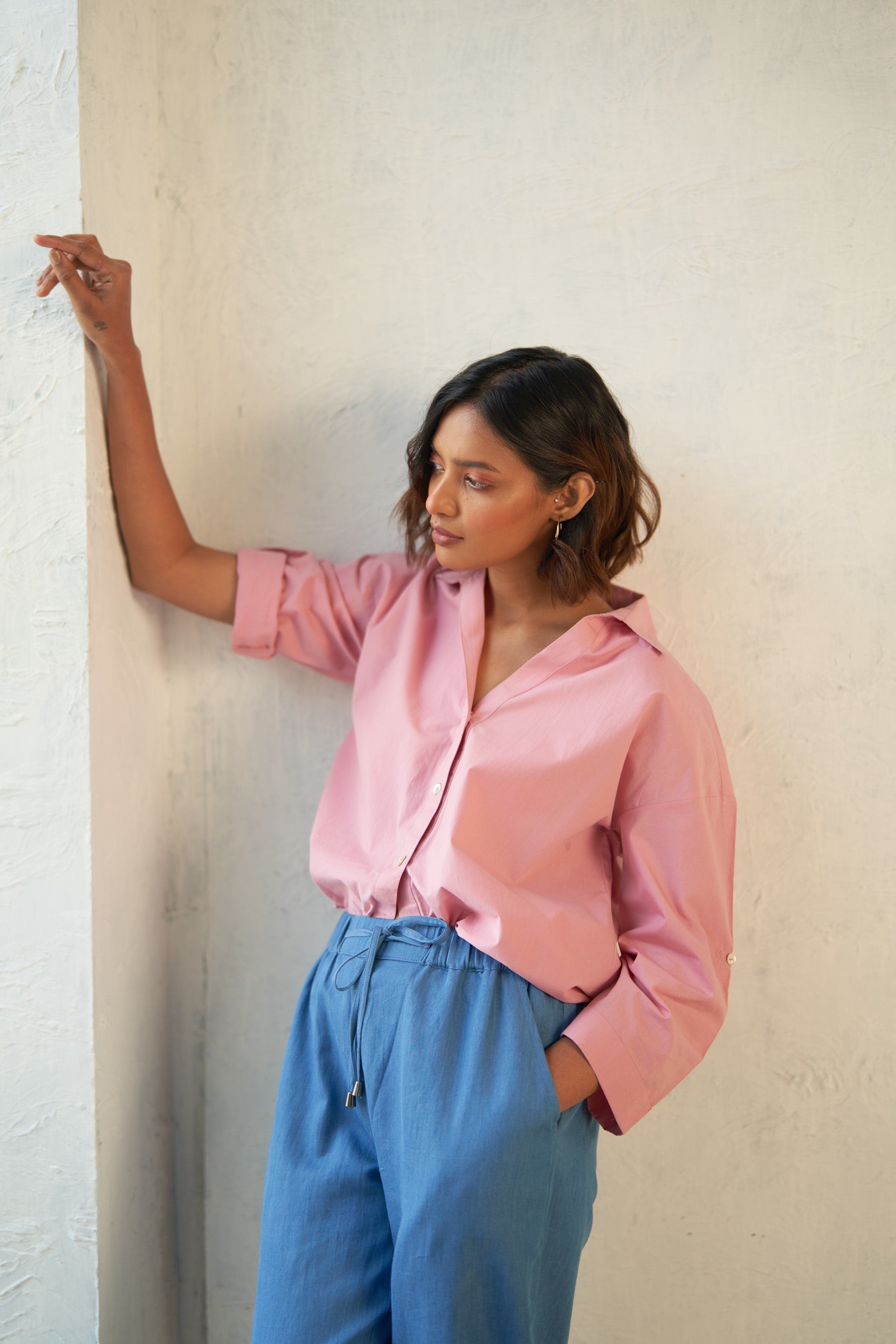 Our flowy blush pink shirt, crafted from pure cotton for ultimate comfort. Designed with an oversized fit, V-neck, curved hemline, and elegant shell buttons, it exudes effortless style. Paired with tapered joggers featuring an elasticated waistband with l drawstrings, this ensemble offers both comfort and sophistication. Complete with clean welt pocket detailing, it's perfect for any outing.