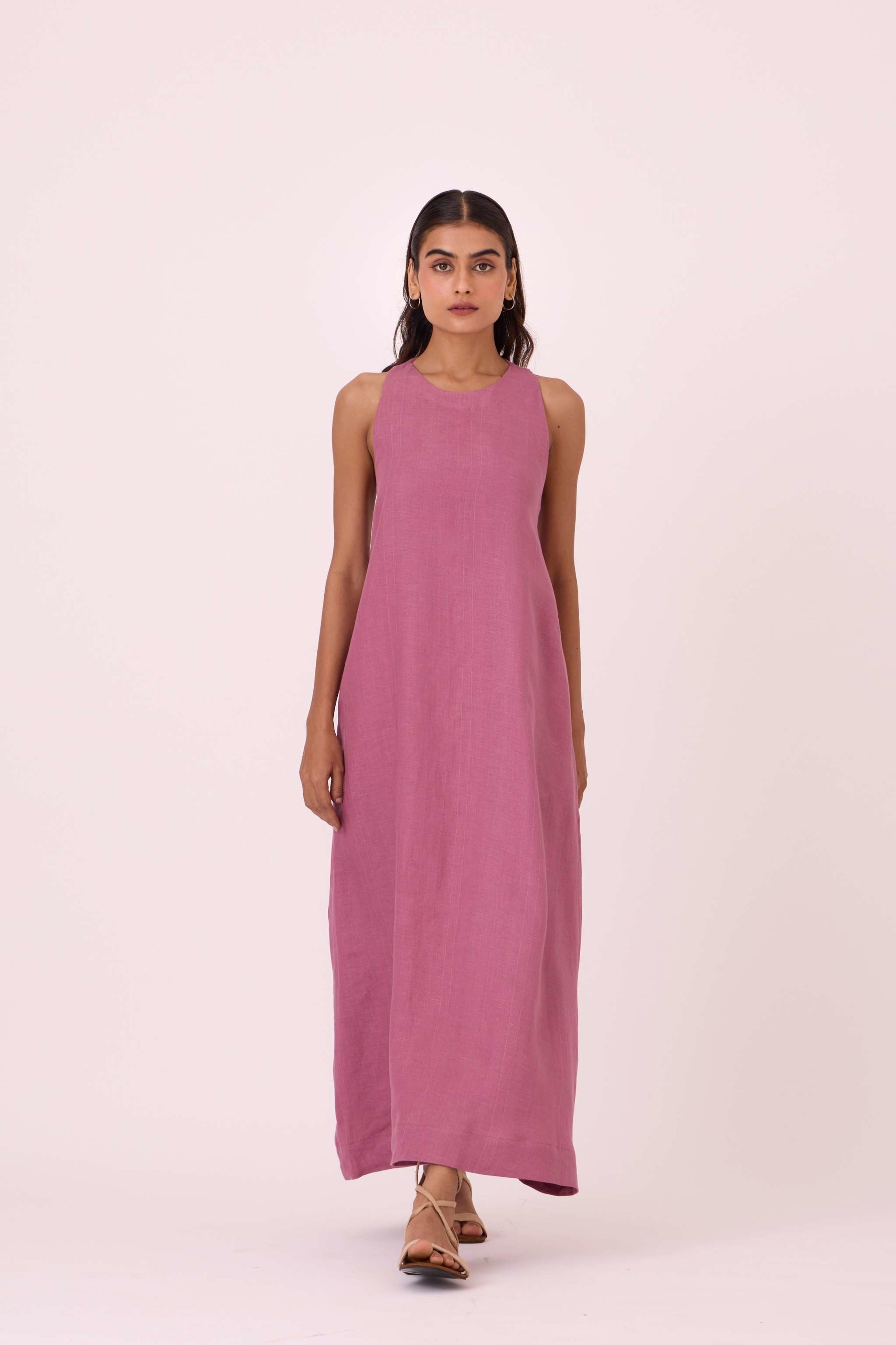 This is a *maxi-length, regular-fit dress* with a distinctive *twisted racerback* design. It includes practical *in-seam pockets* and is *fully lined*. The dress is made from a studio-developed *Ikat design* that is *handwoven by artisans in Telangana*, and any minor irregularities in the fabric are a natural result of the handmade process. The model, Chhavi, who is 5'6", is wearing a size XS.