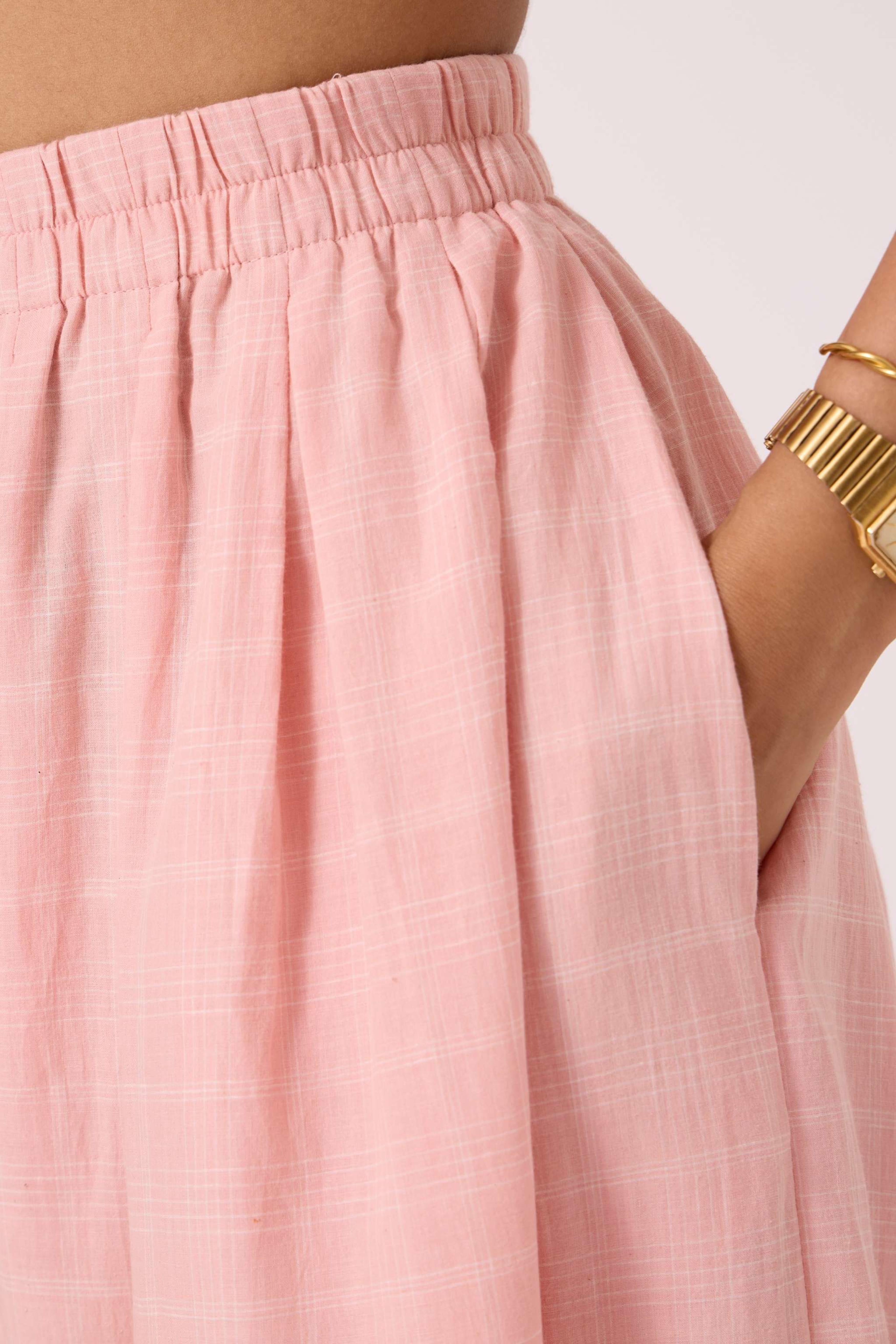These *regular-fit trousers* feature a *fully elasticated waistband* and a *bounteous flare*. They also include convenient *in-seam pockets*. The pants are made from a studio-developed *Ikat design* that is *handwoven by artisans in Telangana*. The slight irregularities in the fabric are a natural result of this handmade process. For sizing, the model Chhavi is 5'6" and is wearing an XS.