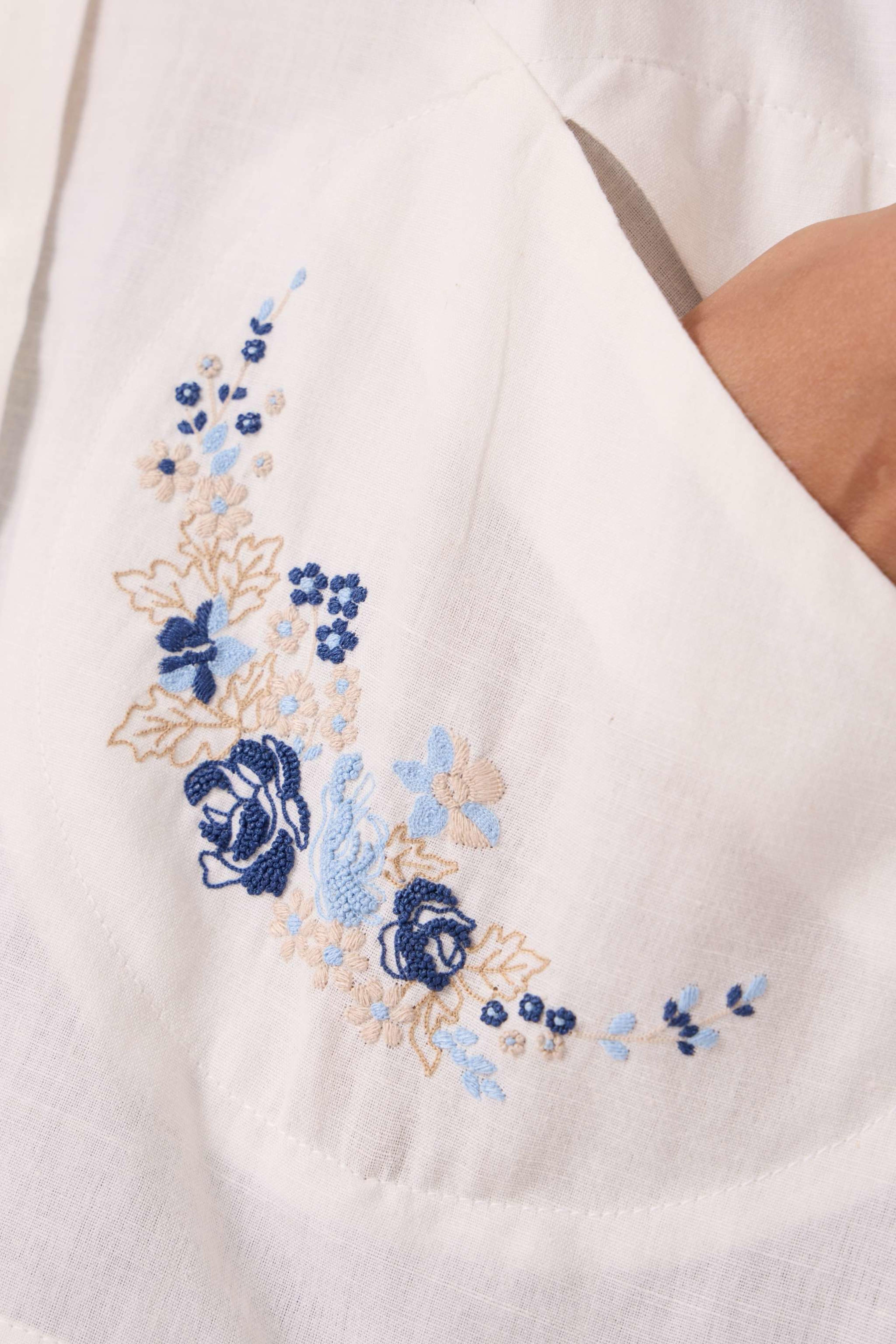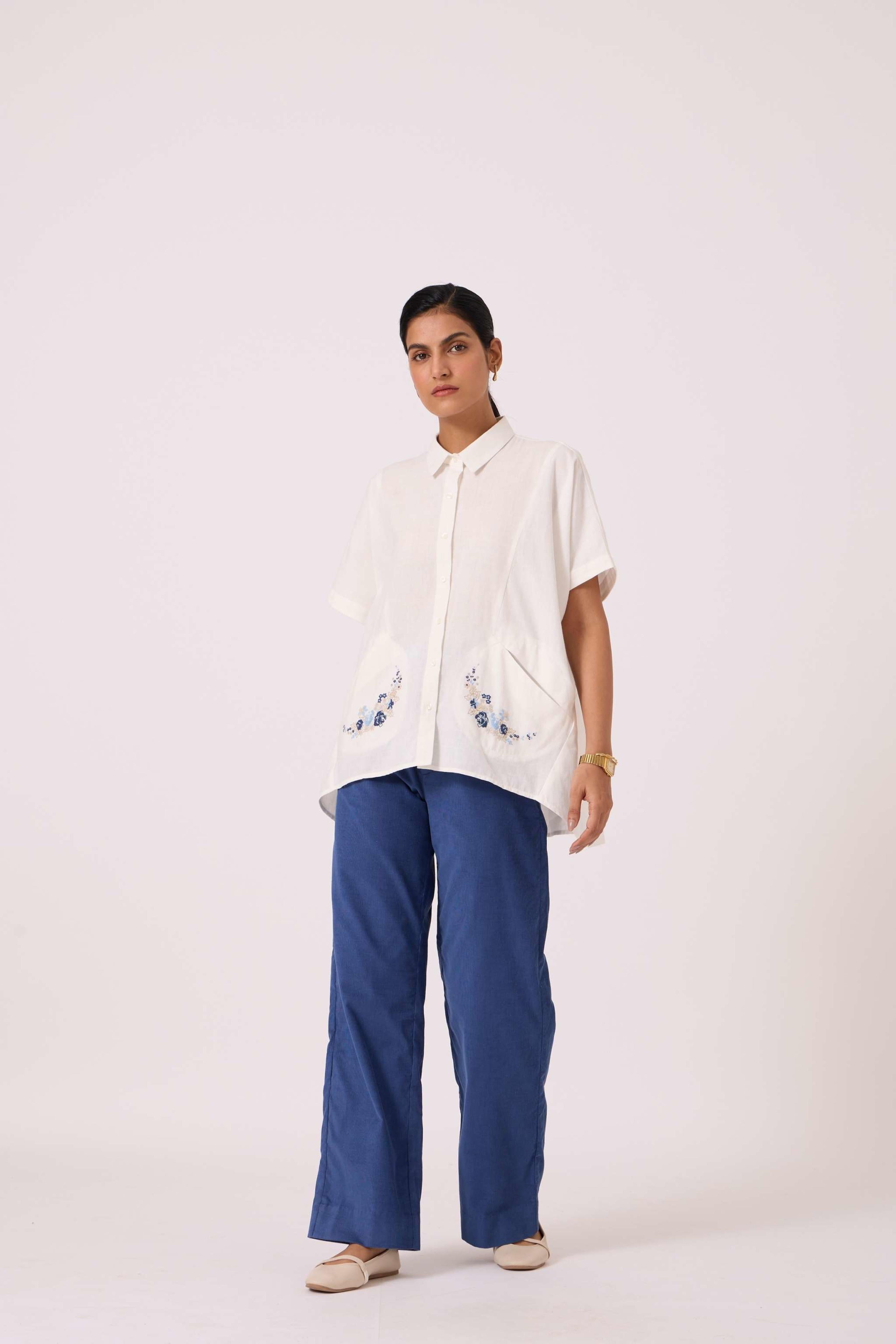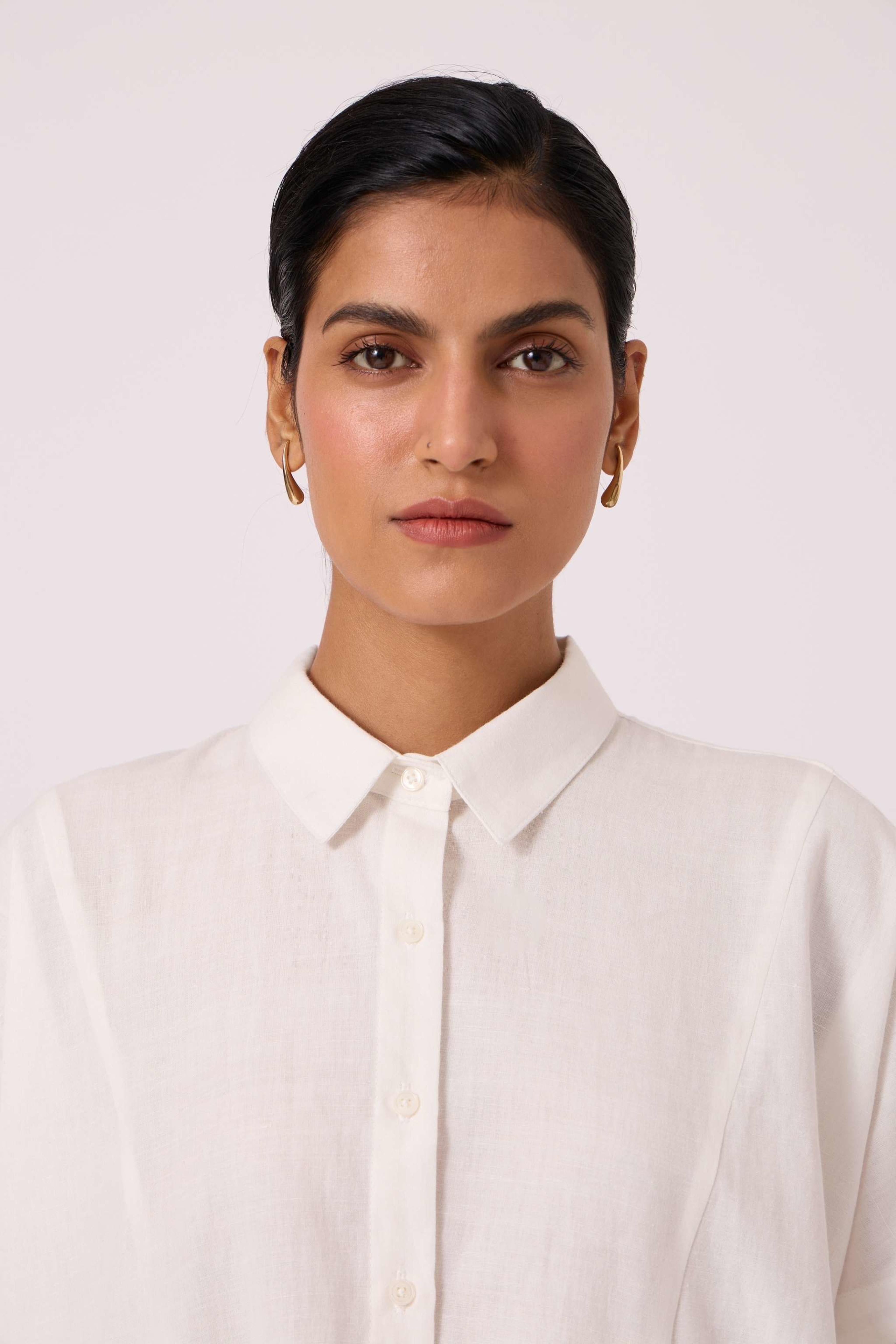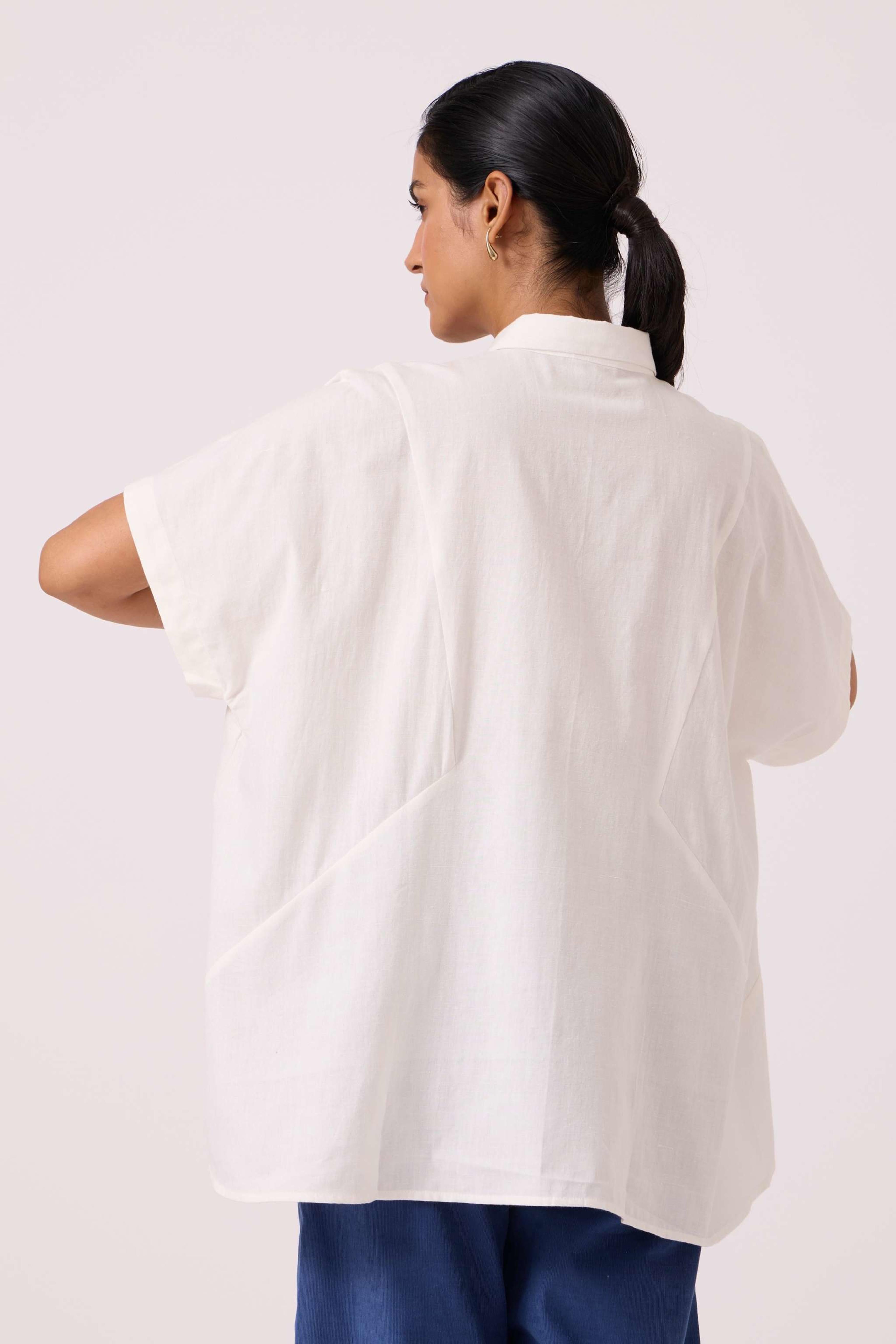 This relaxed-fit shirt is a unique piece with *angular panels* and a *round welt pocket*. It features a *slim collar* with a *concealed placket* for a clean, modern look. The *curved hem* is designed to cover the hips. As with the other pieces in this collection, the fabric is a unique design developed in-house and *handwoven by artisans in Bengal*. The model, Chhavi, is 5'6" and is wearing a size XS.
