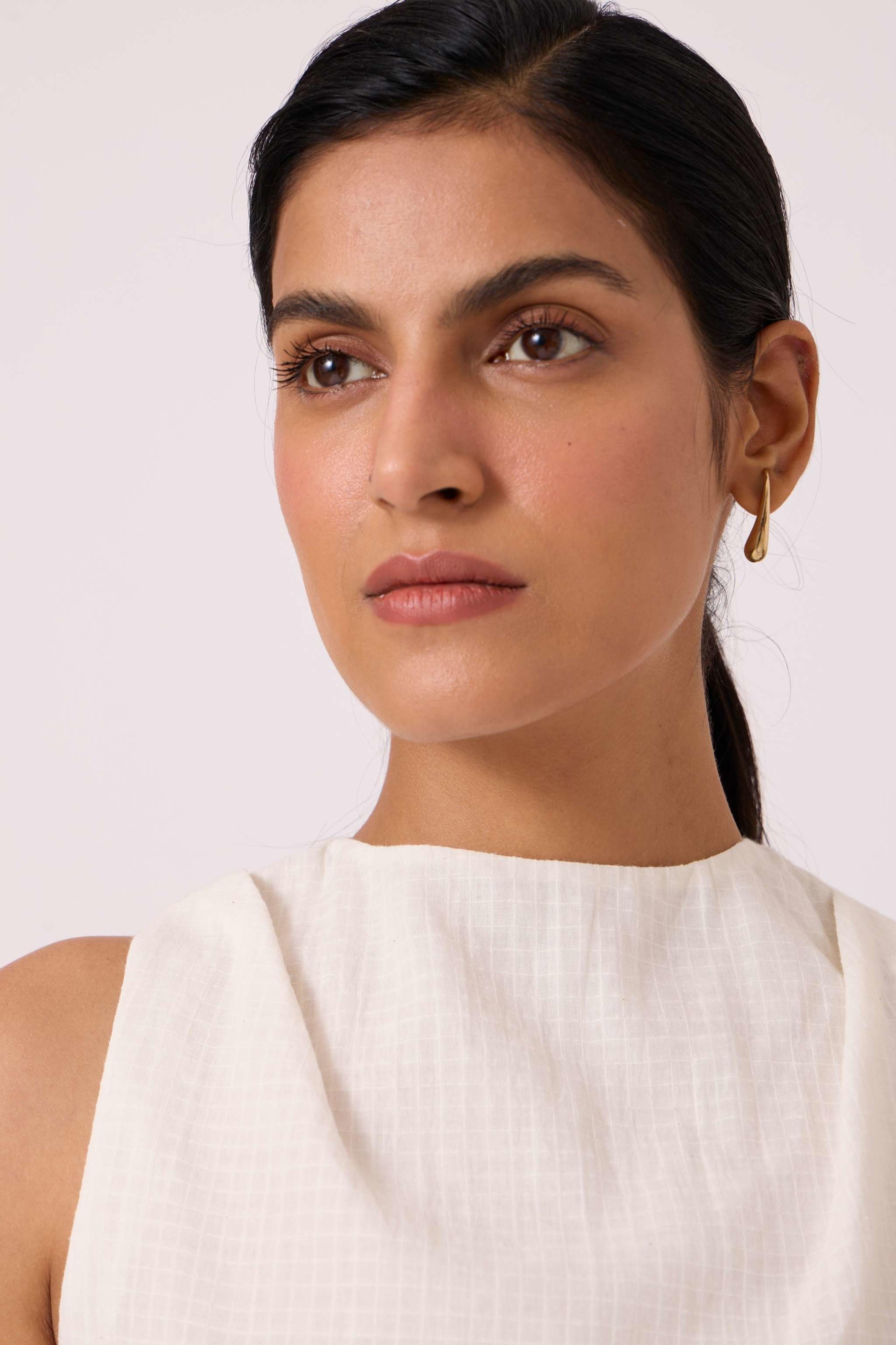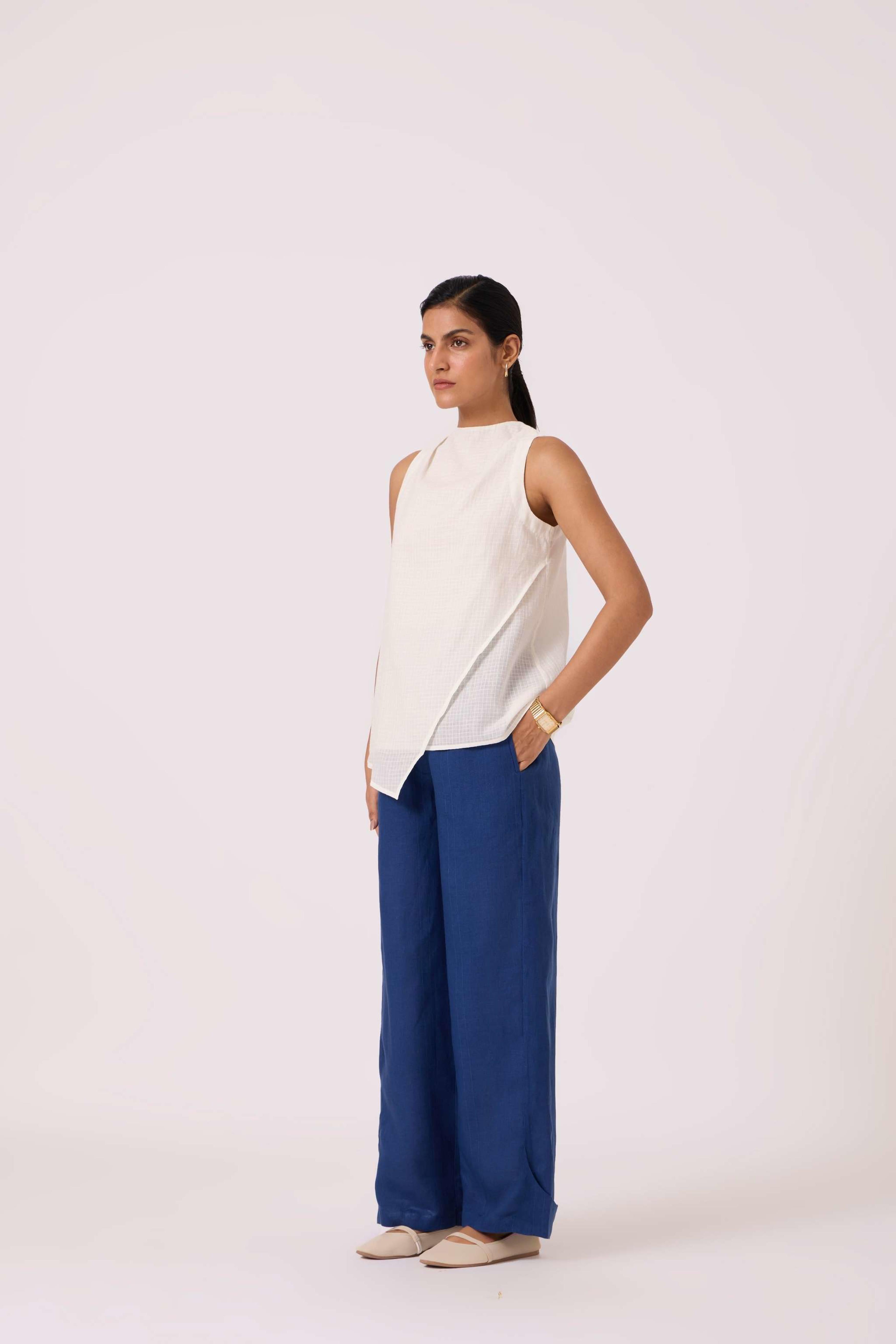 This *regular-fit* top features an elegant *draped* design with *in-cut shoulders*. The top is detailed with a stylish *asymmetric overlap panel* and a practical *back zip* closure. Like the other pieces in this collection, the fabric is a unique design developed in-house and *handwoven by artisans in Bengal*, ensuring a high-quality and distinctive look. The model, Chhavi, is 5'6" and is wearing a size XS.