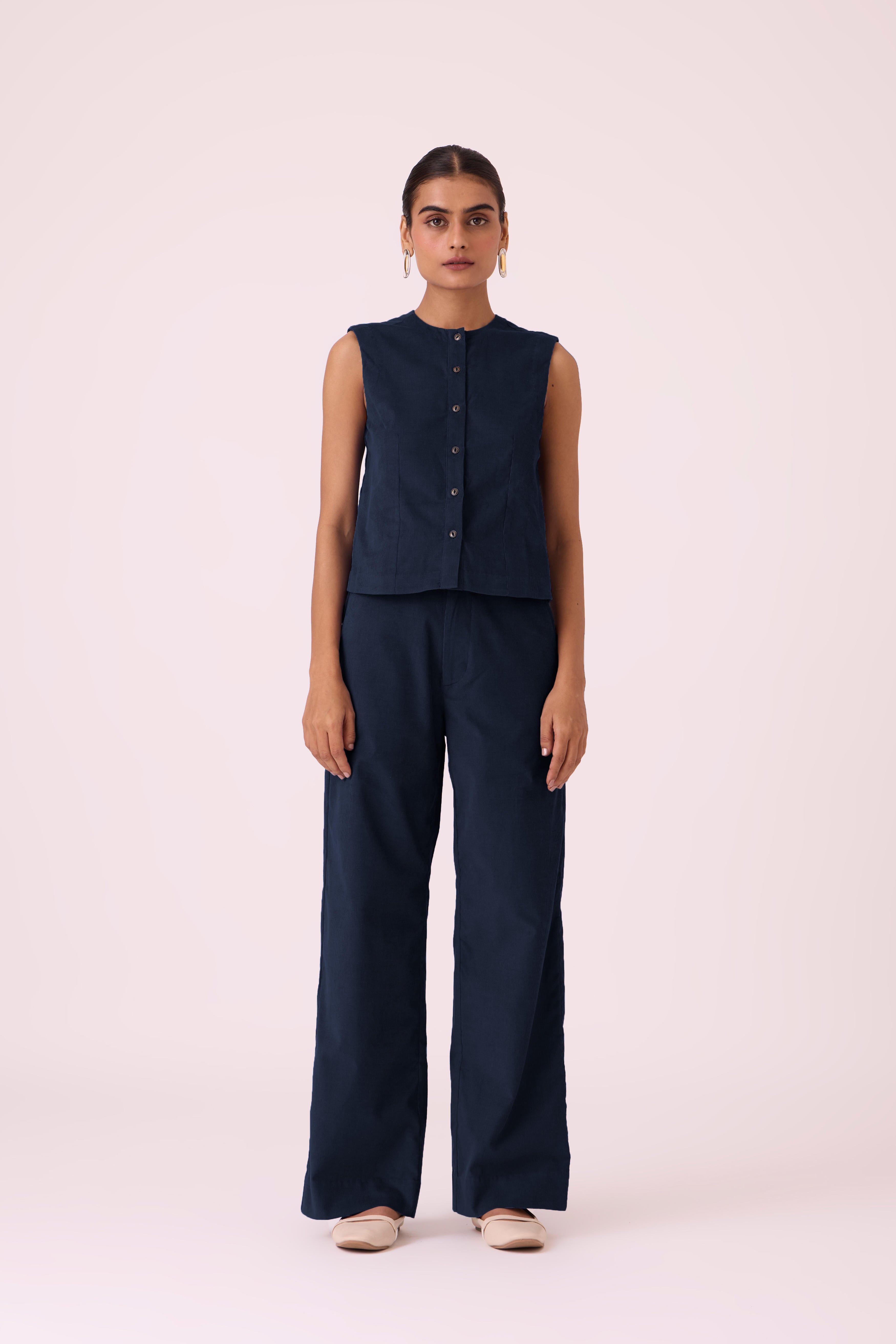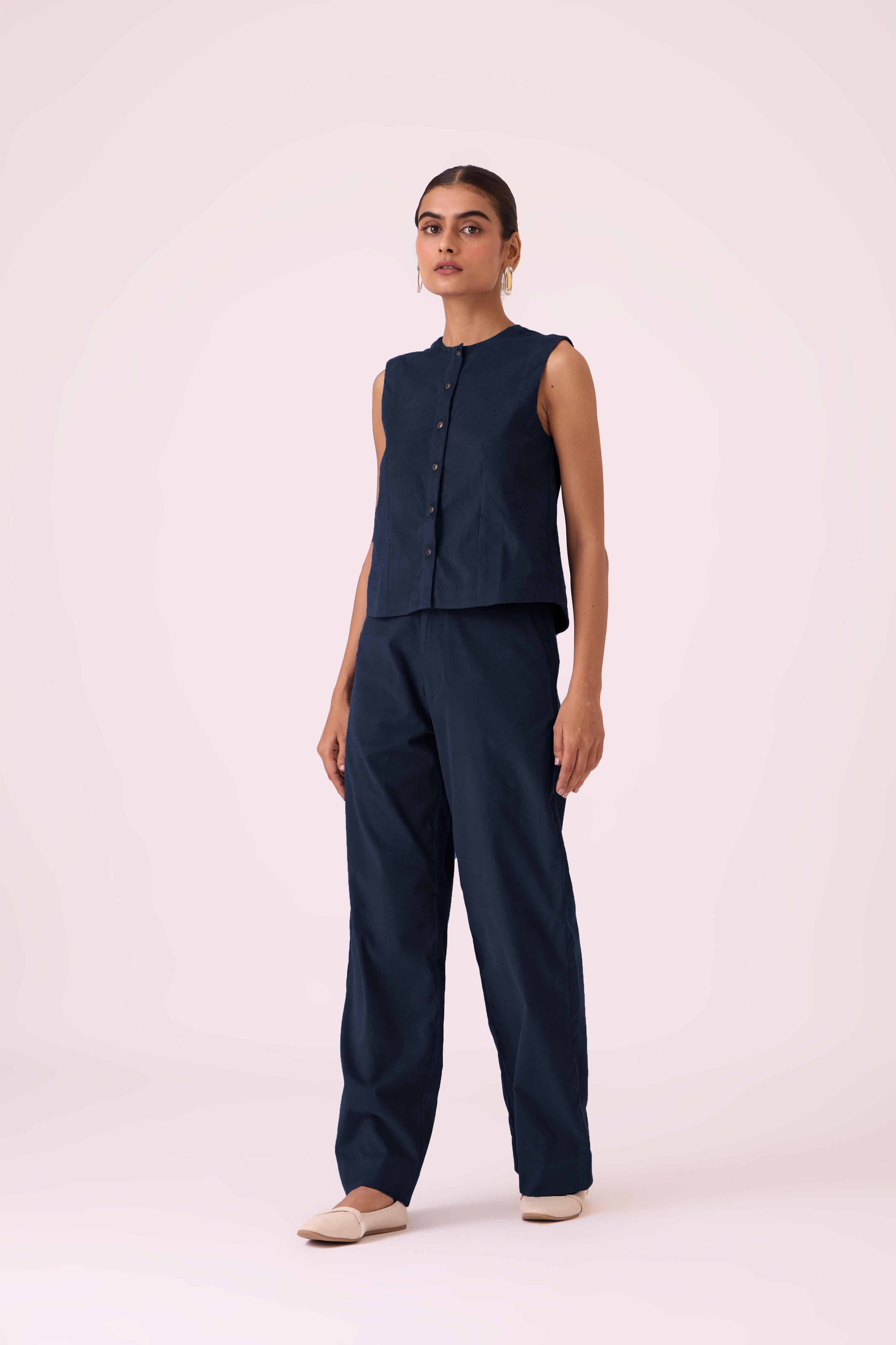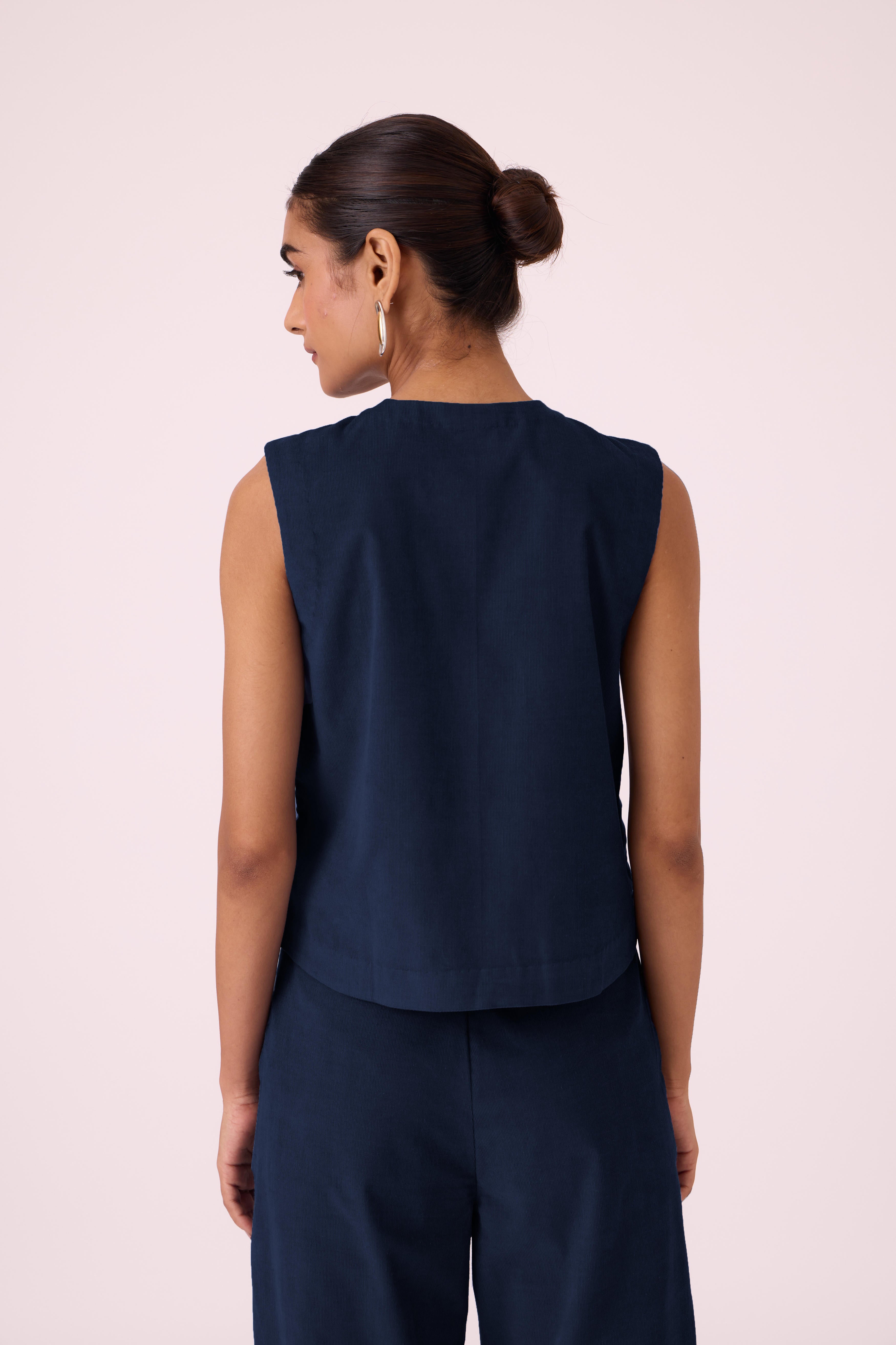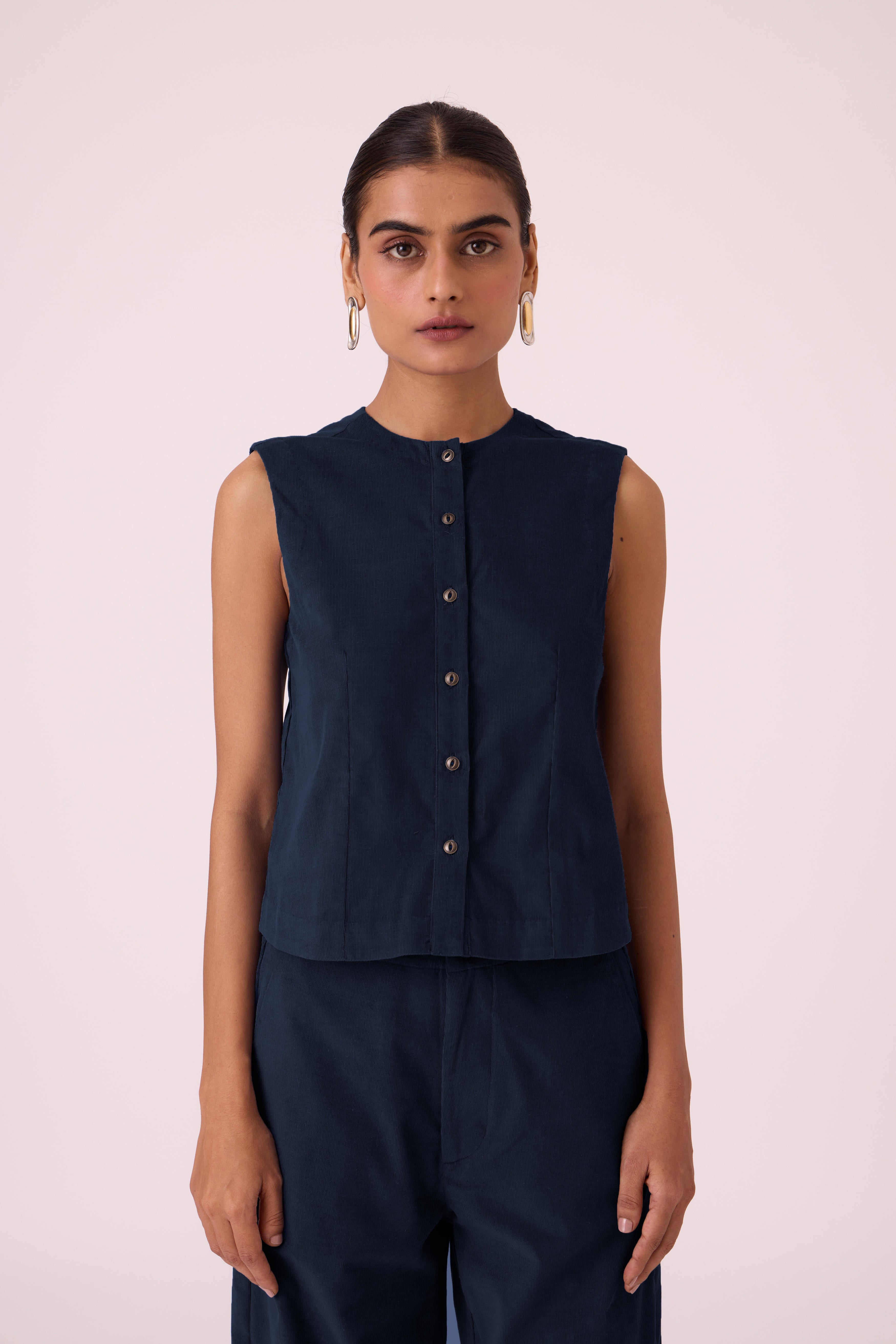 This is a sleeveless, *regular-fit top* with a *straight silhouette*. It's *slightly cropped* and features a *front button placket* with a *gently curved hem*. The model, Chhavi, is 5'6" and is wearing a size XS.