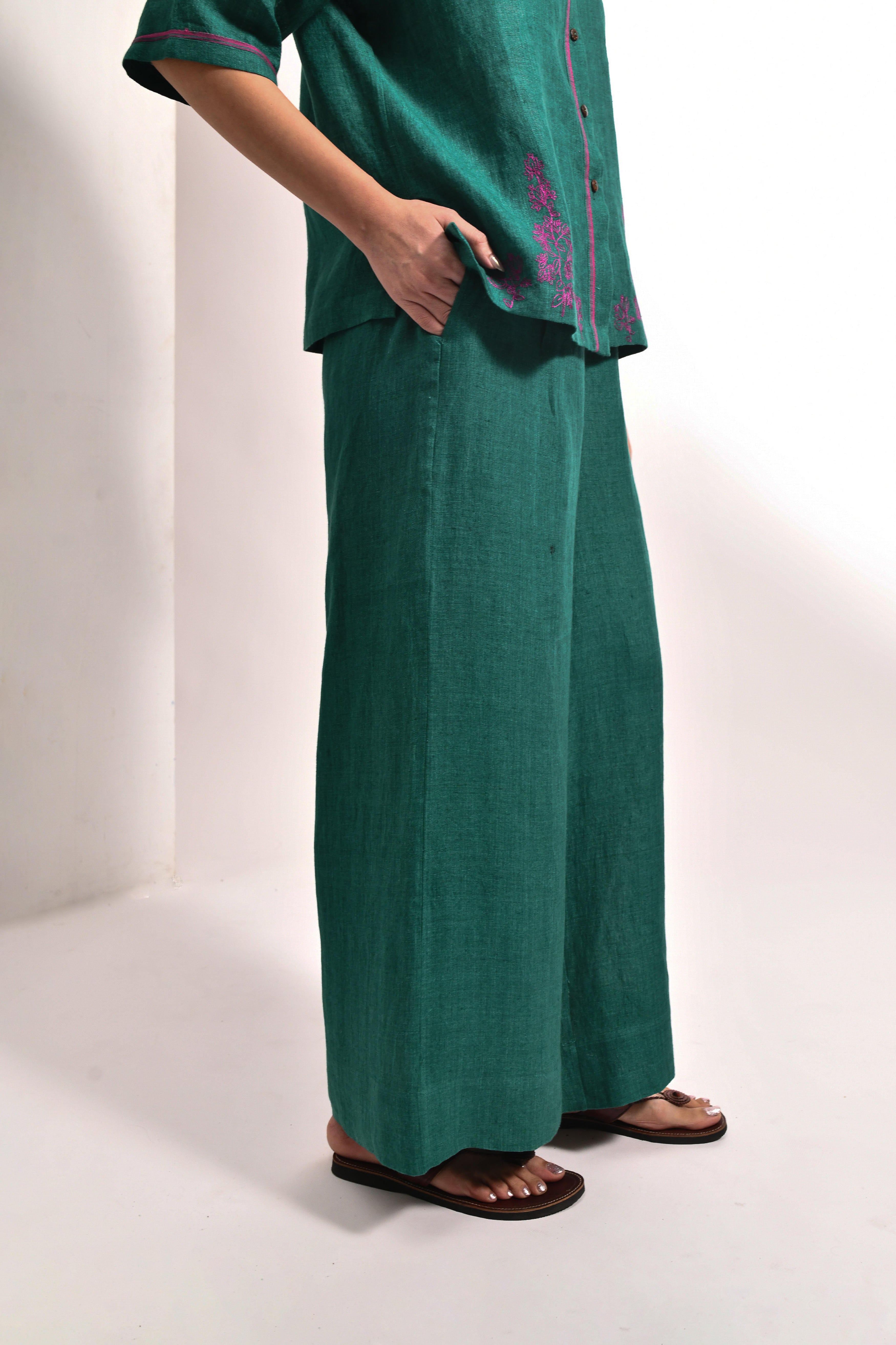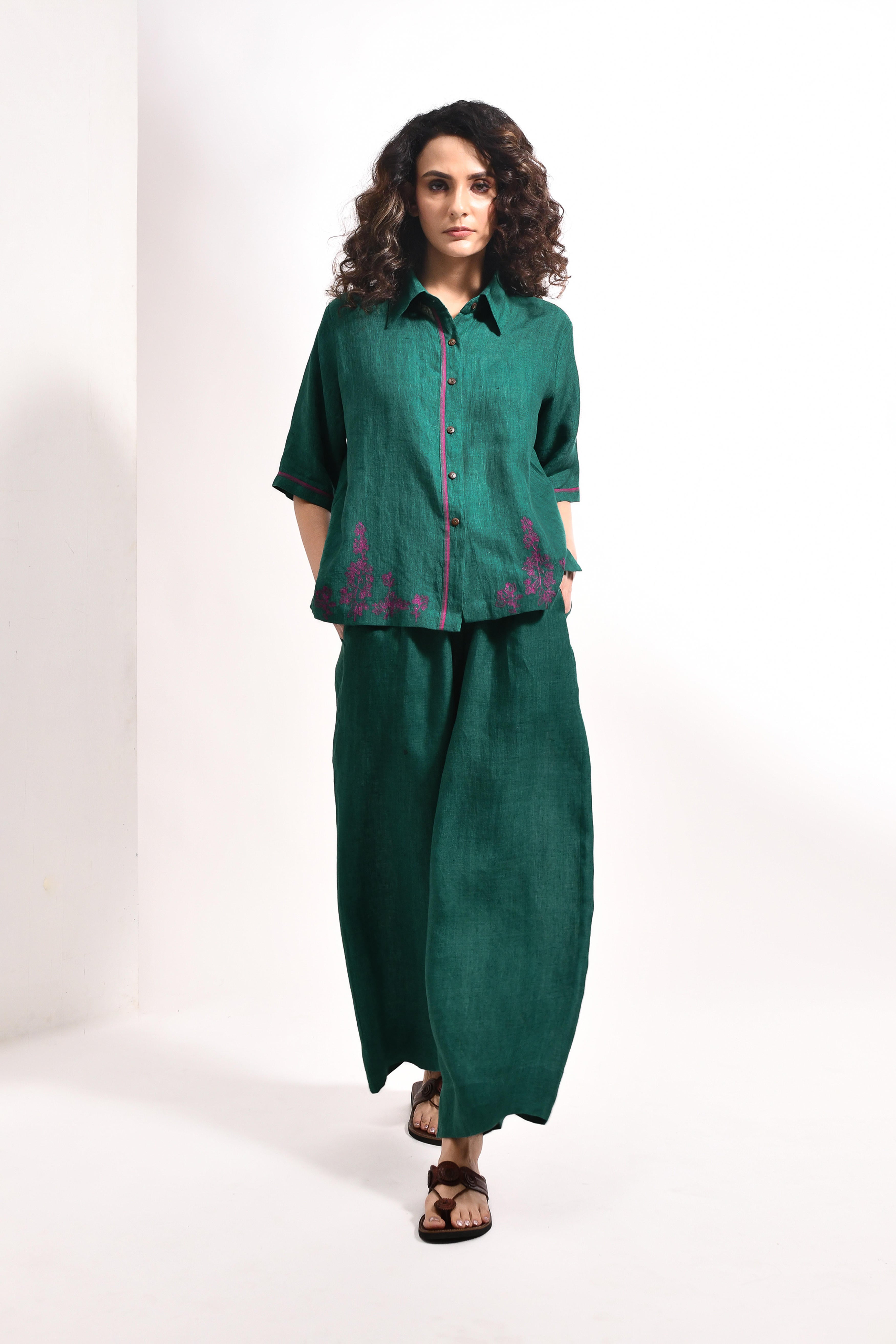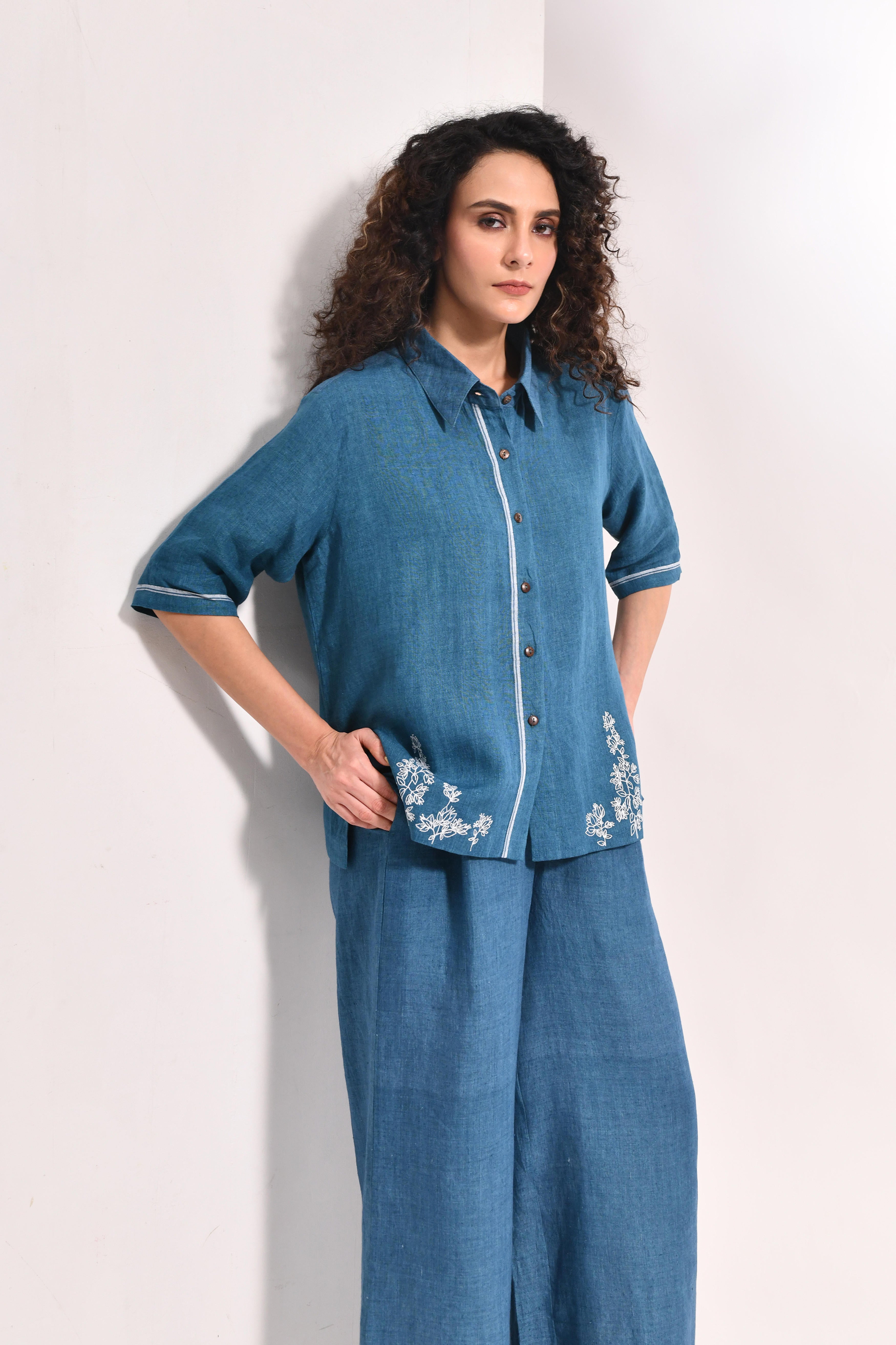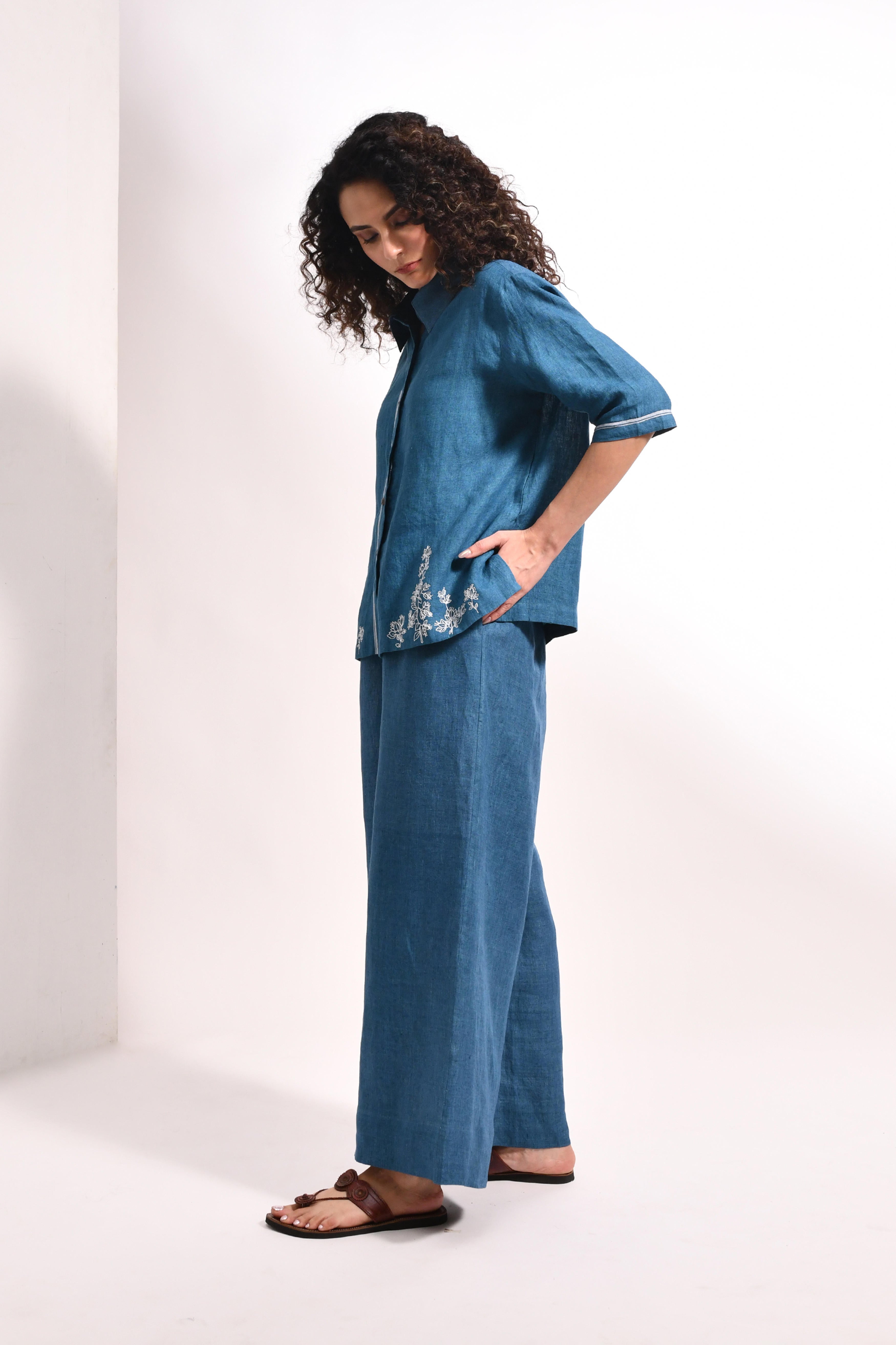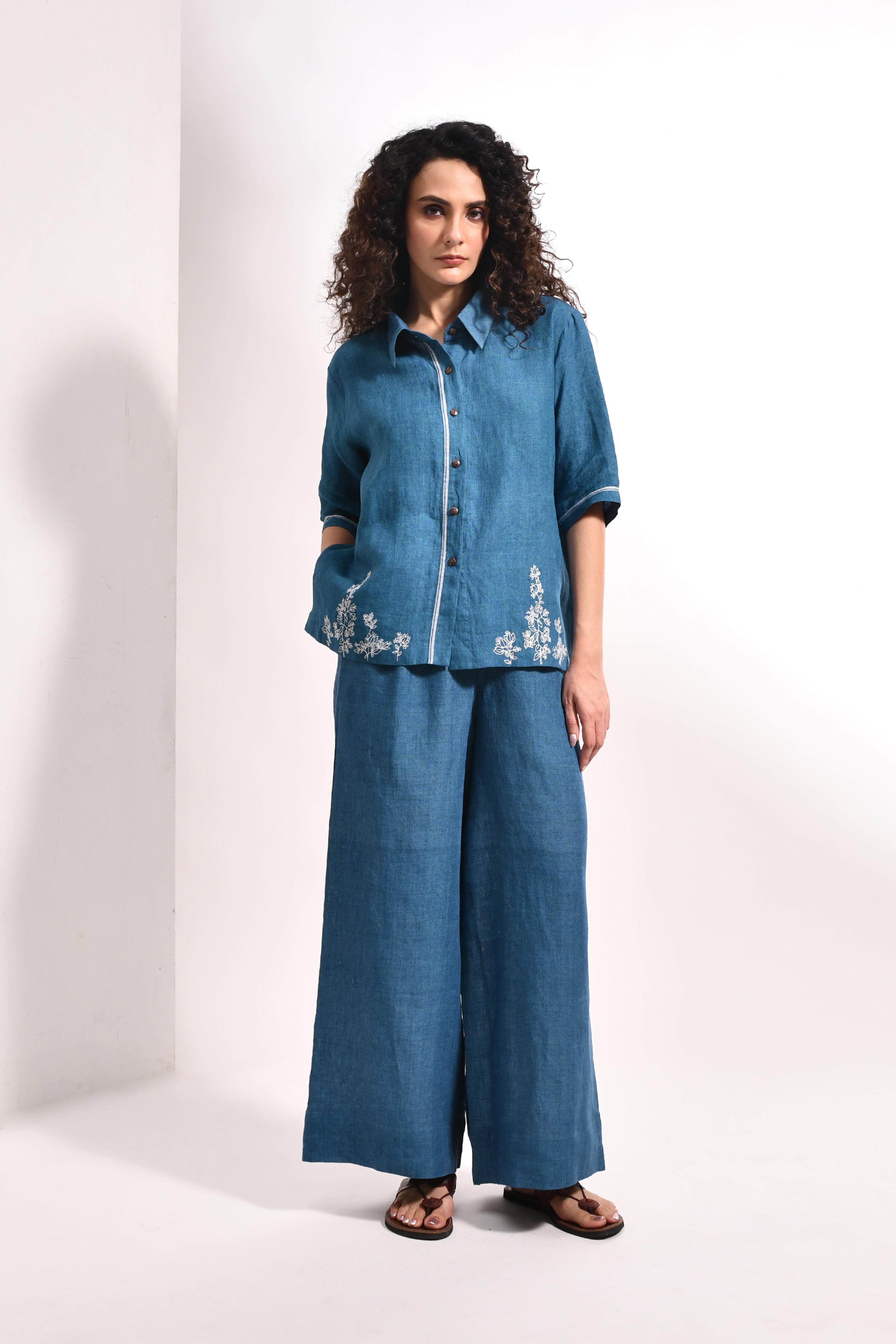 A tribute to Maya Angelou’s words — strength embroidered, voice stitched in thread, a shirt and trouser that move like poetry. Solid linen co-ord in French Blue Loose crop shirt with bougainvillea embroidery Maya Angelou quote embroidered at the back Long flared trousers with zip & back elastic Feminine ease with poetic strength