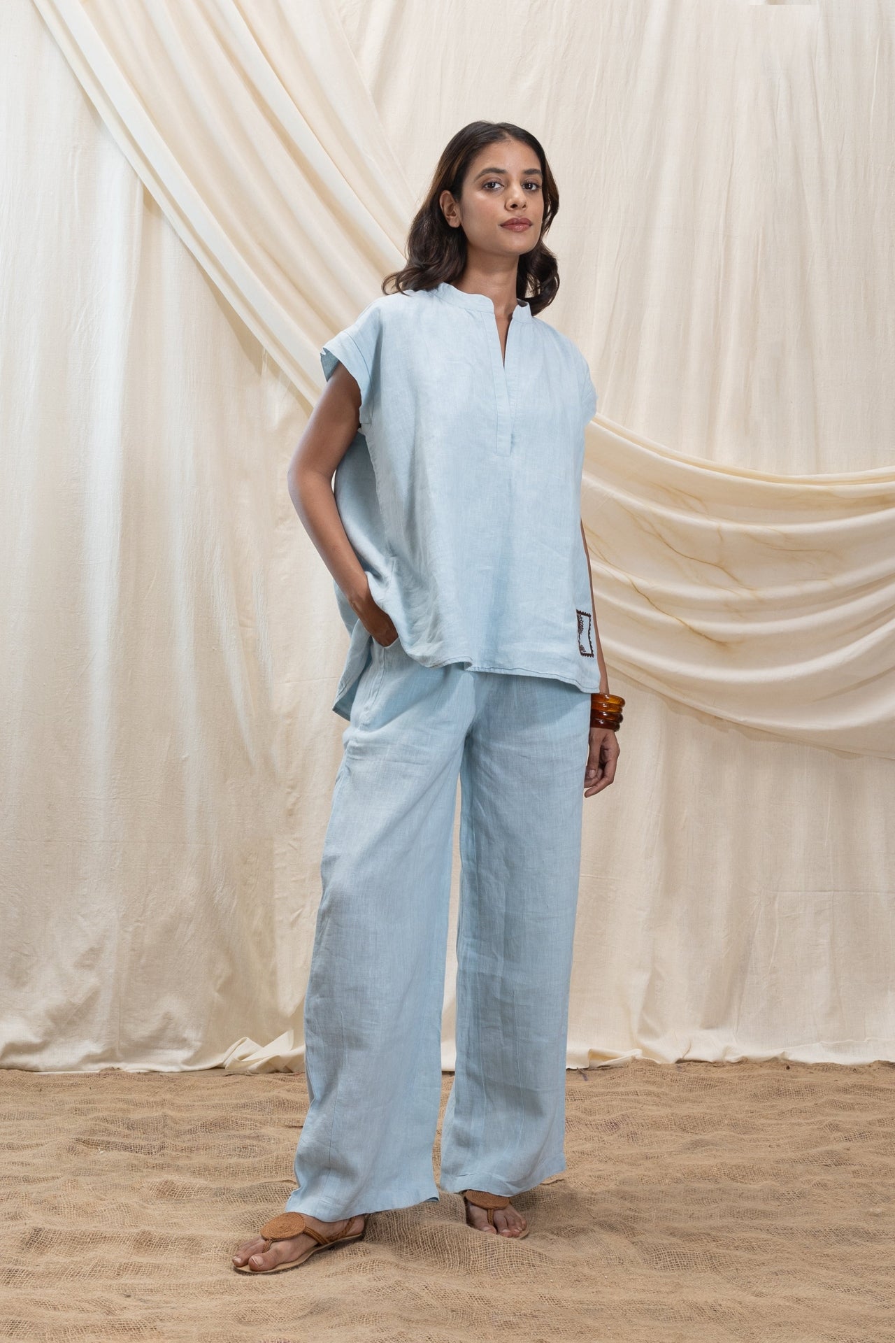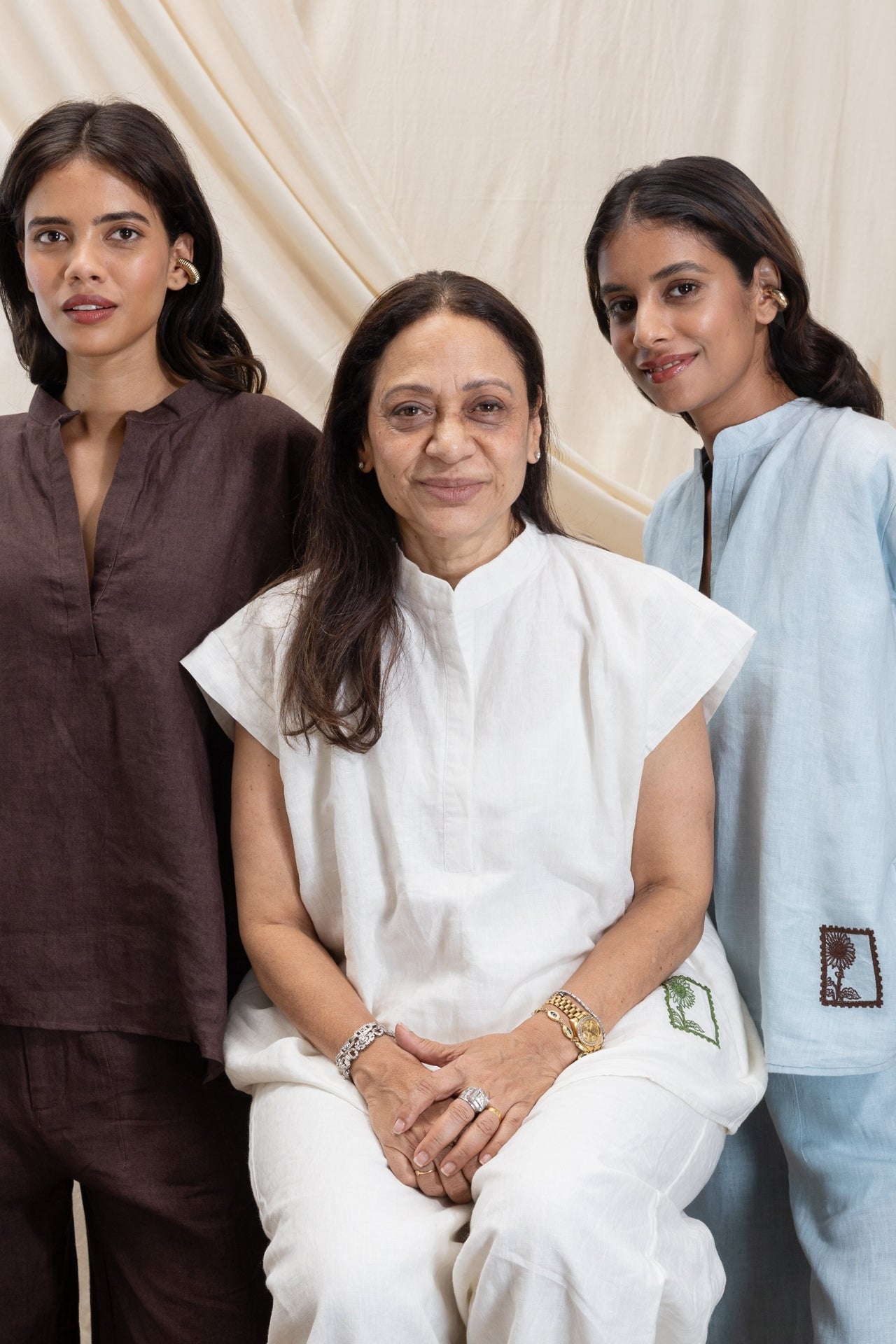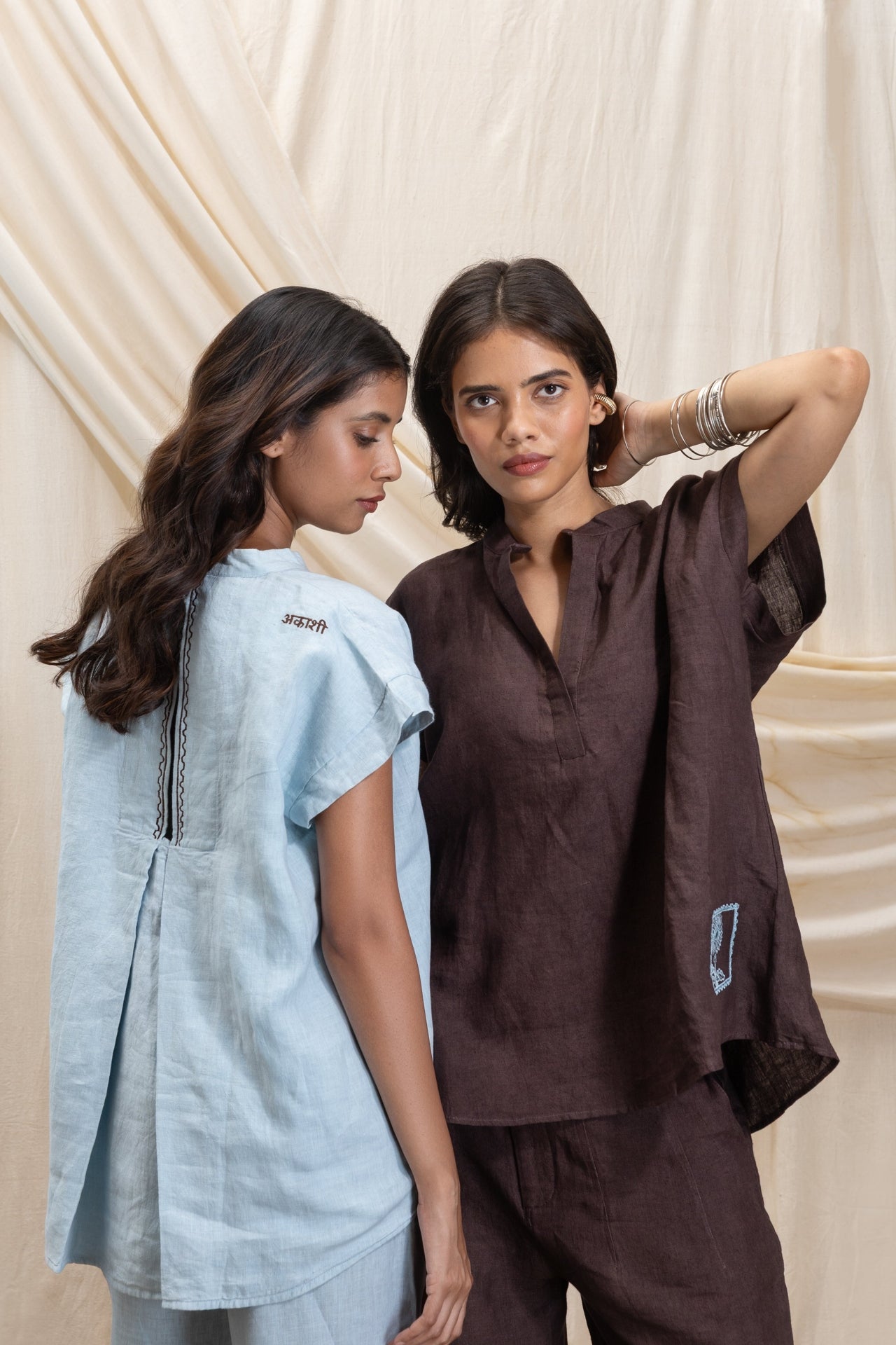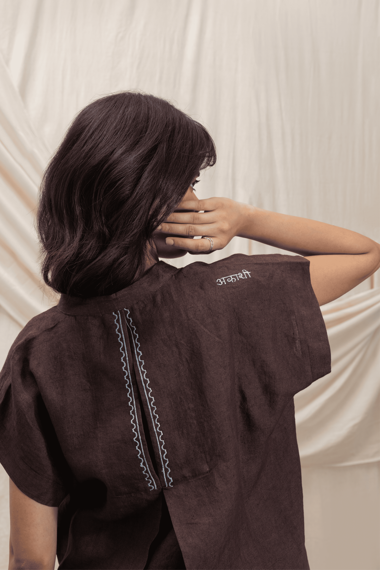 A box-style top with a slit V-neck at both the front and back, paired with a mandarin collar for a clean, modern touch. The back features soft pleats for added volume and ease, while drop shoulders and short sleeves enhance the relaxed feel. The back V-neckline is elevated with our signature line embroidery in a contrasting color, complemented by the Akashi logo in Hindi. Our signature stamp is placed at the front for a subtle yet distinct finish.