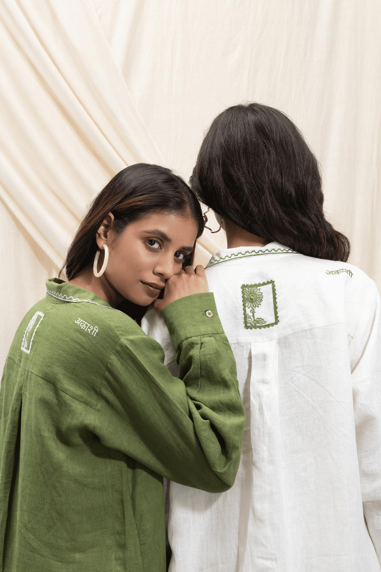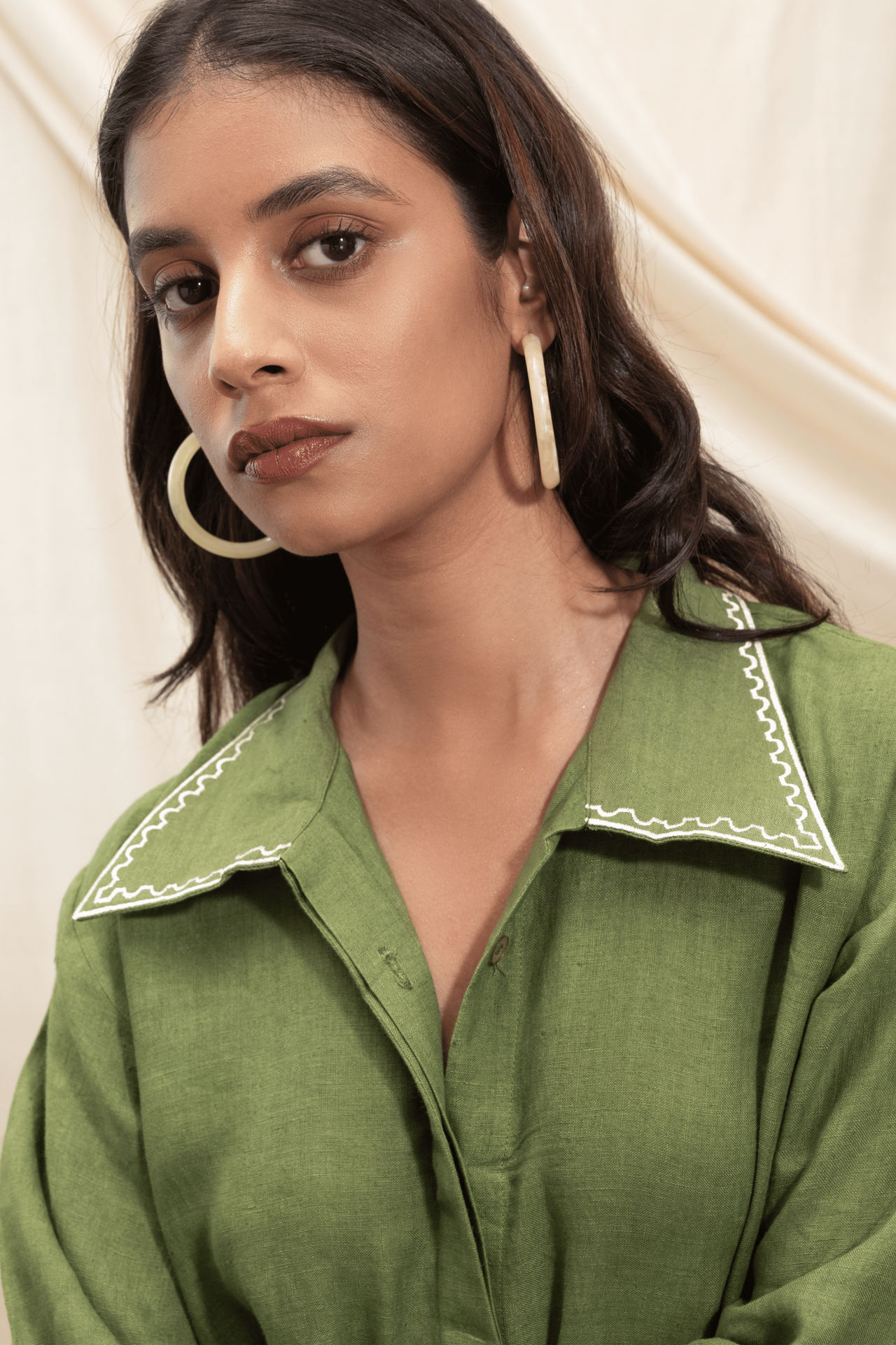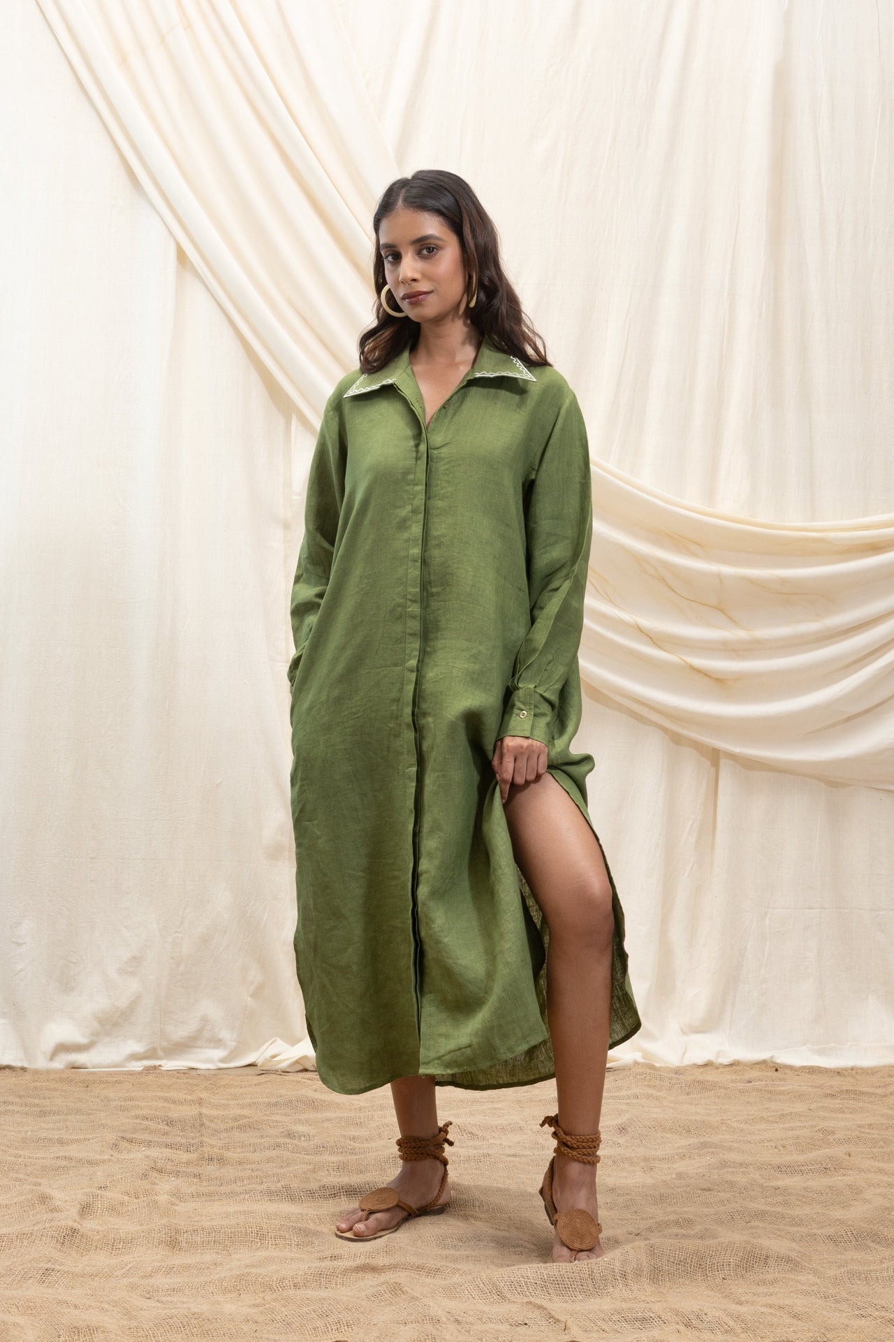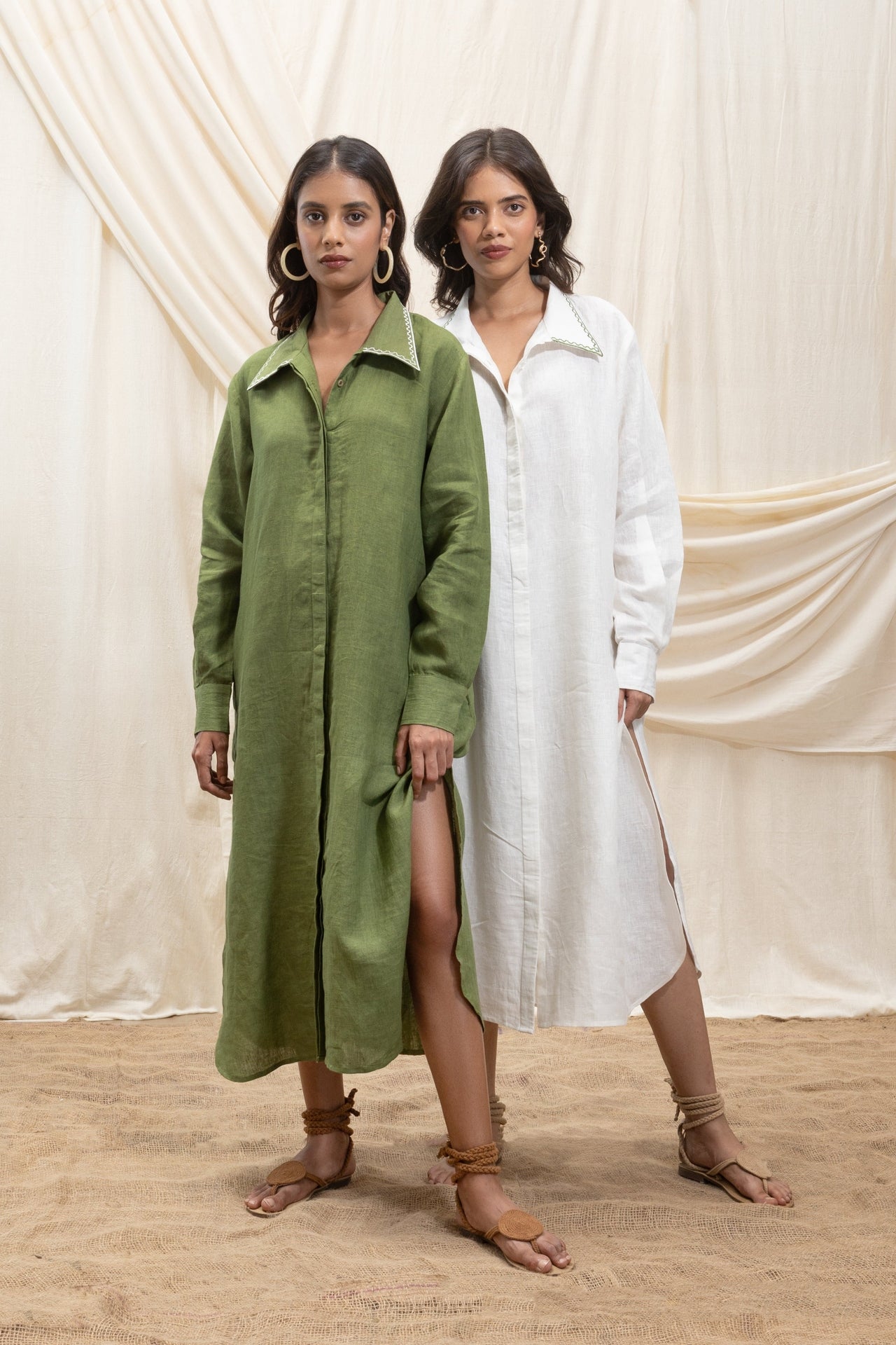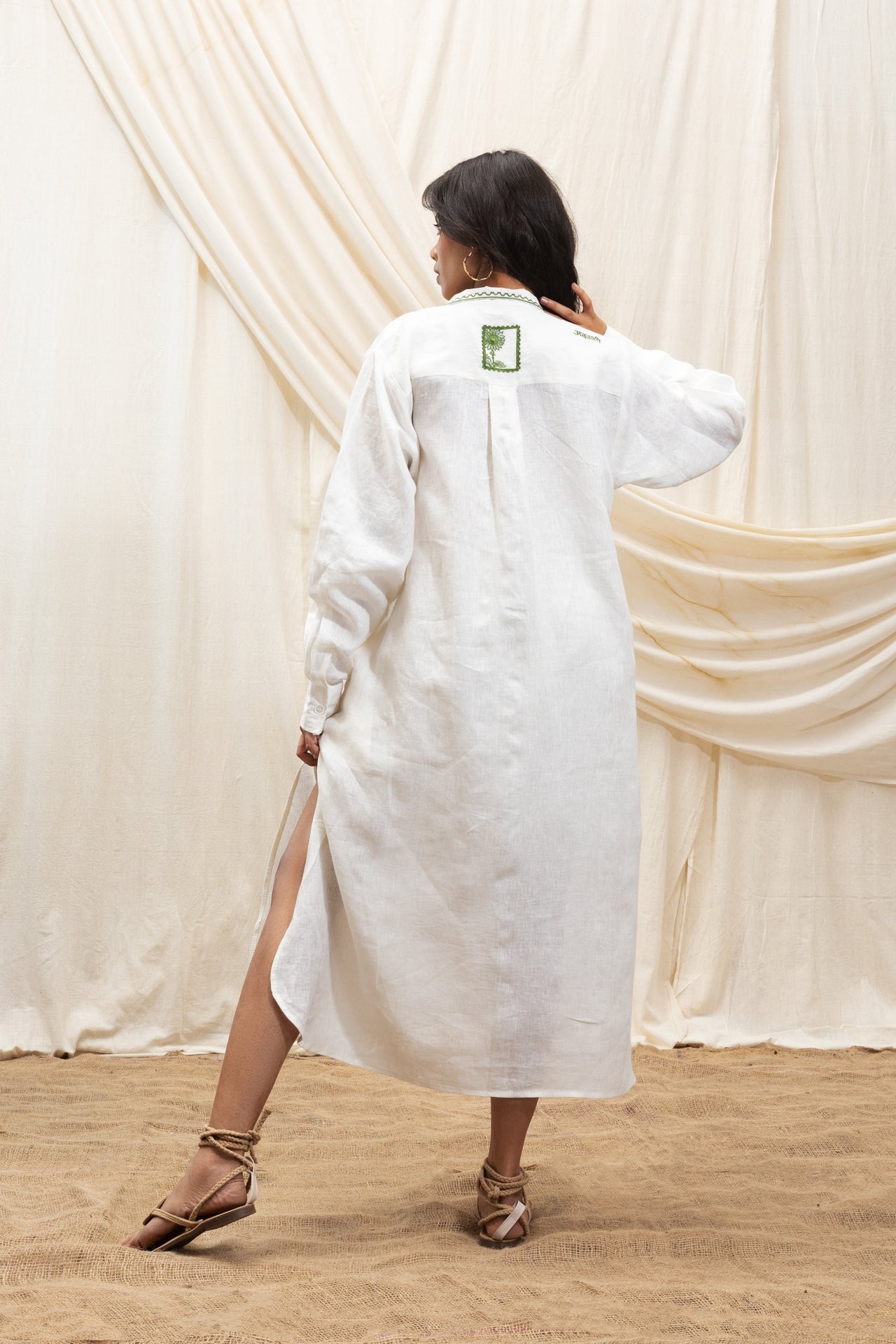 A sophisticated yet effortless full-length shirt dress featuring a bold thigh-high slit for a contemporary edge. Designed with practical pockets on both sides, it blends style with functionality. The collar is accentuated with our signature line embroidery in a contrasting shade, adding a refined detail. At the back, our signature stamp and Akashi logo in Hindi are embroidered in their signature placements. The full sleeves are tailored with a relaxed fit and finished with front cuff button fastenings, enhancing the dress’s cool, laid-back appeal.