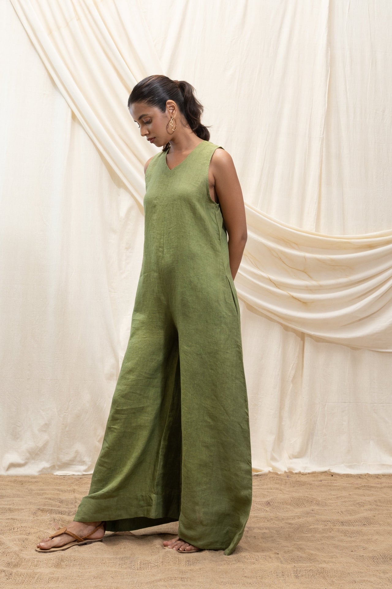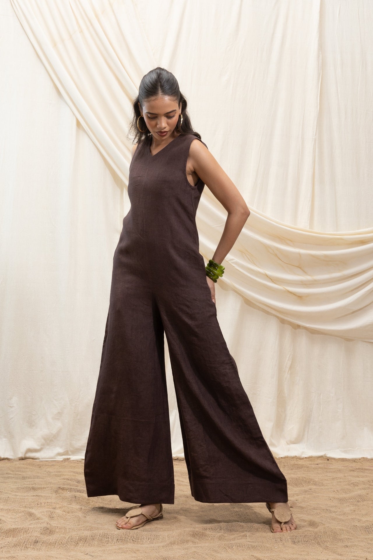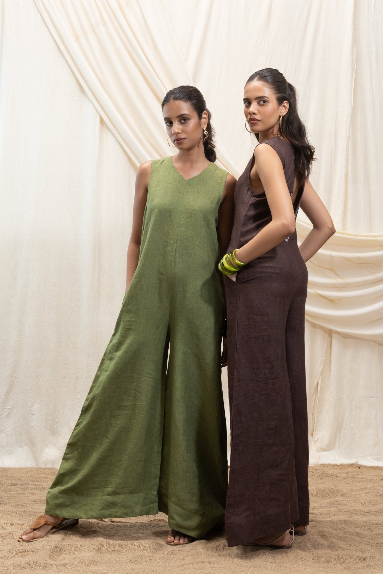 A relaxed-fit, full-length sleeveless jumpsuit designed for effortless style and comfort. The back features an elegant oval-shaped cutout, highlighted with our signature line embroidery in a contrasting shade. A button fastening at the neck ensures a secure fit, while our signature stamp and Akashi logo in Hindi add a distinctive touch. The flared bottoms enhance the flow of the silhouette, giving it a cool, easygoing appeal.