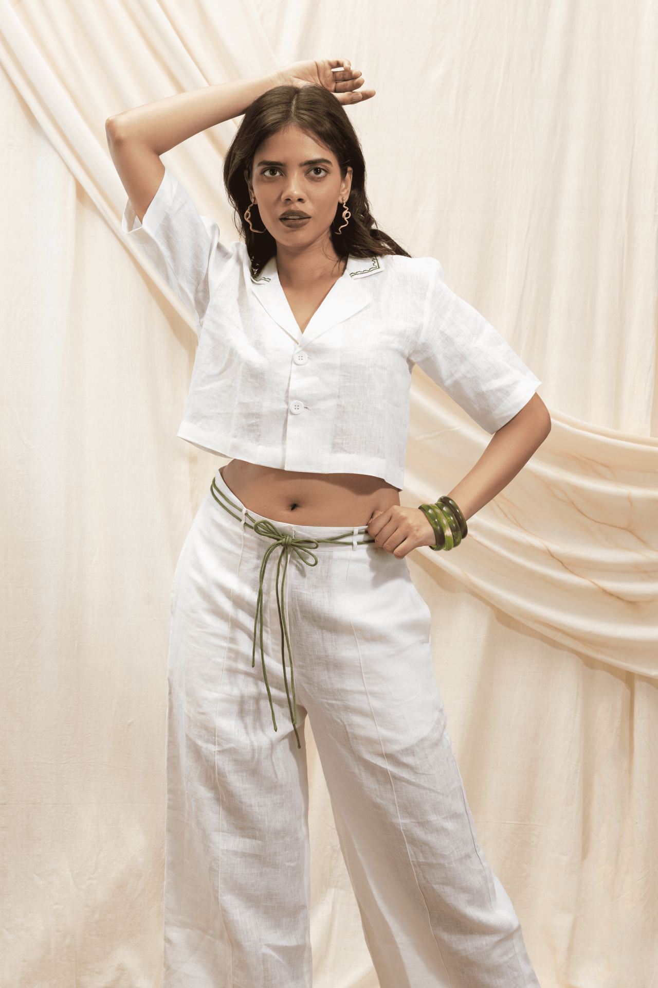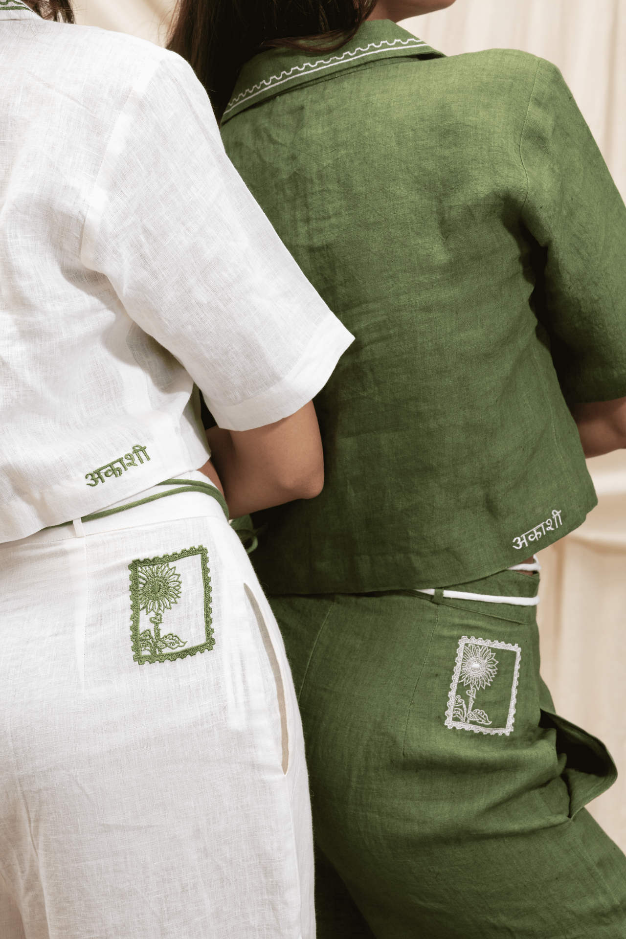 Tailored, high-rise pants with a sleek button and zip fastening. The silhouette is clean and structured, complemented by contrasting drawstrings at the waist that add a playful, chic twist. Pockets on either side enhance functionality, while the back features our signature stamp and Akashi logo in Hindi for a thoughtful finish.