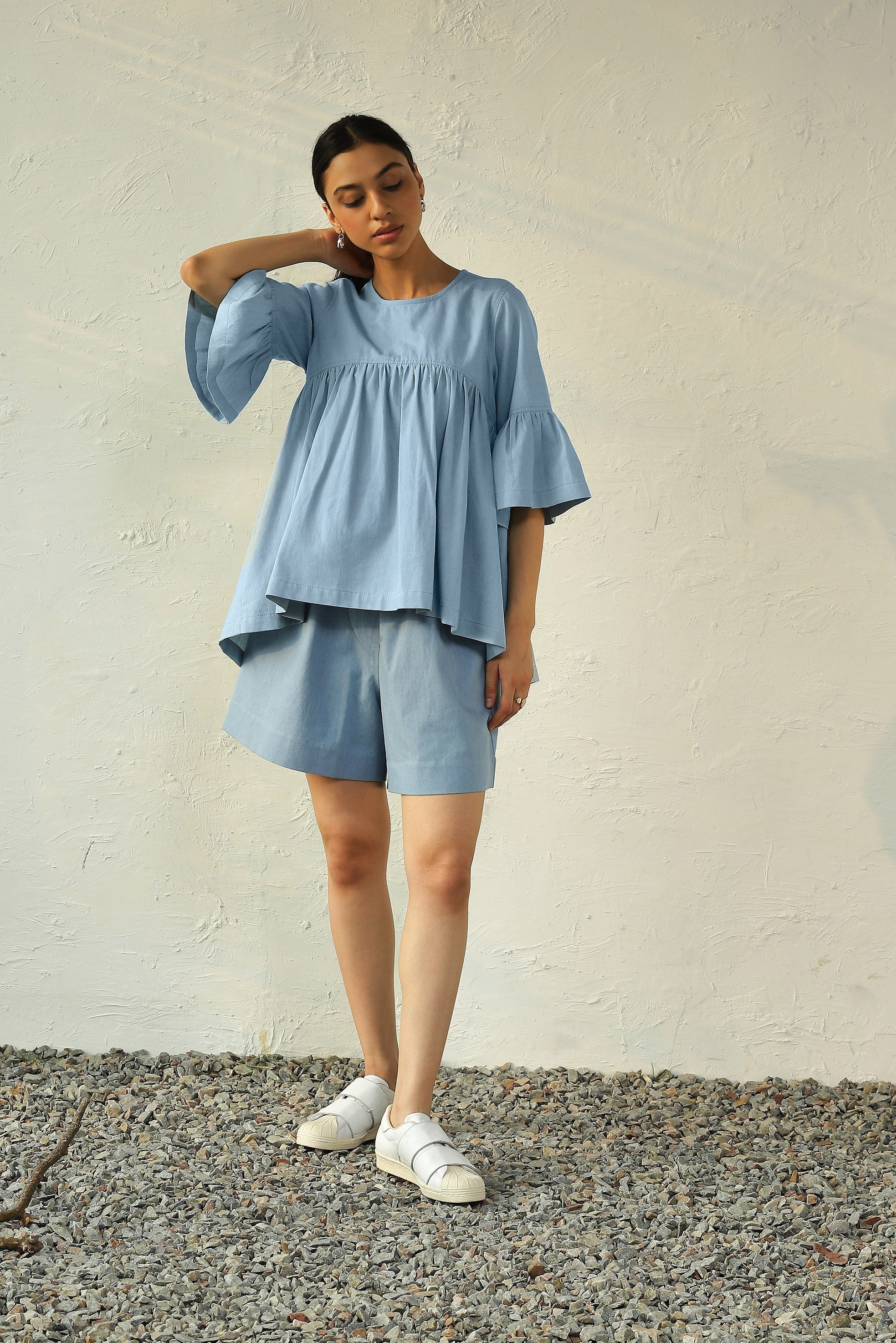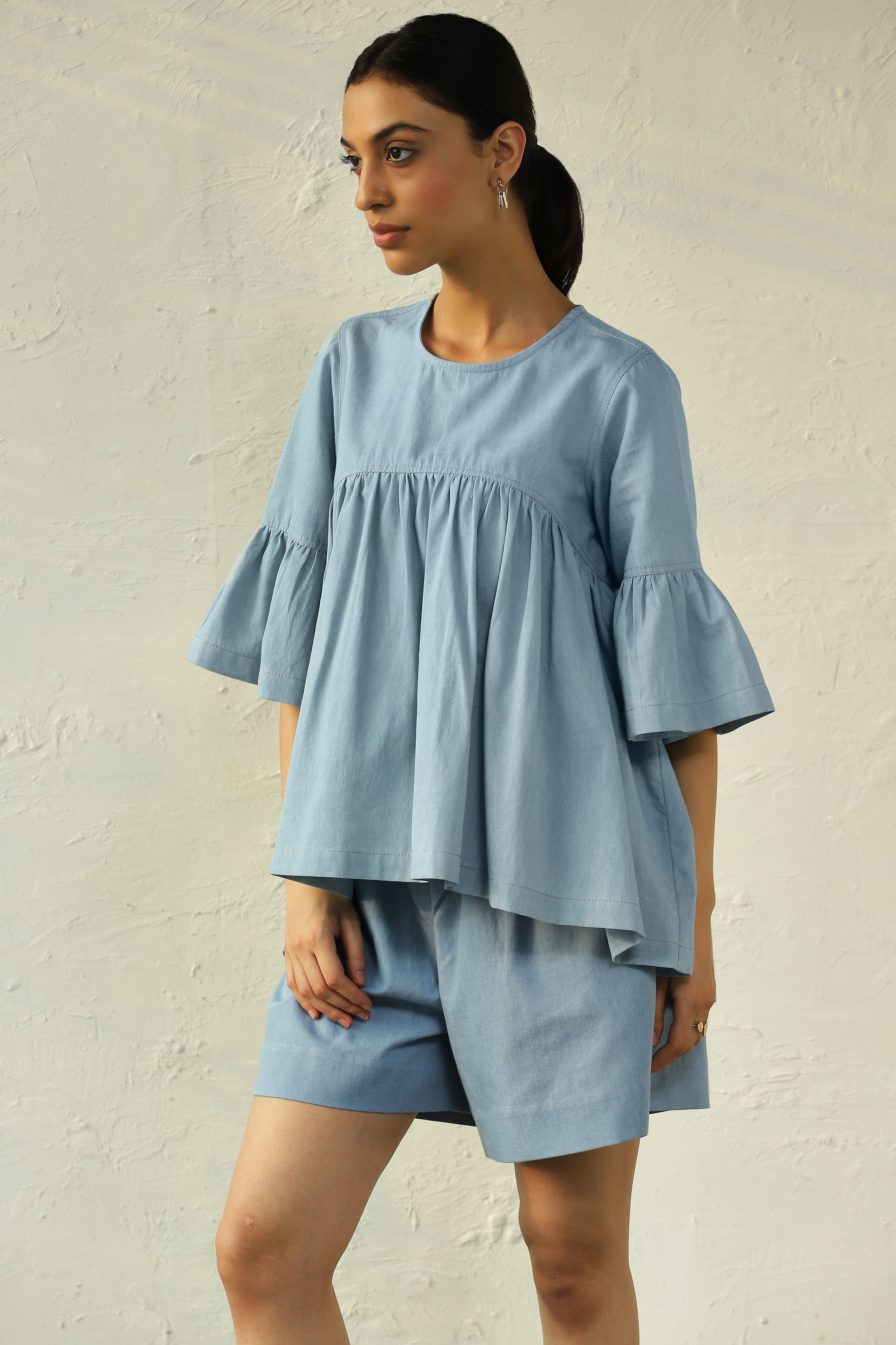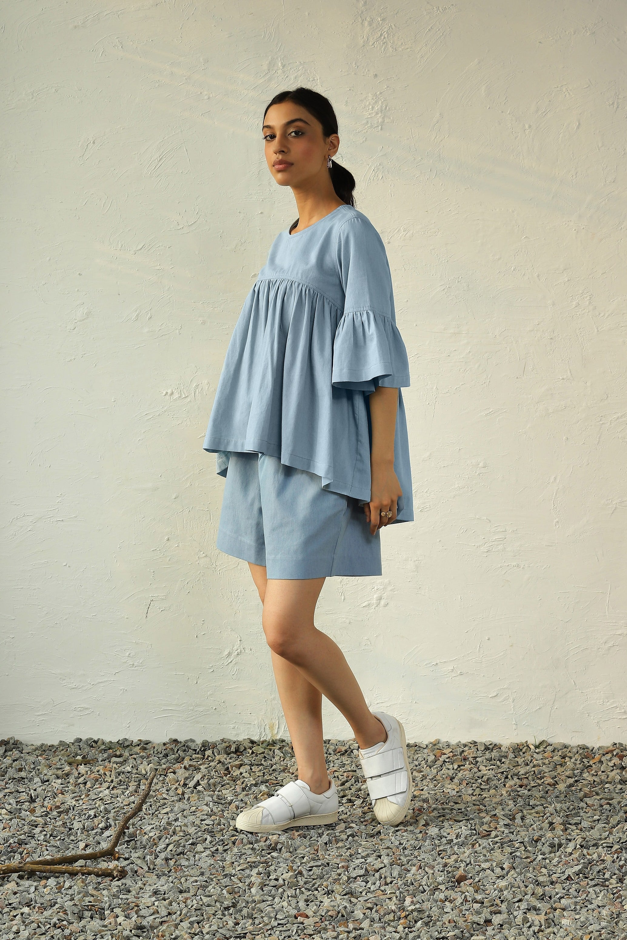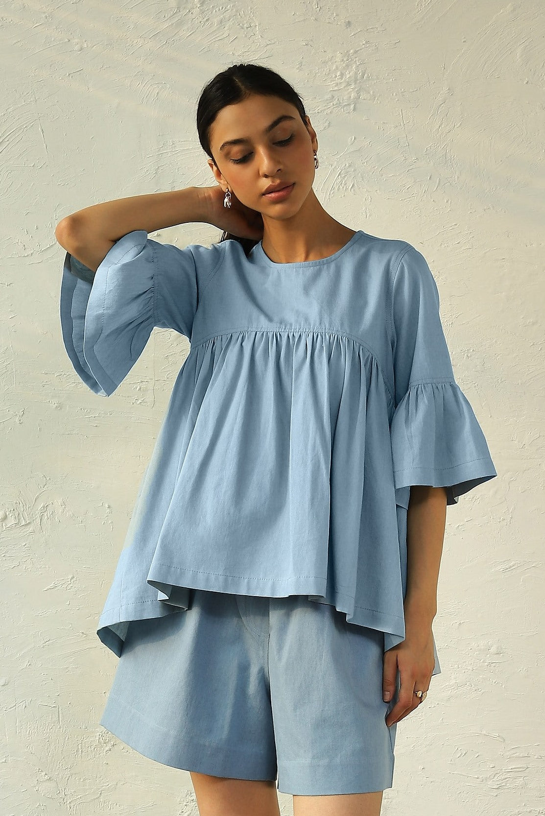 The floaty silhouette of this blouse evokes the carefree spirit of summer. Crafted from lightweight and breathable cotton in light denim colour, and has a round neck that’s enhanced by the voluminous gathered sleeve design. This versatile piece can be worn with fitted trousers/ jeans, shorts or pallazos. Wear it with our matching denim shorts for a complete look.