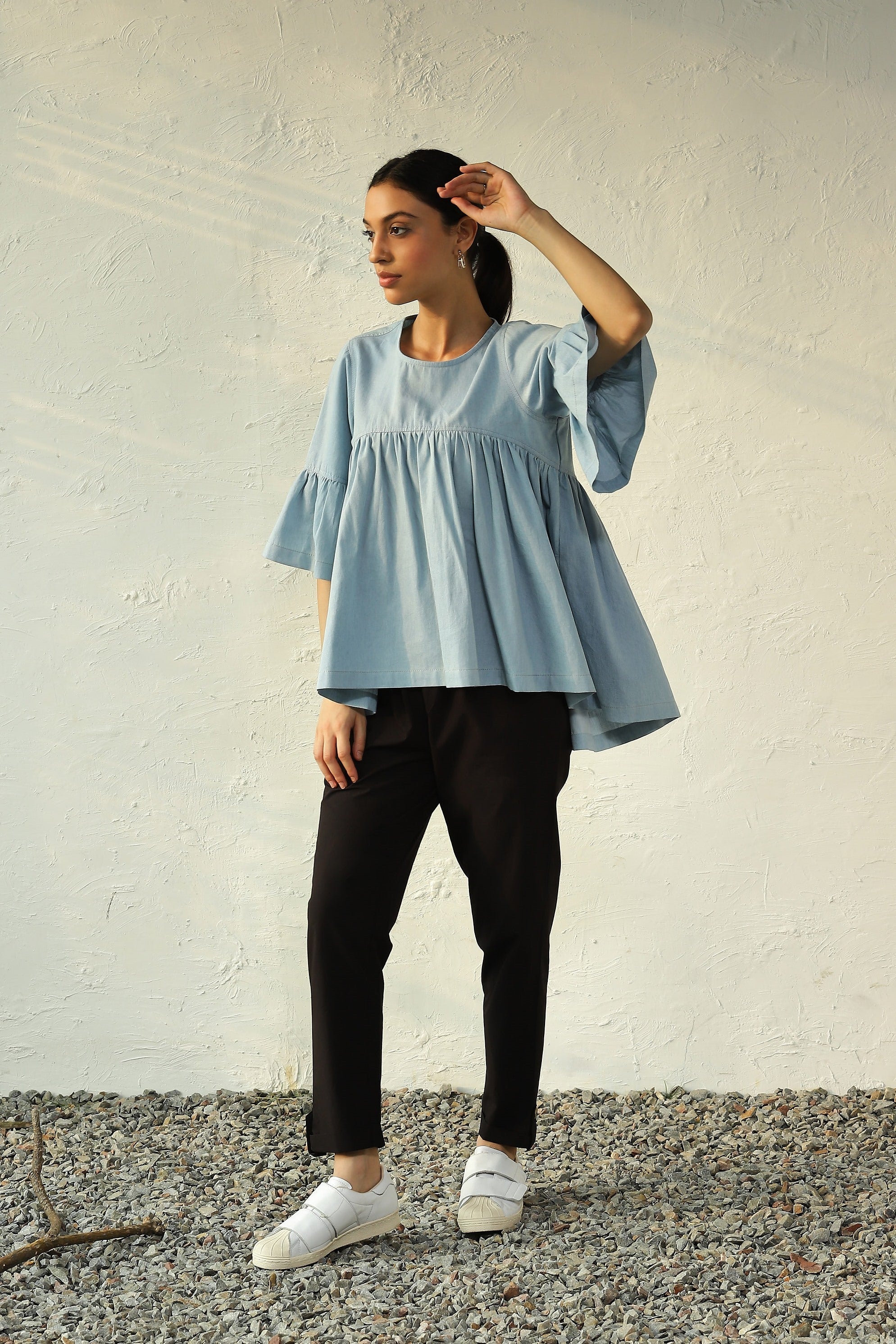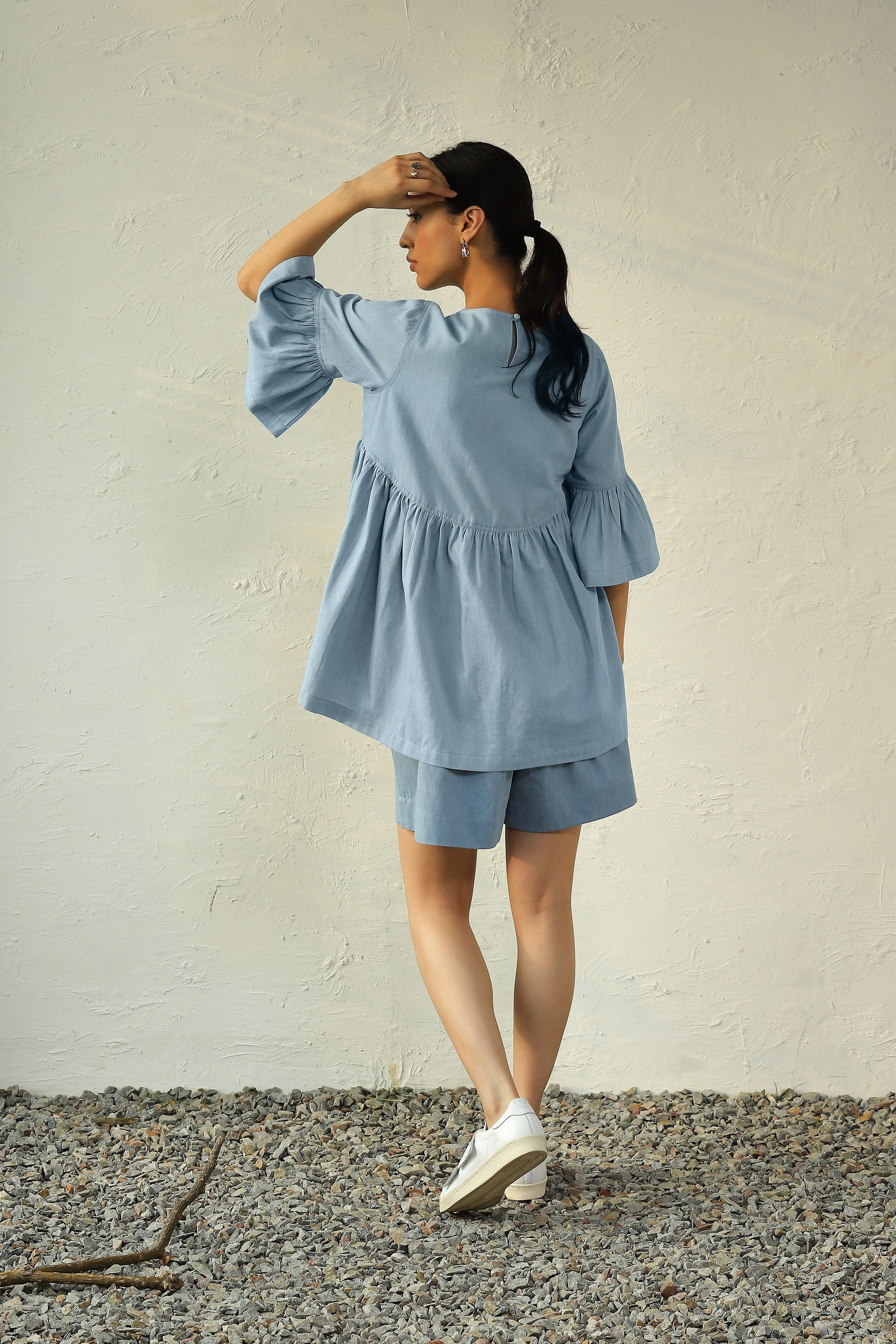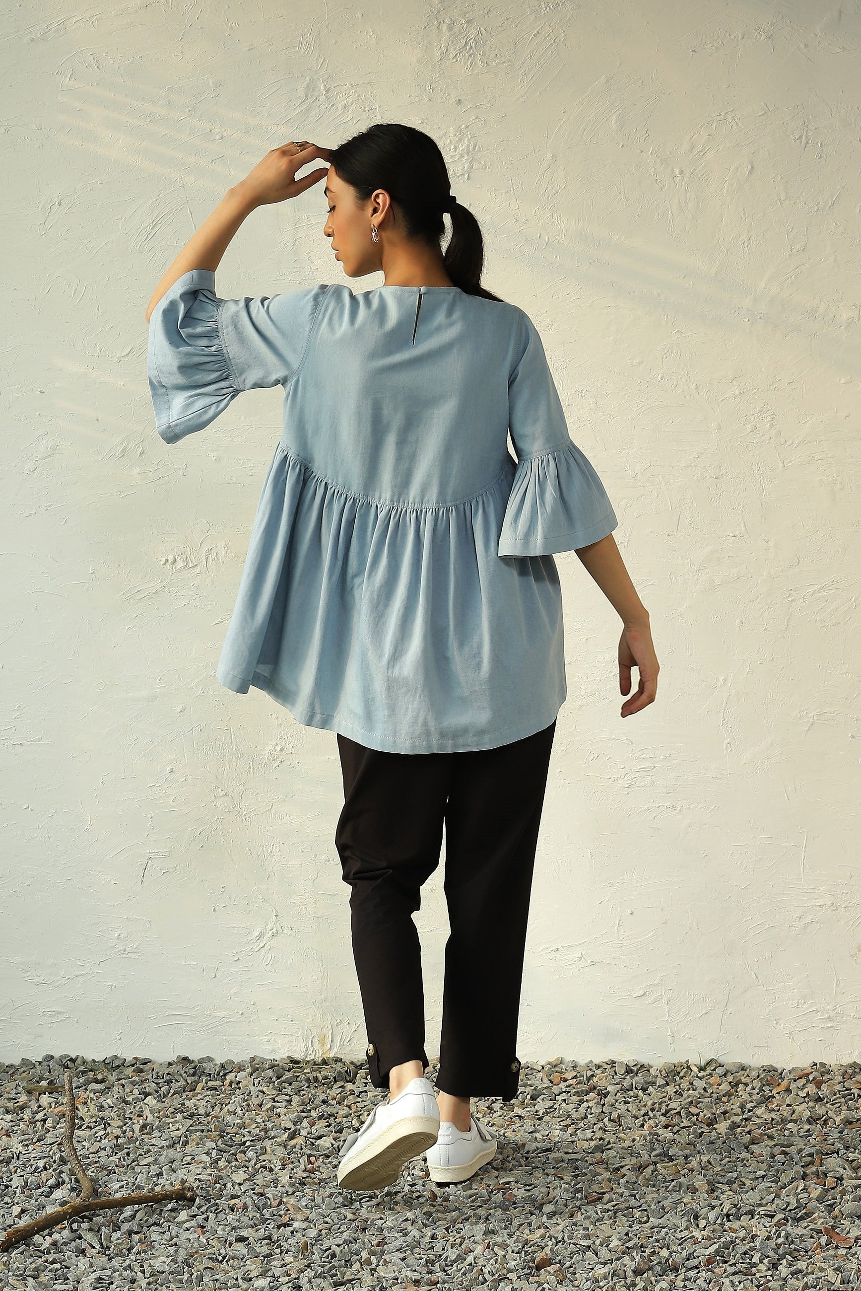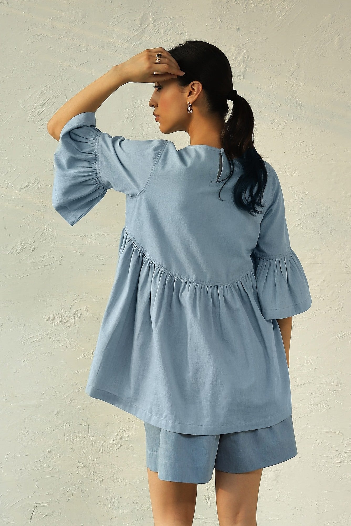 The floaty silhouette of this blouse evokes the carefree spirit of summer. Crafted from lightweight and breathable cotton in light denim colour, and has a round neck that’s enhanced by the voluminous gathered sleeve design. This versatile piece can be worn with fitted trousers/ jeans, shorts or pallazos. Wear it with our matching denim shorts for a complete look.