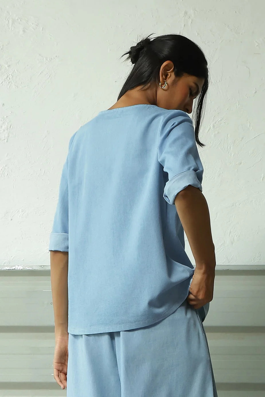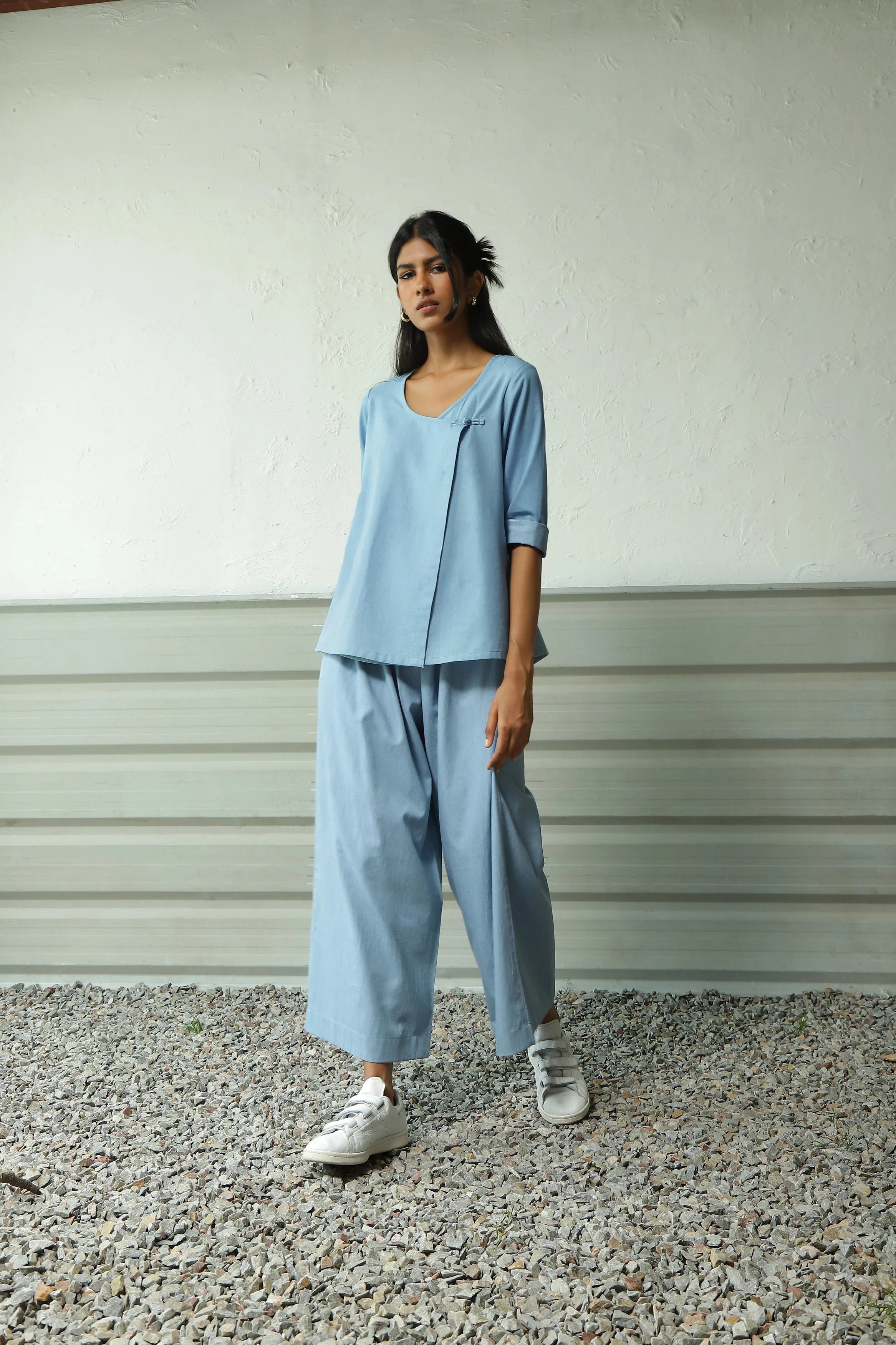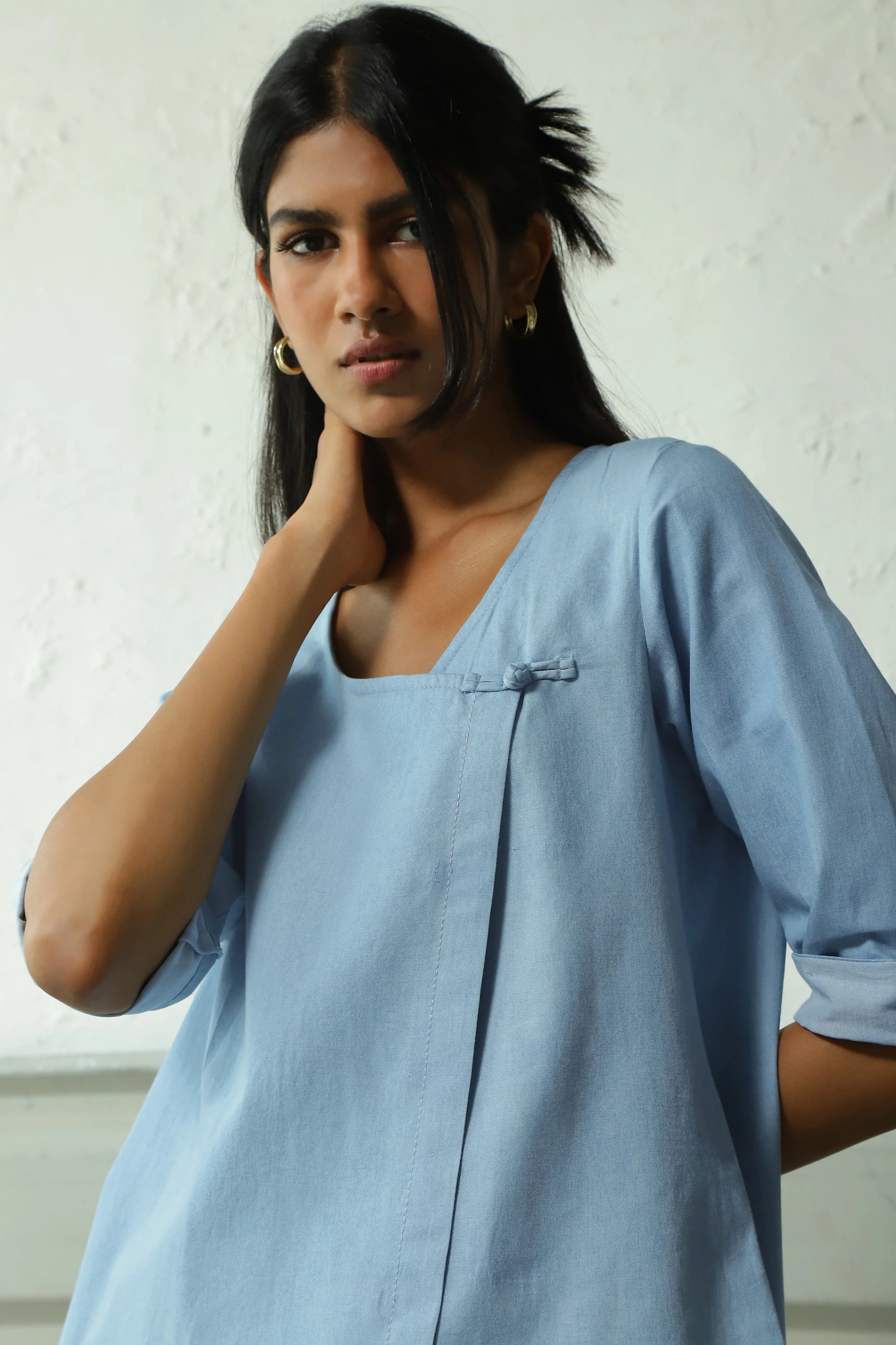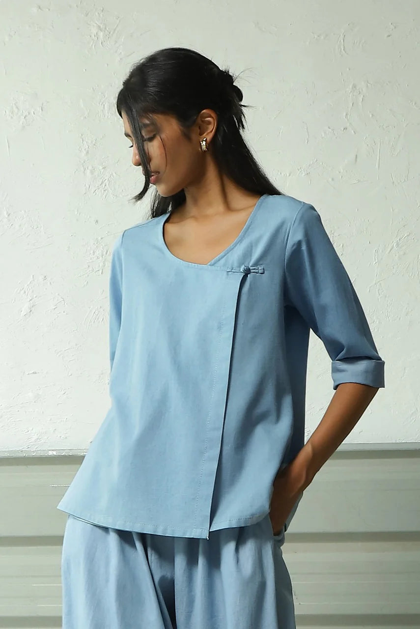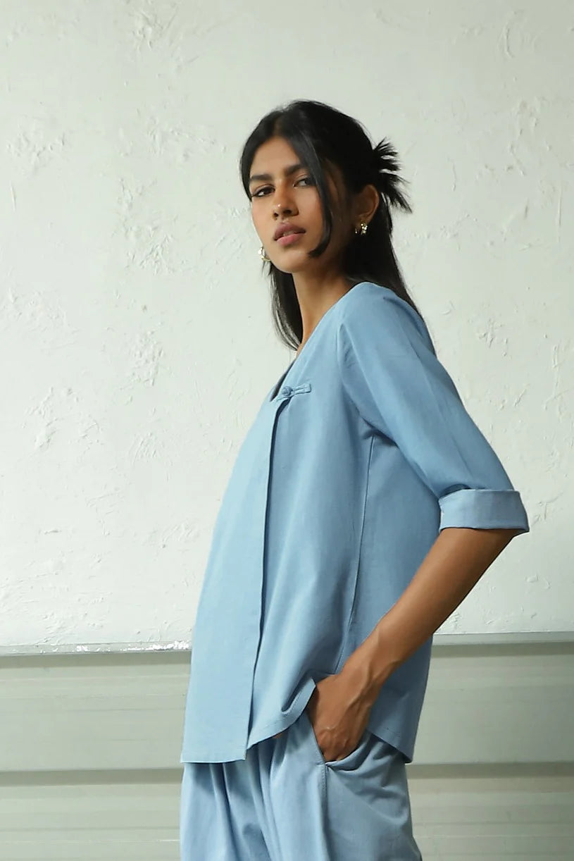 Classic and chic, the denim blouse is a piece you'll find yourself reaching for time and time again. It features an elegant scoop neckline with a collar at the back and an overlapping front panel accentuated with a charming Chinese knot detail. Wear yours as a set with our matching trousers."