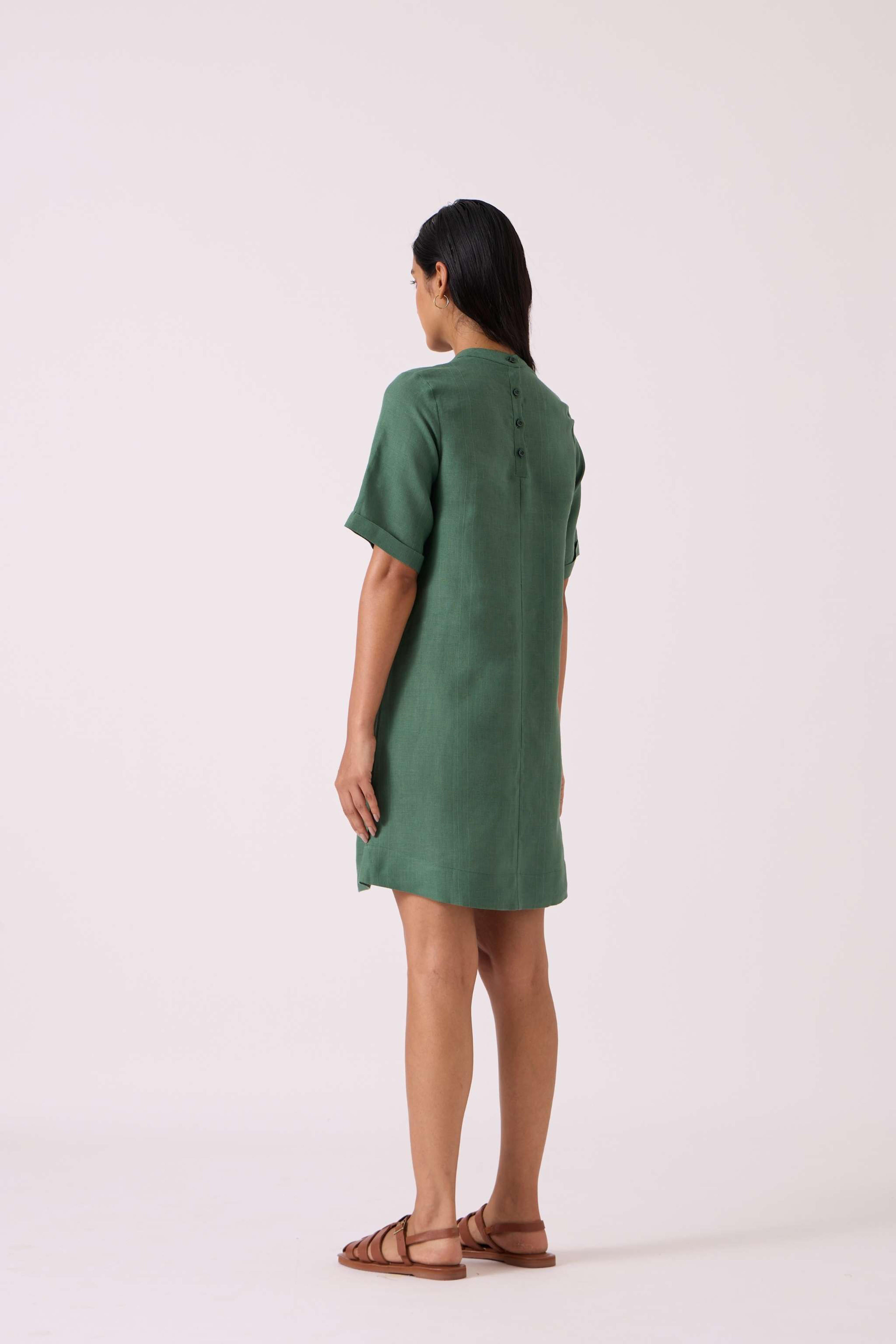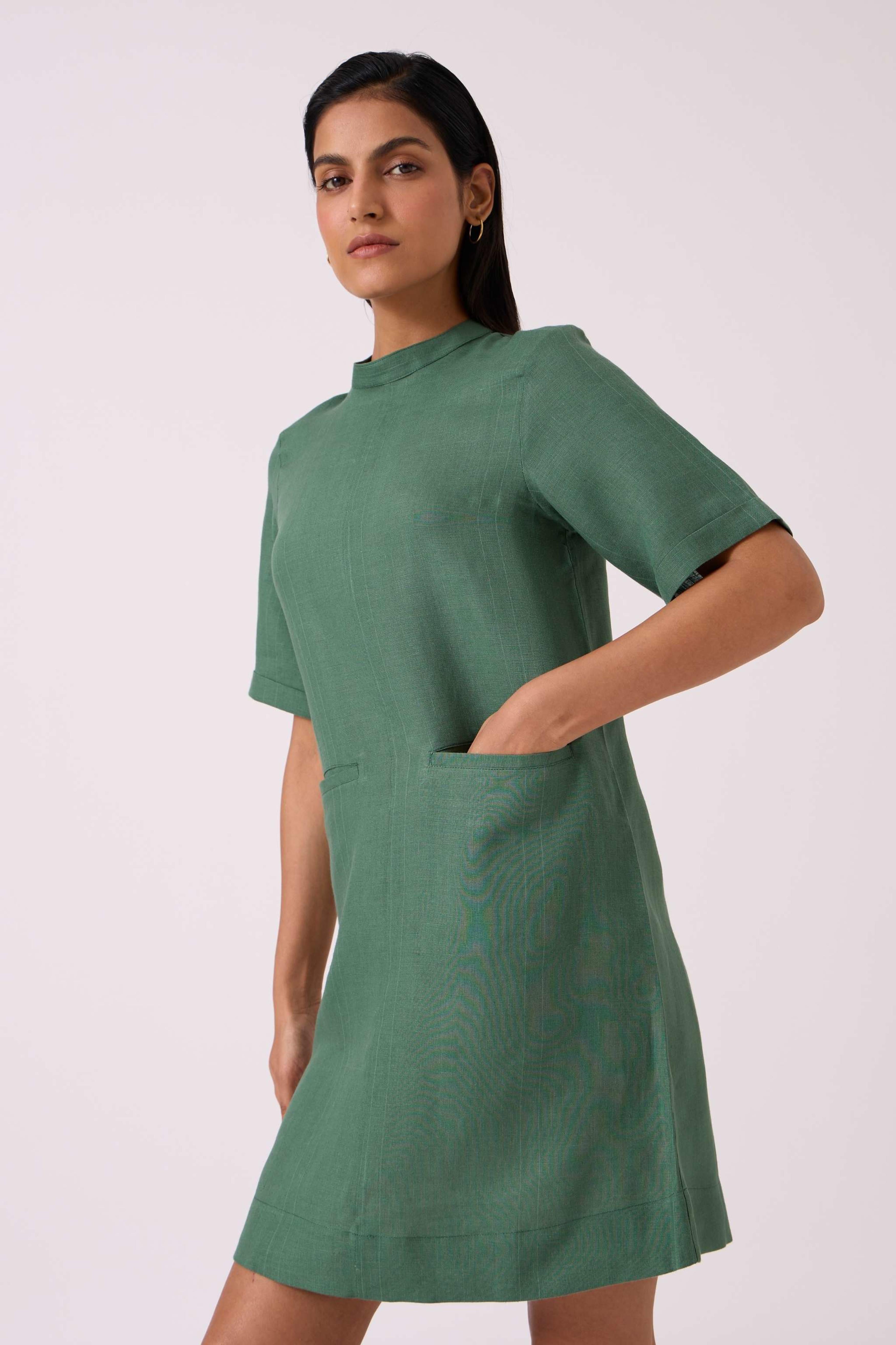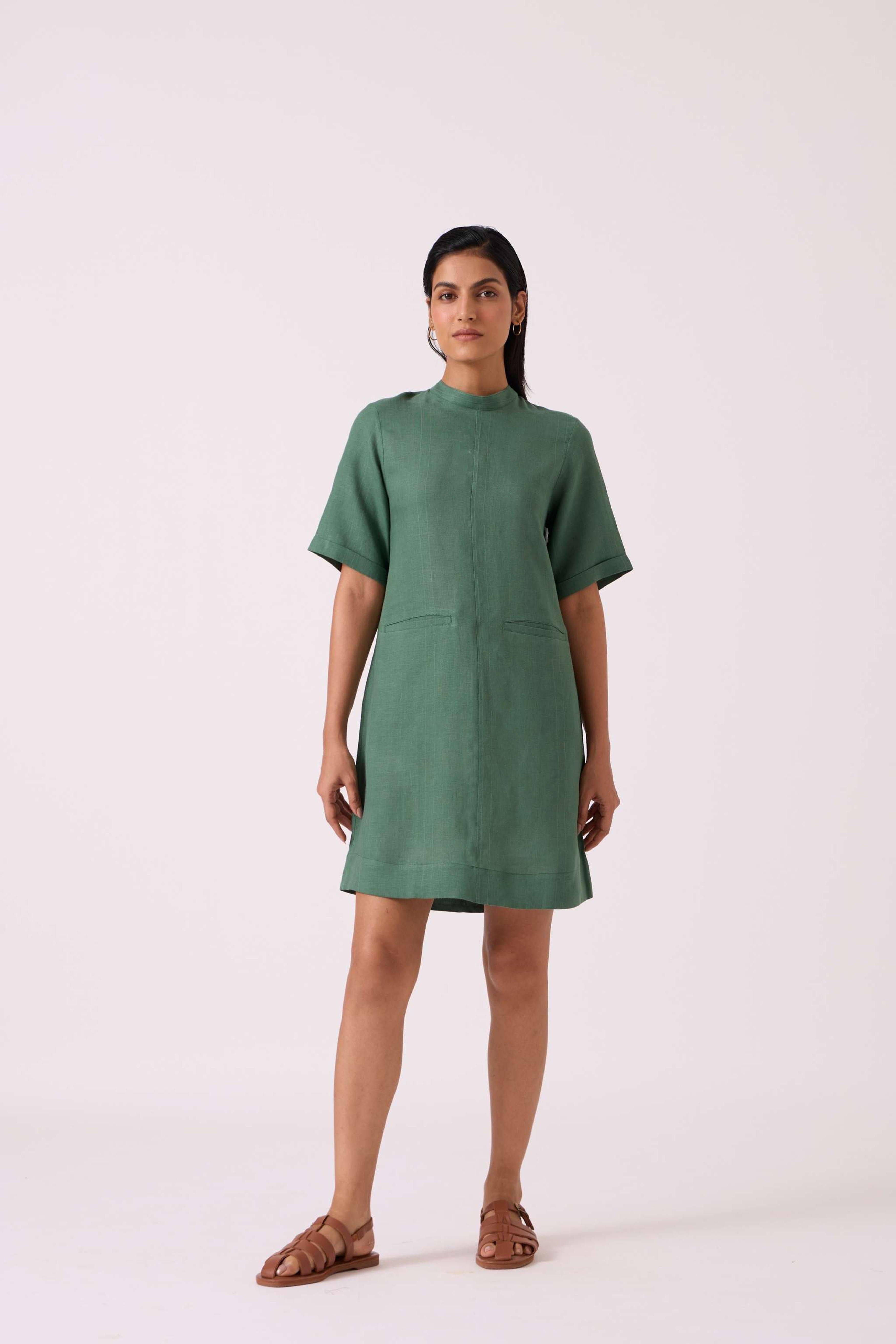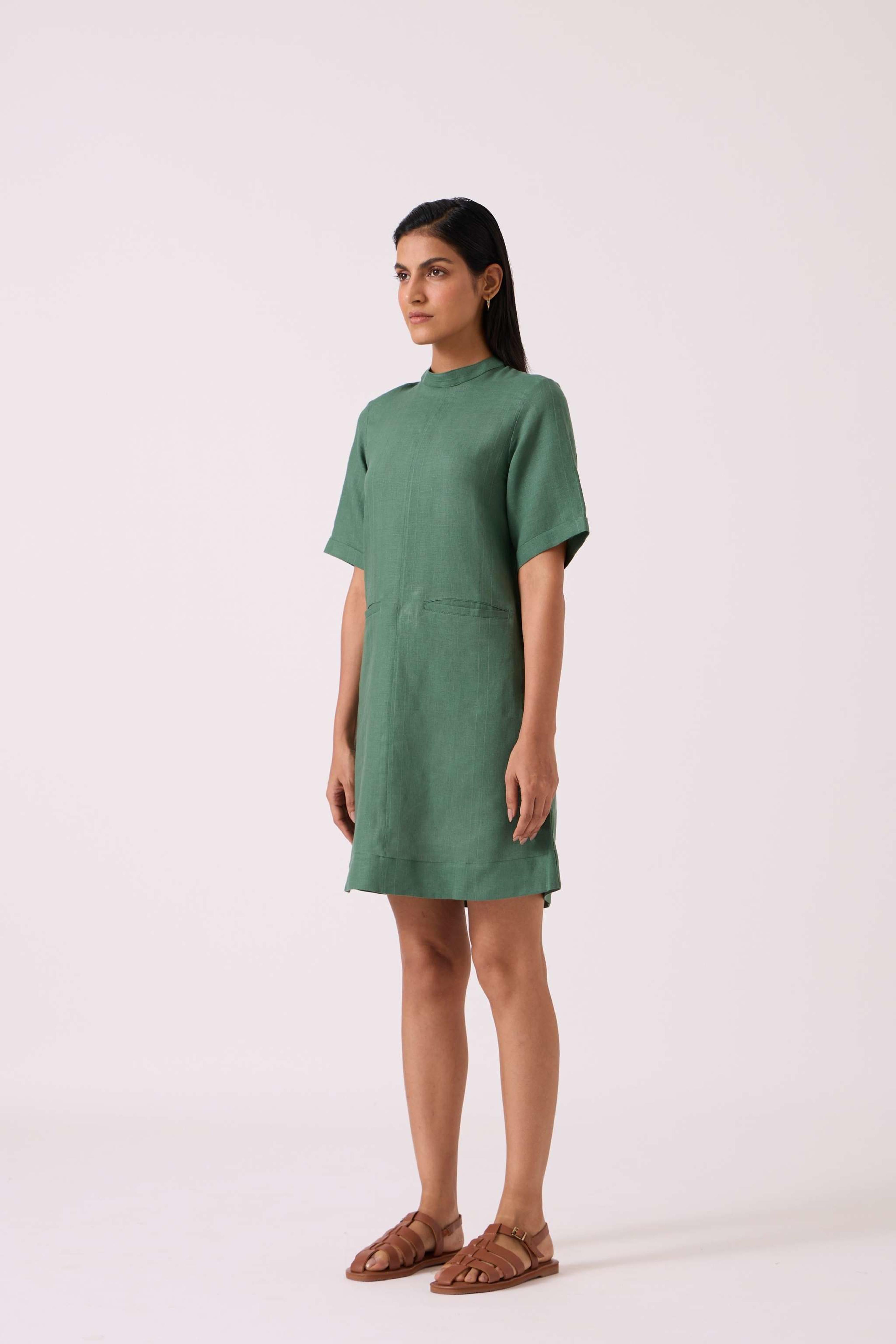 This *timeless shift dress* has a *relaxed fit* and features a *band collar*. It includes *elbow-length sleeves*, *front welt pockets*, and a *back button fastening*. The model, Chhavi, is 5'6" and is wearing a size XS.