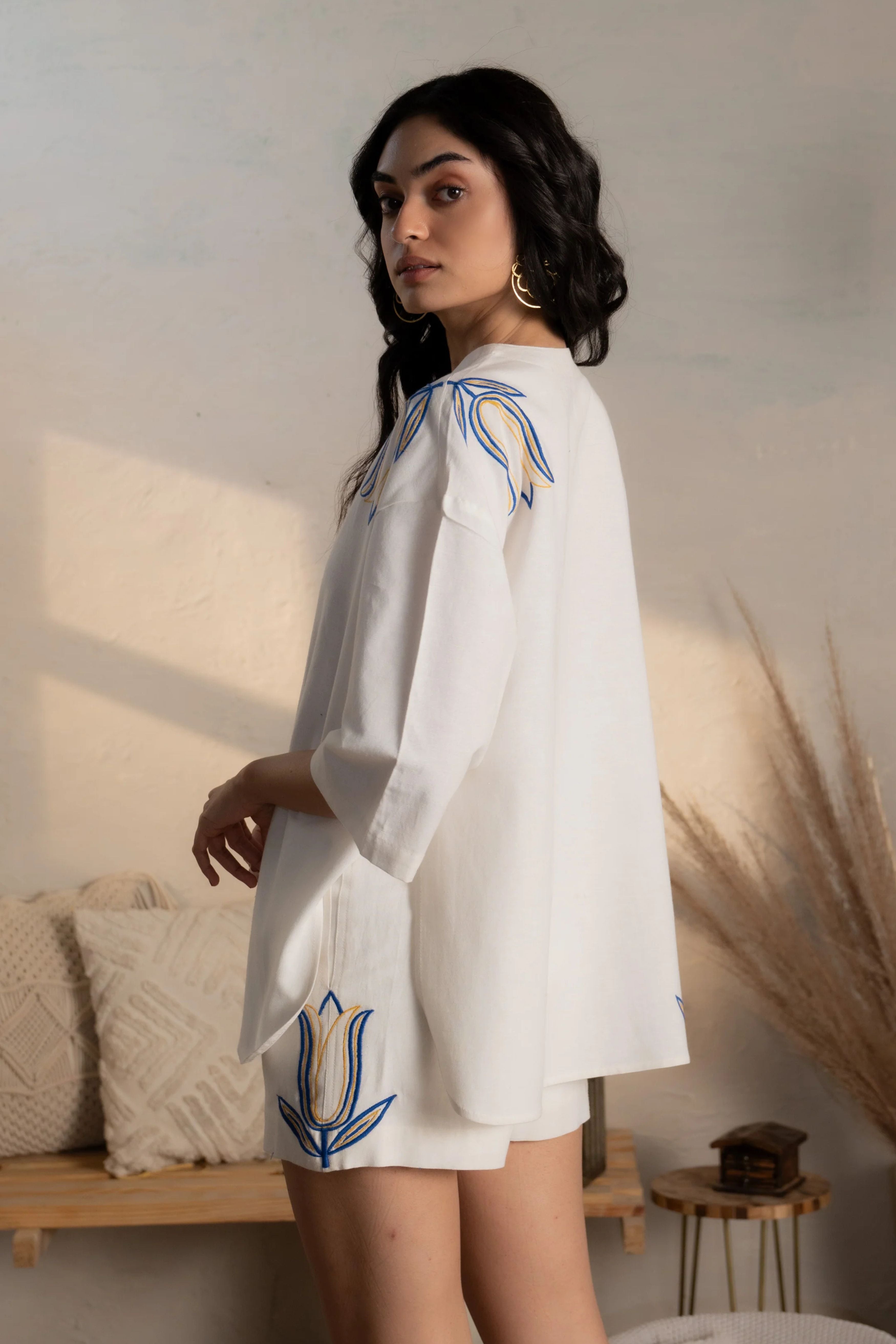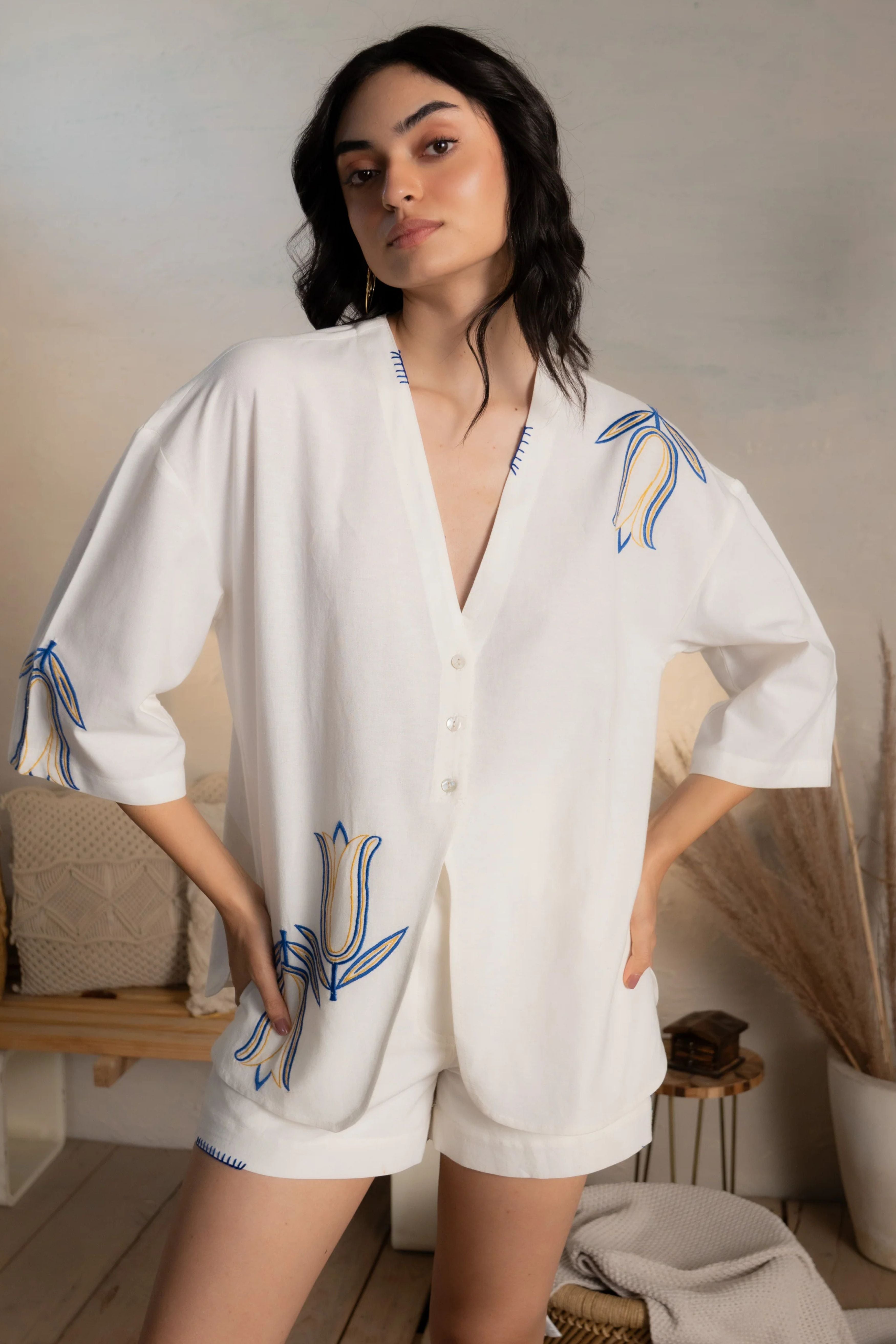 Add a touch of grace to your wardrobe with the Tulip Mist Embroidered Shirt. Showcasing hand-embroidered blue tulips reminiscent of fresh morning dew, this collarless V-neck shirt offers a relaxed fit and versatile styling options. Wear it tucked in for a polished look or keep it untucked for effortless chic.