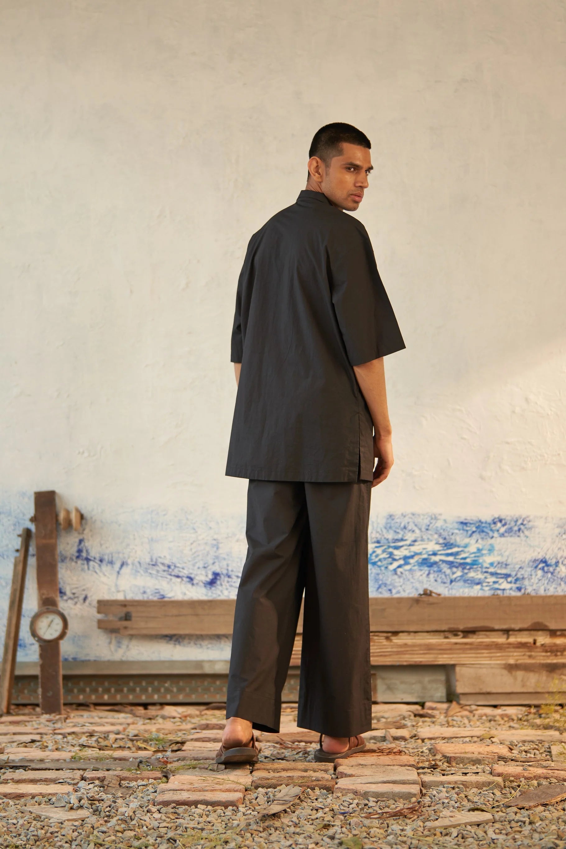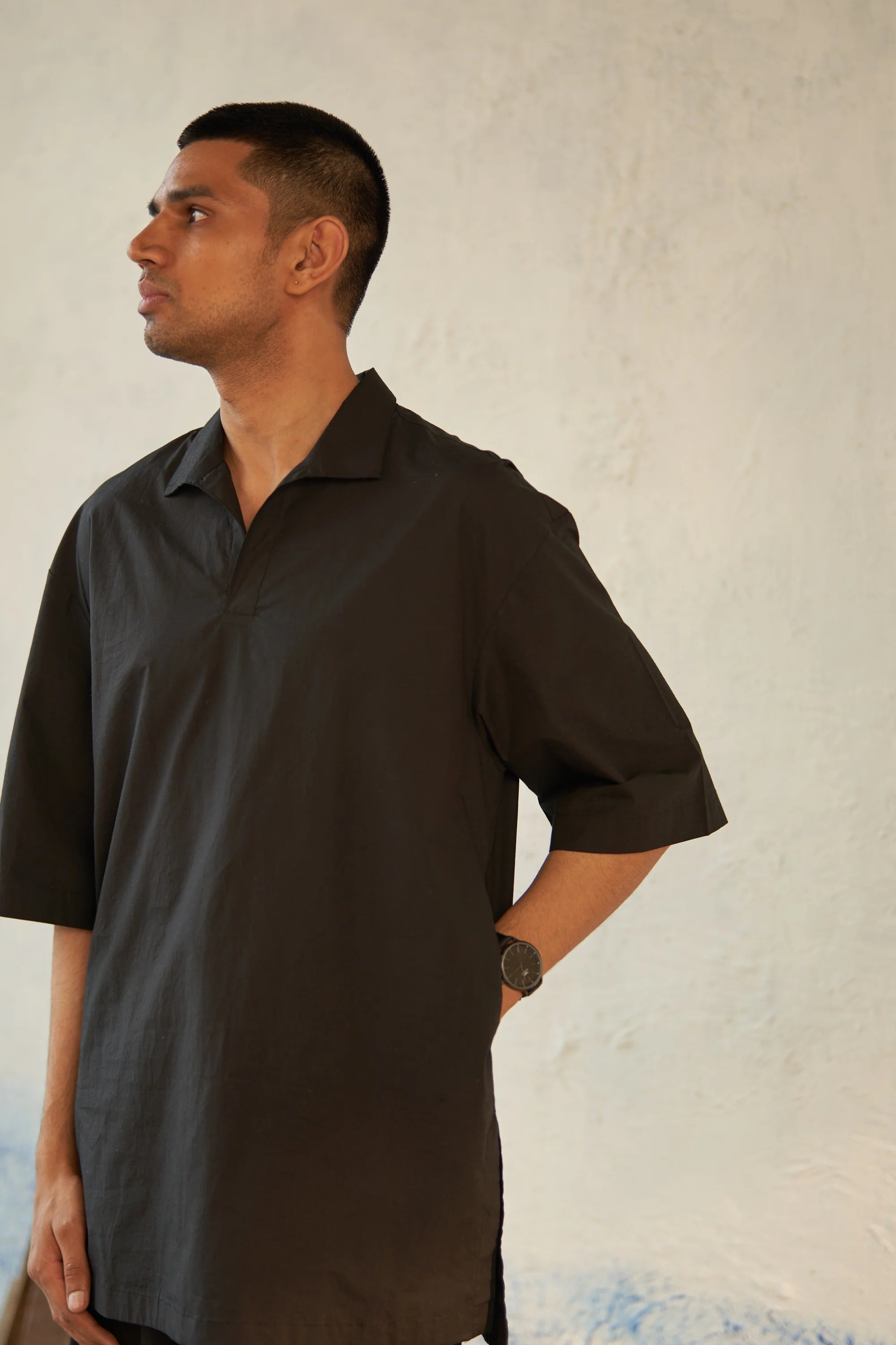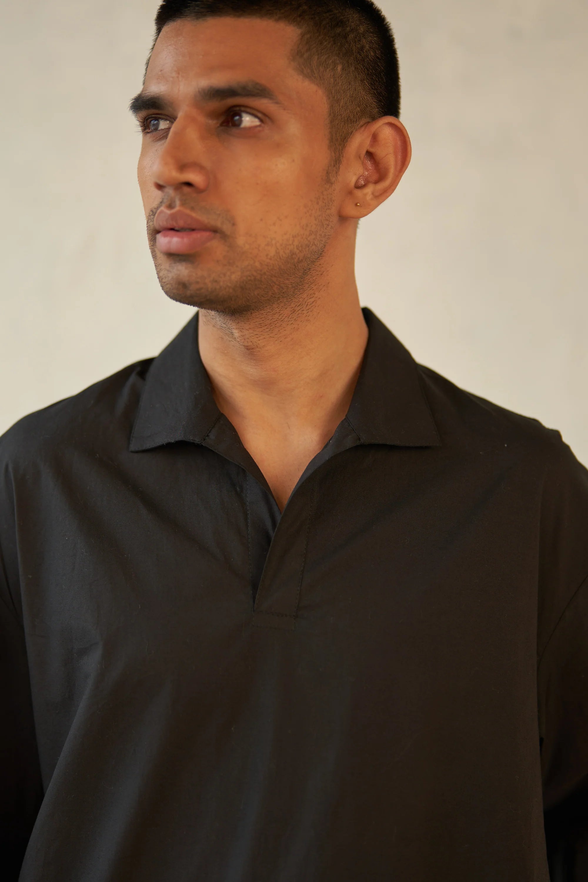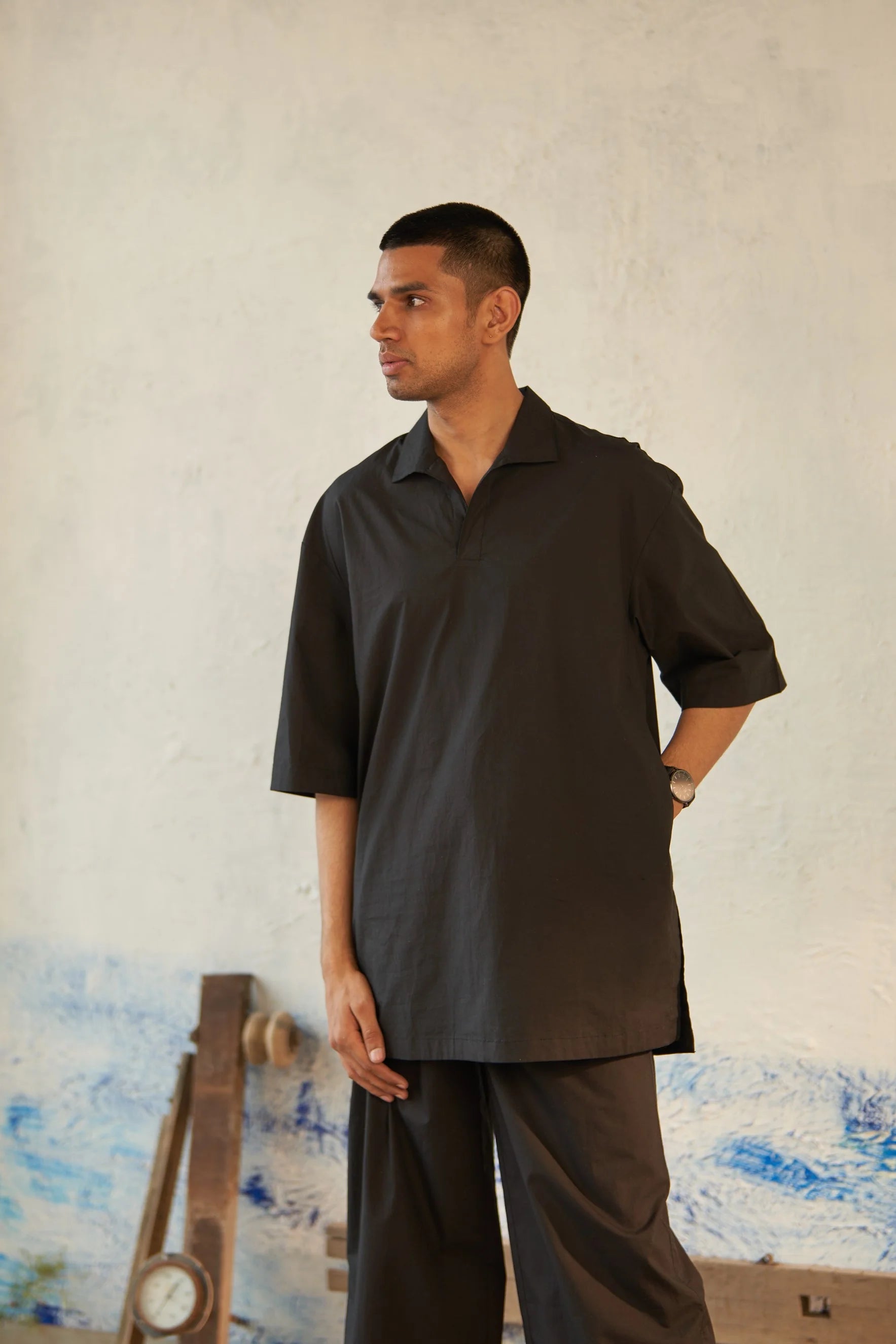 The aesthetics of a kurta with the comfort of a shirt, all in the bold and timeless color of black. This most sought-after wear, with no buttons in the collar and drop shoulders, and loose sleeves falling just below the elbow, offers a relaxed and effortless fit. Complete with side pockets and side slits, it's perfect for a formal gathering or a casual brunch day out.