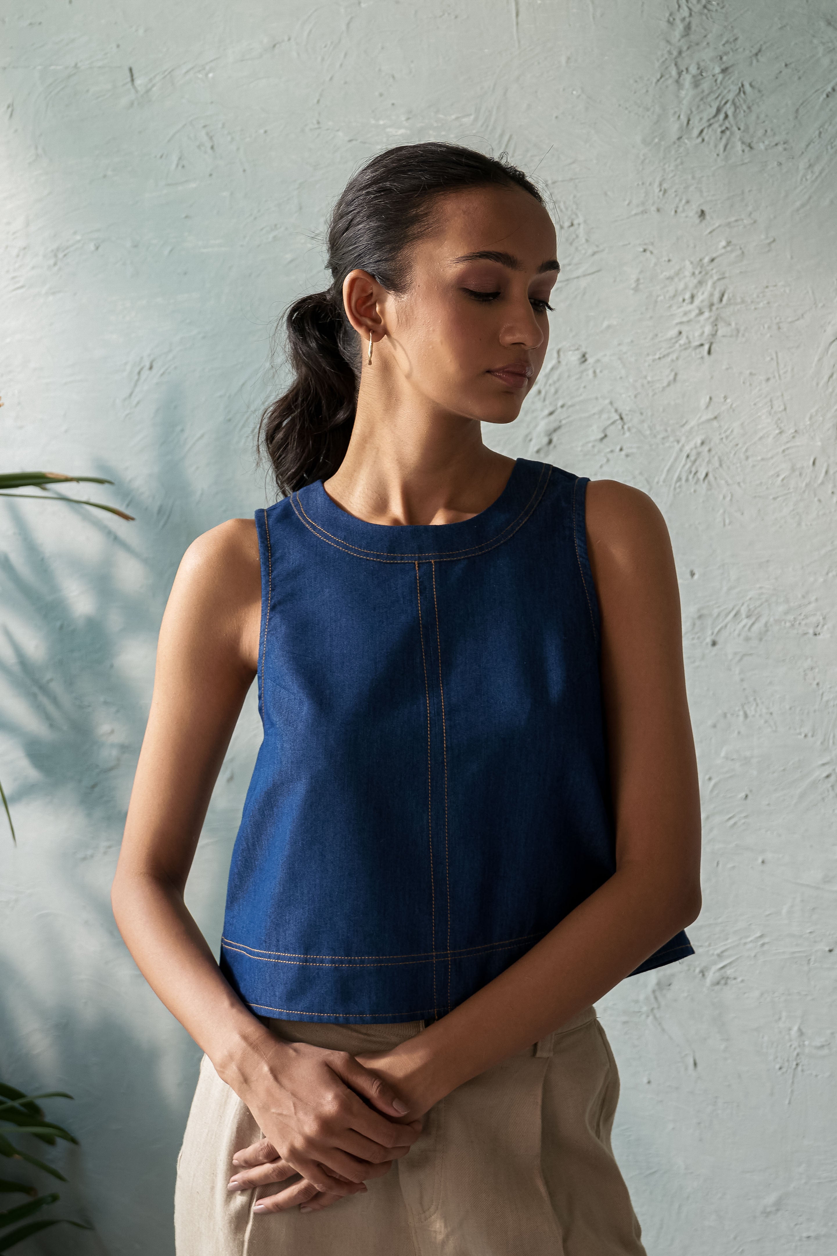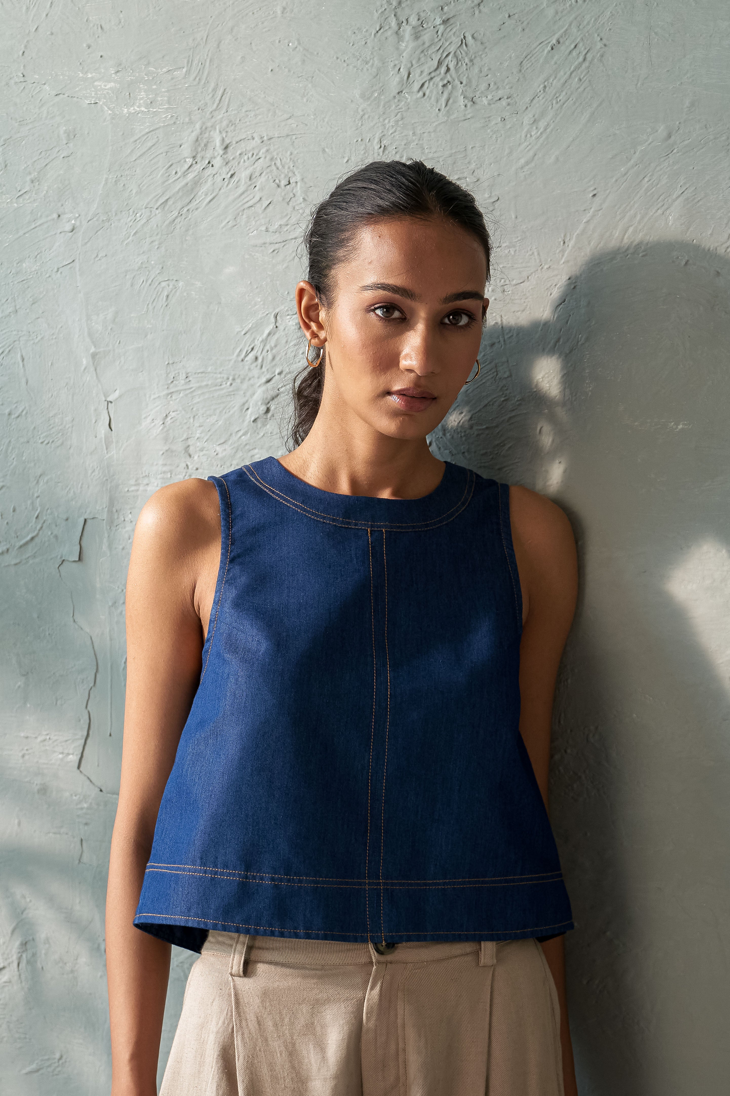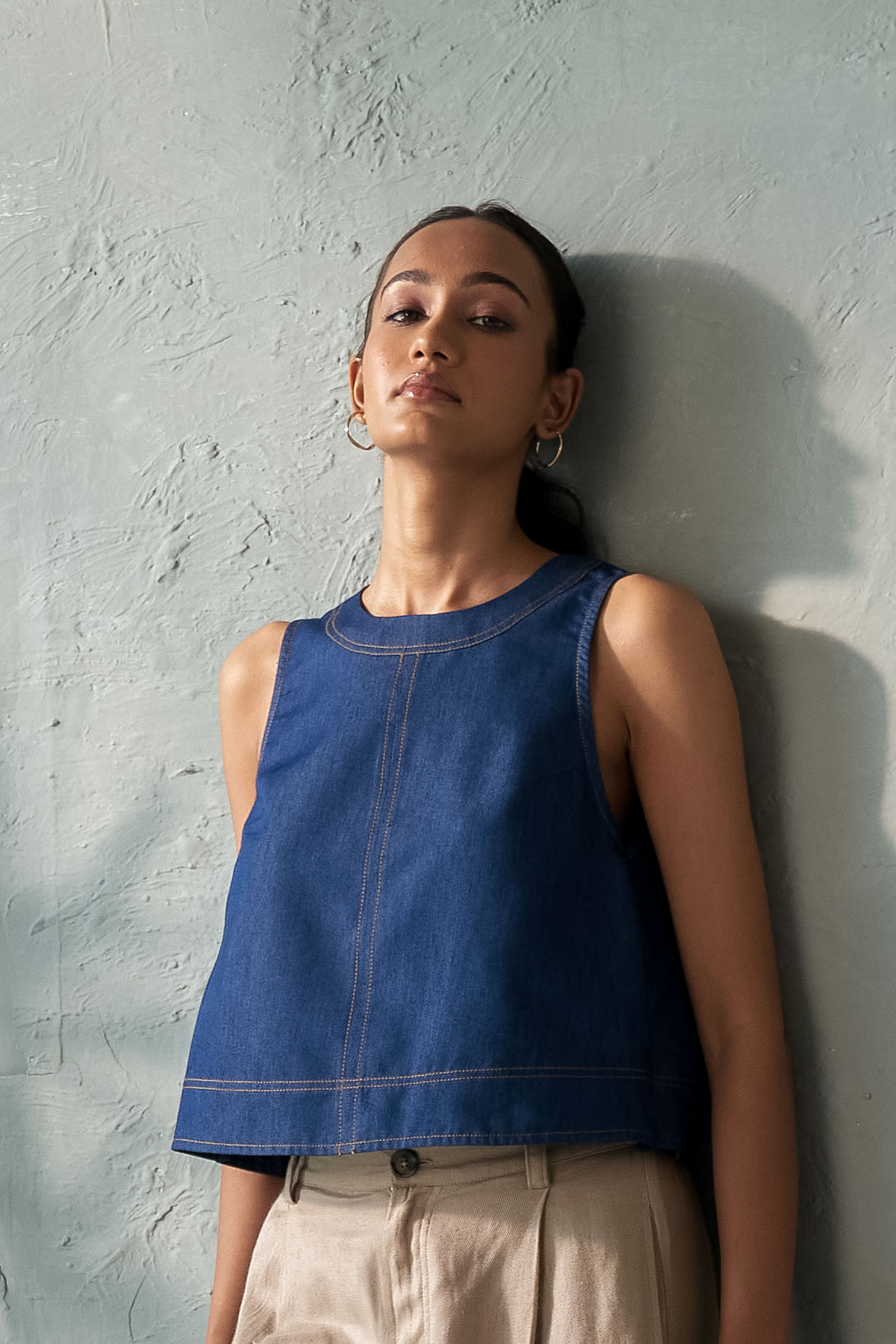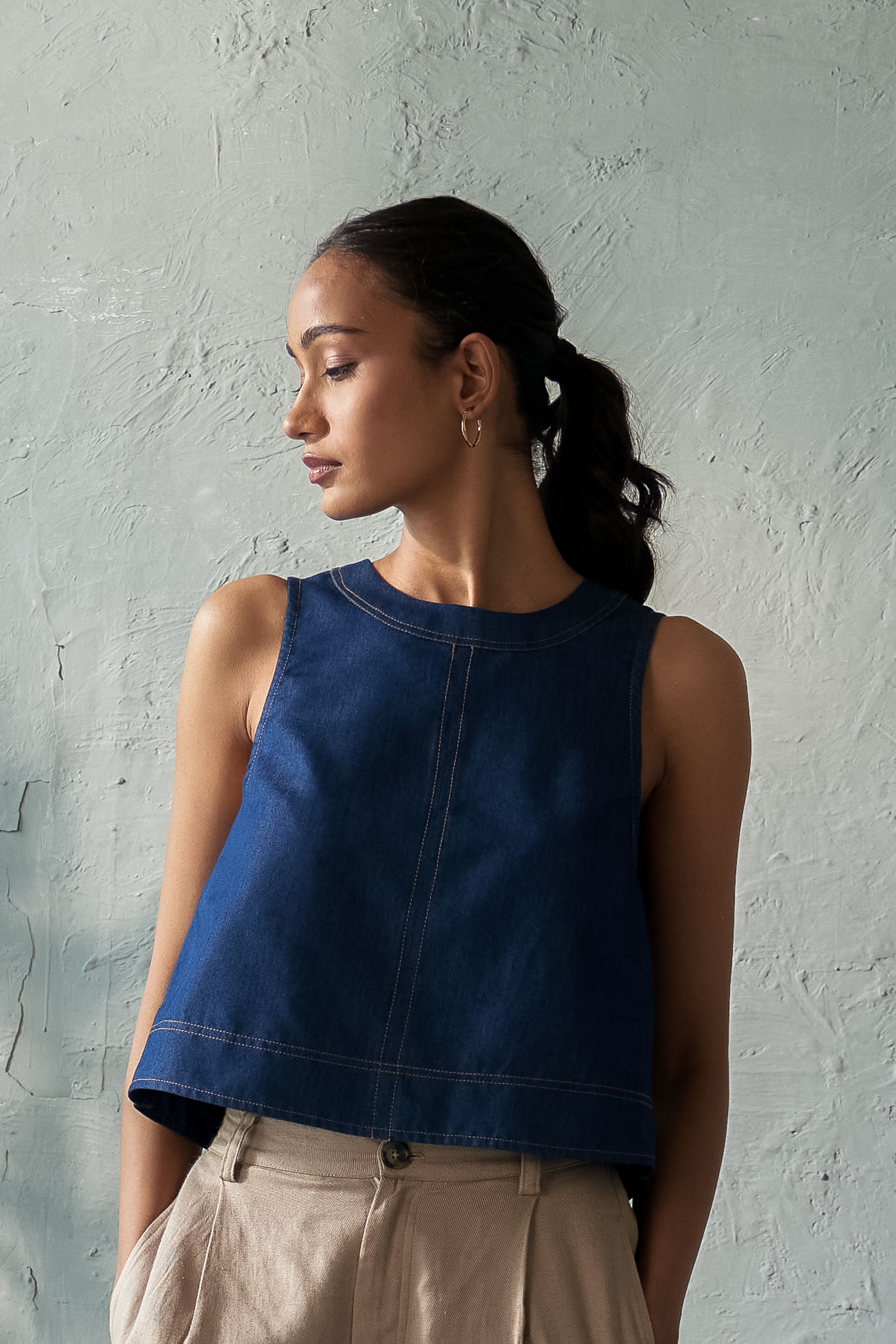 An A-line crop top with stitch detailing around the neckline, hem, and front adds a subtle yet stylish touch to a classic silhouette. The A-line shape flares slightly from the top, offering a flattering fit that enhances comfort and movement. The intricate stitching provides a unique, handcrafted vibe, making this piece stand out. This crop top can be paired with high-waisted jeans, skirts, or trousers, creating a balanced look. It's perfect for casual outings or can be dressed up with accessories for a more polished appearance.