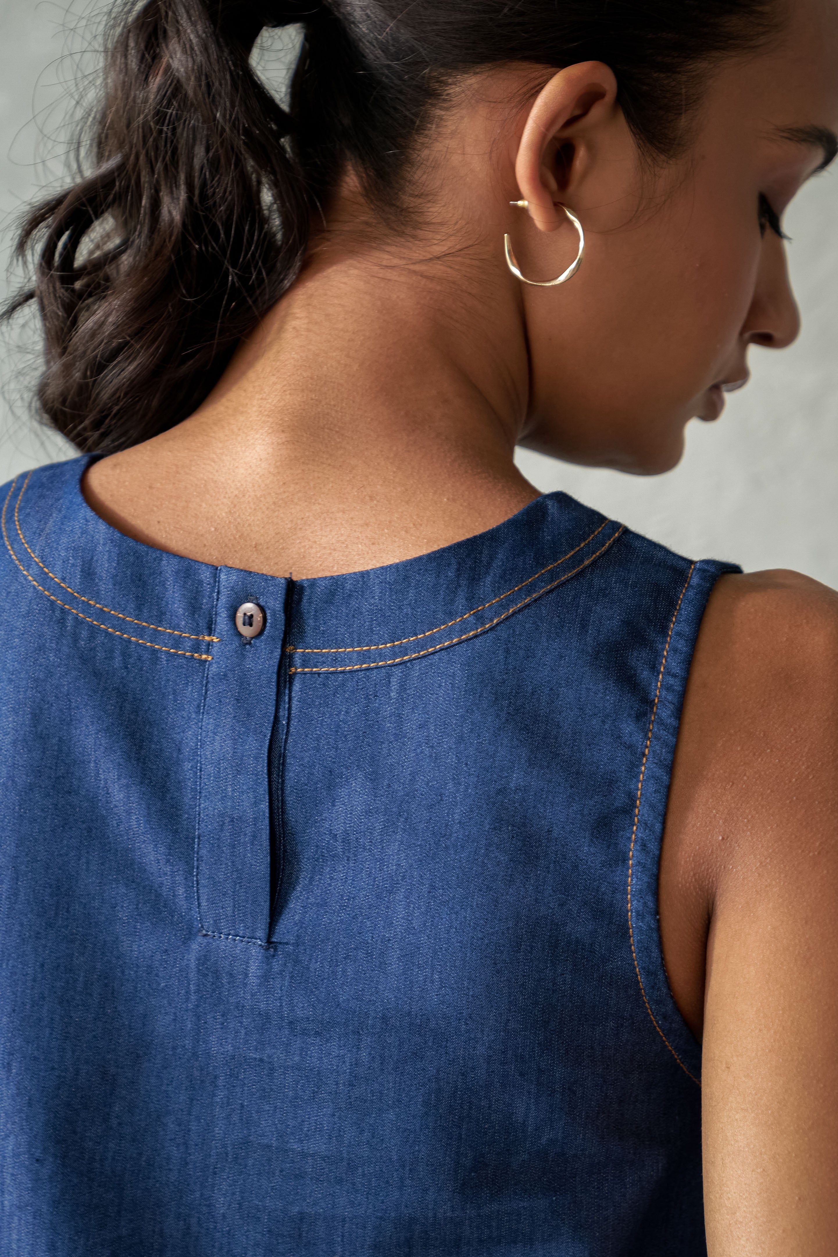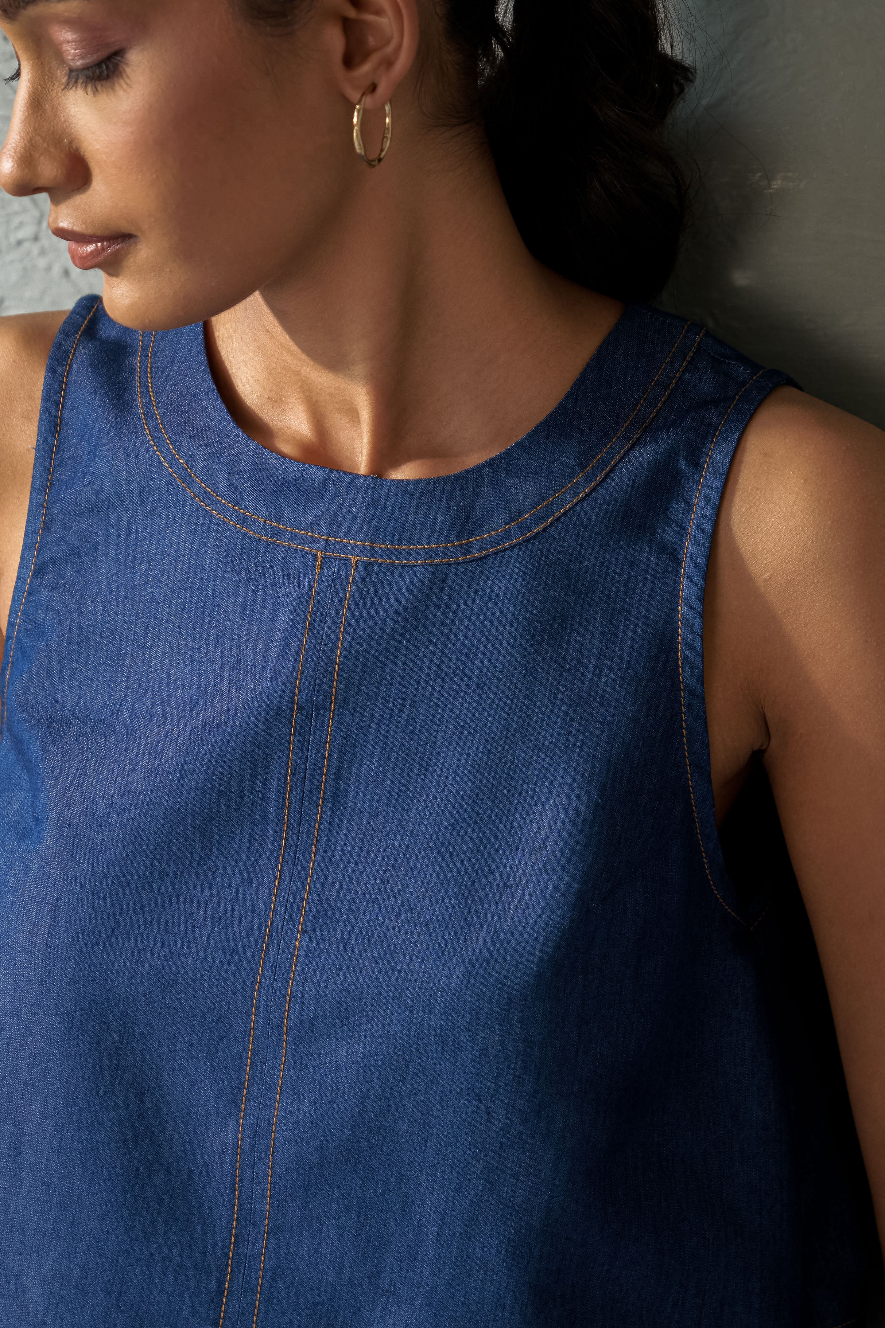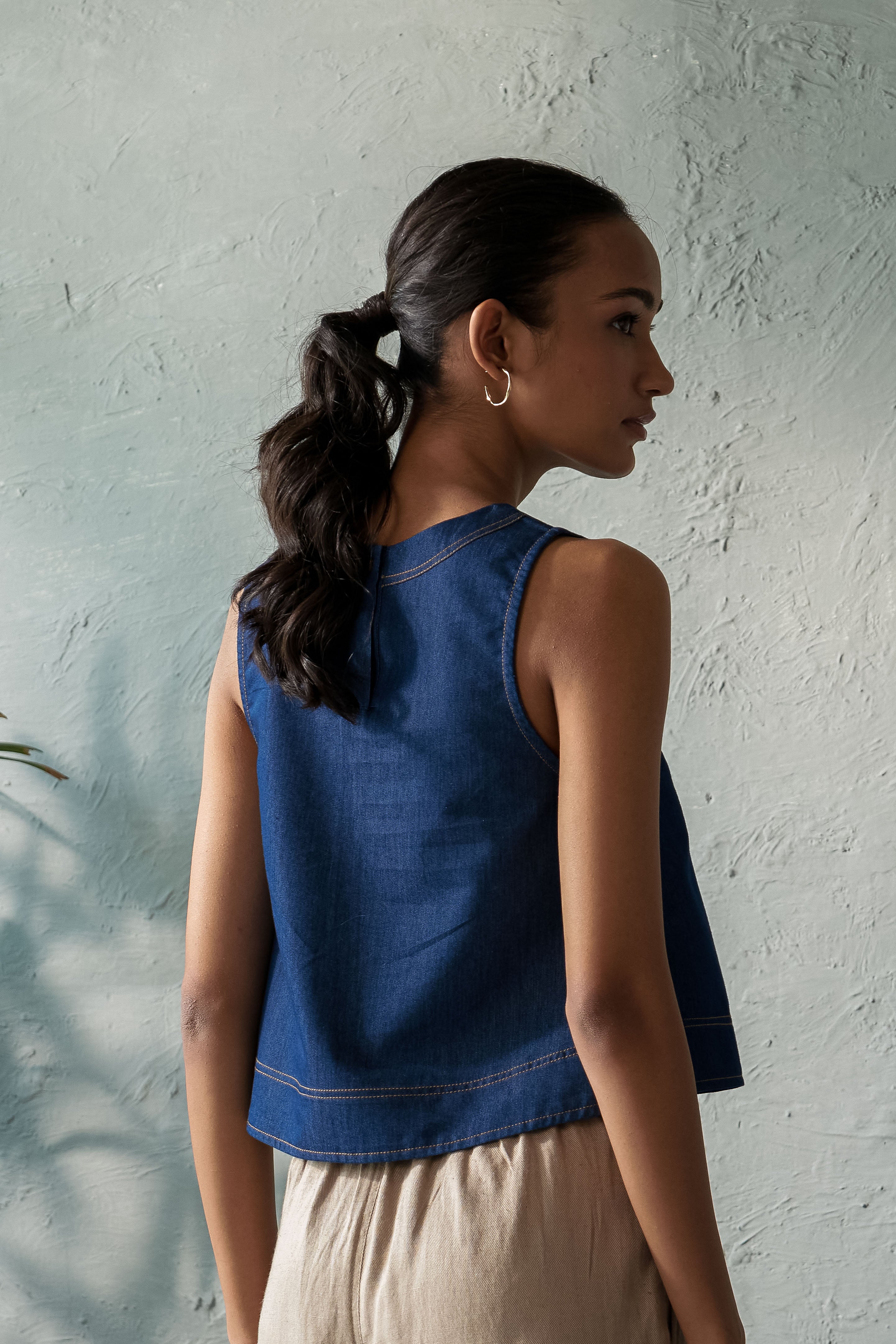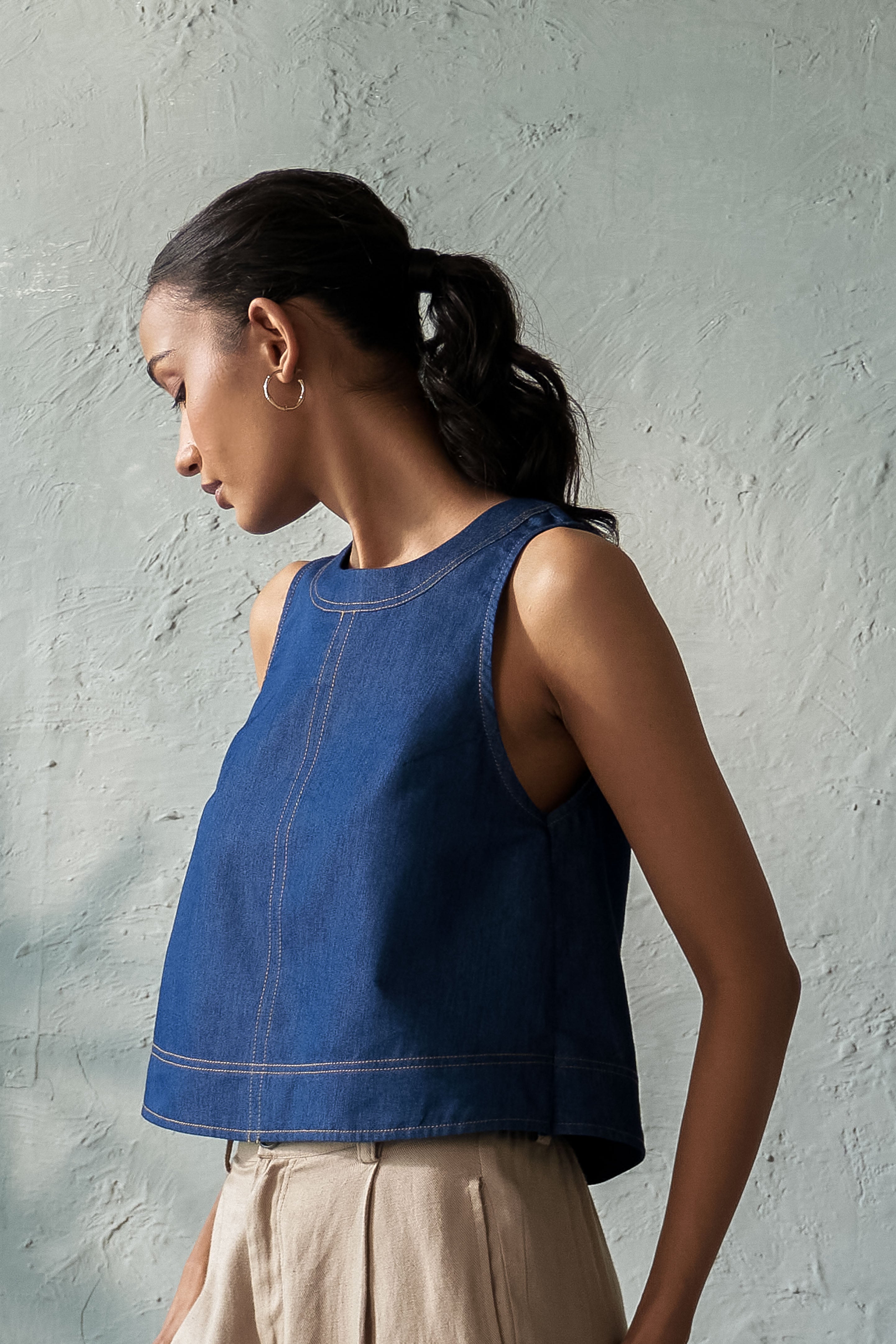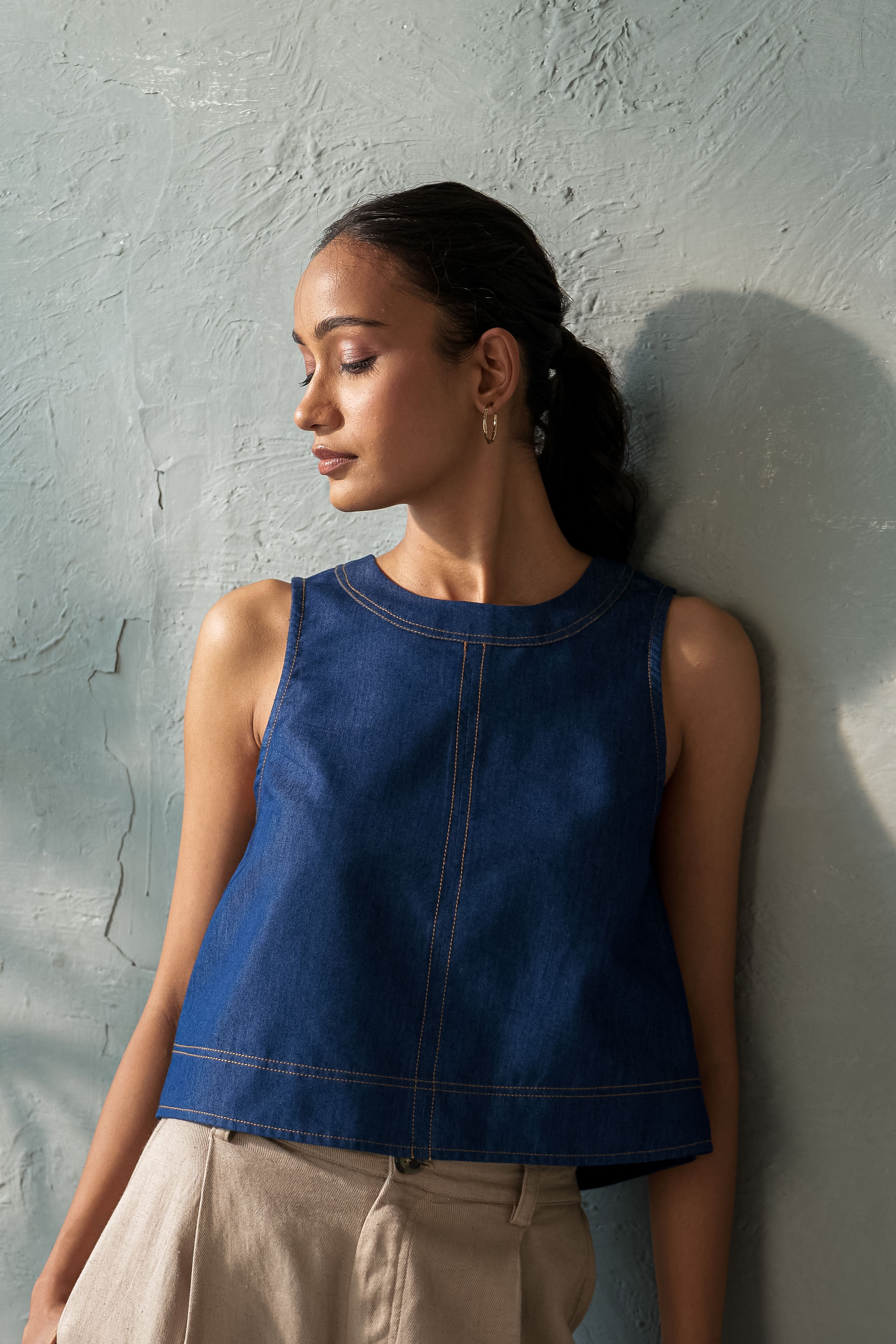 An A-line crop top with stitch detailing around the neckline, hem, and front adds a subtle yet stylish touch to a classic silhouette. The A-line shape flares slightly from the top, offering a flattering fit that enhances comfort and movement. The intricate stitching provides a unique, handcrafted vibe, making this piece stand out. This crop top can be paired with high-waisted jeans, skirts, or trousers, creating a balanced look. It's perfect for casual outings or can be dressed up with accessories for a more polished appearance.