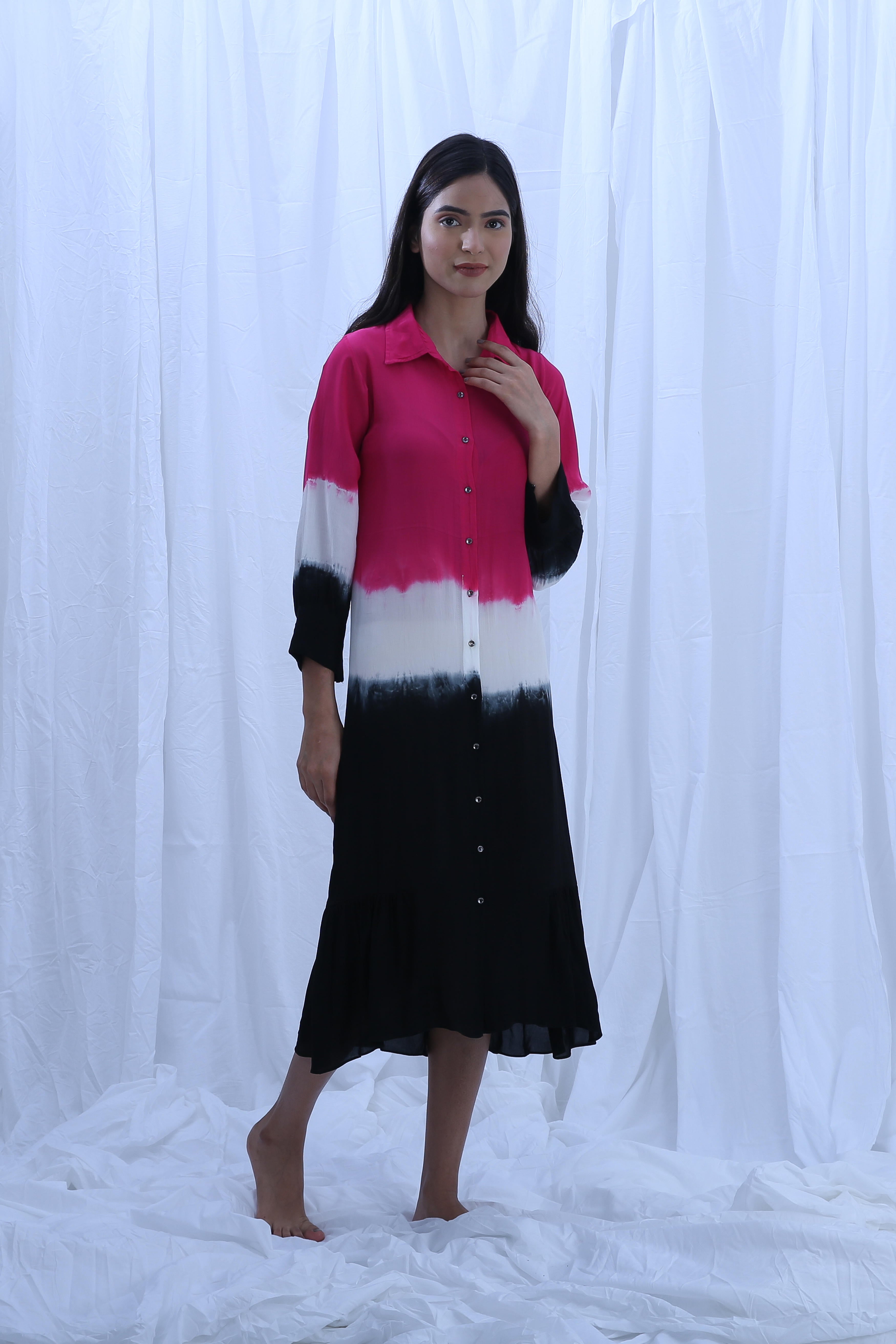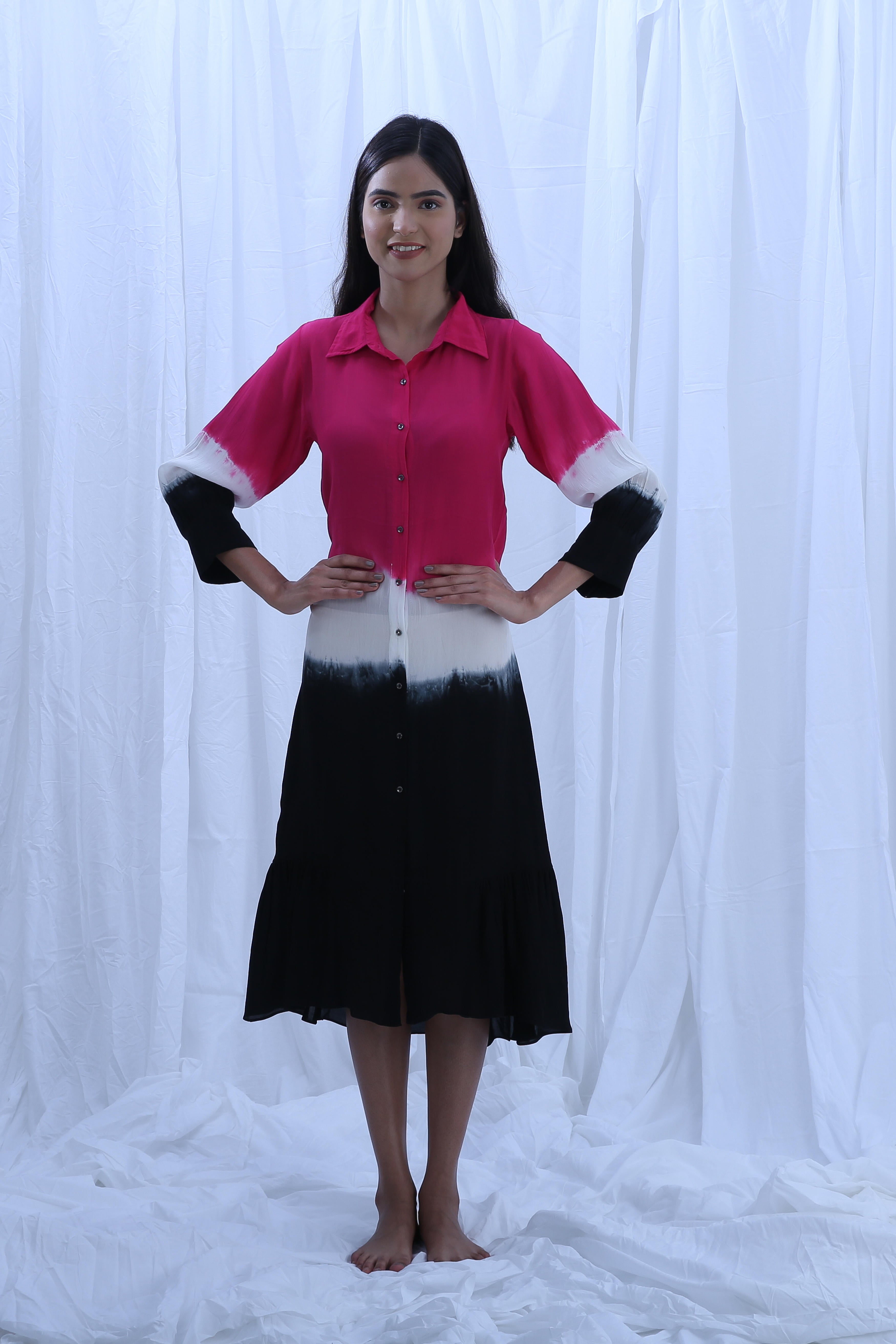 This elegant crepe silk dress features a full length of 44 inches, a 7-inch deep neck, and 16-inch long sleeves, creating a graceful silhouette, for all-day comfort and ease. Our model, standing 5'8", is wearing a size S.