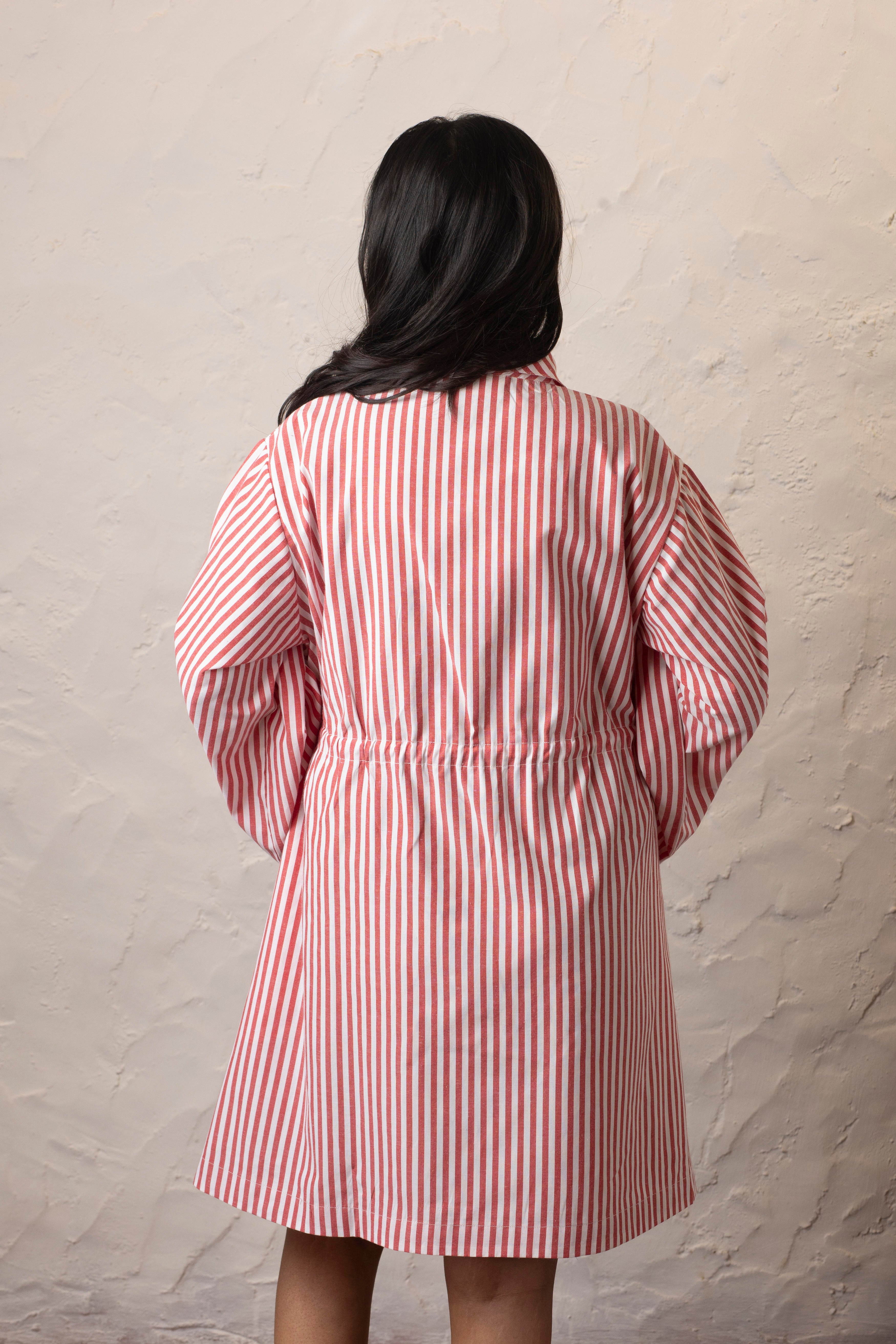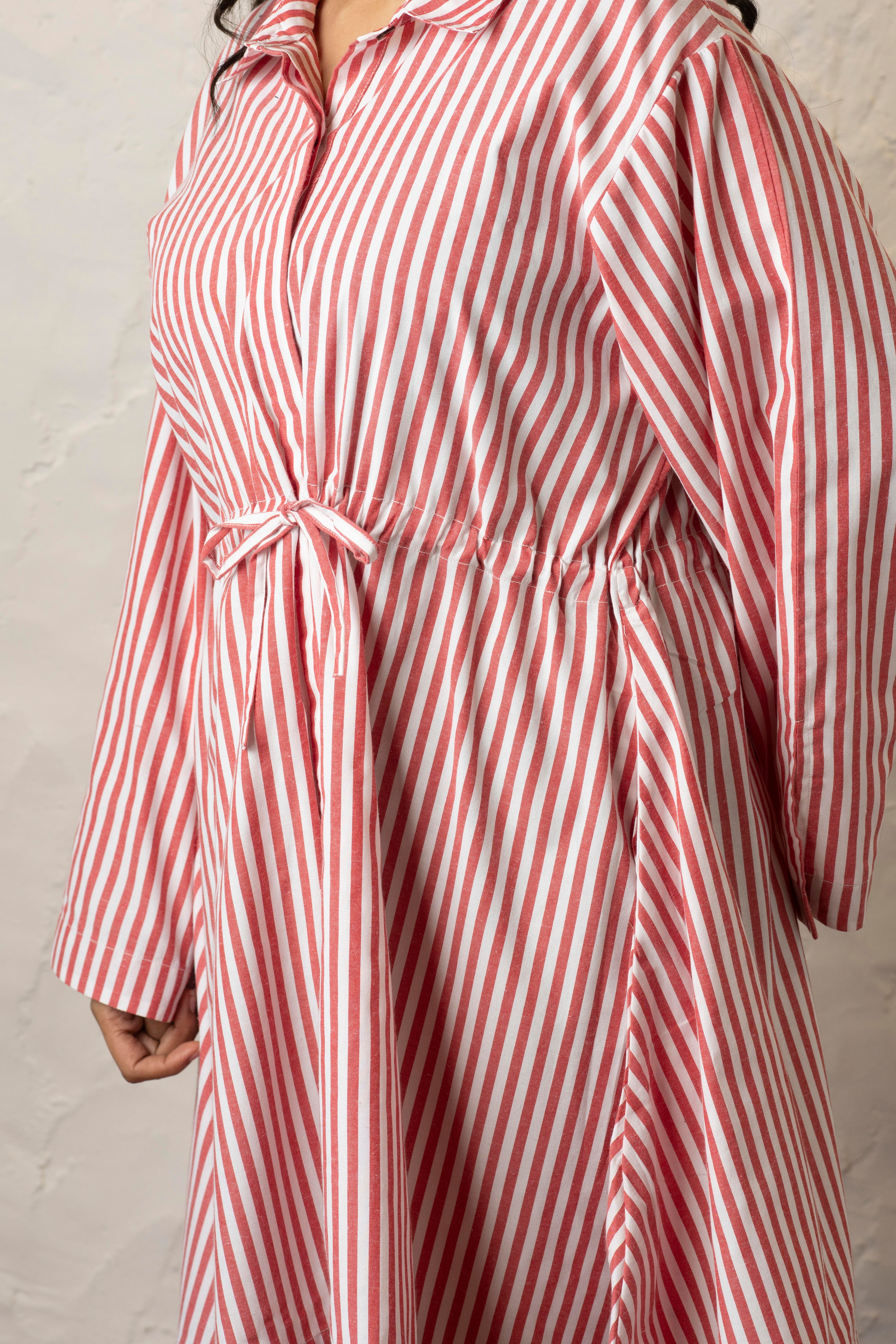 A blend of comfort, style, and sustainability, this red and white drawstring dress is crafted from certified organic cotton, offering a breathable and soft feel against your skin. Designed for effortless wear, its relaxed knee-length silhouette is complemented by wide full sleeves with delicate slits, adding movement and charm to your look. The adjustable drawstring waist allows you to tailor the fit to your liking, making it as flattering as it is comfortable. Plus, it comes with functional pockets—because style should never compromise convenience.