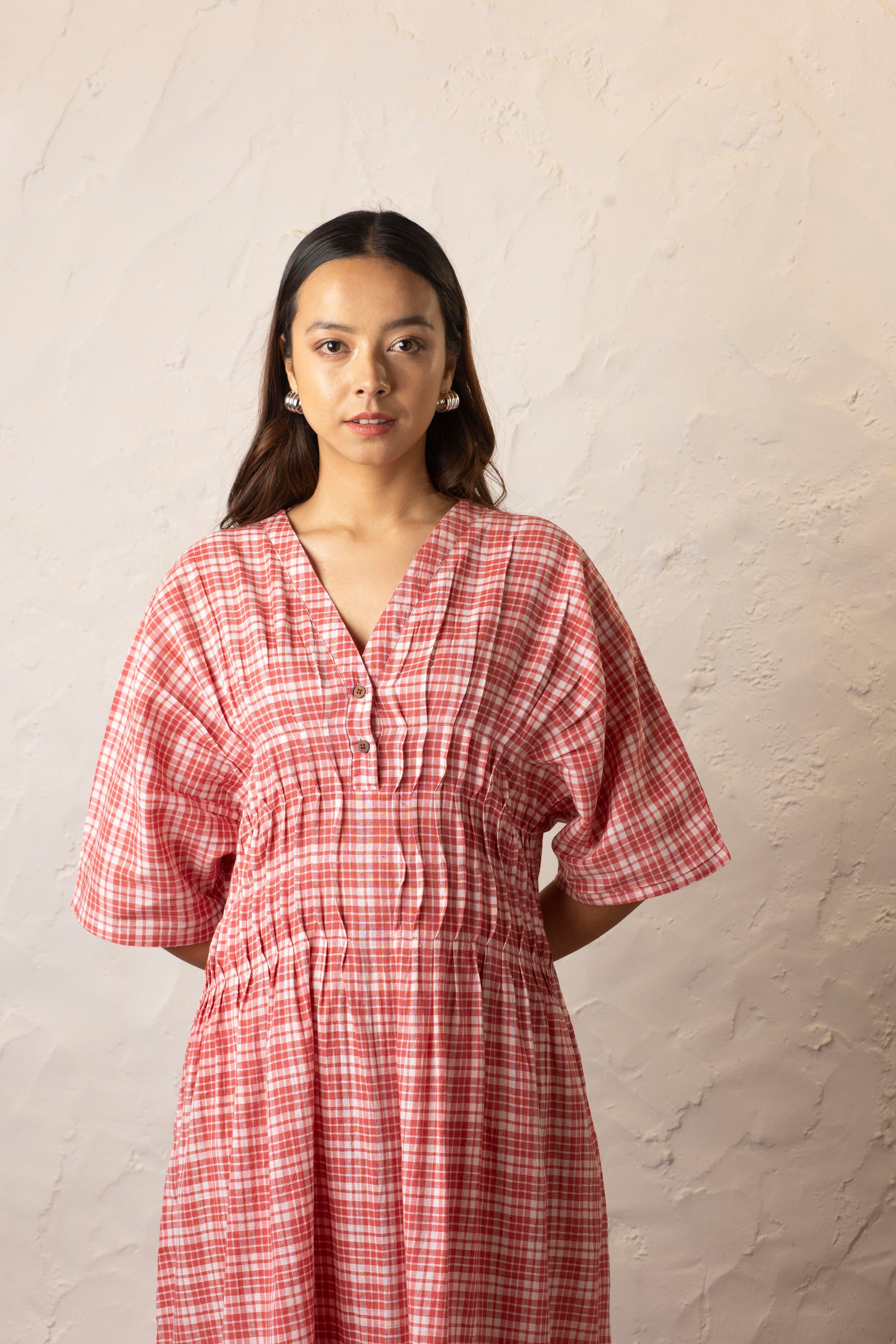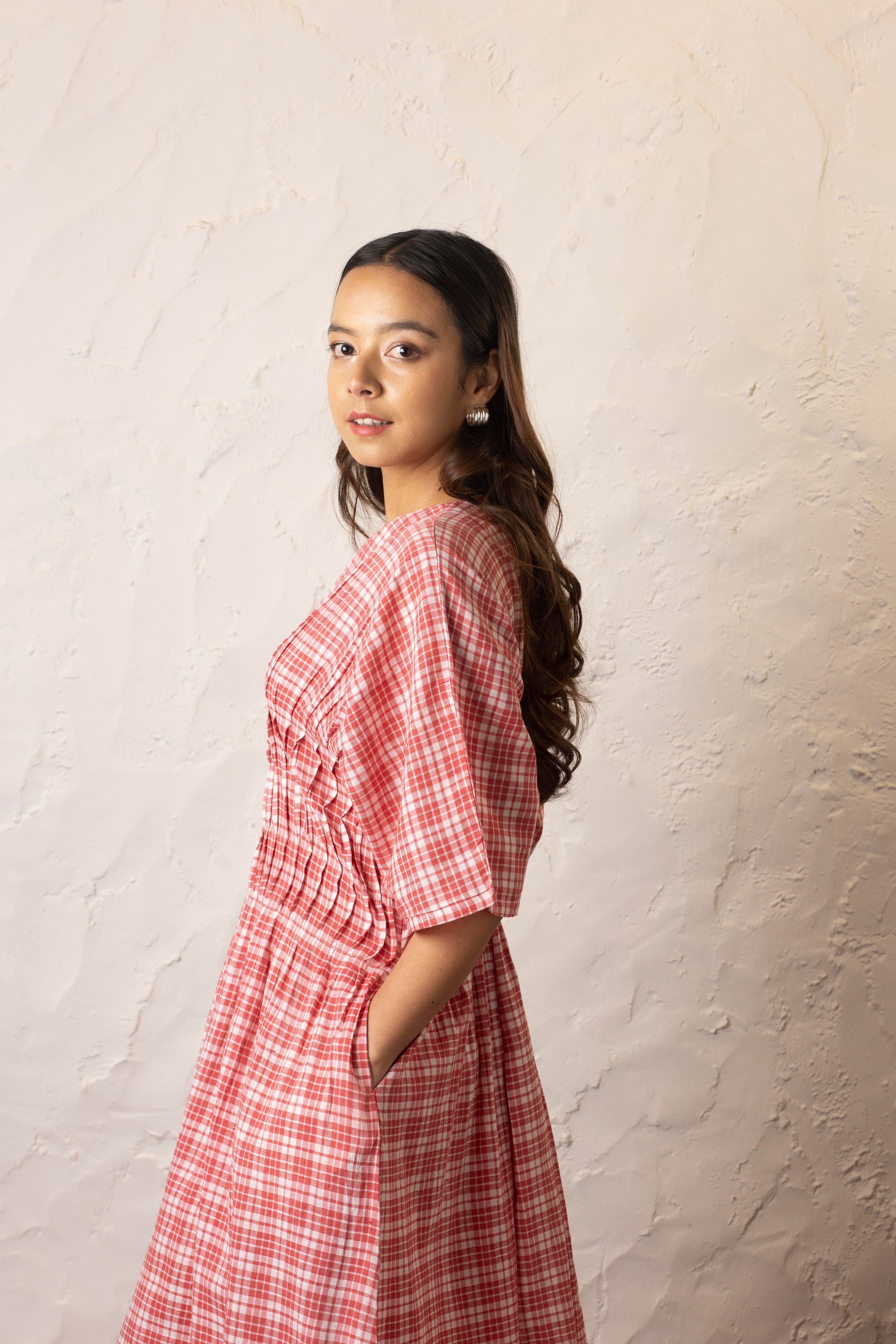 Crafted from light-as-air handwoven cotton, this red and white checkered midi dress is a celebration of comfort and effortless elegance. The drop shoulder design drapes beautifully, while vertical stitches around the bodice subtly define the waist for a flattering silhouette. A V-neck with delicate buttons, functional pockets, and an easy flow make it your go-to for everyday ease. Whether you're strolling through sunlit streets or unwinding in a quiet café, this dress moves with you—unhurried, effortless, and endlessly wearable.