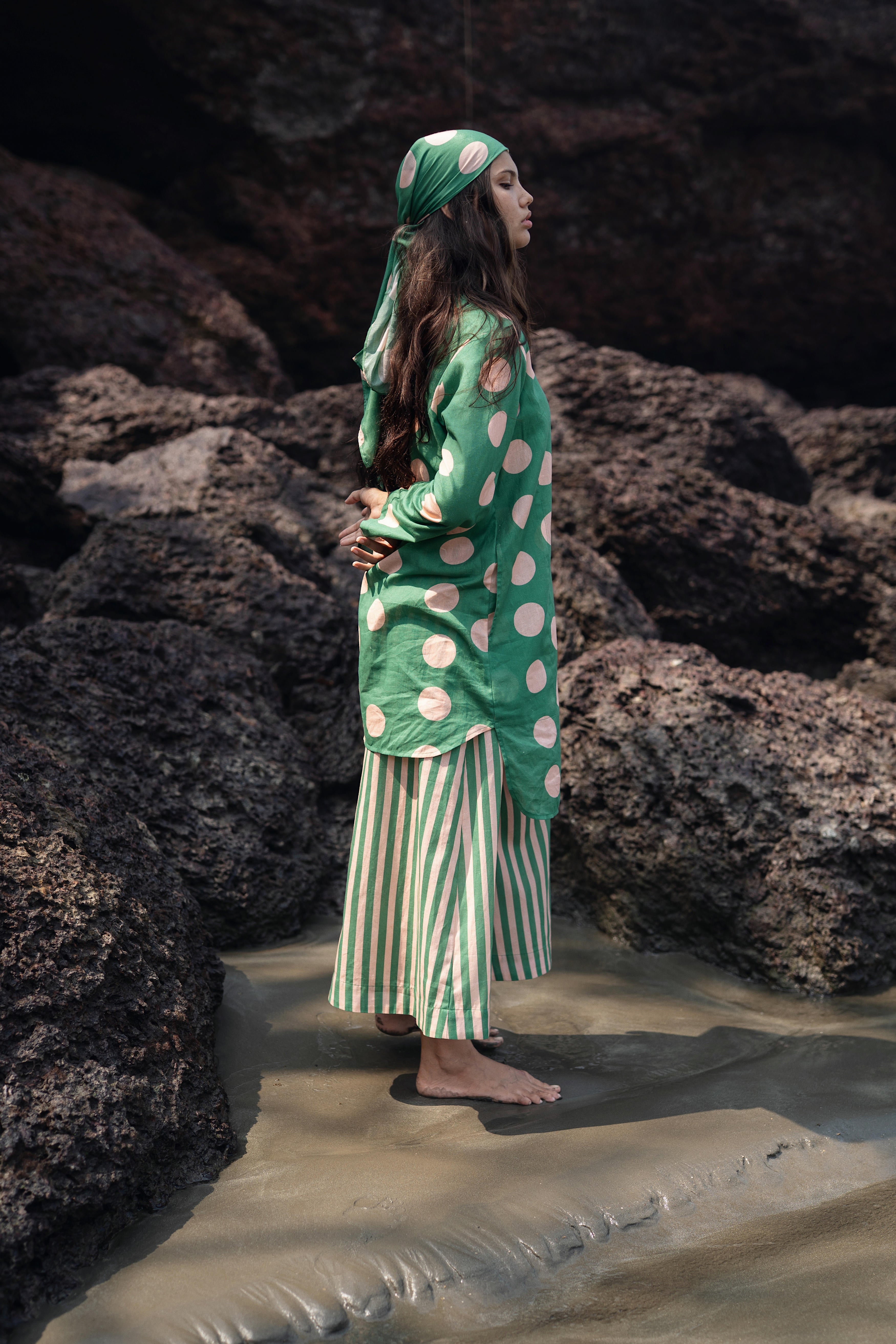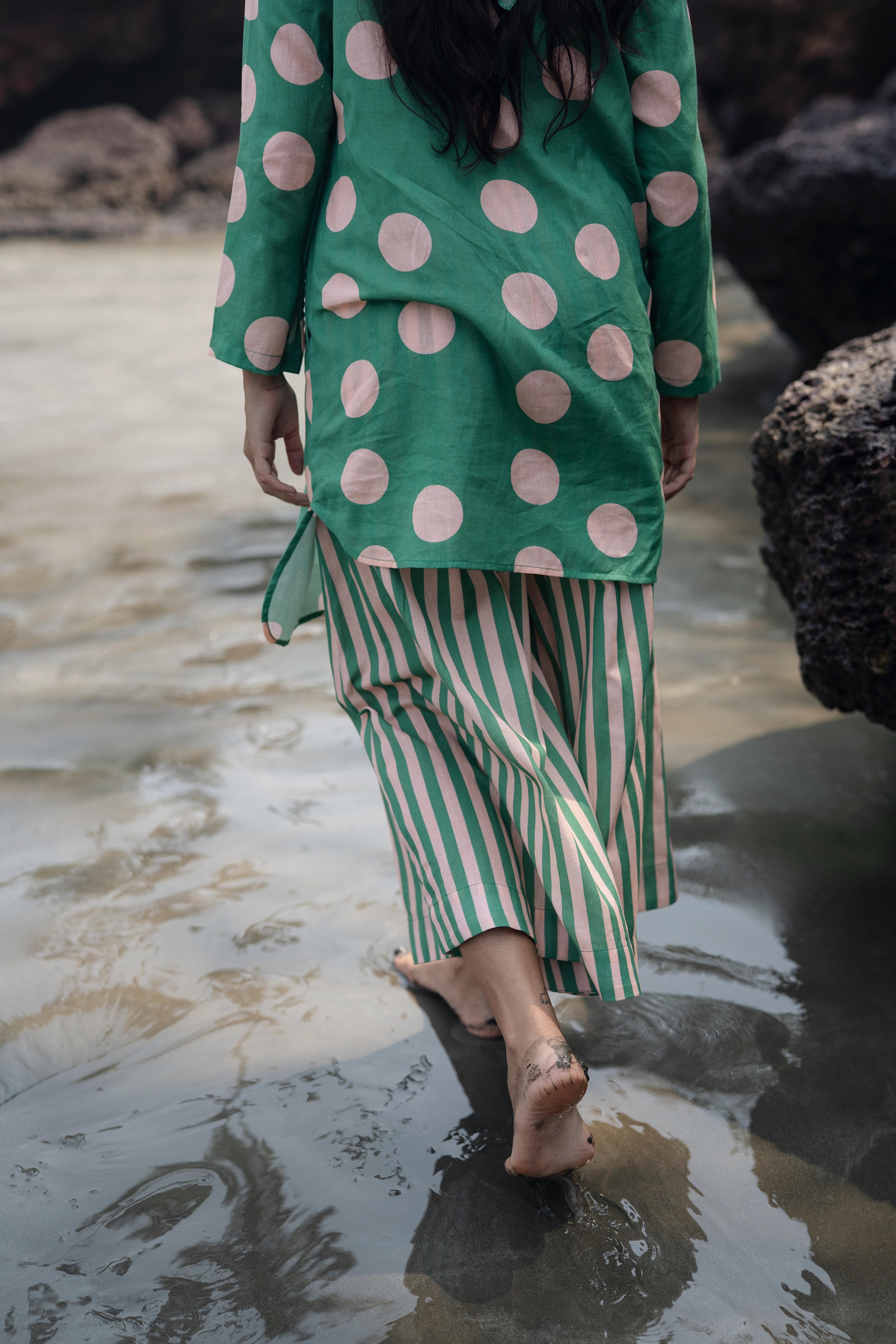 Uniqlo set is made from ou linen cotton polka dot & striped fabric. The kurta is a anti fit short kurta paired with flaired pants makes it perfect for a hot summer.