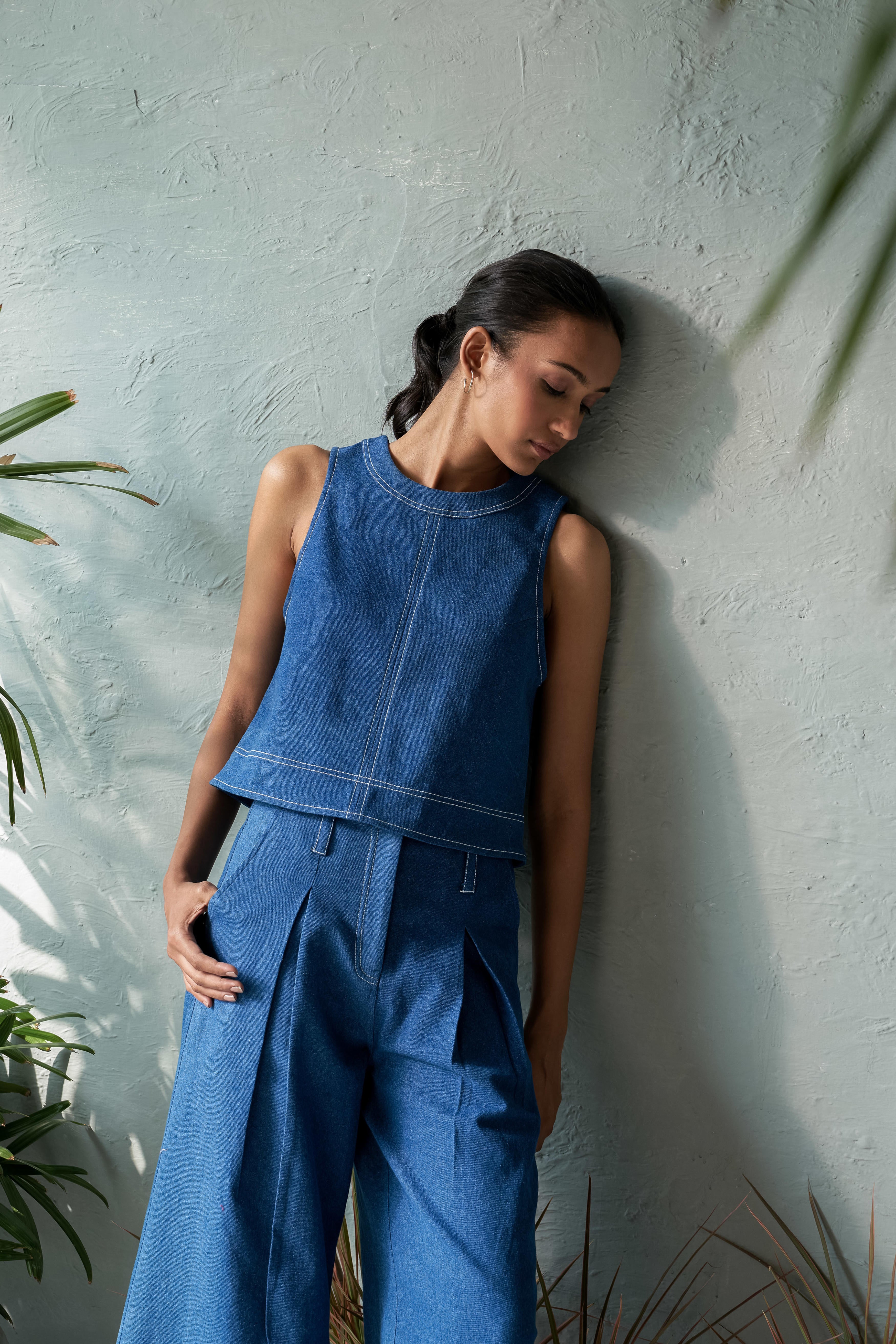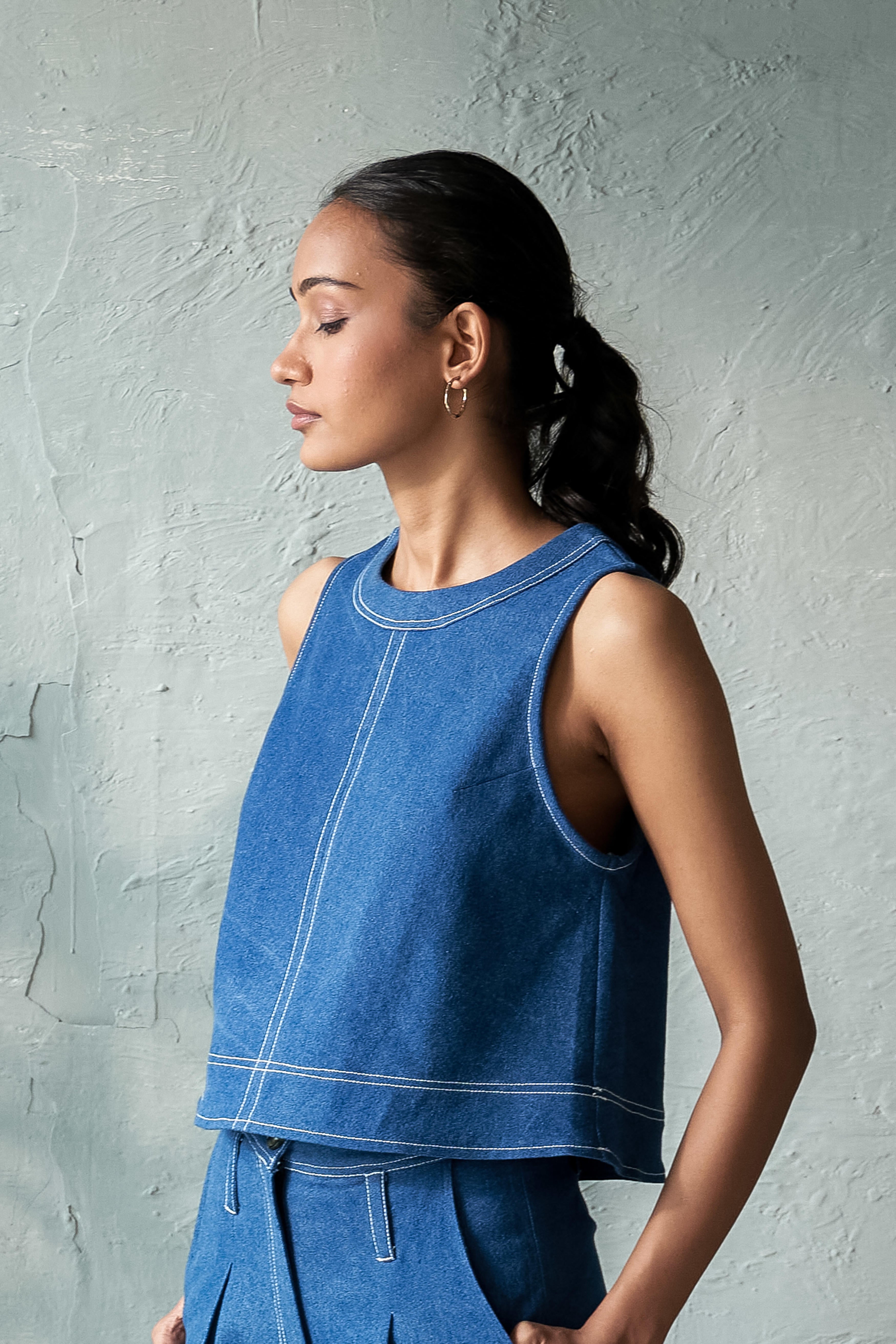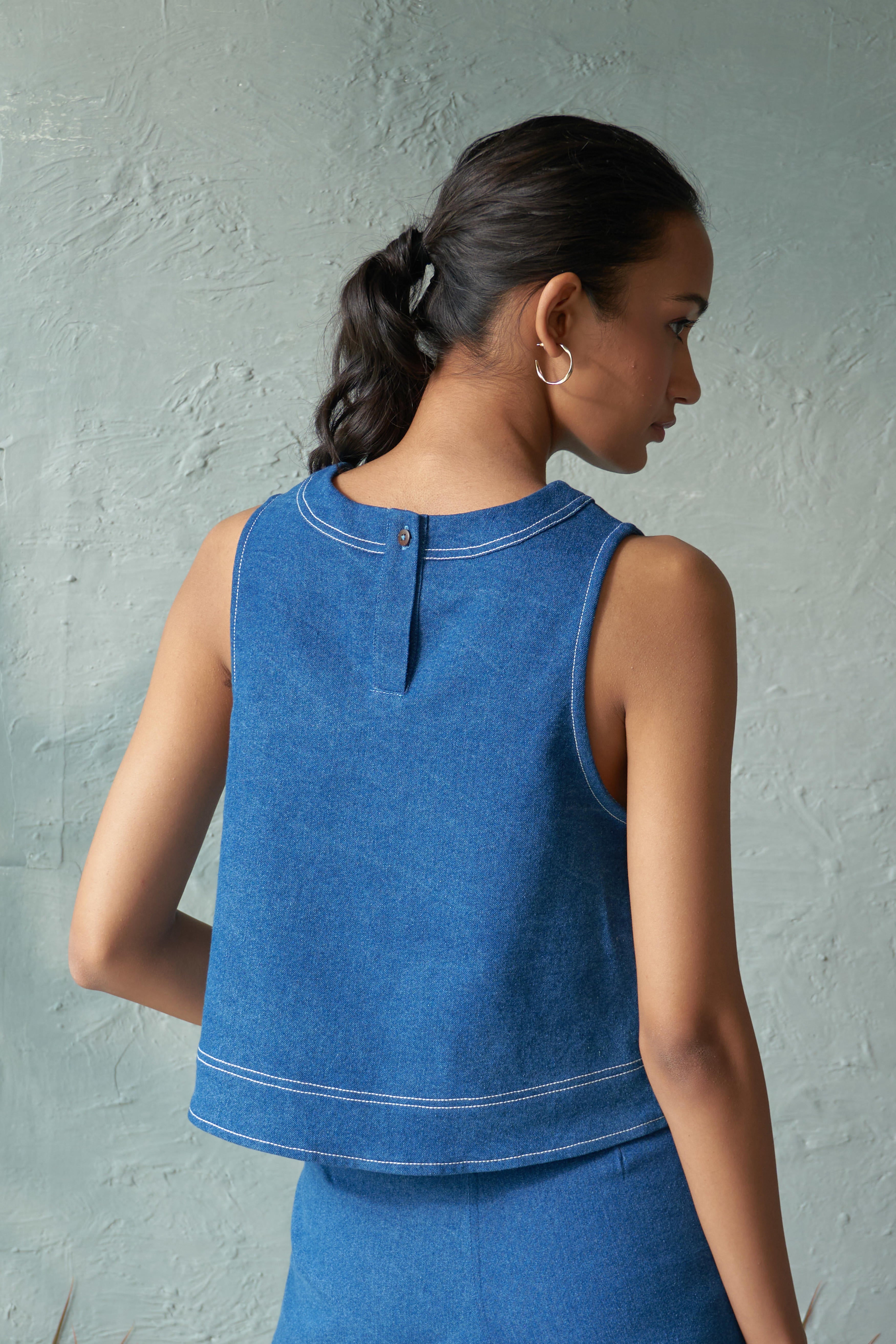An A-line crop top with stitch detailing around the neckline, hem, and front adds a subtle yet stylish touch to a classic silhouette. The A-line shape flares slightly from the top, offering a flattering fit that enhances comfort and movement. The intricate stitching provides a unique, handcrafted vibe, making this piece stand out. Made from soft medium-weight 100% cotton denim. This crop top can be paired with high-waisted jeans, skirts, or trousers, creating a balanced look. It's perfect for casual outings or can be dressed up with accessories for a more polished appearance. Note: Denim may exhibit natural distress marks due to the fabric's weave.