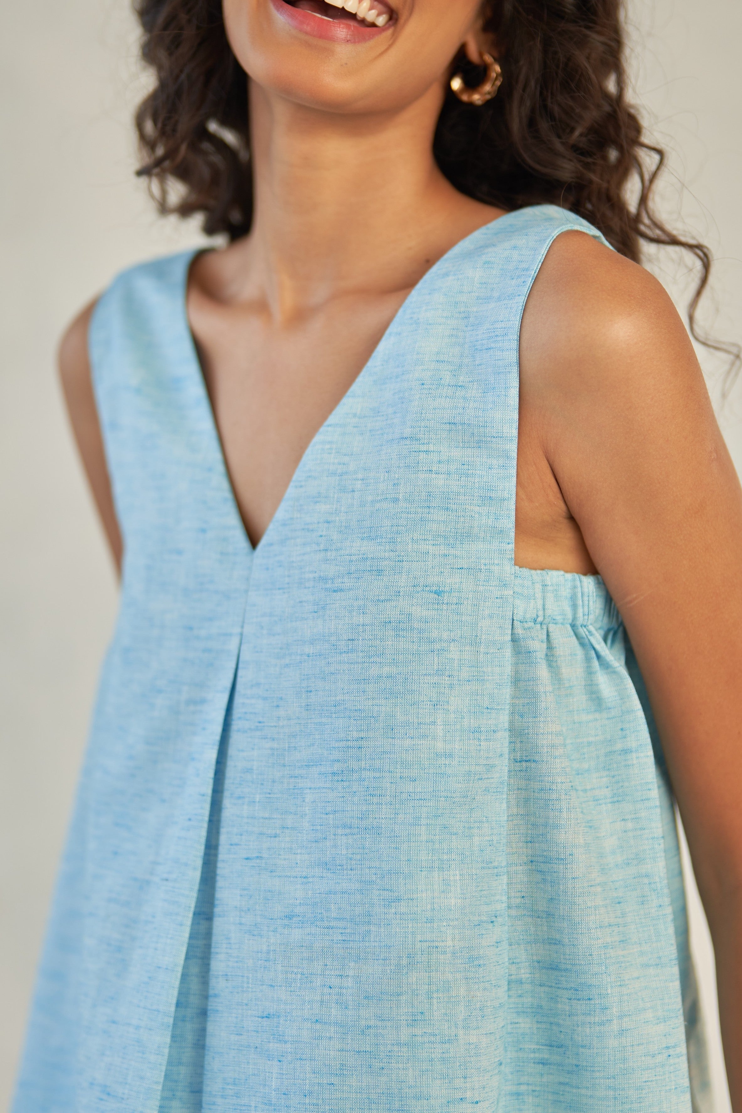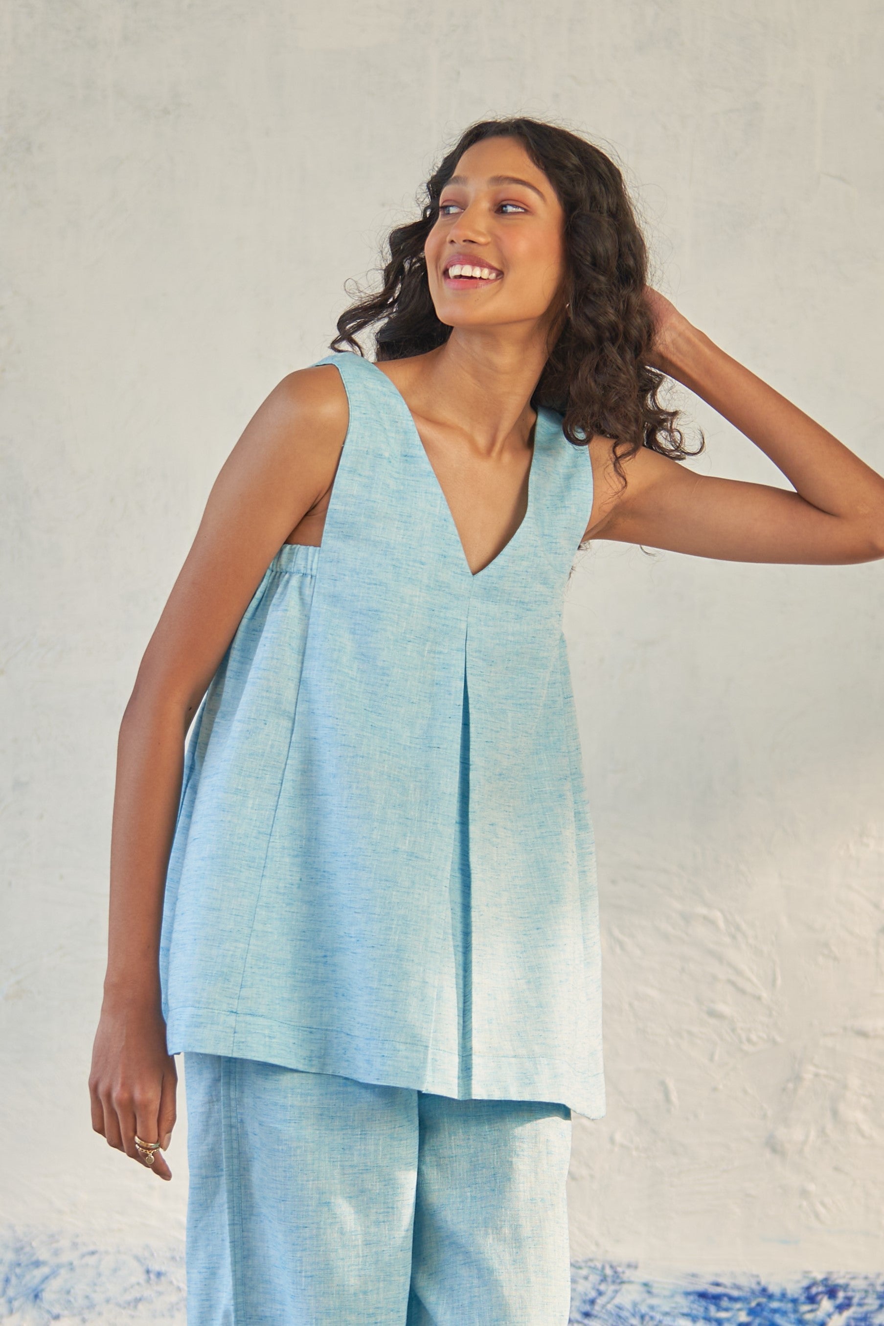 Your Essential for Urban Adventures, Day or Night. Crafted from lightweight cotton, this piece flaunts an elegant A-line silhouette, accentuated by a flattering V-neckline. Featuring a front inward pleat and elasticated side panels, it effortlessly gathers for a soft, chic effect. Whether navigating the bustling city streets or embracing the urban nightlife, pair it seamlessly with the matching trousers for an effortlessly coordinated look.