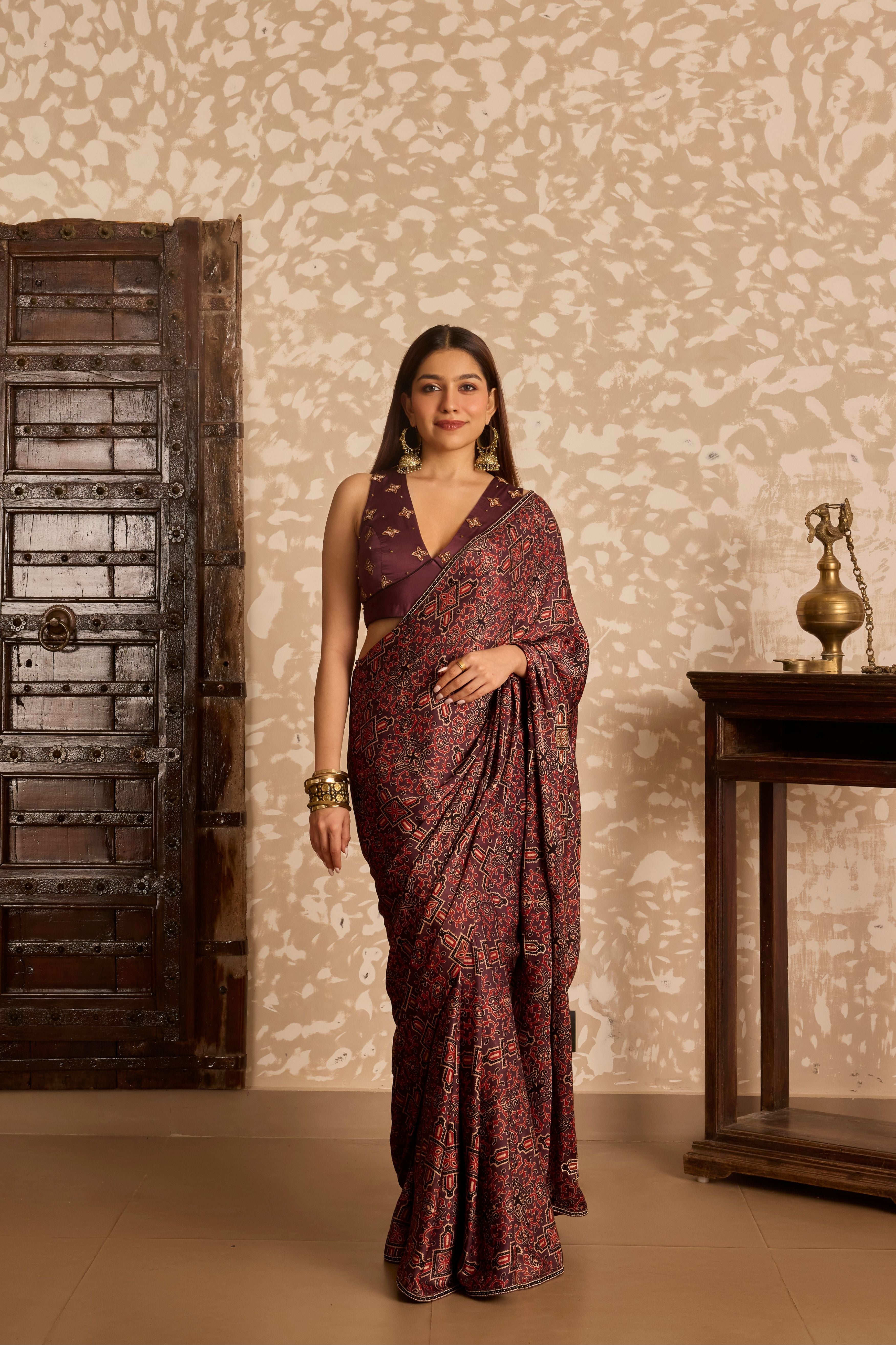 Brown Ajrakh saree with a delicate embroidered border on all three sides and highlighted motifs on the pallu. Paired with a plain brown blouse featuring machine and hand embroidery, finished with a back tie-up detail. Handcrafted by Gujarat’s skilled artisans, the ensemble celebrates the heritage of Ajrakh printing — a meticulous sixteen-step process using natural dyes, making each piece one of a kind. Perfect for festive occasions, weddings, and trousseau.