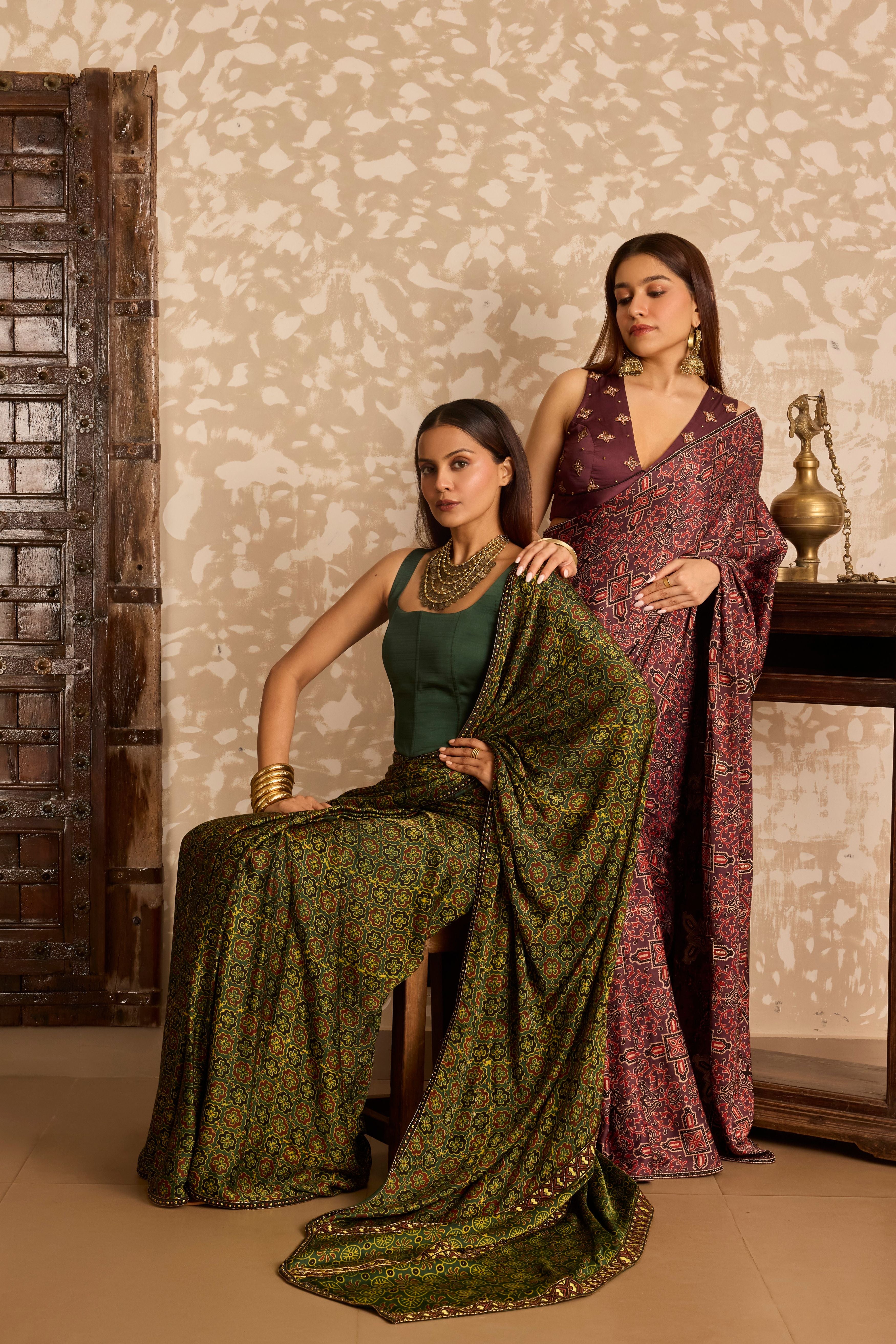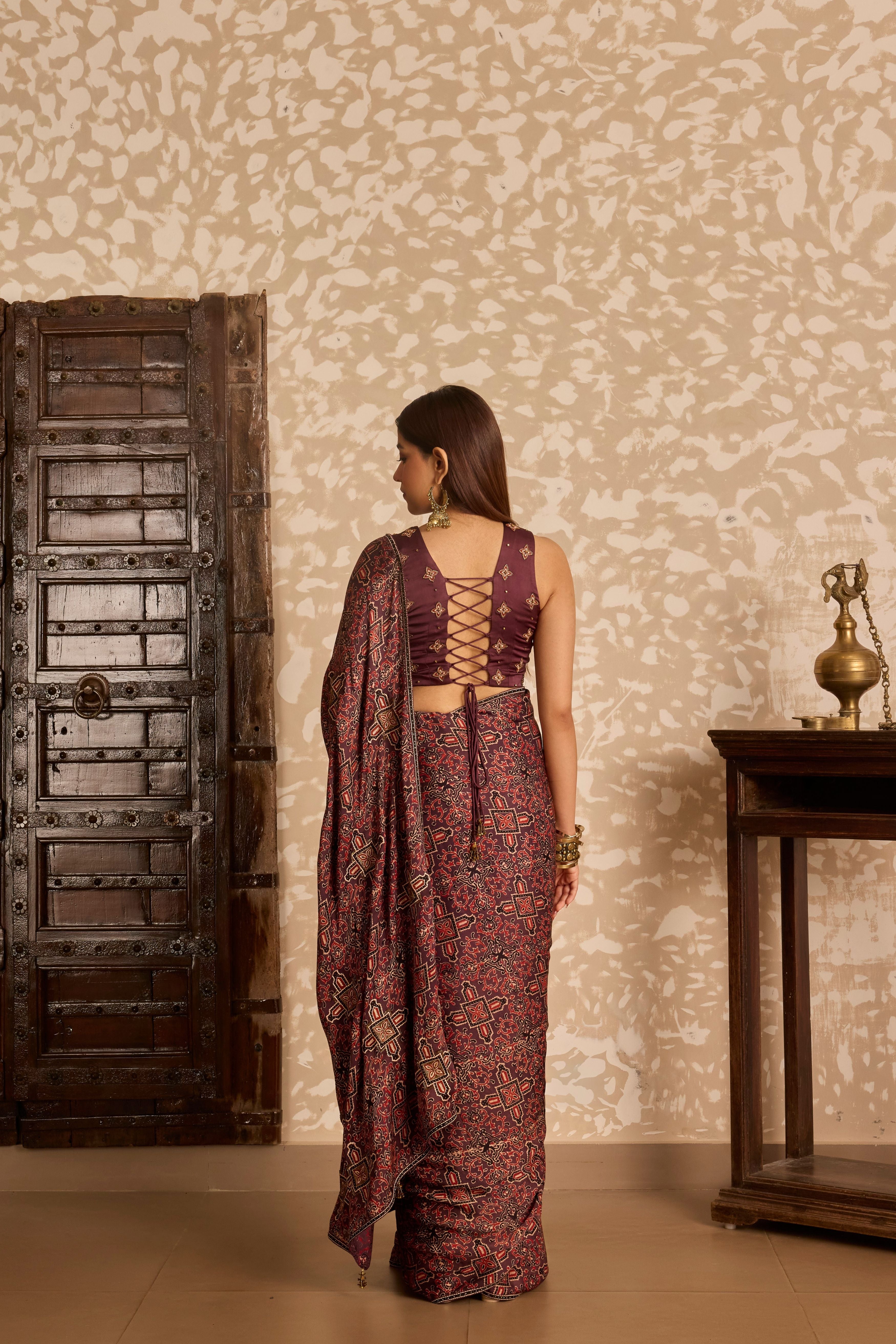Brown Ajrakh saree with a delicate embroidered border on all three sides and highlighted motifs on the pallu. Paired with a plain brown blouse featuring machine and hand embroidery, finished with a back tie-up detail. Handcrafted by Gujarat’s skilled artisans, the ensemble celebrates the heritage of Ajrakh printing — a meticulous sixteen-step process using natural dyes, making each piece one of a kind. Perfect for festive occasions, weddings, and trousseau.