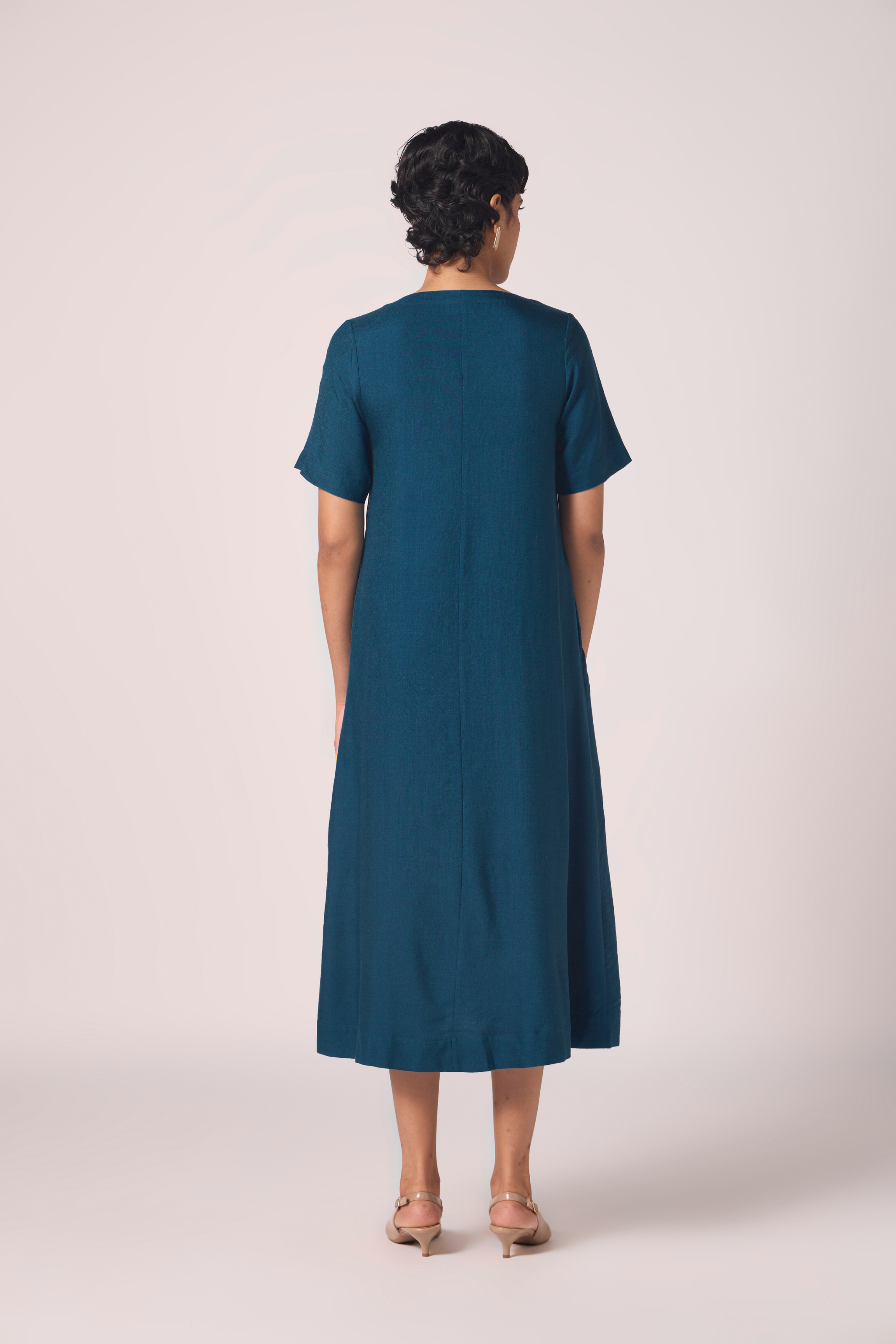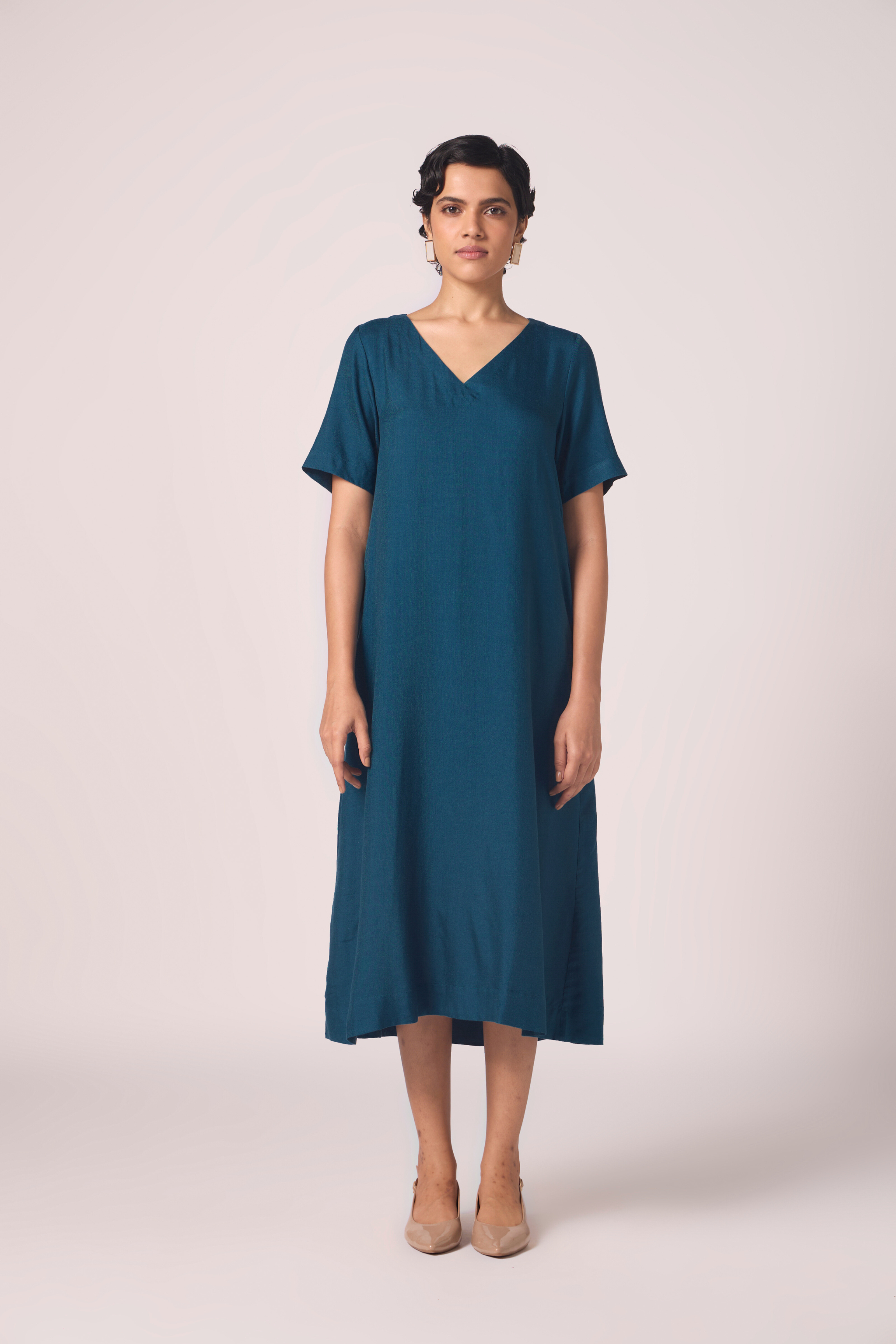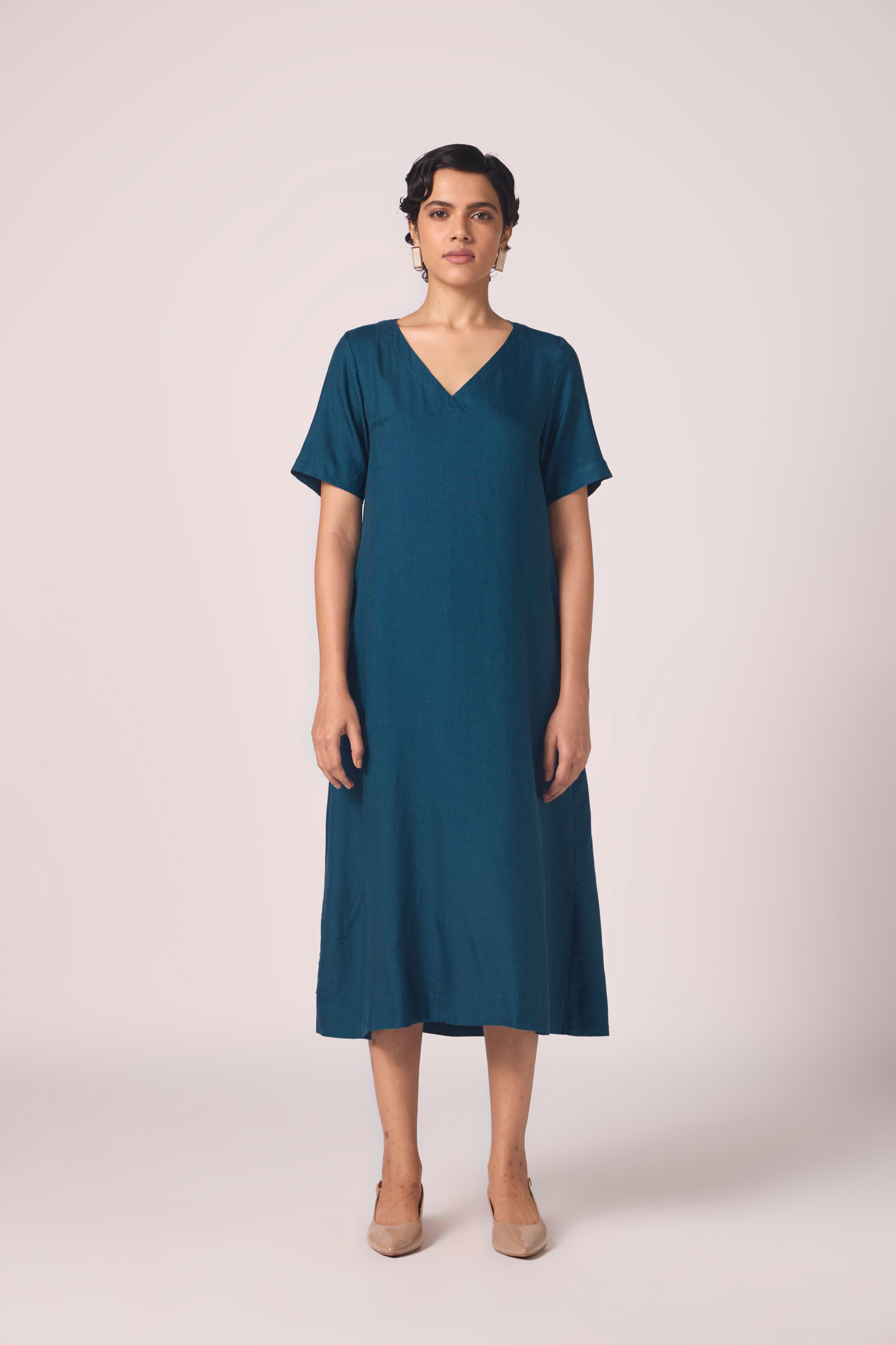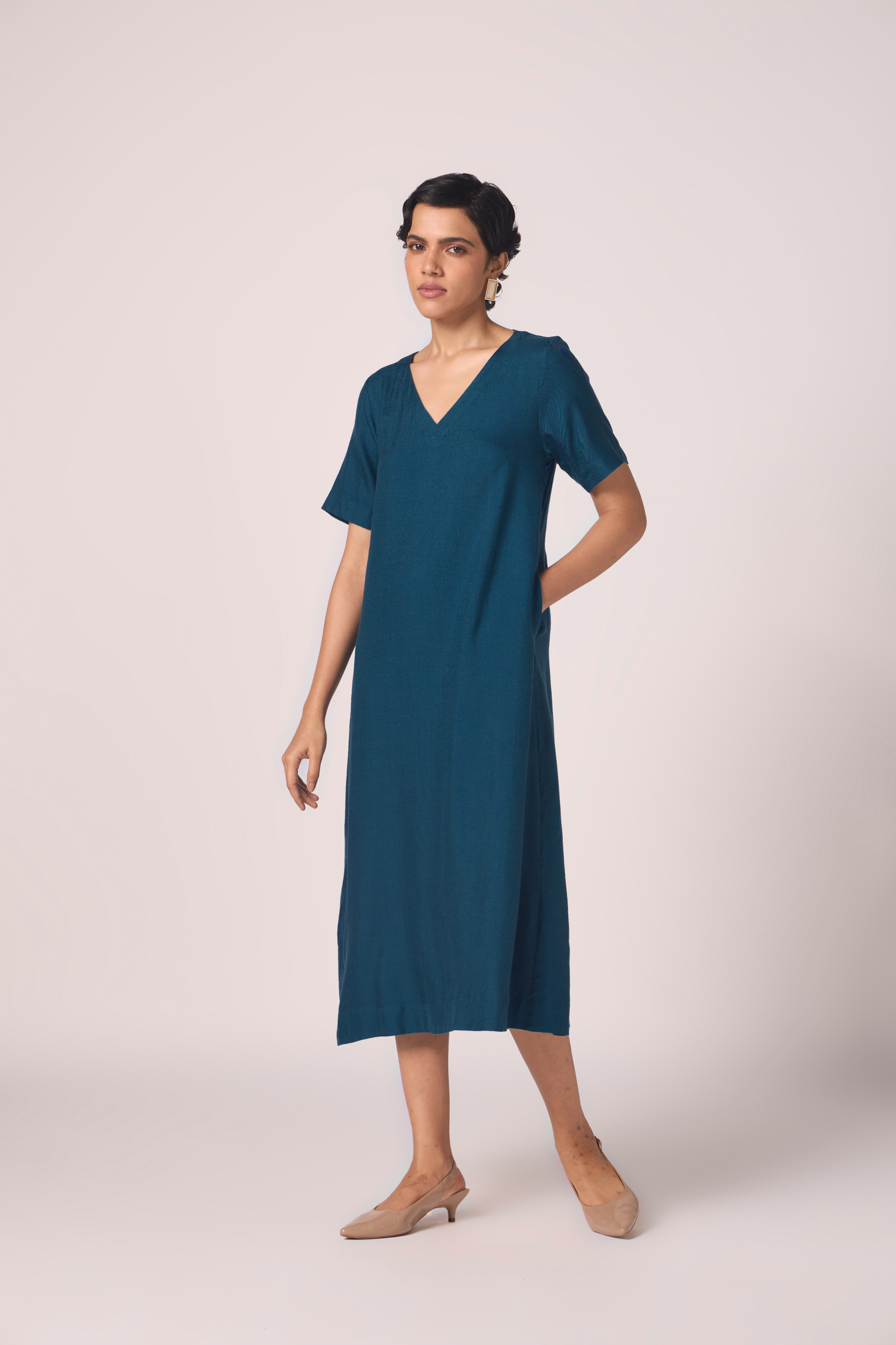 This midi dress frames the neckline with a sharp V, falling into a relaxed tent silhouette and finished with discreet pockets. - Regular Fit - Anushka is 5'8 and wearing S . Her body measurements are Bust: 32", Waist: 29", Hips: 36" - Spun silk twill with lustrous fall - Midi length silhouette with balanced line - V-neckline finished with concealed facing - Set-in sleeves tailored for clean drape - In-seam pockets integrated without bulk
