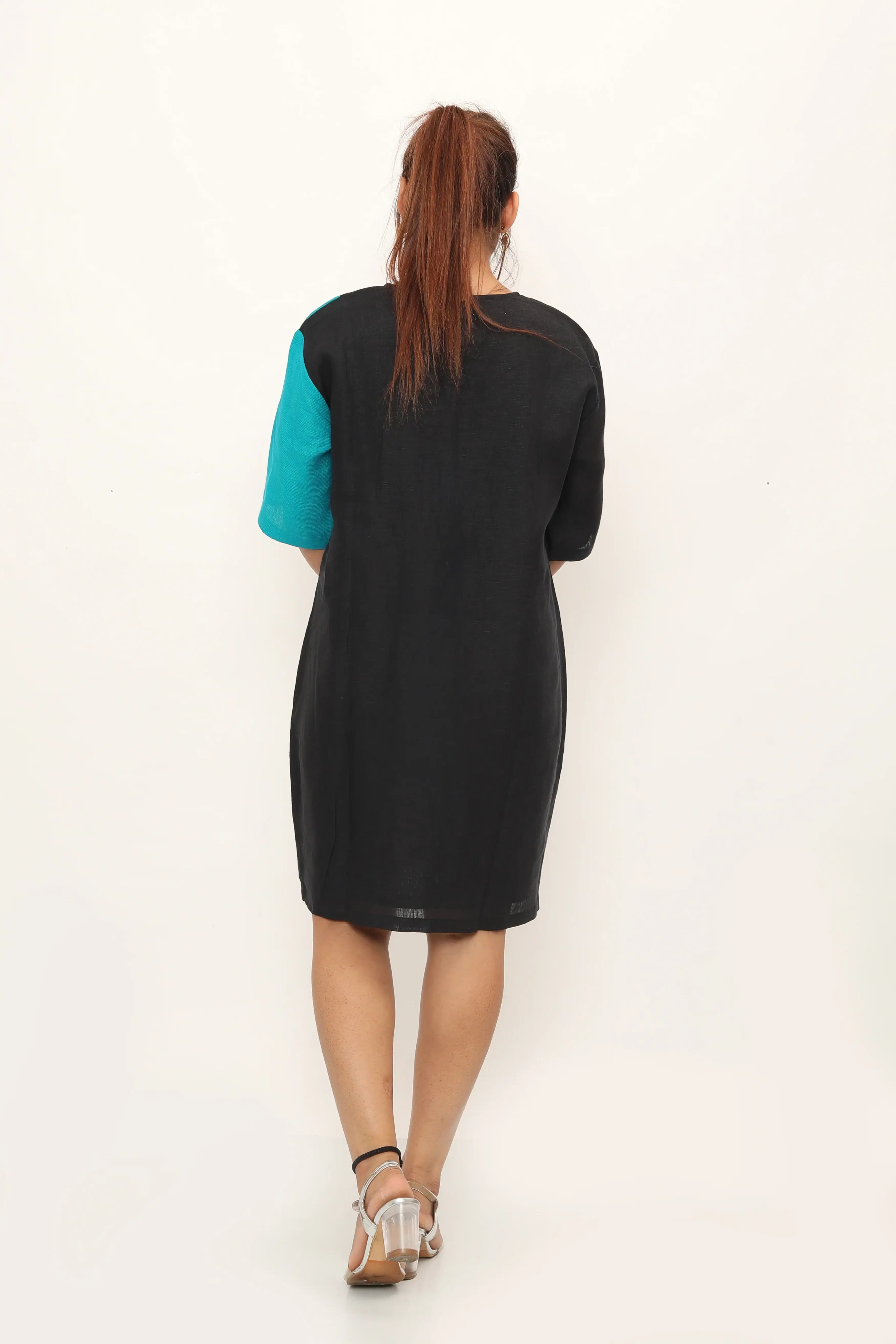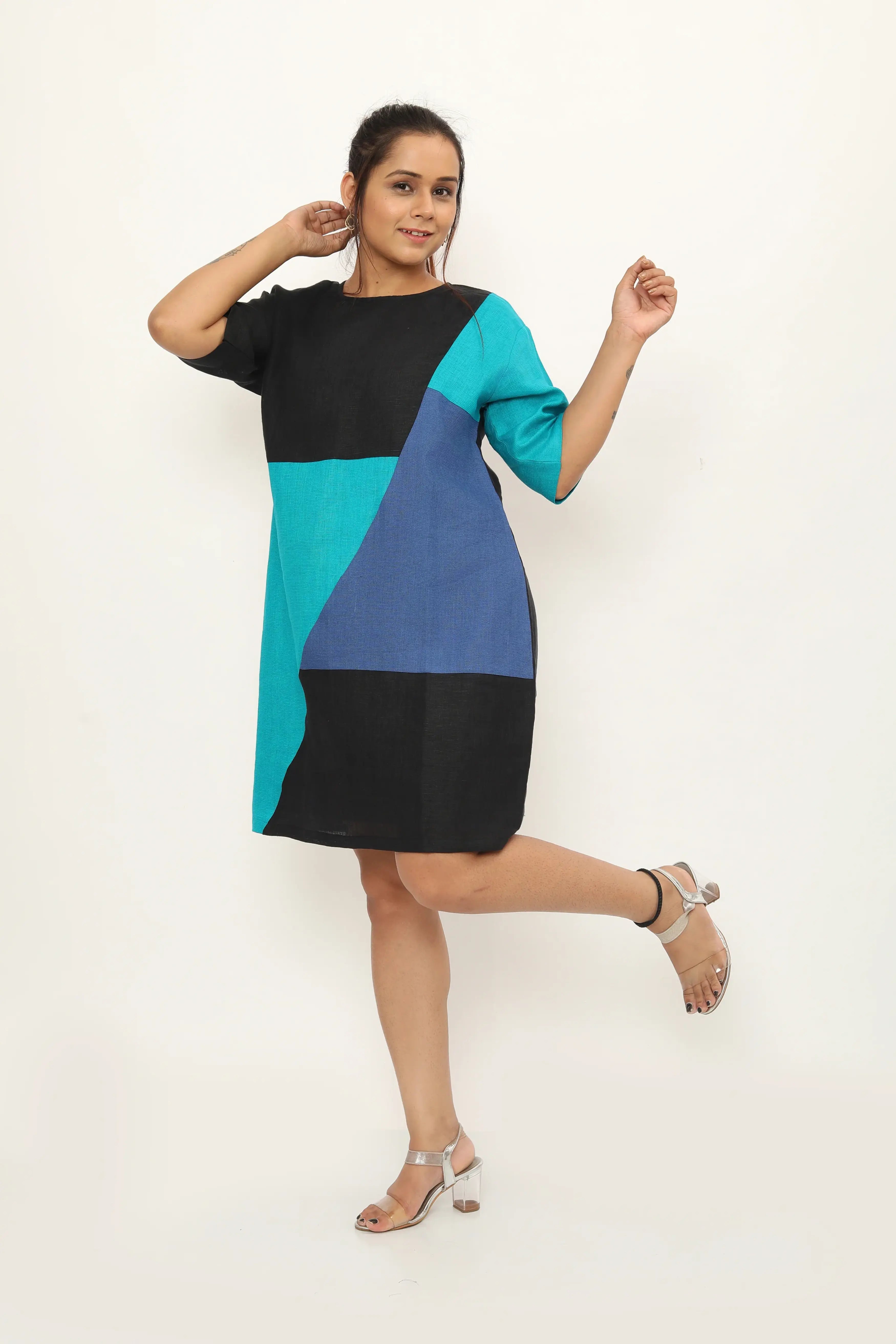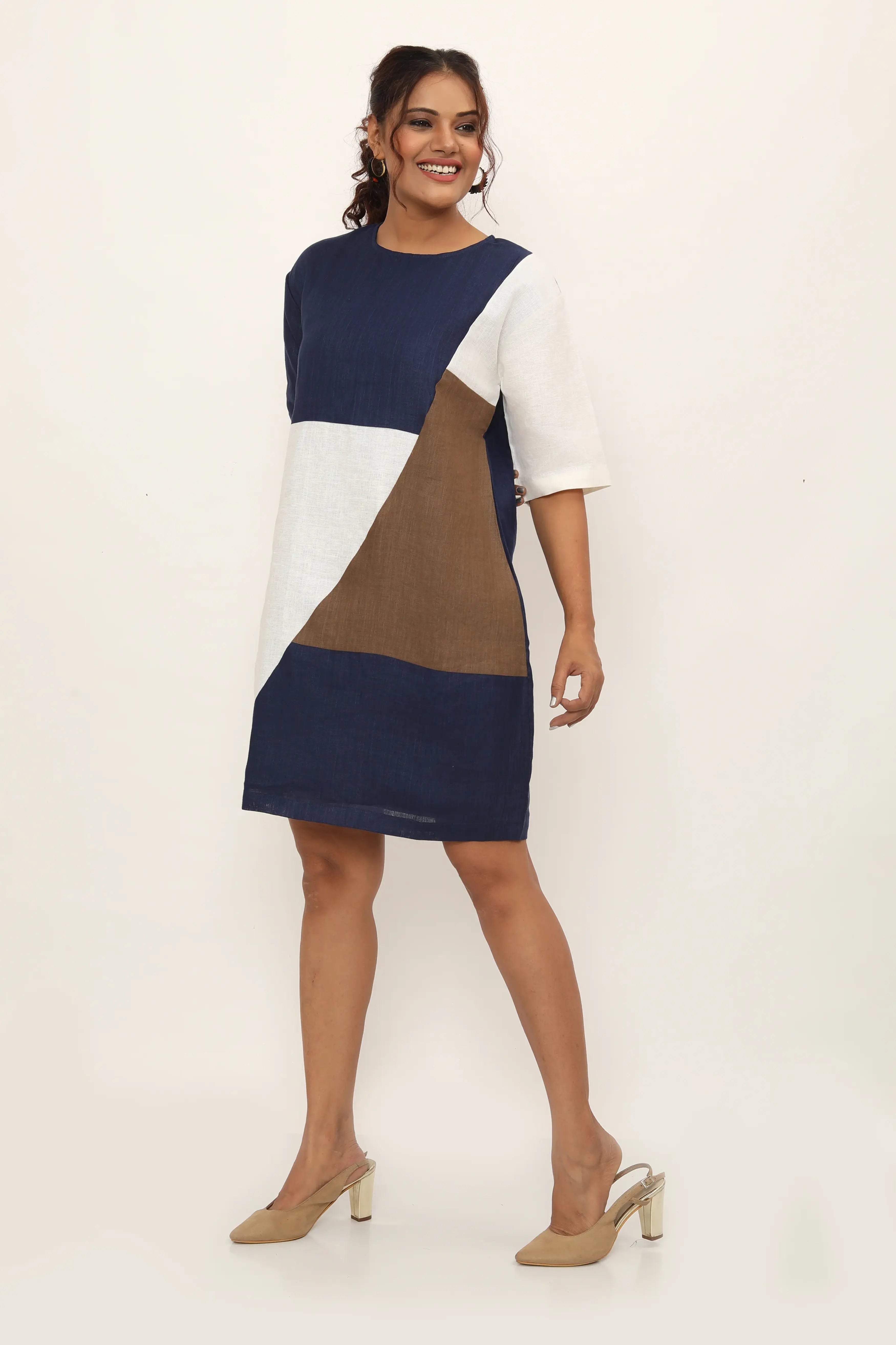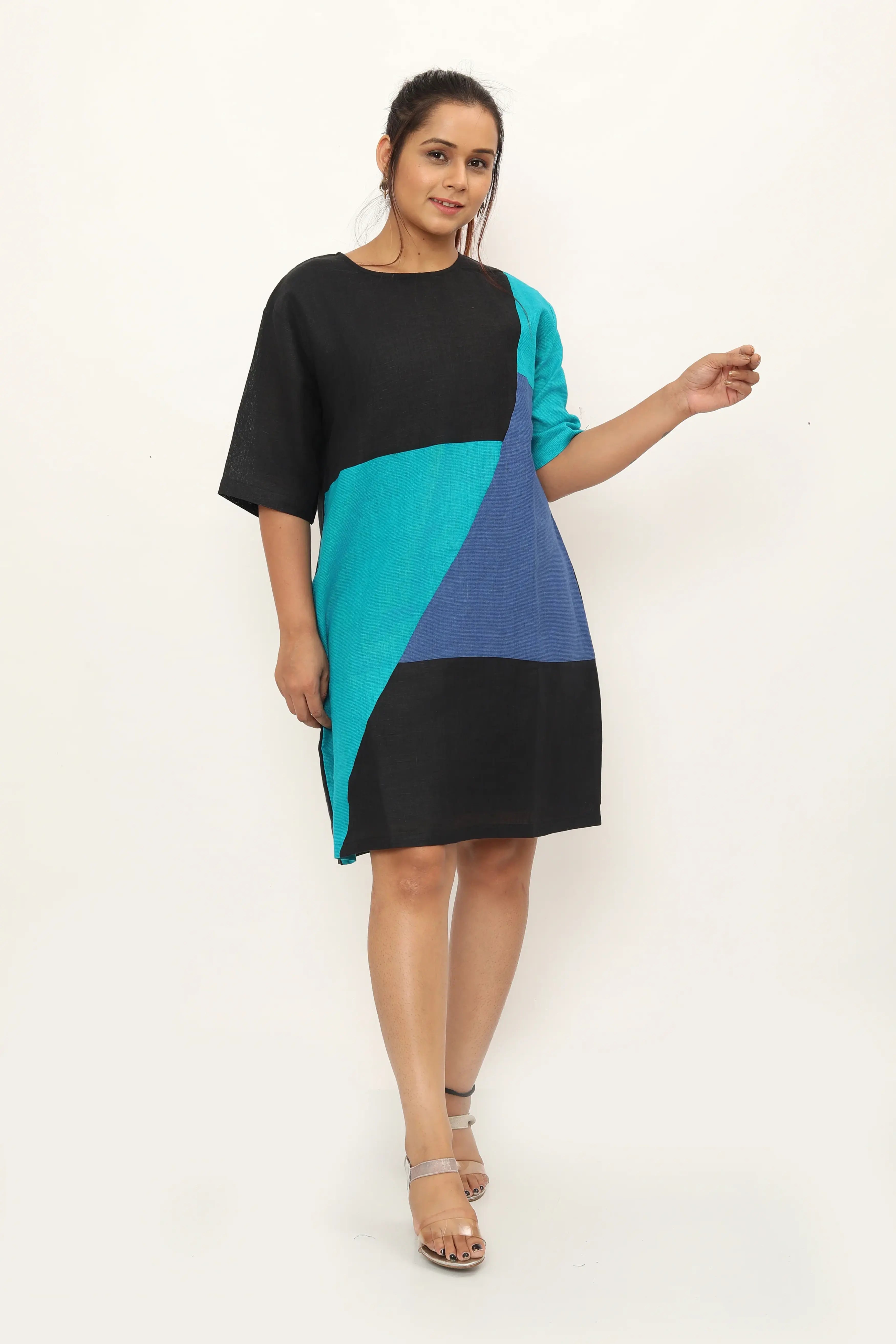Introducing the Ventura Dress - a relaxed fit knee-length dress with three-quarter sleeves, designed for both comfort and style. Featuring asymmetrical colour-blocked joints, this dress offers a flattering silhouette while adding a touch of modern design, ensuring you feel comfortable and confident wherever you go. Pair it with sandals and a woven tote for a chic daytime look, or dress it up with heels and statement earrings for an evening out.