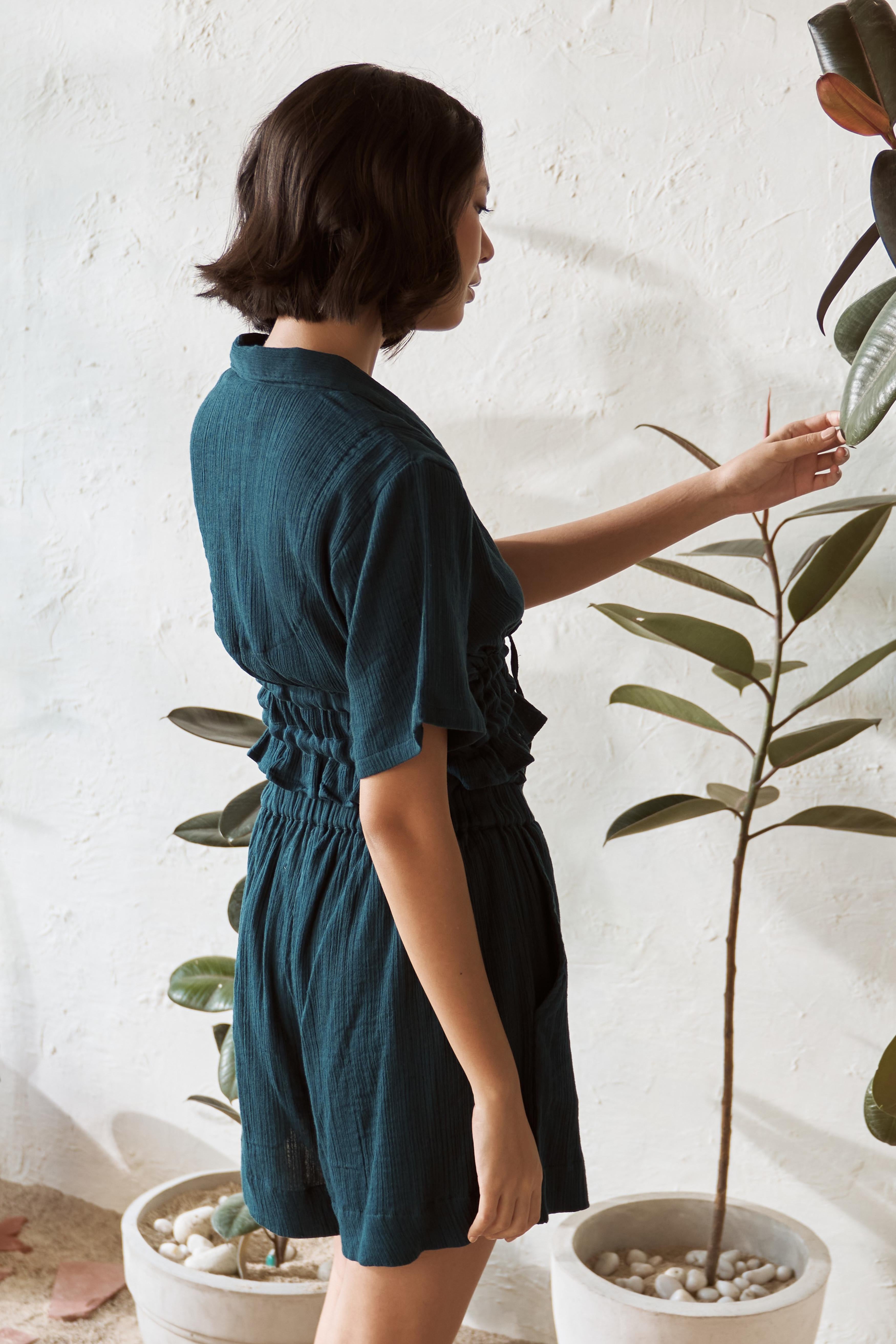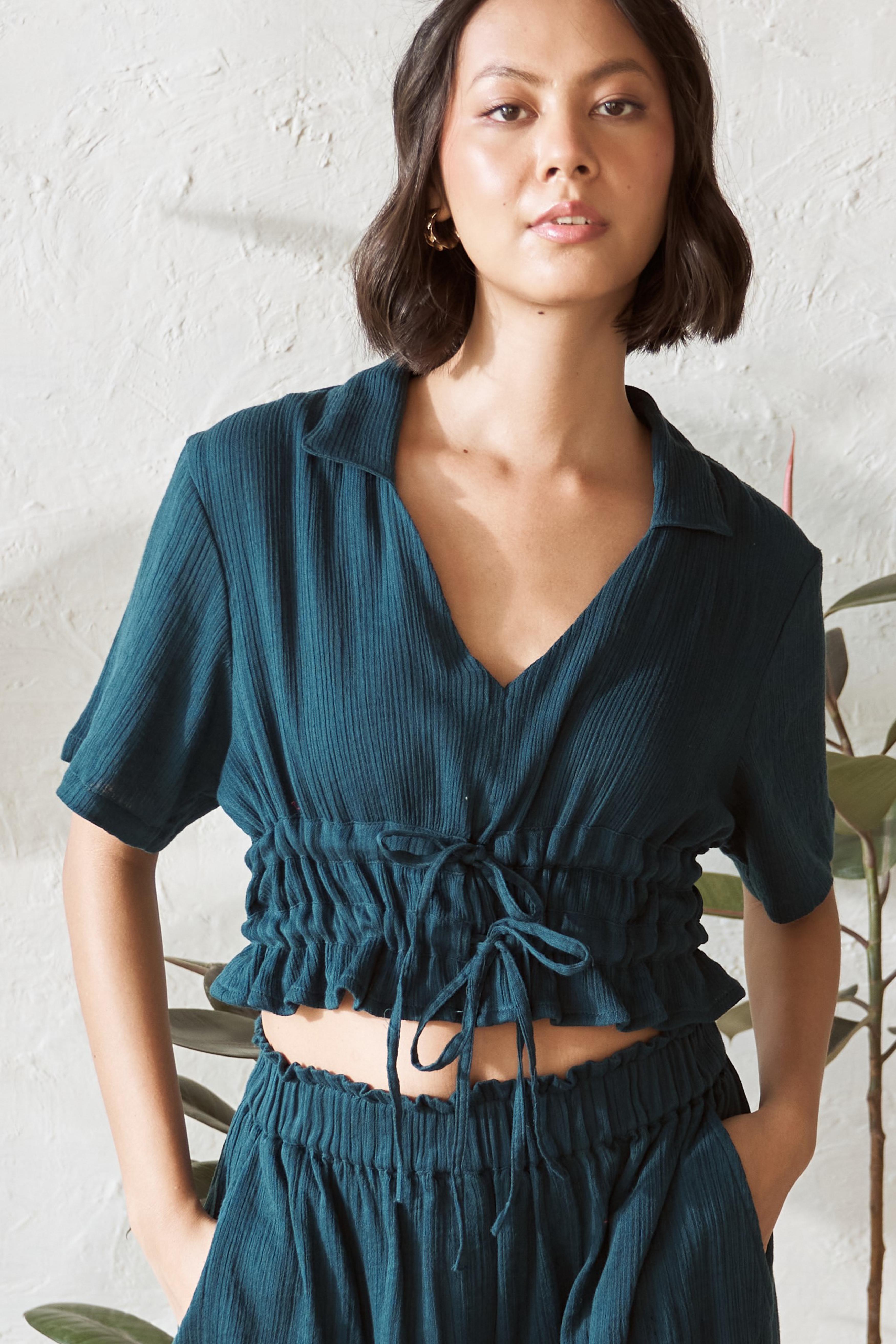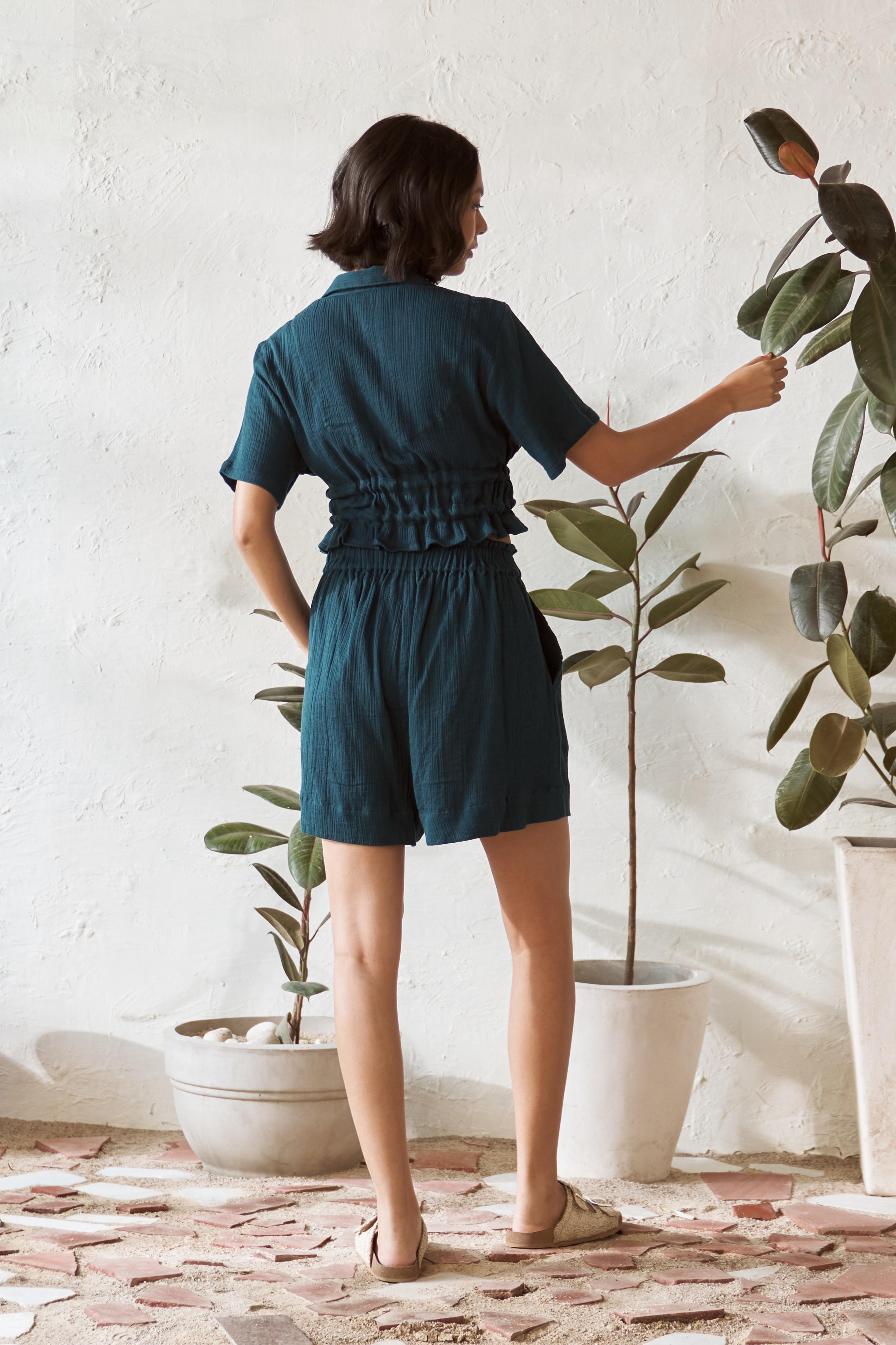 Refresh your summer style with our Teal drawstring crop top, paired perfectly with our A-line shorts. The airy crush fabric of the top, in a soothing teal hue, keeps you cool while the adjustable drawstring lets you customize the fit. The matching A-line shorts feature a relaxed fit, an elasticated waistband for comfort, and convenient pockets for a laid-back yet stylish vibe. This effortless ensemble is ideal for warm days, whether you’re out exploring or enjoying a casual outing. Stay cool, comfortable, and chic with this trendy combo.