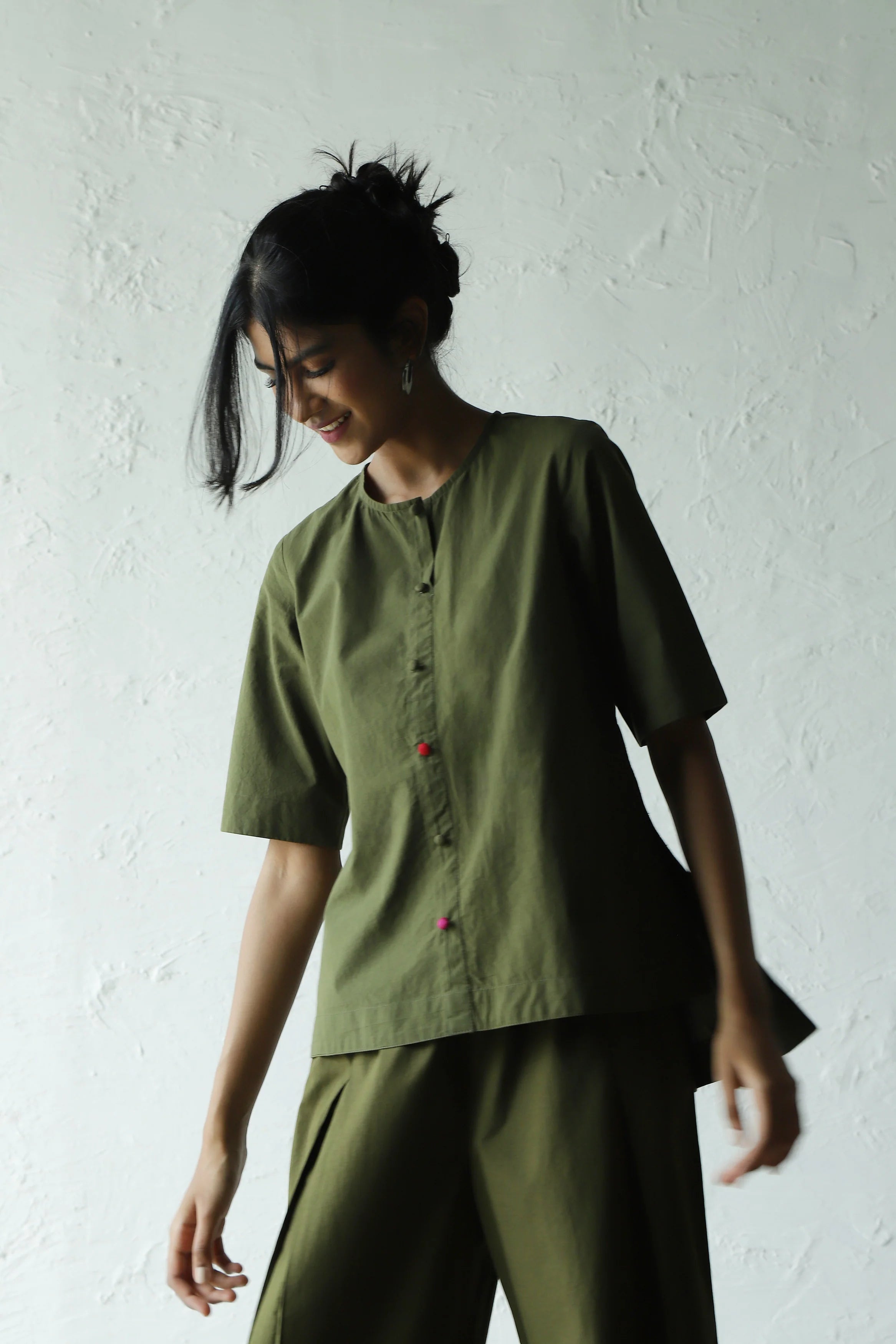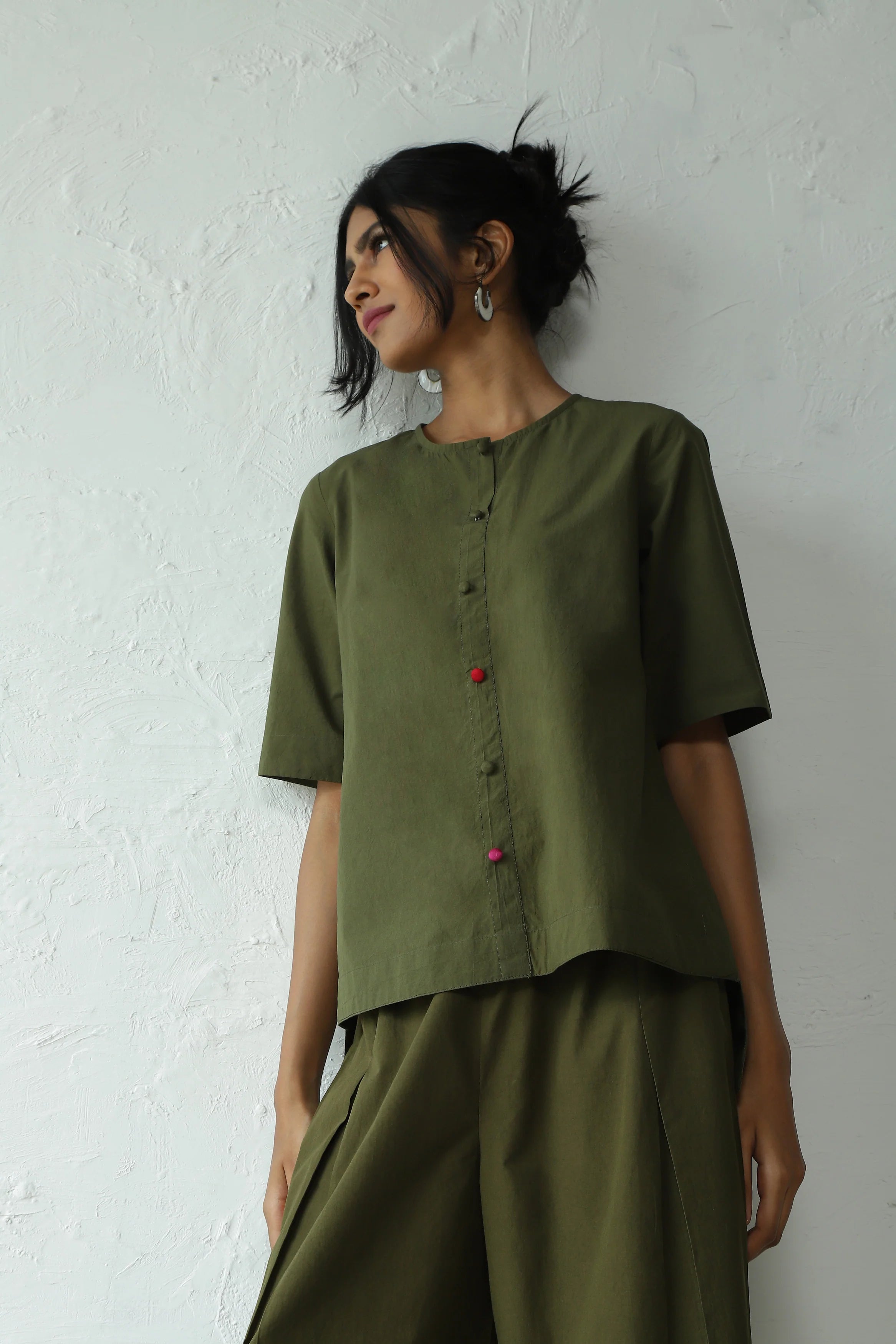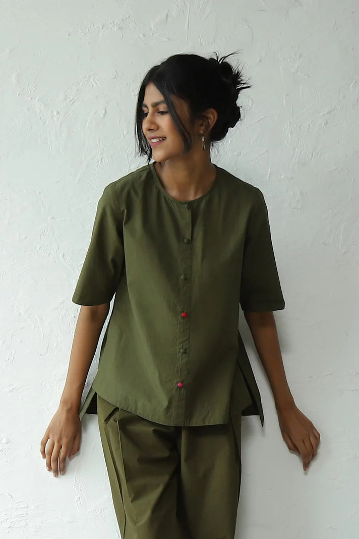 This green hi-lo top is the perfect piece to pack for a holiday, but it'll work just as well back in the city. Crafted from crisp cotton poplin, it features a round neckline and dome fabric buttons that add another dimension to the silhouette. The touch of contrast pink and red buttons adds a hint of color pop. It can be paired with any bottoms of your choice. Complete the look by wearing it with our matching pants for a perfect coordinated set.