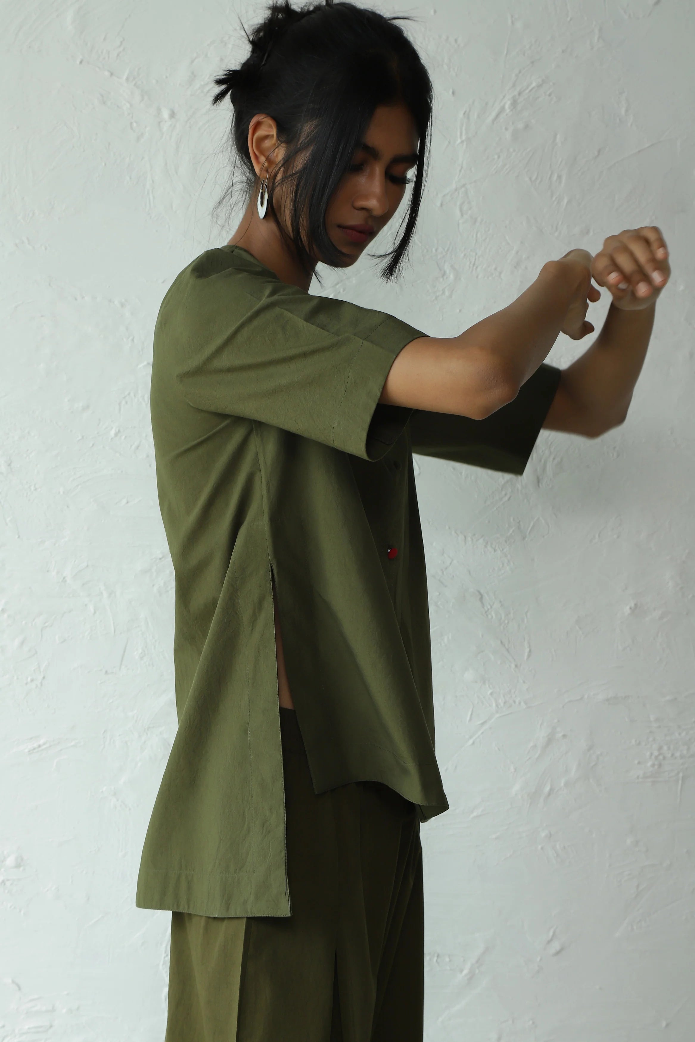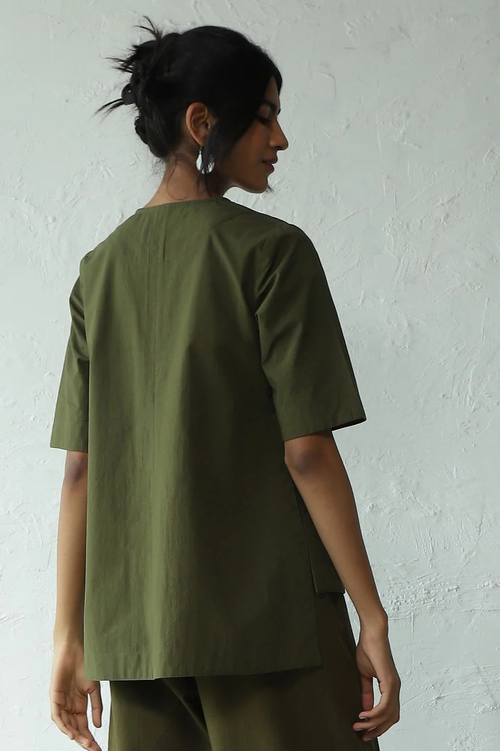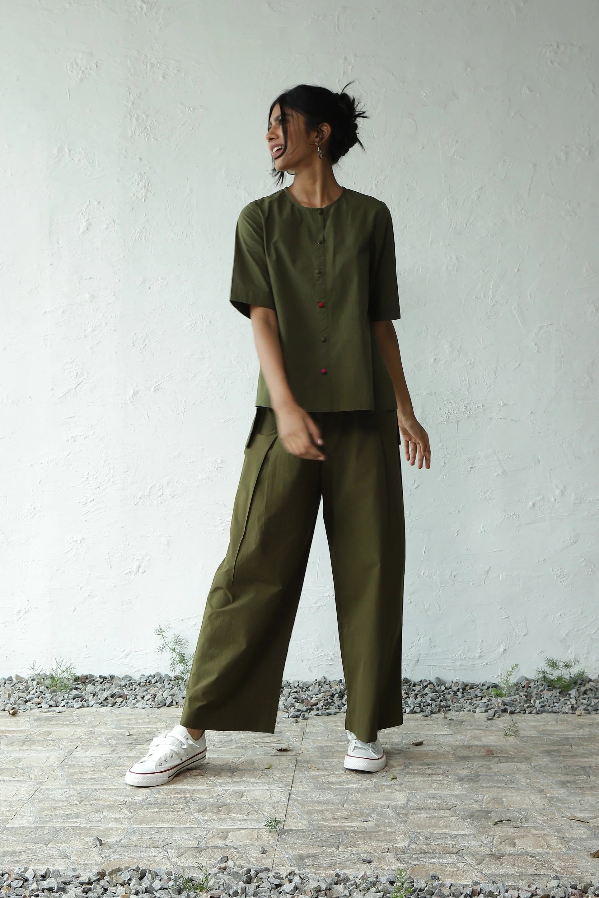 This green hi-lo top is the perfect piece to pack for a holiday, but it'll work just as well back in the city. Crafted from crisp cotton poplin, it features a round neckline and dome fabric buttons that add another dimension to the silhouette. The touch of contrast pink and red buttons adds a hint of color pop. It can be paired with any bottoms of your choice. Complete the look by wearing it with our matching pants for a perfect coordinated set.