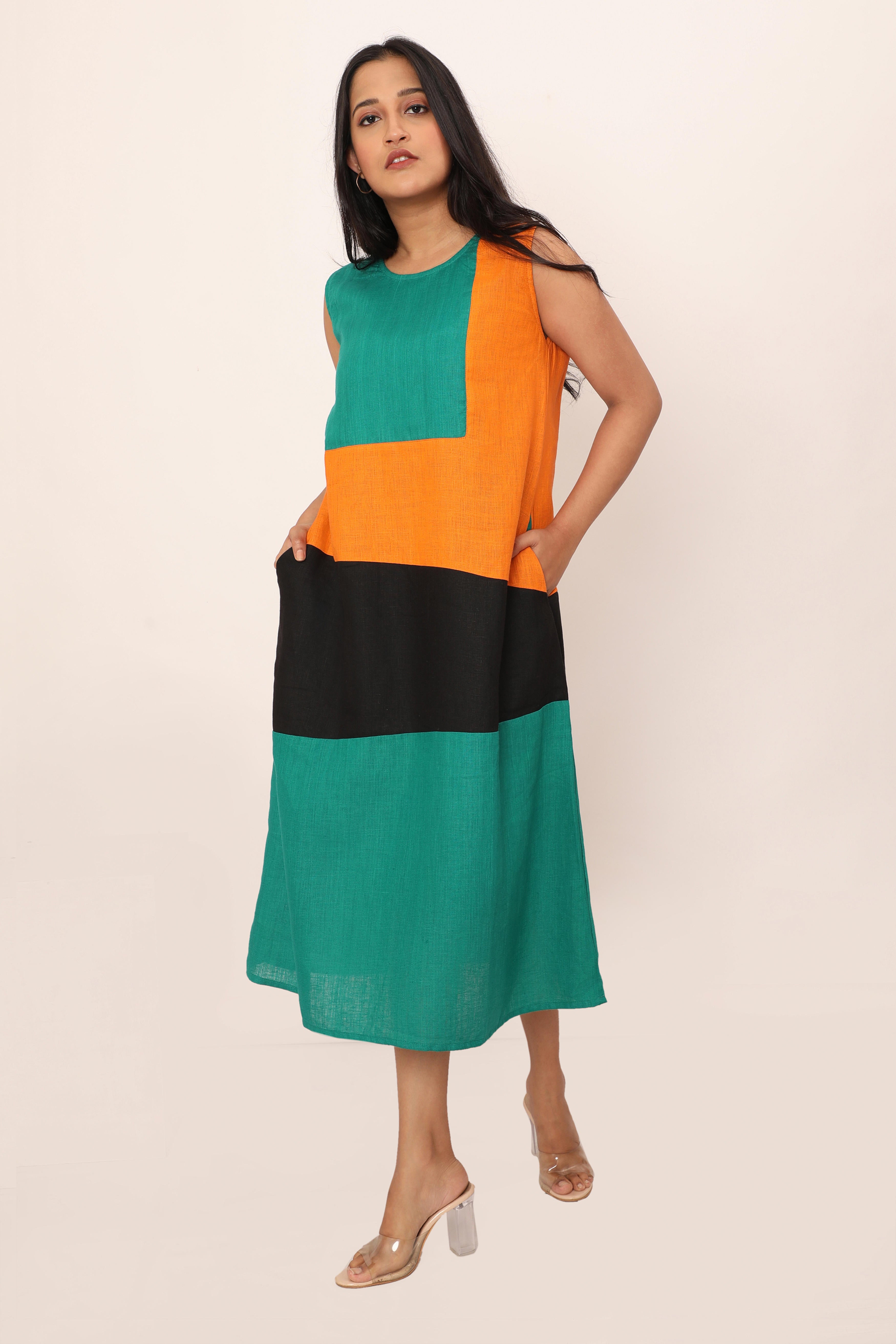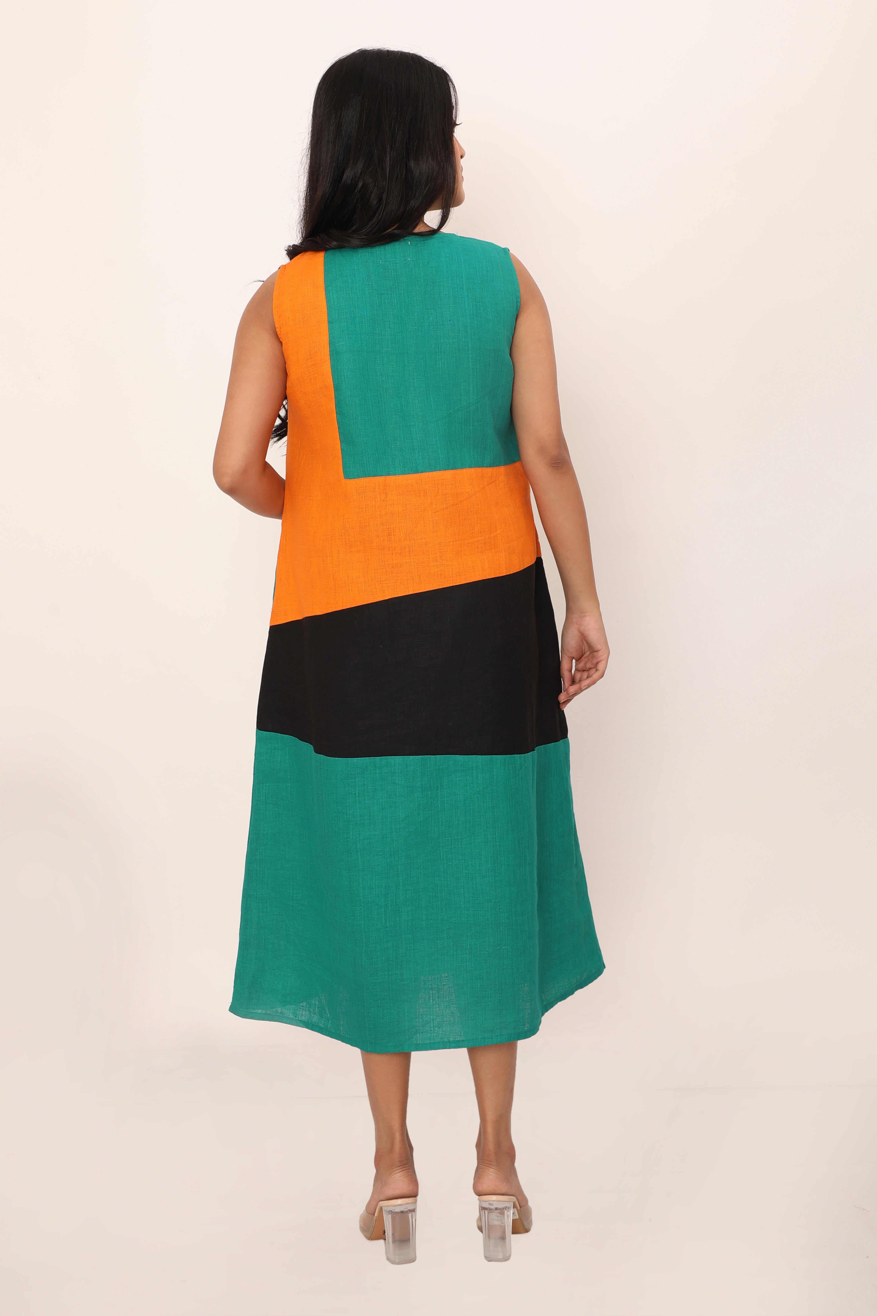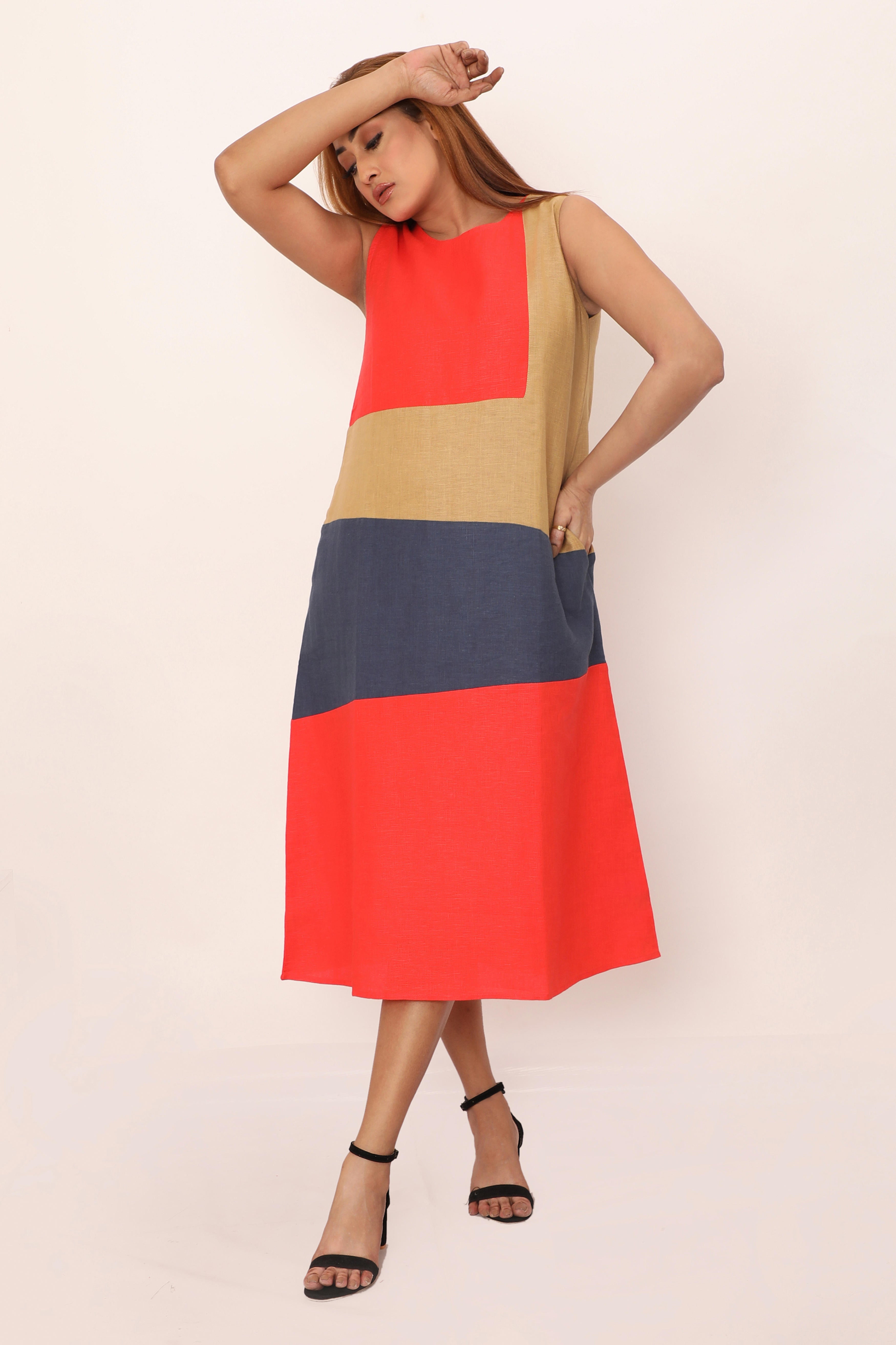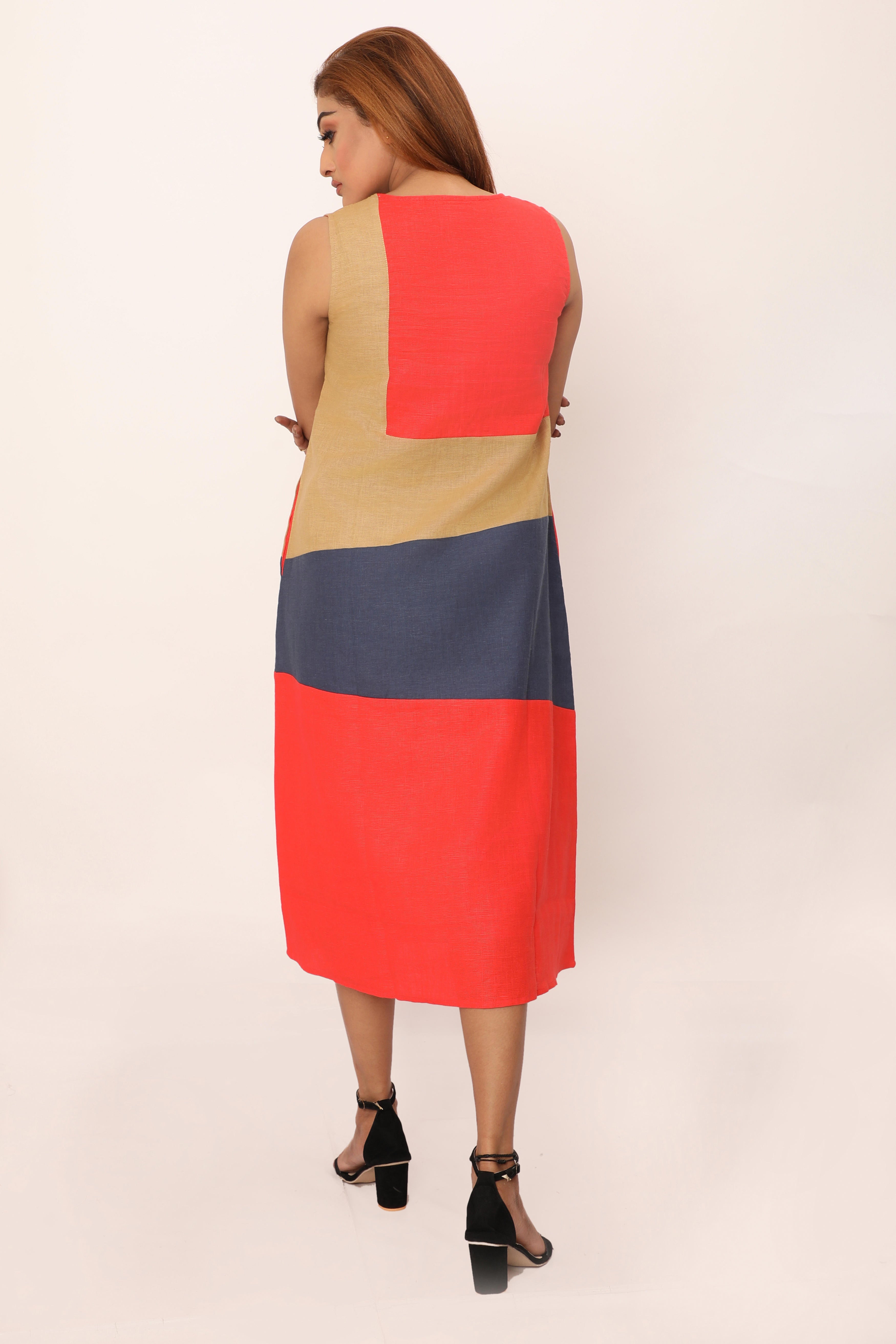 Embrace effortless elegance with the Vesper sleeveless midi dress. The relaxed silhouette and clean lines make it a versatile staple, perfect for both casual outings and more refined occasions. Thoughtfully designed with bold, geometric panels, this piece offers a playful yet polished look. Its breathable fabric ensures all-day comfort, while hidden side pockets add practicality without compromising on style. Pair it with your favourite accessories and step out in timeless ease.
