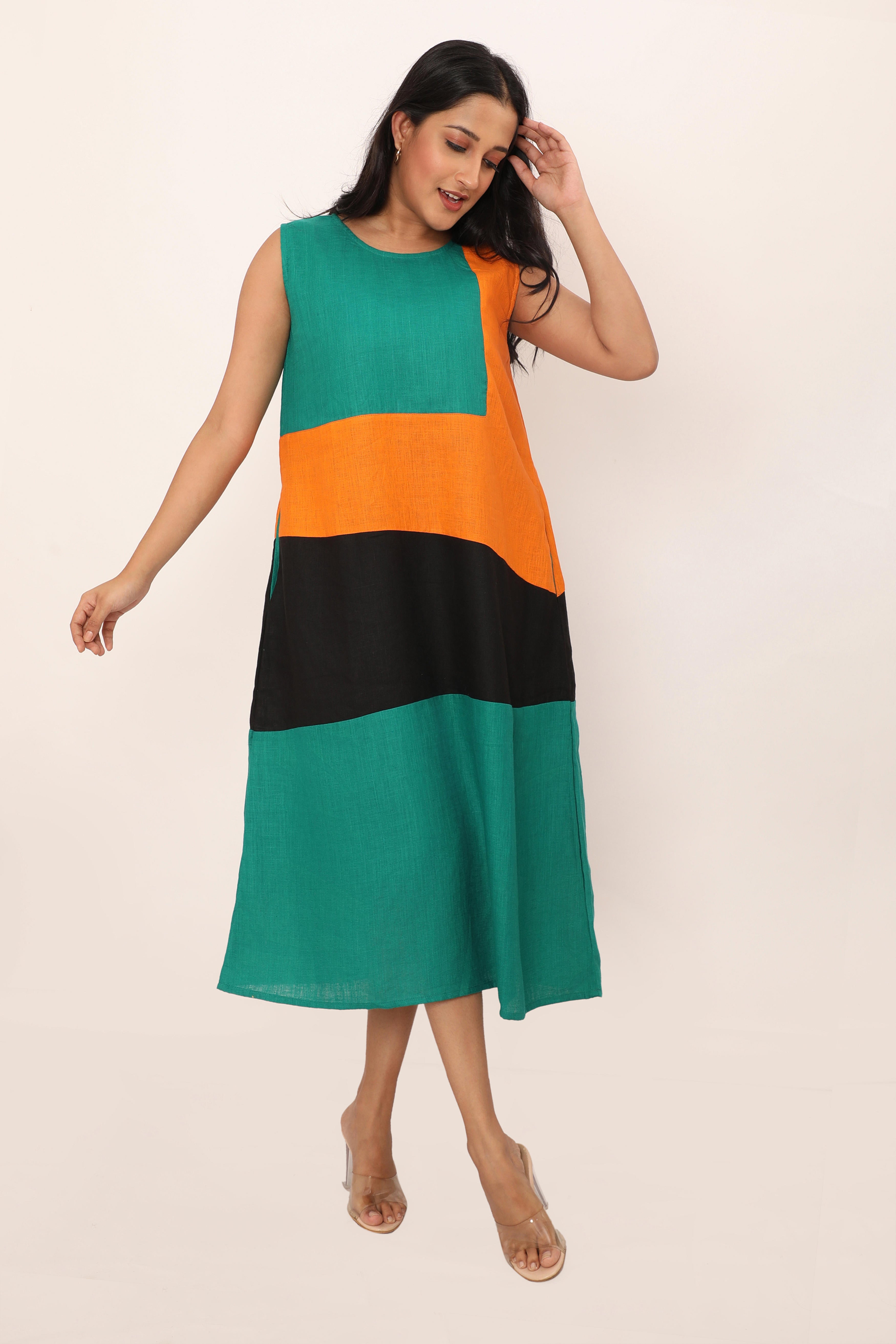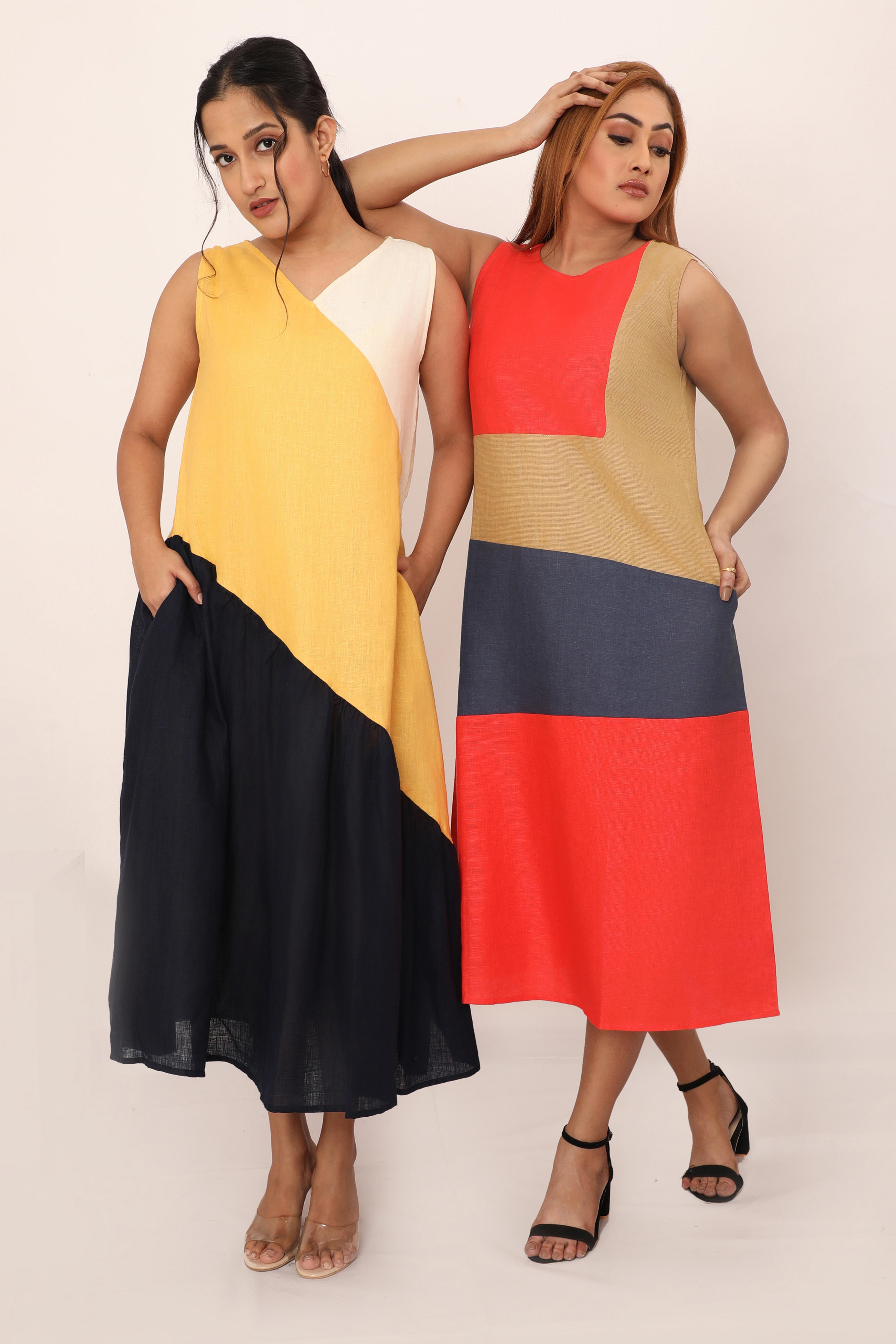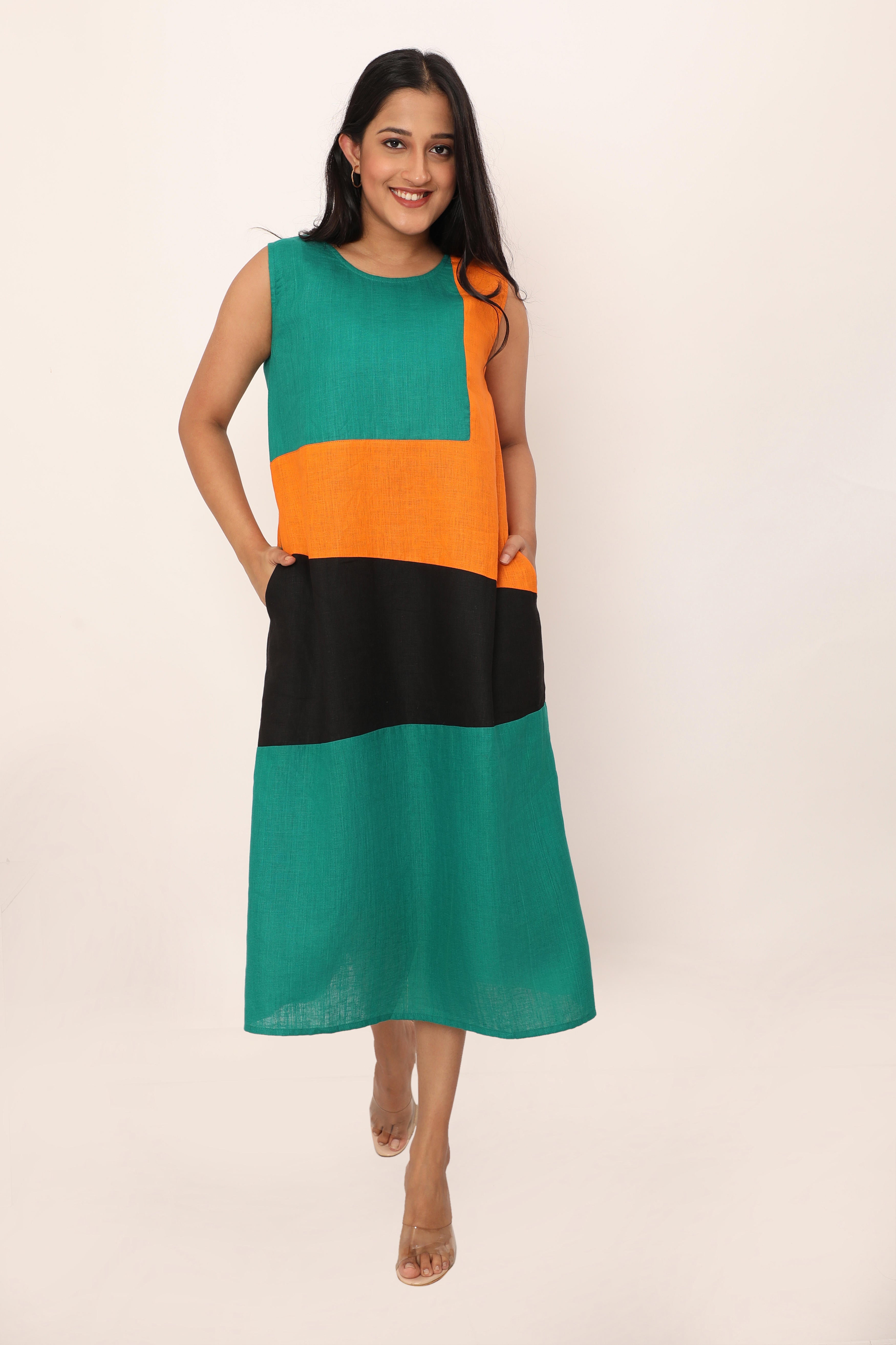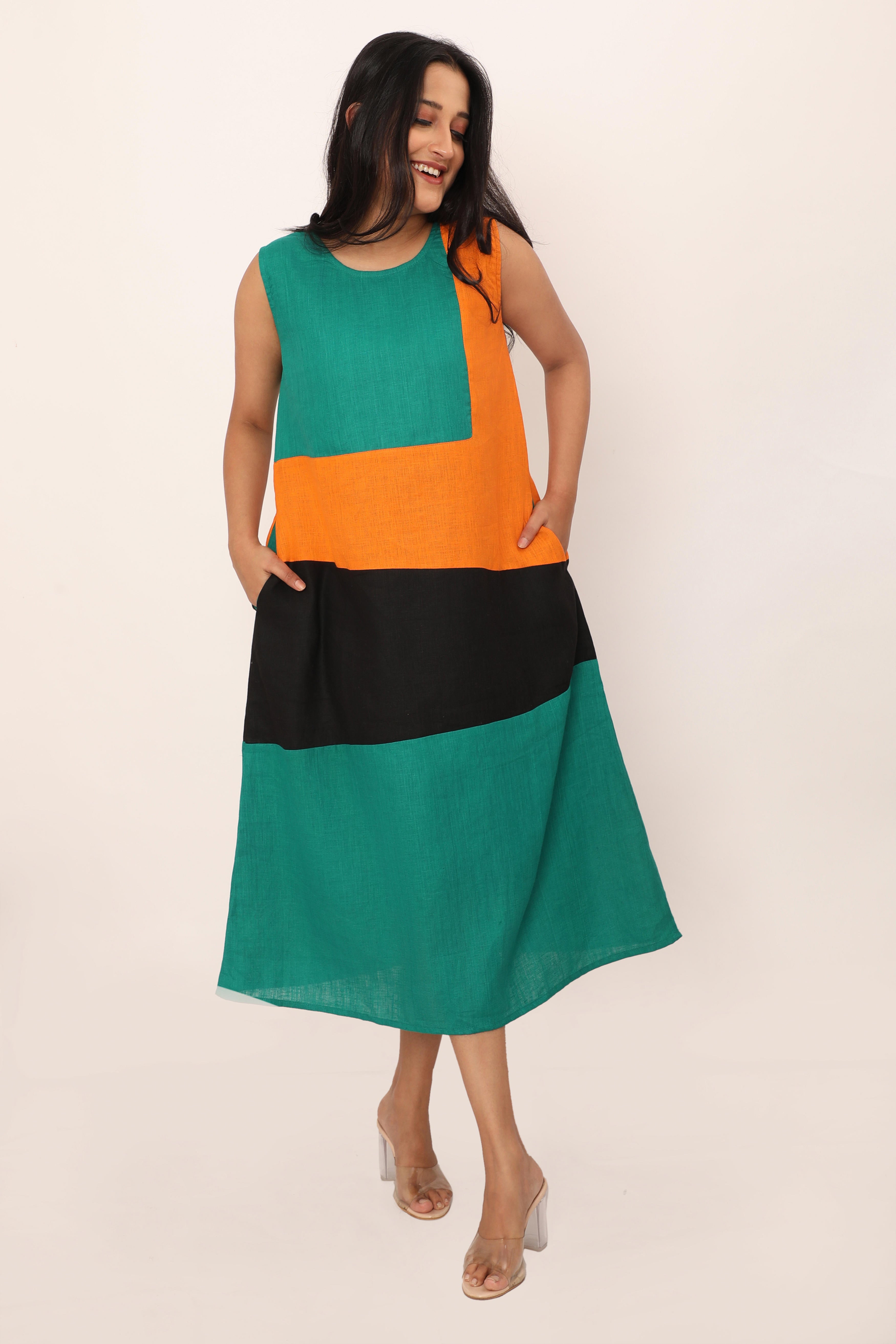 Embrace effortless elegance with the Vesper sleeveless midi dress. The relaxed silhouette and clean lines make it a versatile staple, perfect for both casual outings and more refined occasions. Thoughtfully designed with bold, geometric panels, this piece offers a playful yet polished look. Its breathable fabric ensures all-day comfort, while hidden side pockets add practicality without compromising on style. Pair it with your favourite accessories and step out in timeless ease.