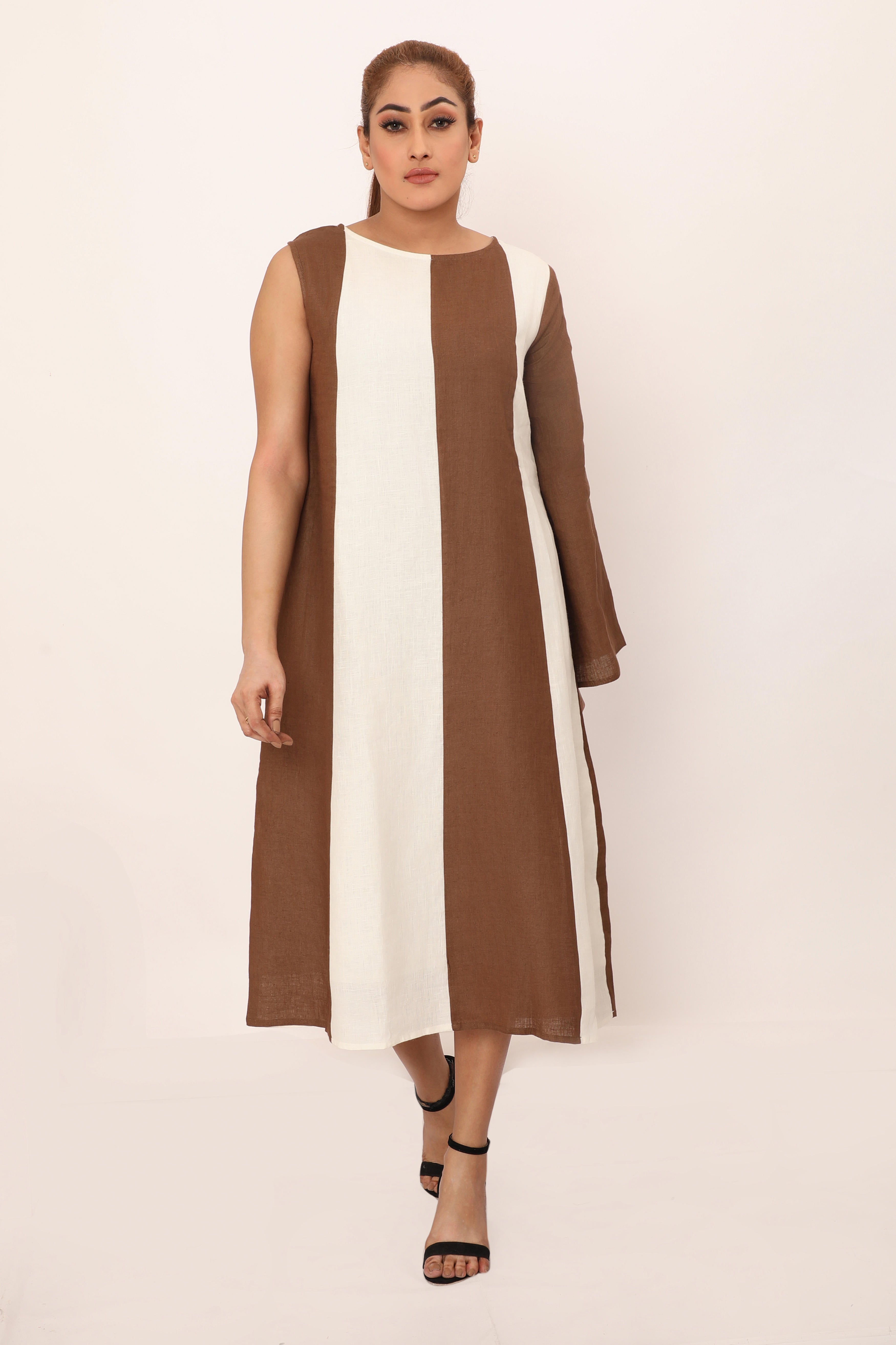 The Victoria dress is a bold statement piece featuring striking vertical panels that elongate the silhouette. With its asymmetrical design and a mix of sleeveless and long sleeve detailing, this dress brings a modern twist to classic linen. The loose fit allows for easy movement, making it perfect for both casual wear and elevated occasions. Crafted from breathable fabric, this piece combines comfort and style effortlessly, allowing you to stand out in any setting.