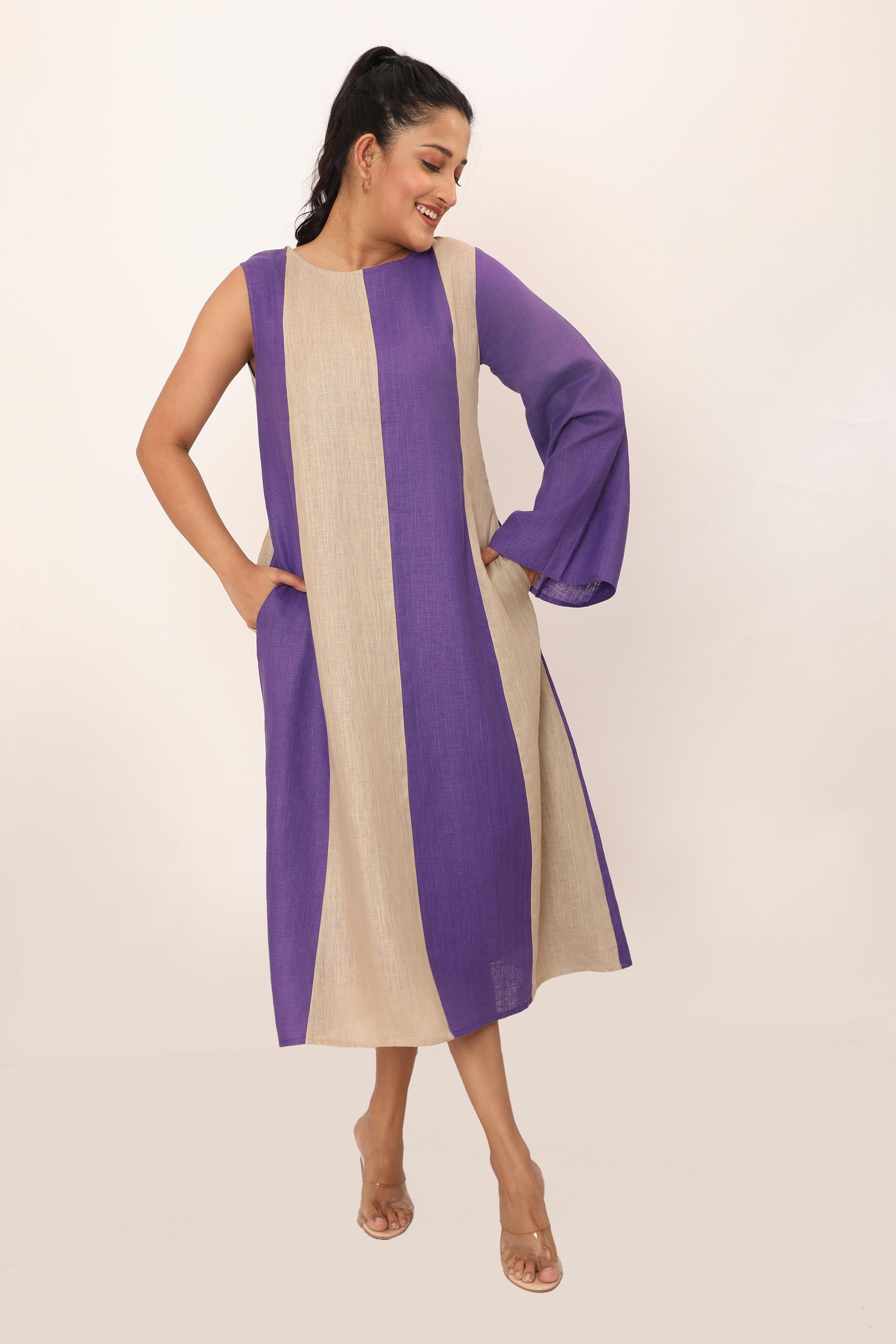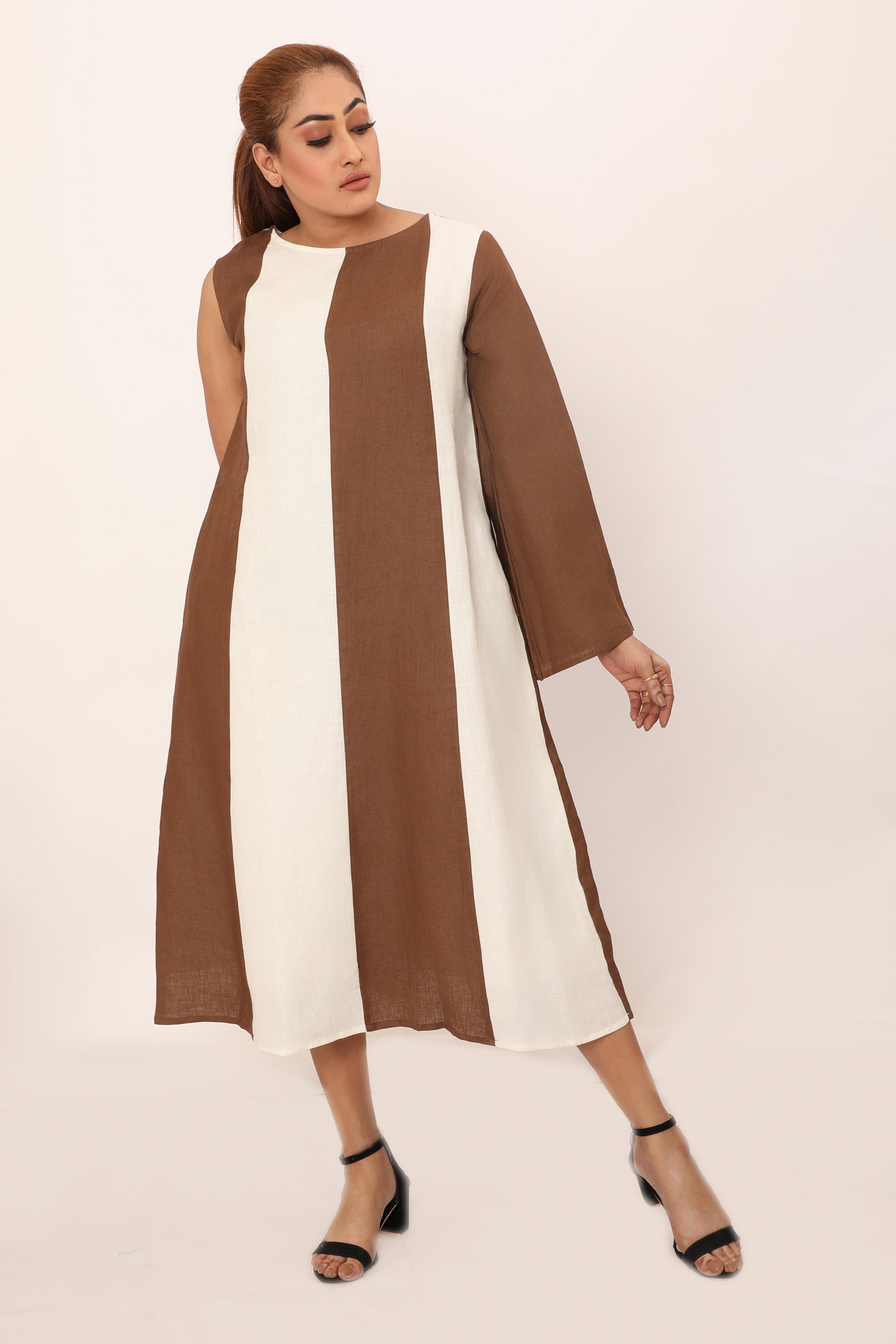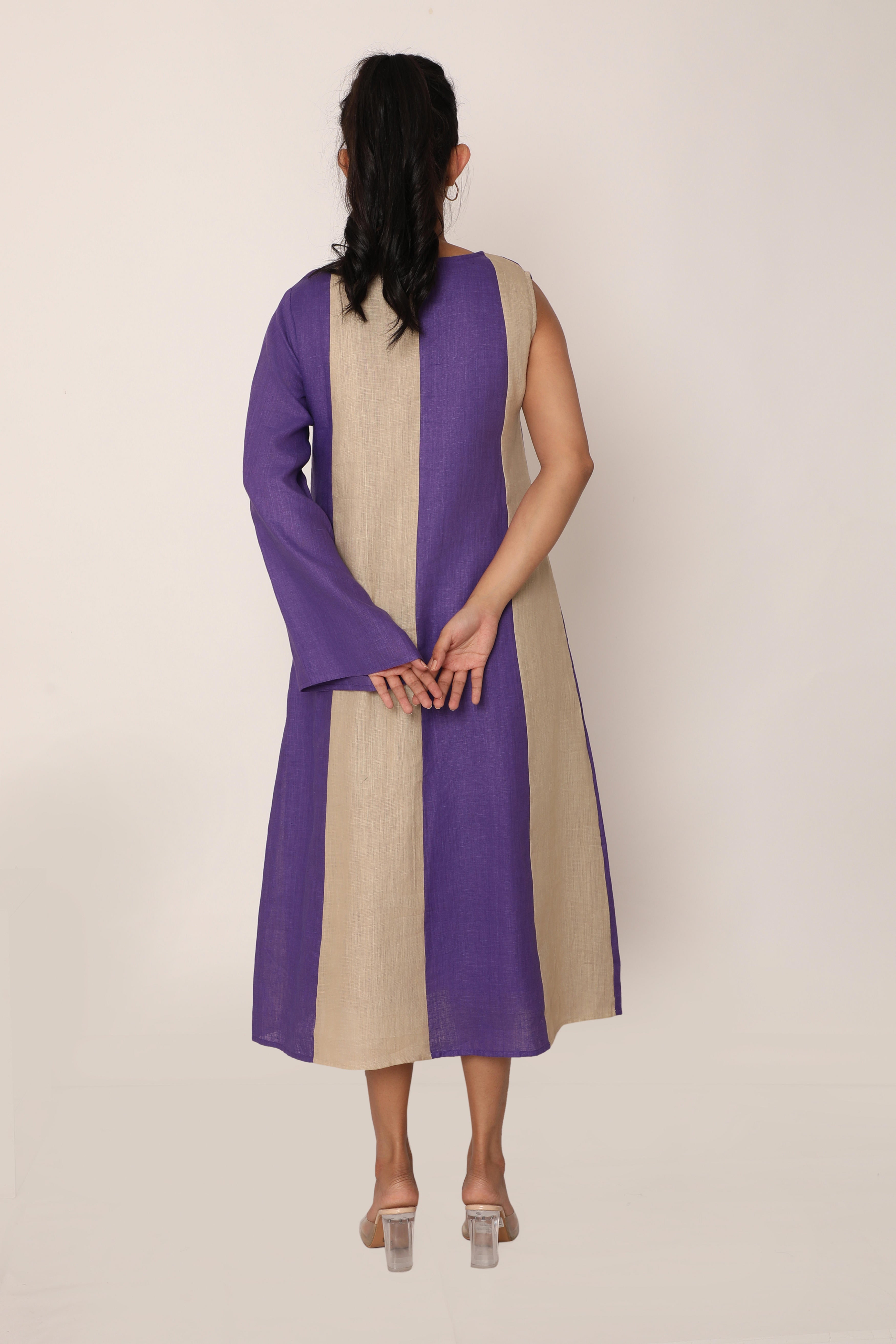 The Victoria dress is a bold statement piece featuring striking vertical panels that elongate the silhouette. With its asymmetrical design and a mix of sleeveless and long sleeve detailing, this dress brings a modern twist to classic linen. The loose fit allows for easy movement, making it perfect for both casual wear and elevated occasions. Crafted from breathable fabric, this piece combines comfort and style effortlessly, allowing you to stand out in any setting.