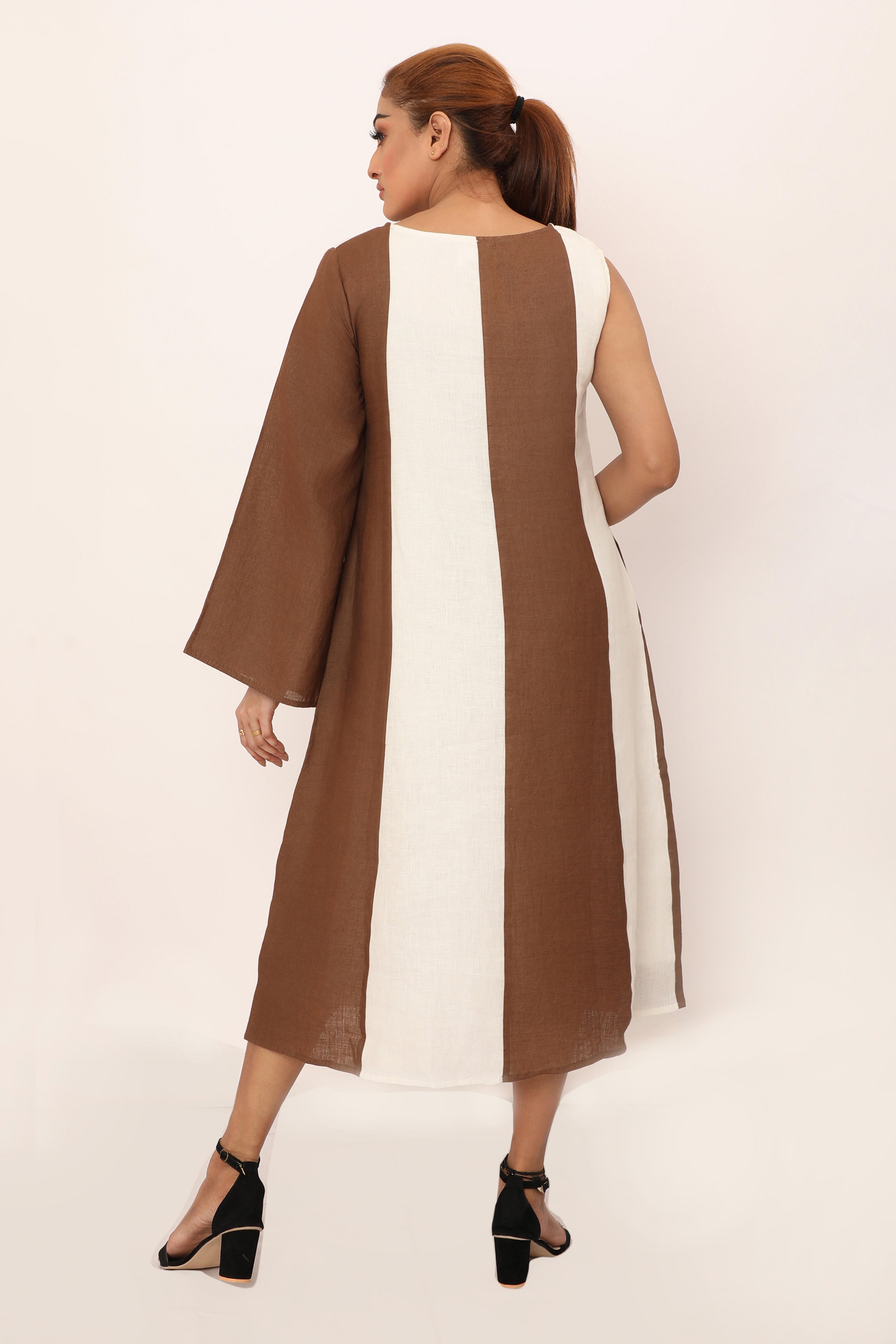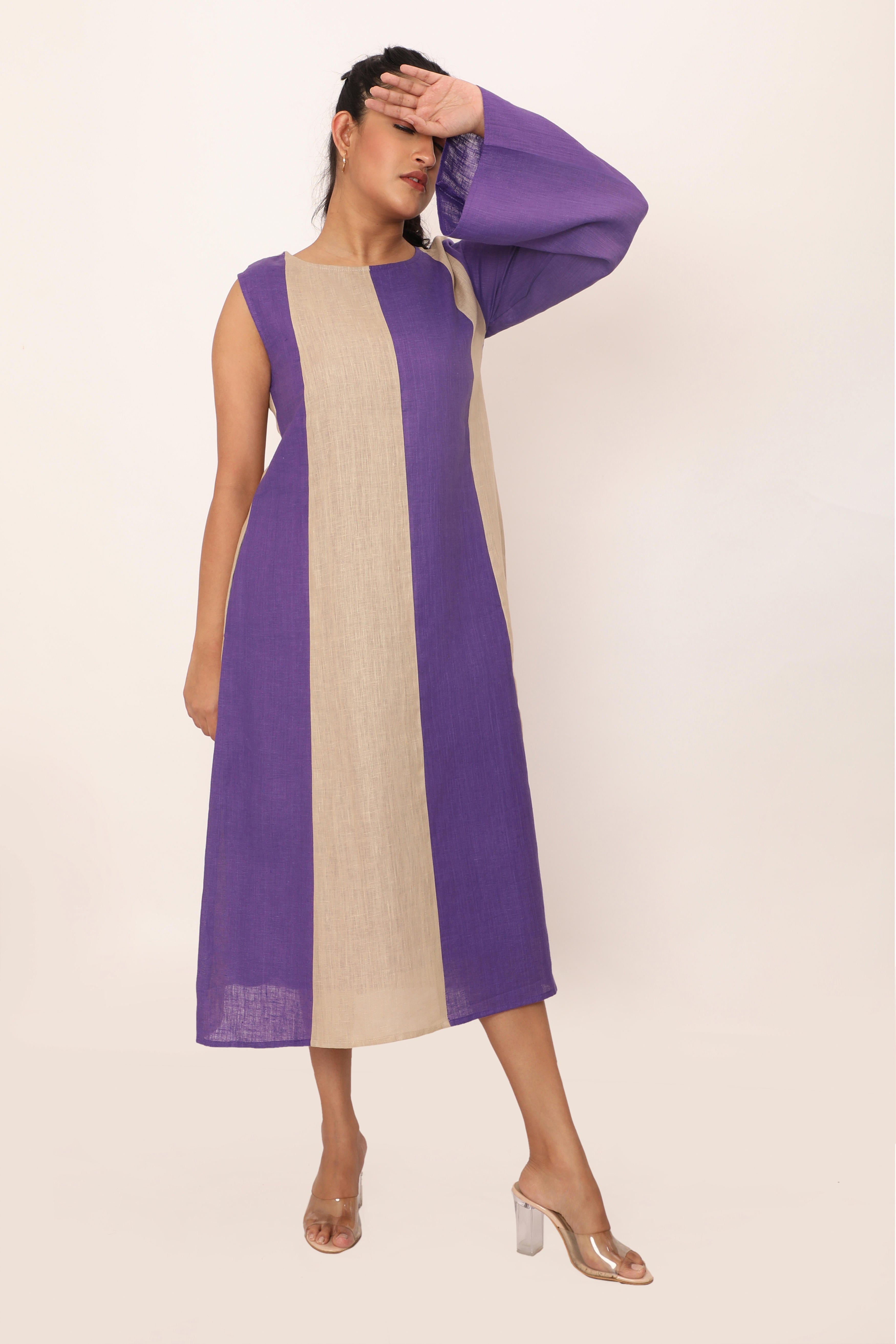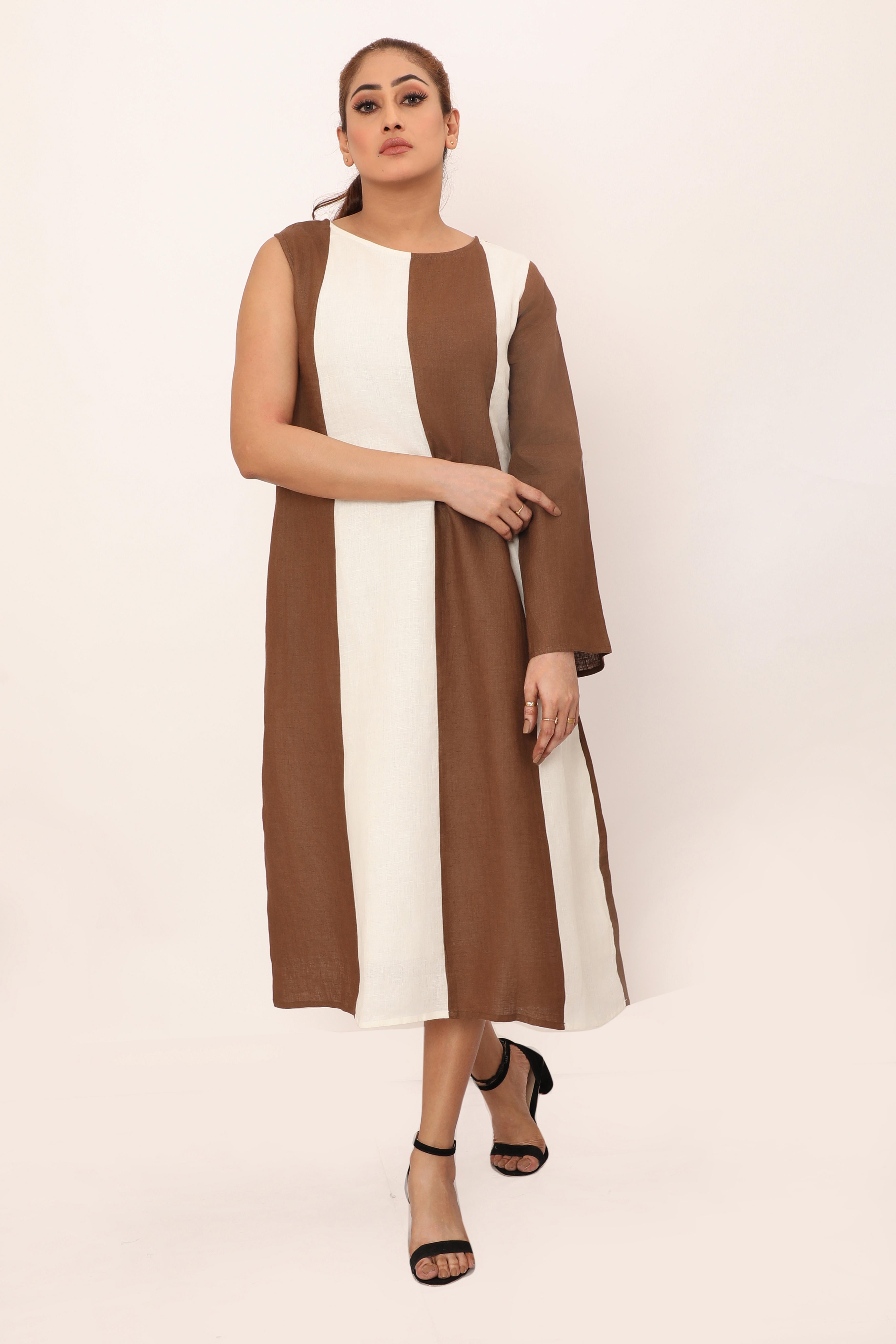 The Victoria dress is a bold statement piece featuring striking vertical panels that elongate the silhouette. With its asymmetrical design and a mix of sleeveless and long sleeve detailing, this dress brings a modern twist to classic linen. The loose fit allows for easy movement, making it perfect for both casual wear and elevated occasions. Crafted from breathable fabric, this piece combines comfort and style effortlessly, allowing you to stand out in any setting.