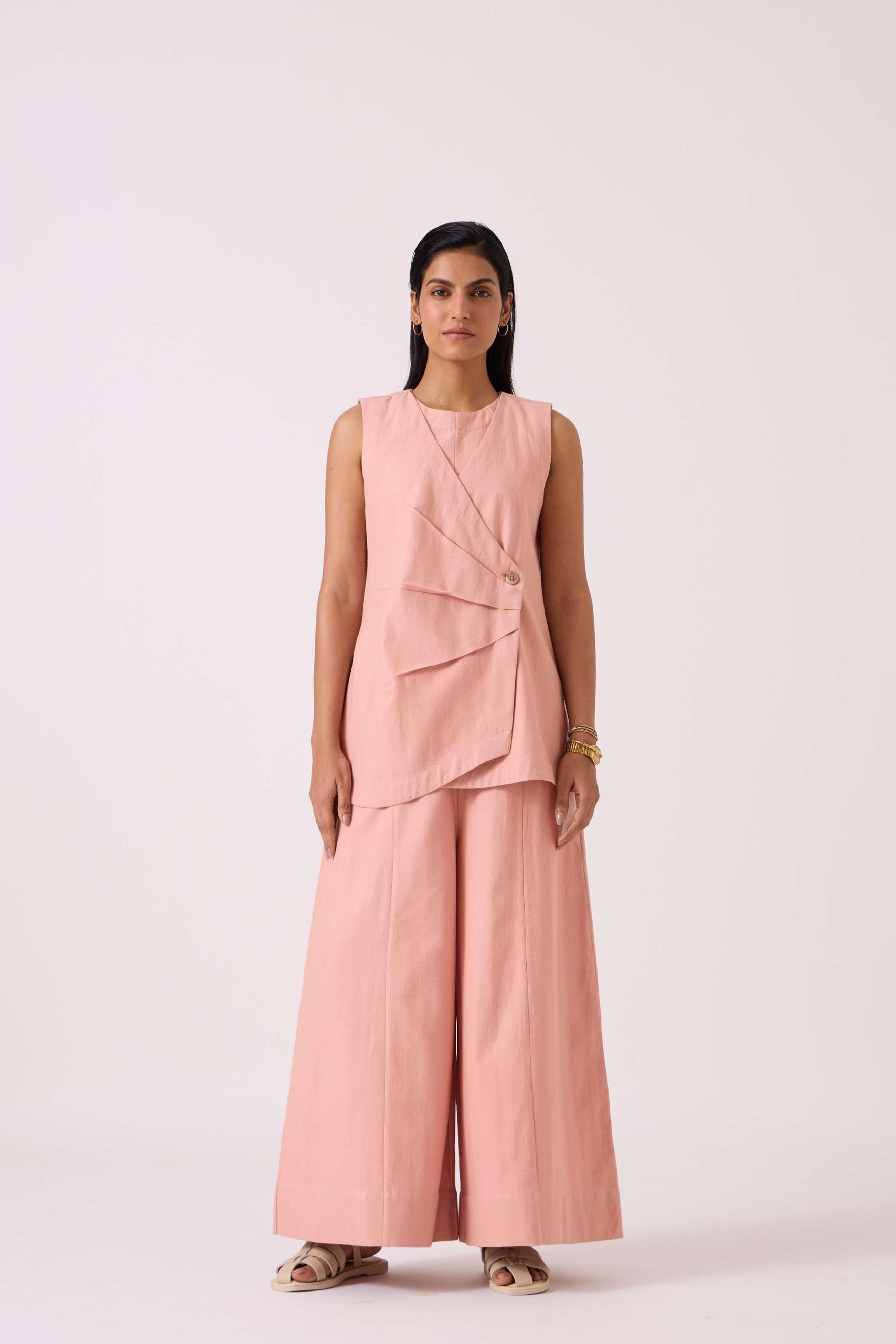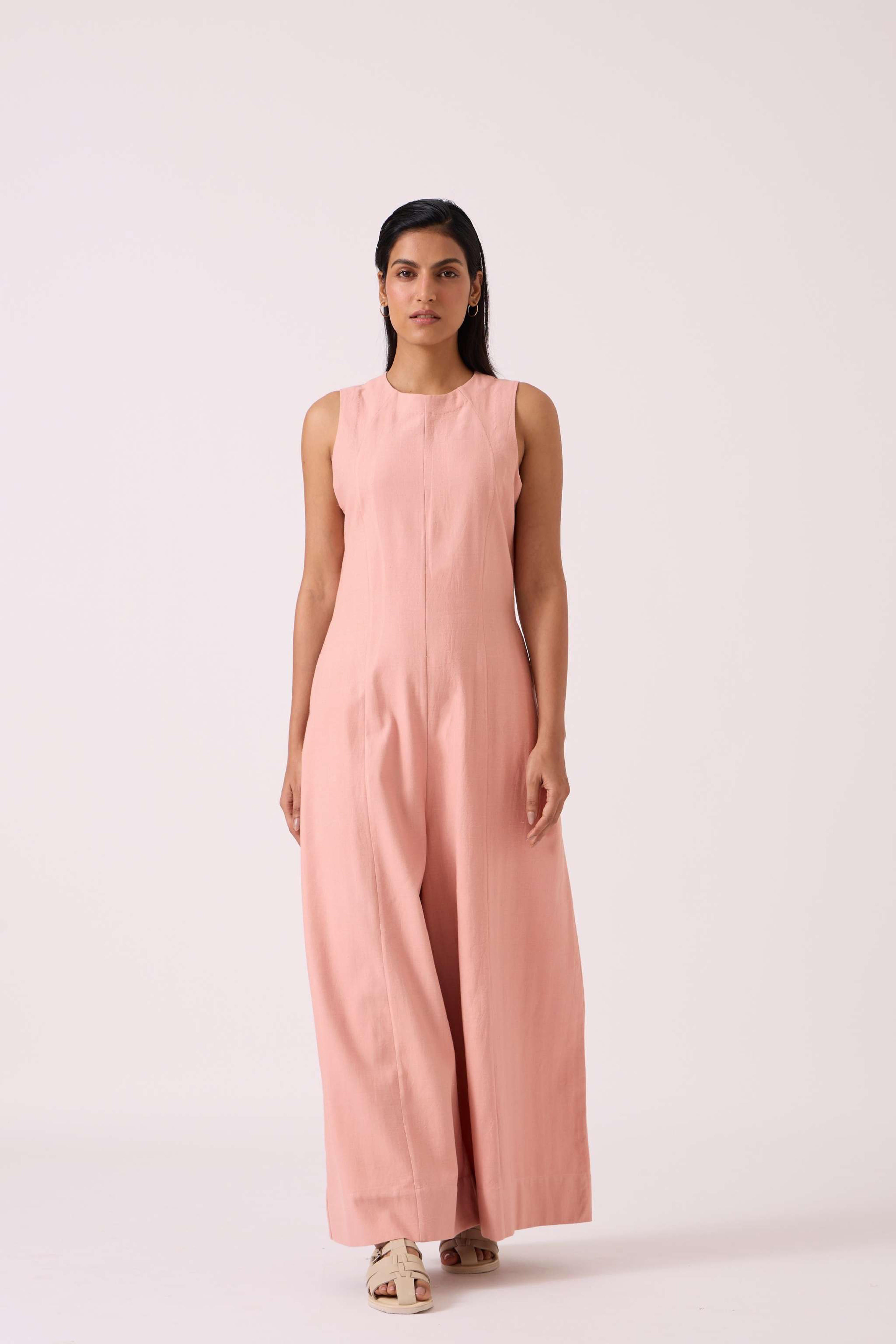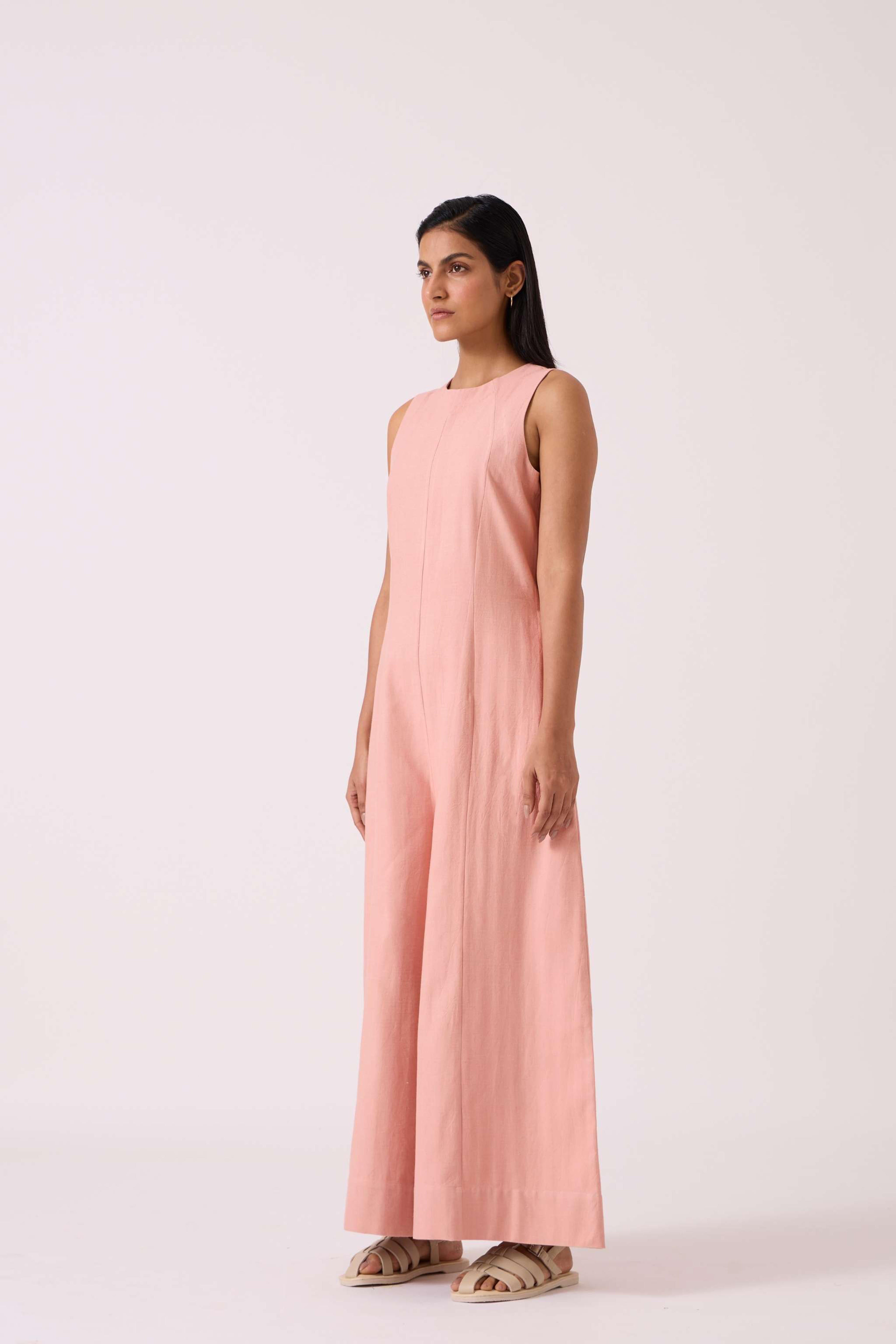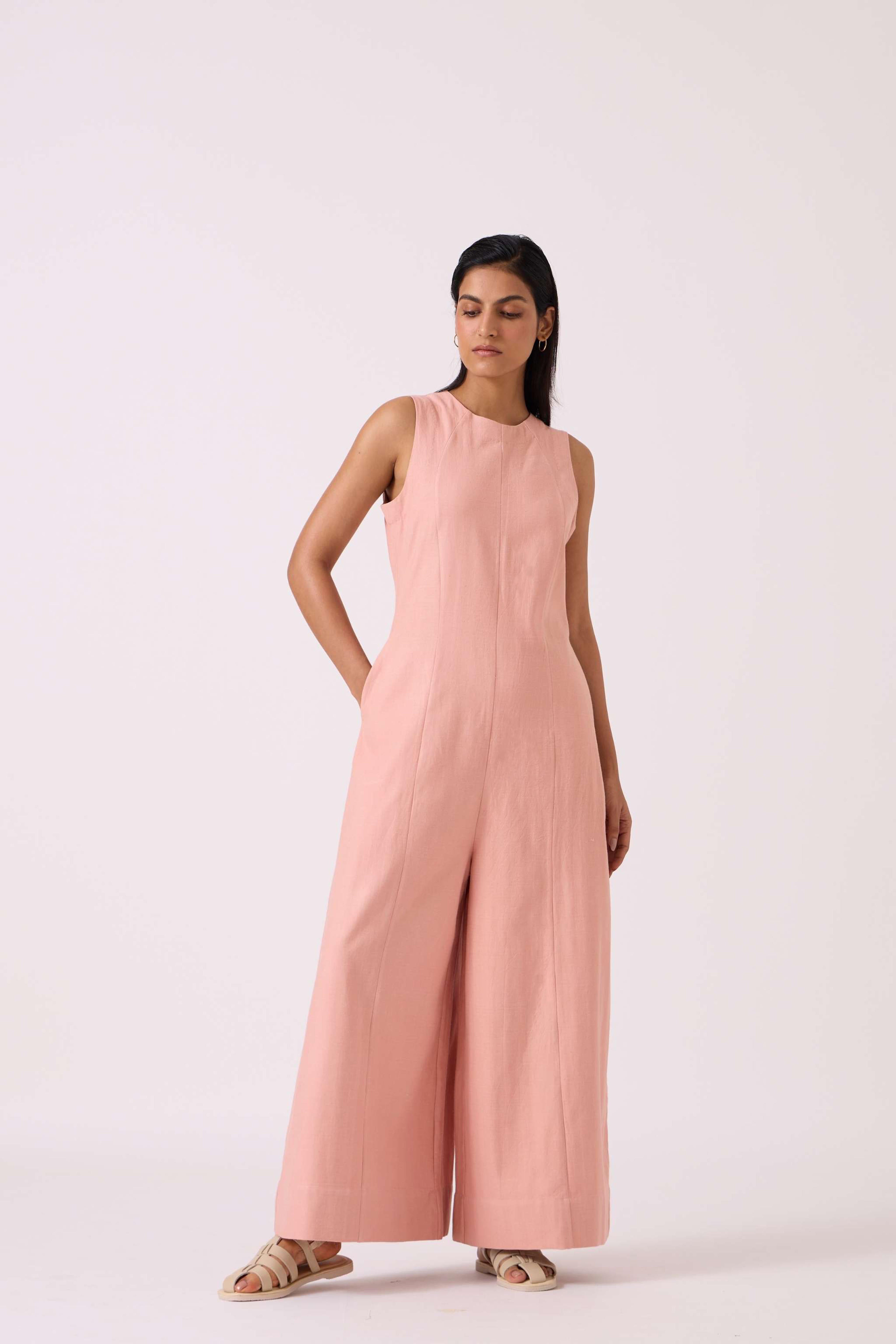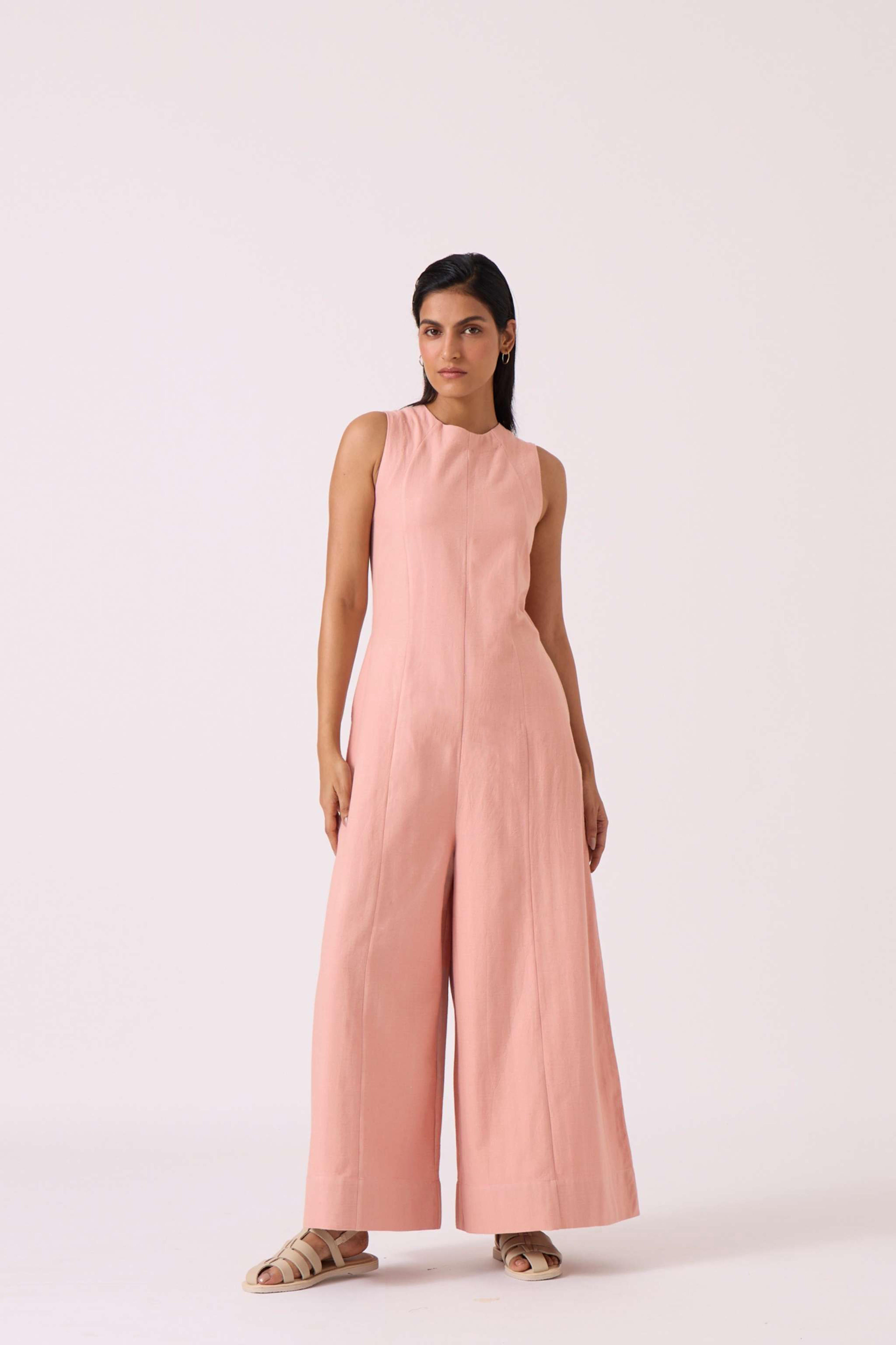 This dapper *slim-fit jumpsuit* is crafted from handwoven *cotton twill*. It features an easy, *wide-leg* design that creates a *fit and flare silhouette*, and includes practical *in-seam pockets*. The jumpsuit fastens with a *back zip*. The fabric is a unique design developed in-house and *handwoven by artisans in Bengal*. The model, Chhavi, is 5'6" and is wearing a size XS.