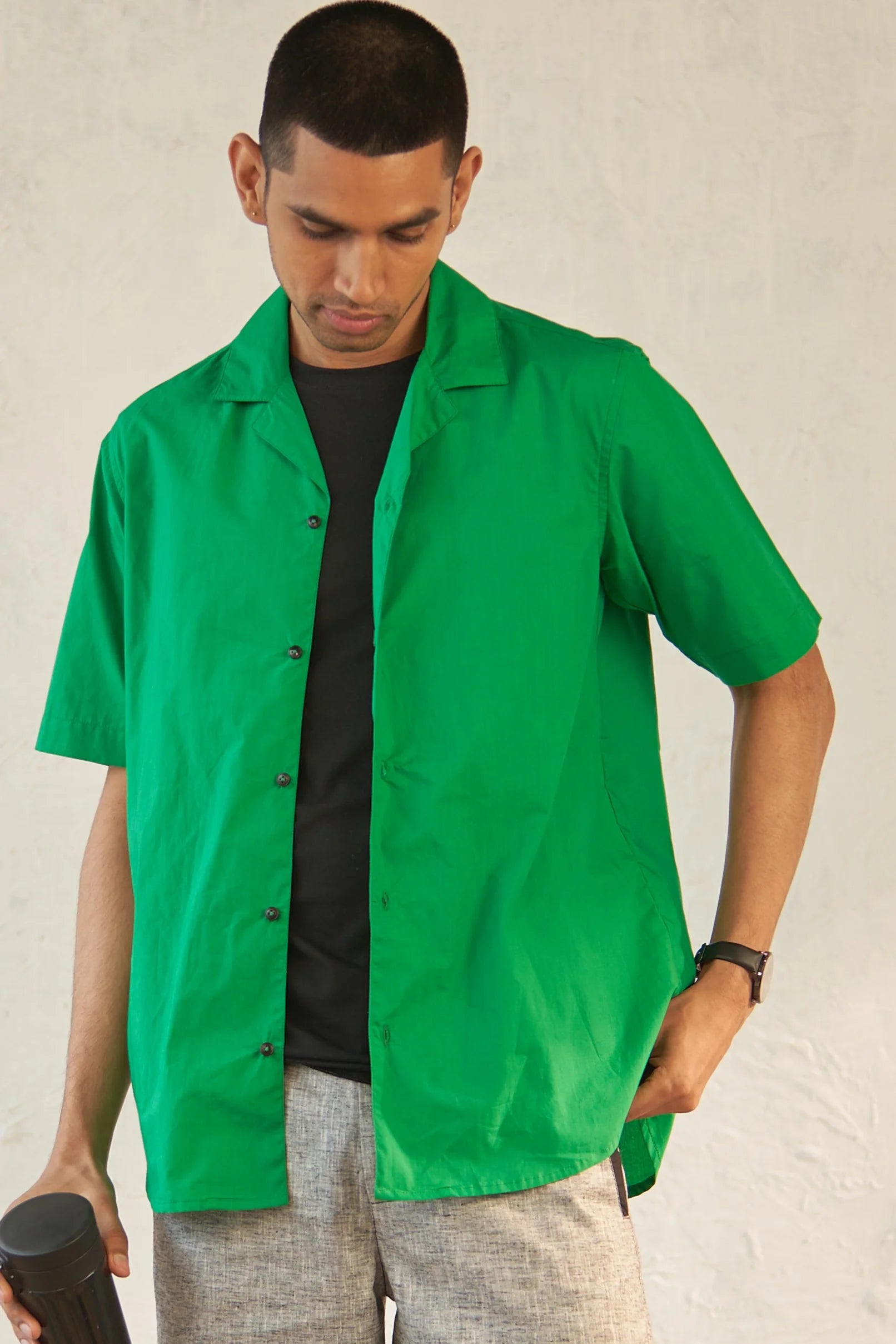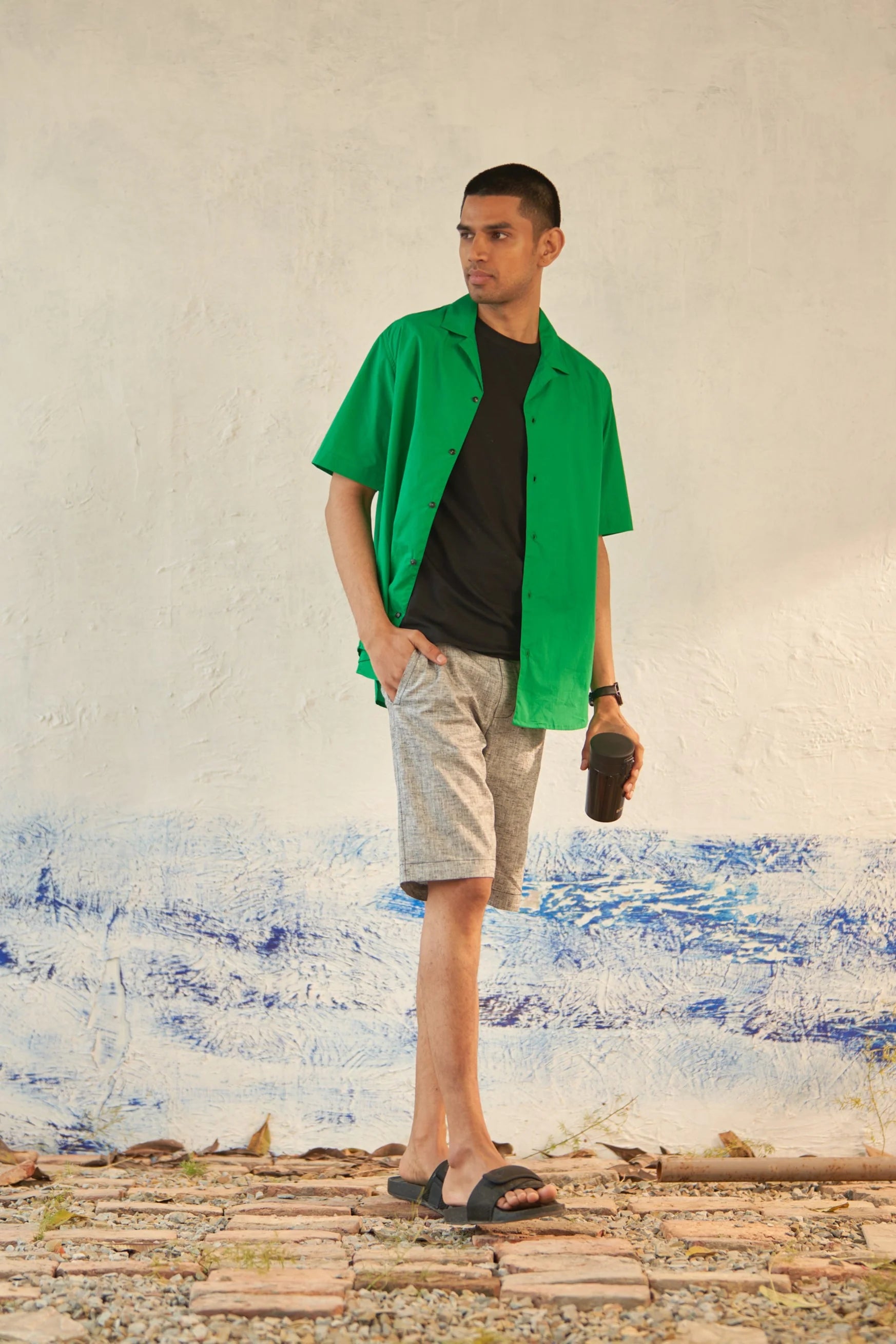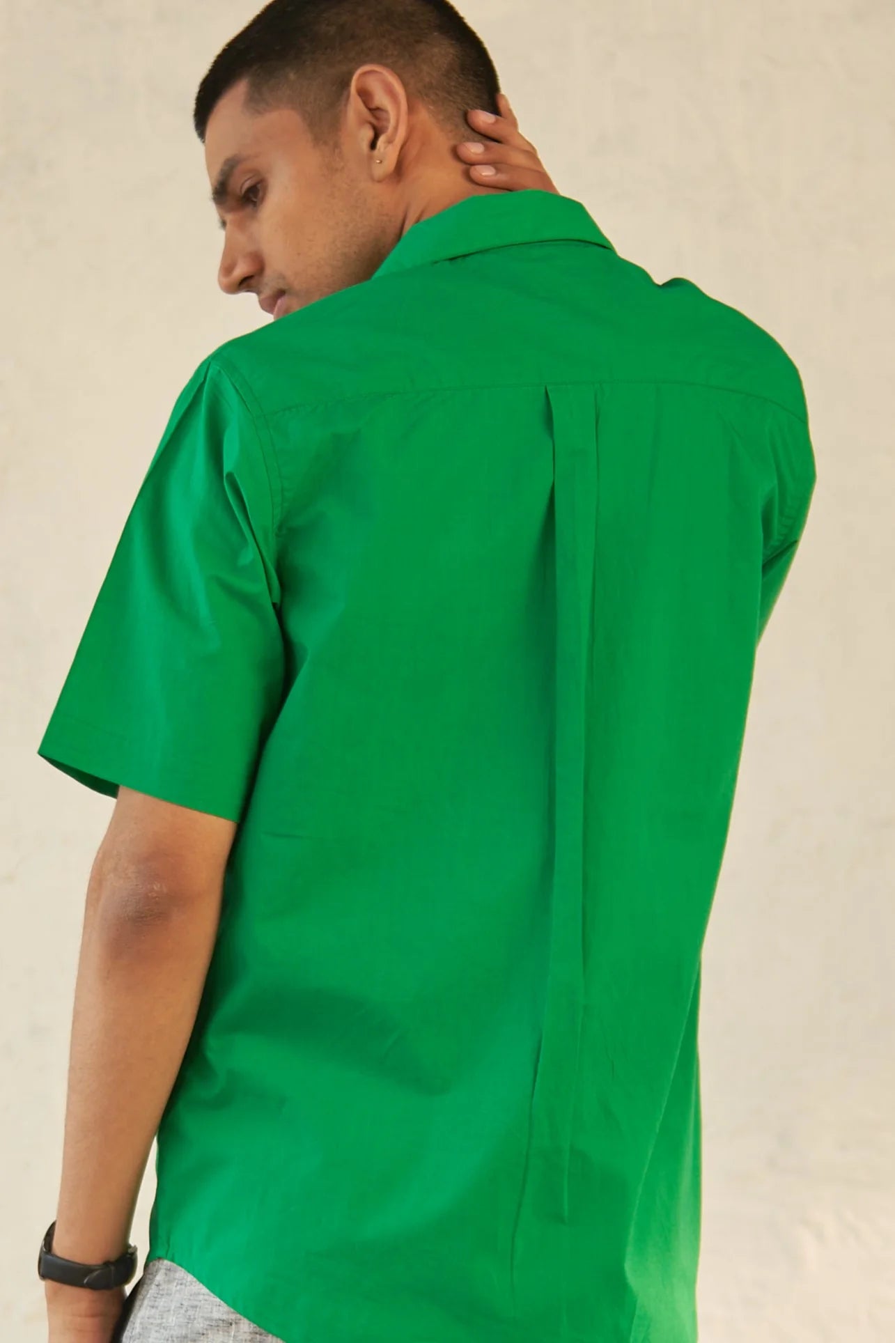 A holiday essential in a captivating green hue, this shirt is a must-have for any vacation wardrobe. Its short sleeves and camp collar setting exude laid-back charm, perfect for leisurely days under the sun. The addition of black buttons and inverted broad plackets adds a touch of sophistication and elevates the style quotient of the ensemble. Whether you're lounging by the pool or exploring a new destination, this shirt effortlessly combines comfort and style, making it a versatile staple for your holiday adventures.