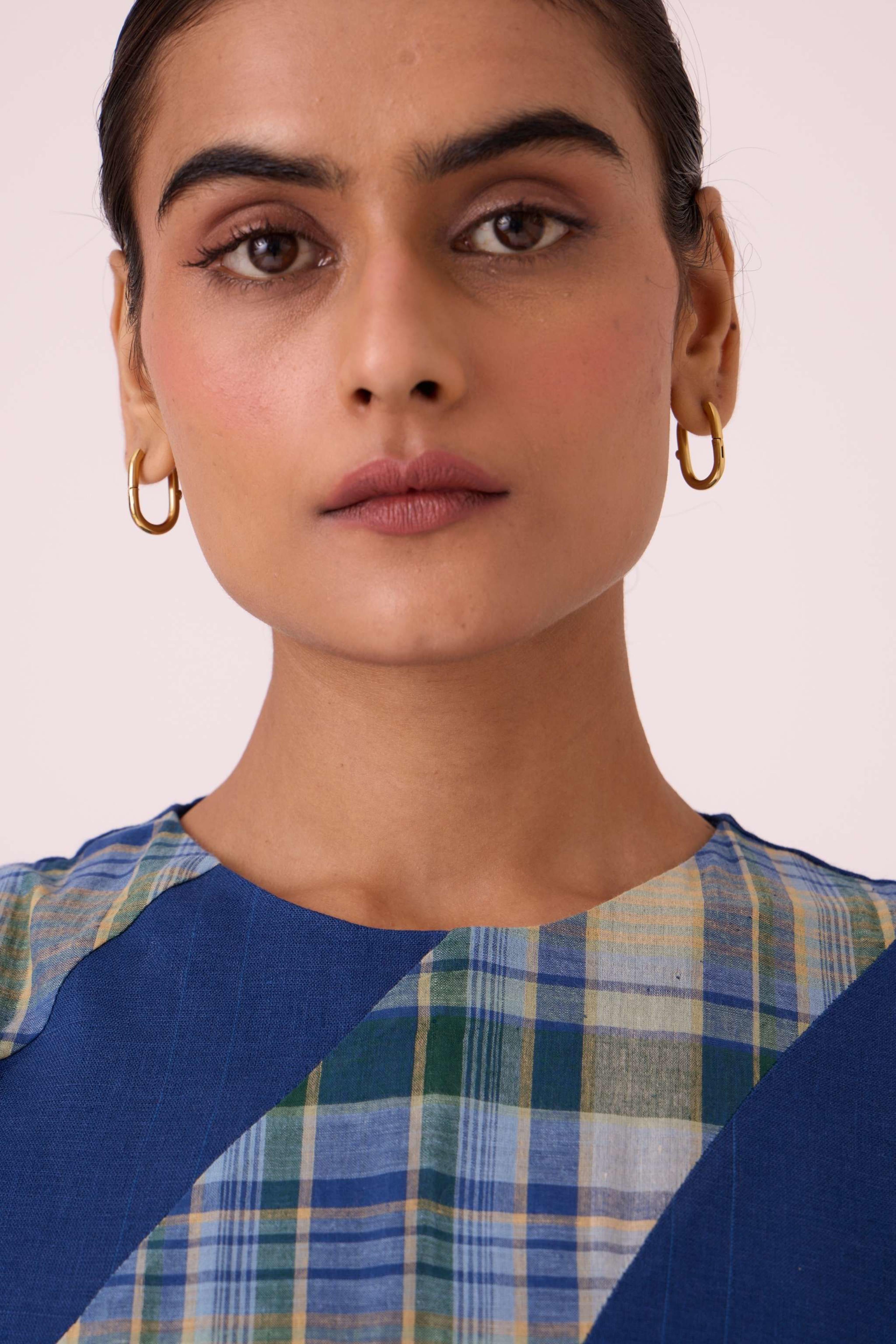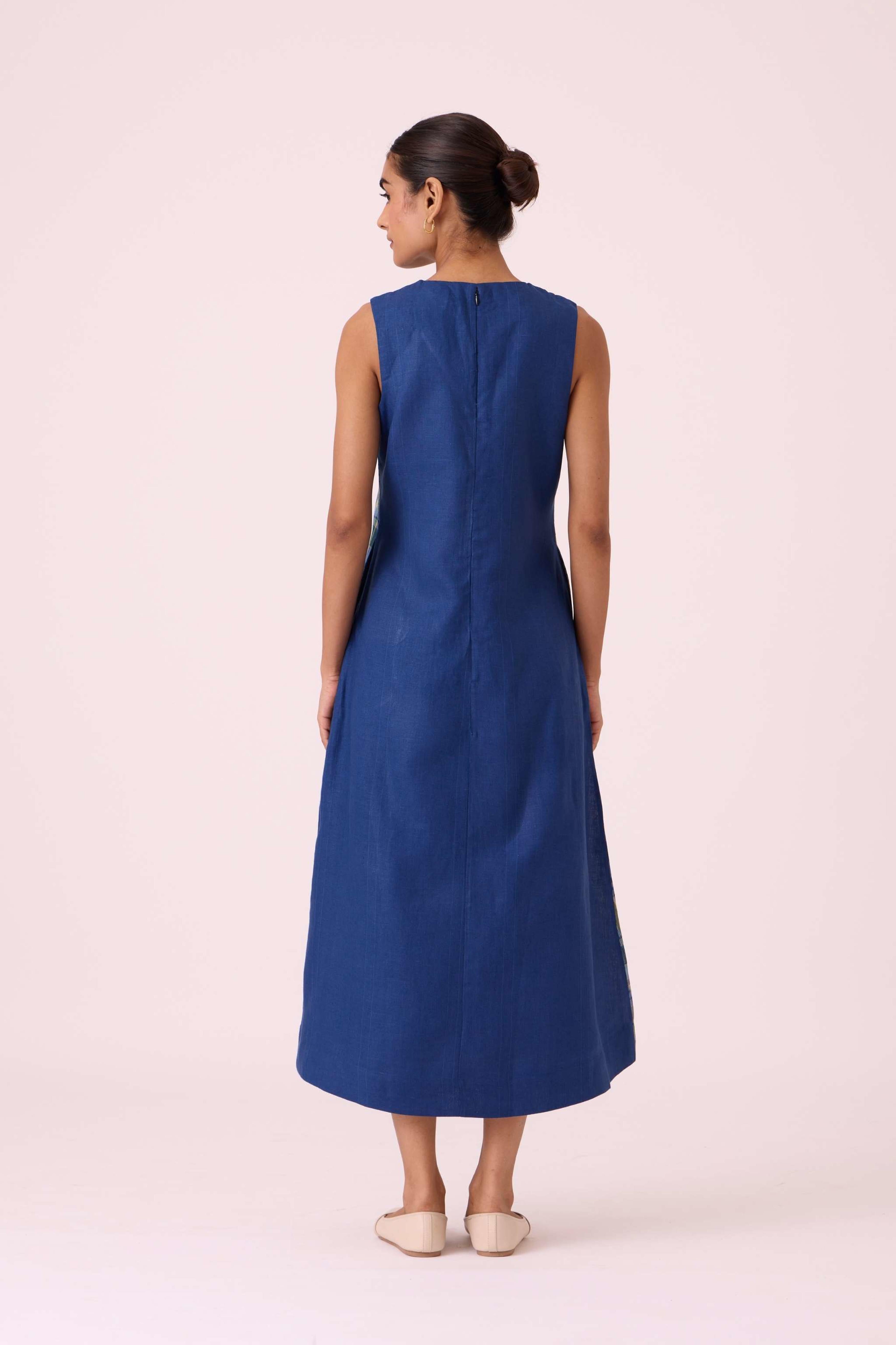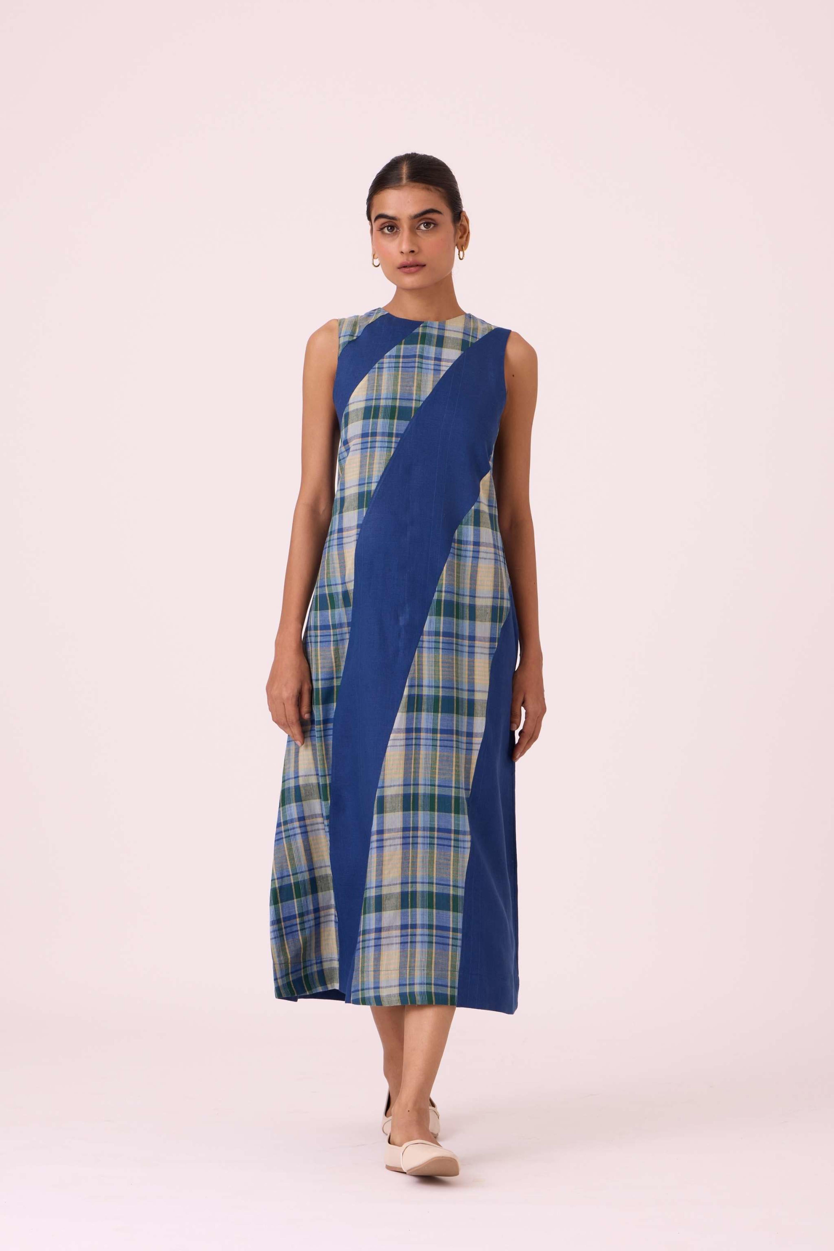 This *sleeveless, slim-fit dress* features a stylish *round neck* and an *asymmetric panel detail*. For practicality, it includes *in-seam pockets* and a *back zip fastening*. The dress is *fully lined* for comfort and a smooth drape. The fabric is a unique design developed in-house and *handwoven by artisans in Bengal*. The model, Chhavi, is 5'6" and is wearing a size XS.