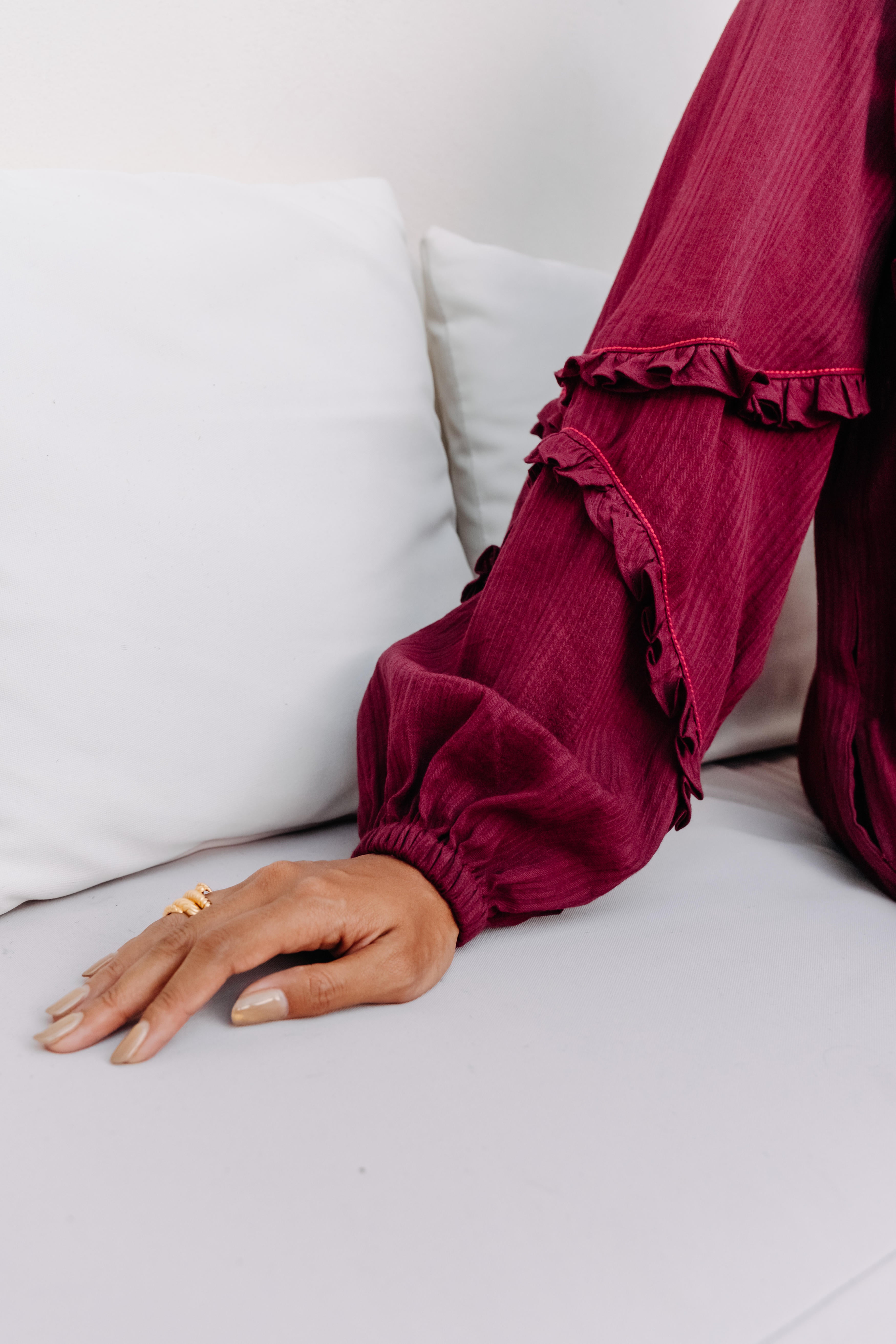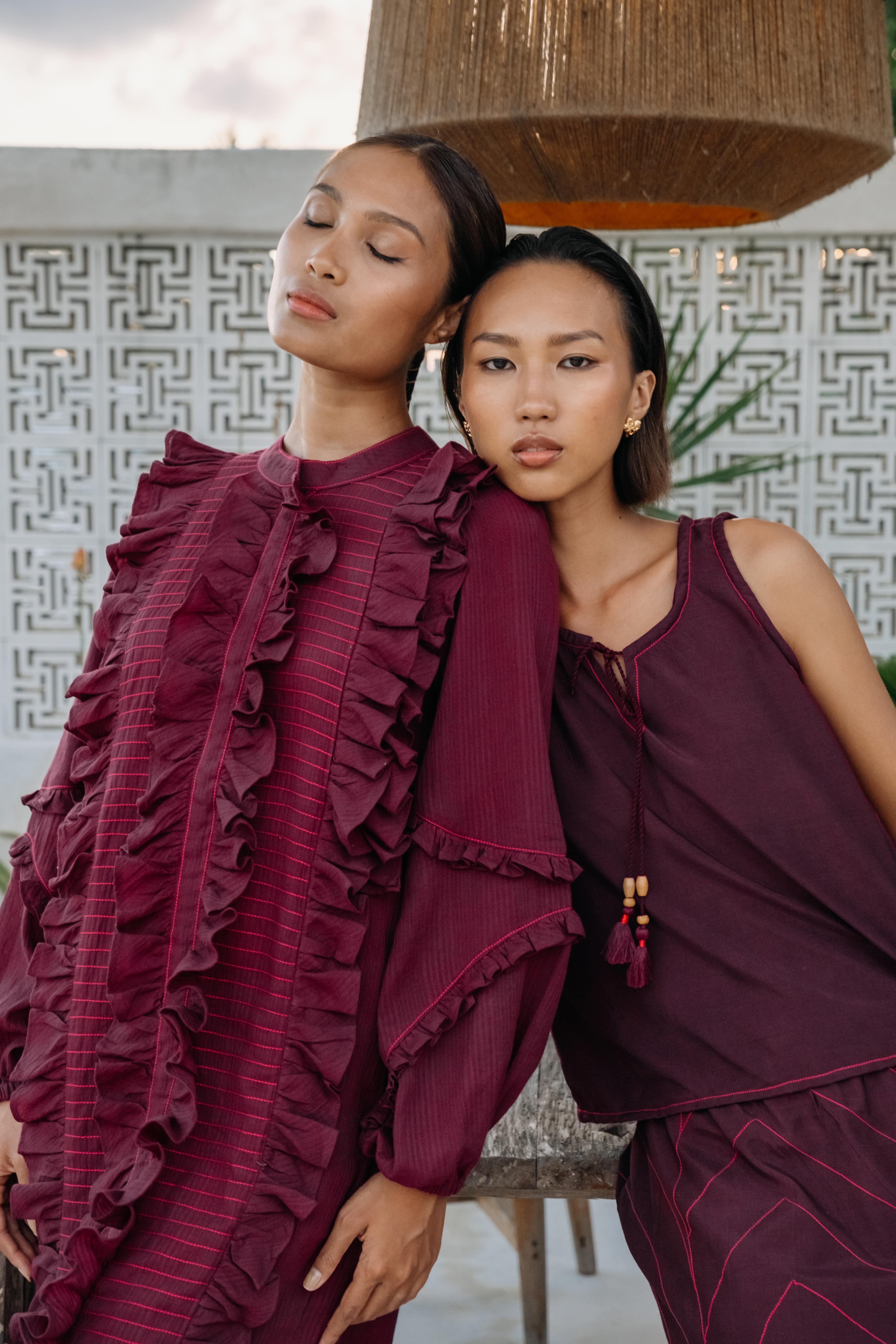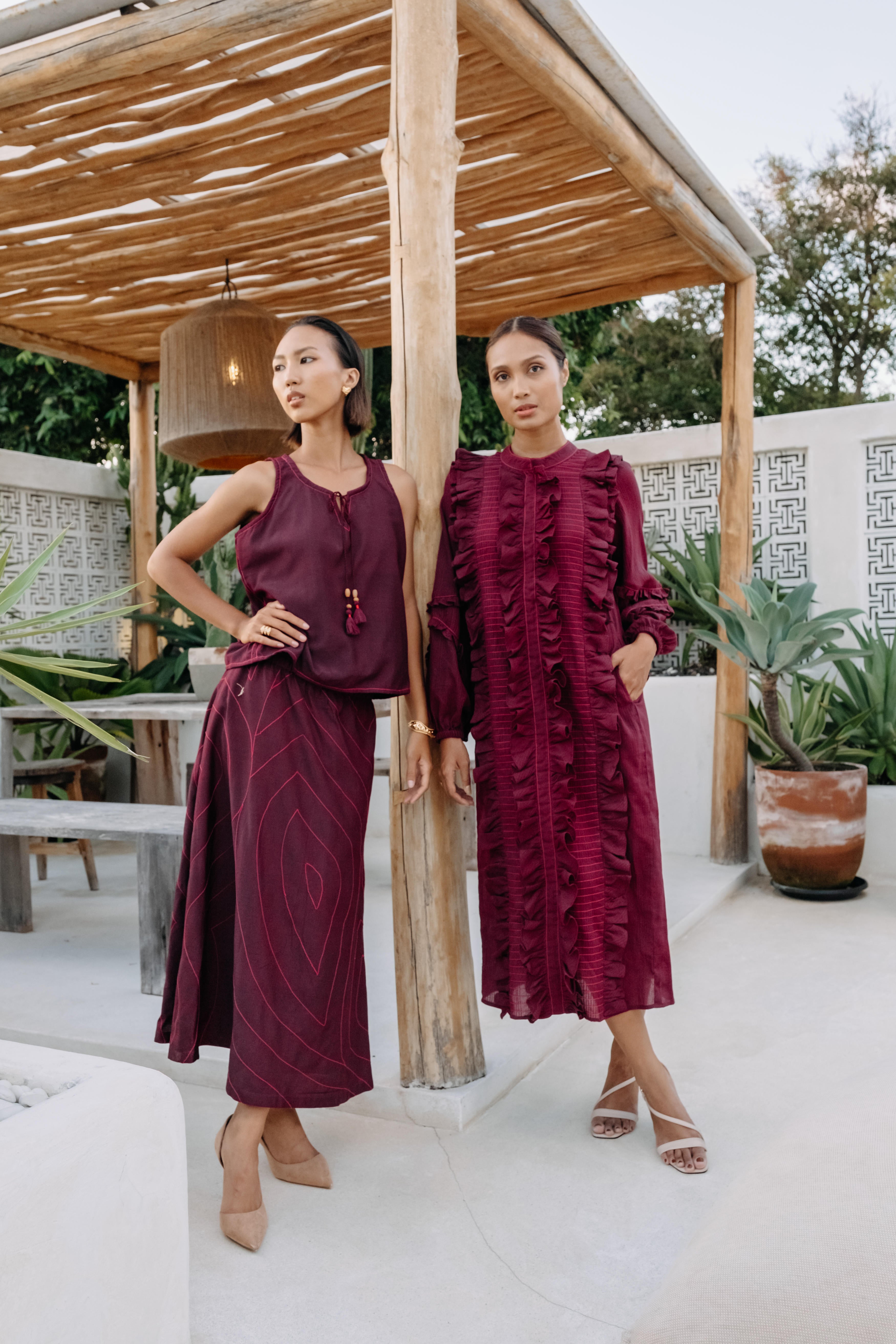 A Straight Fit Midi Dress with ruffles down the front and elasticated ruffled sleeves with side inseam pockets. Highlighted with contrast stitch details and tagai. Indulge in the soft sophistication of our relaxed, handcrafted Whimsy dress. This product will be exclusively handcrafted for you, making the pattern/texture/color slightly vary from the image shown, due to multiple artisan led techniques and processes involved. Color may also slightly vary due to photographic lighting sources. Length: 48"