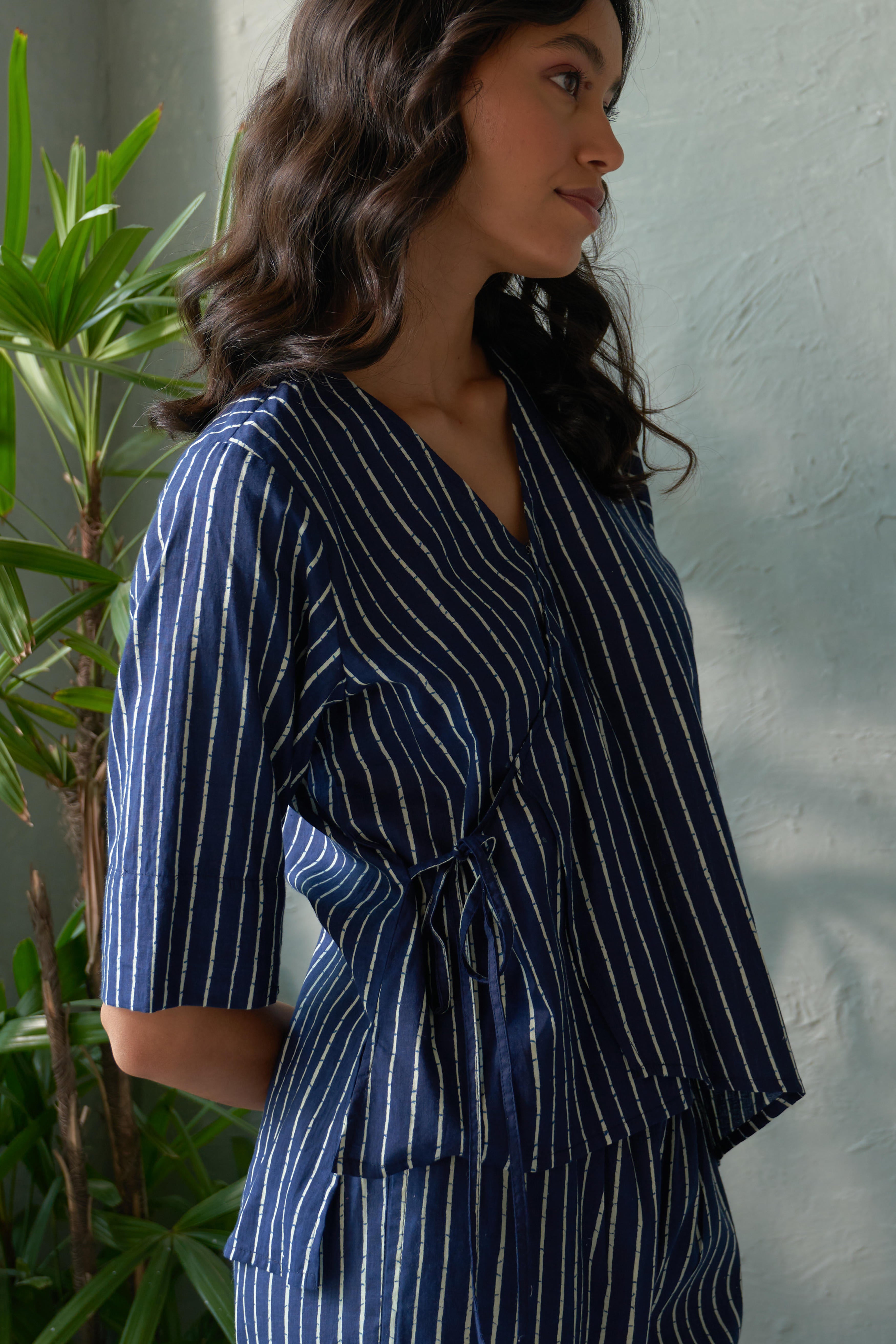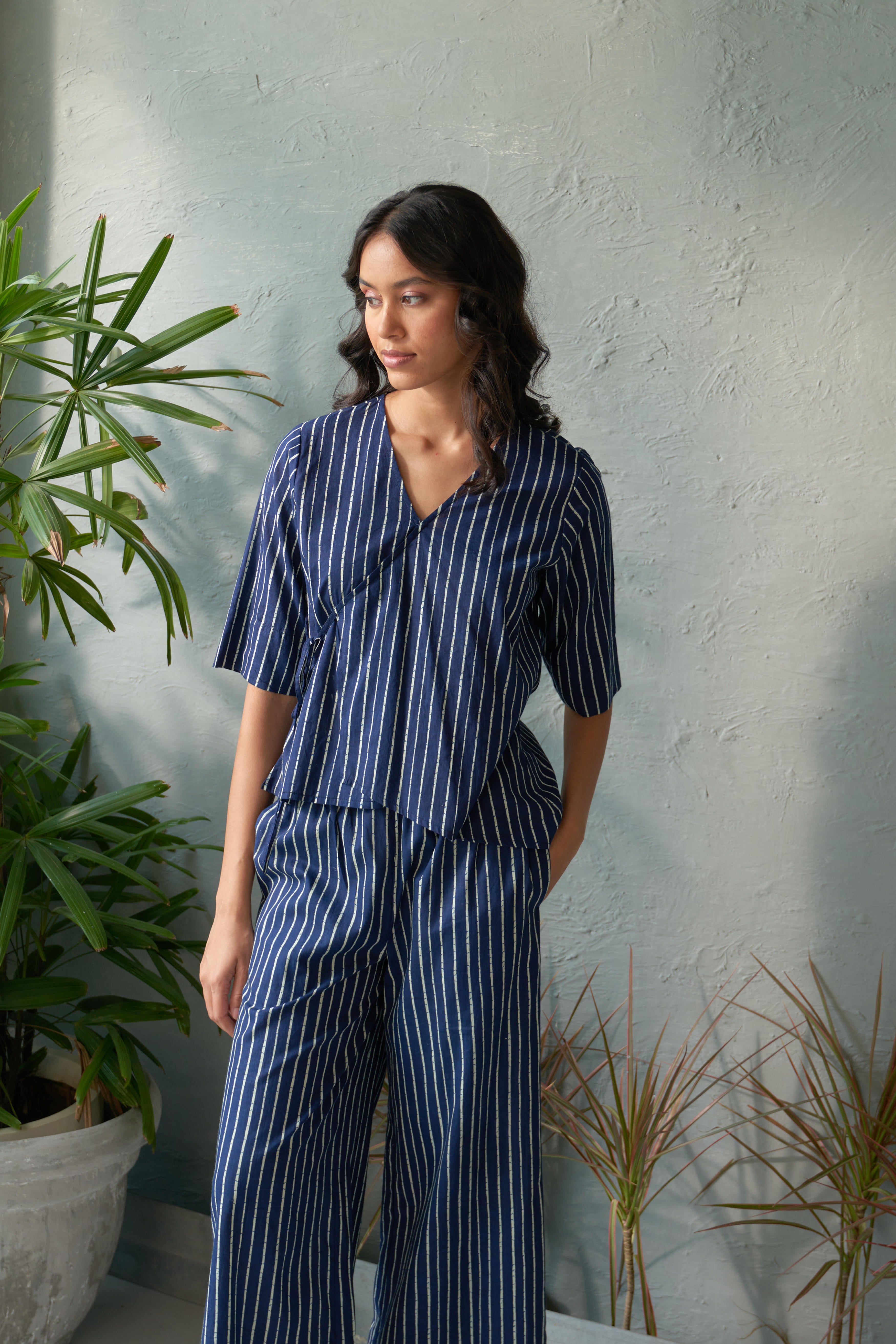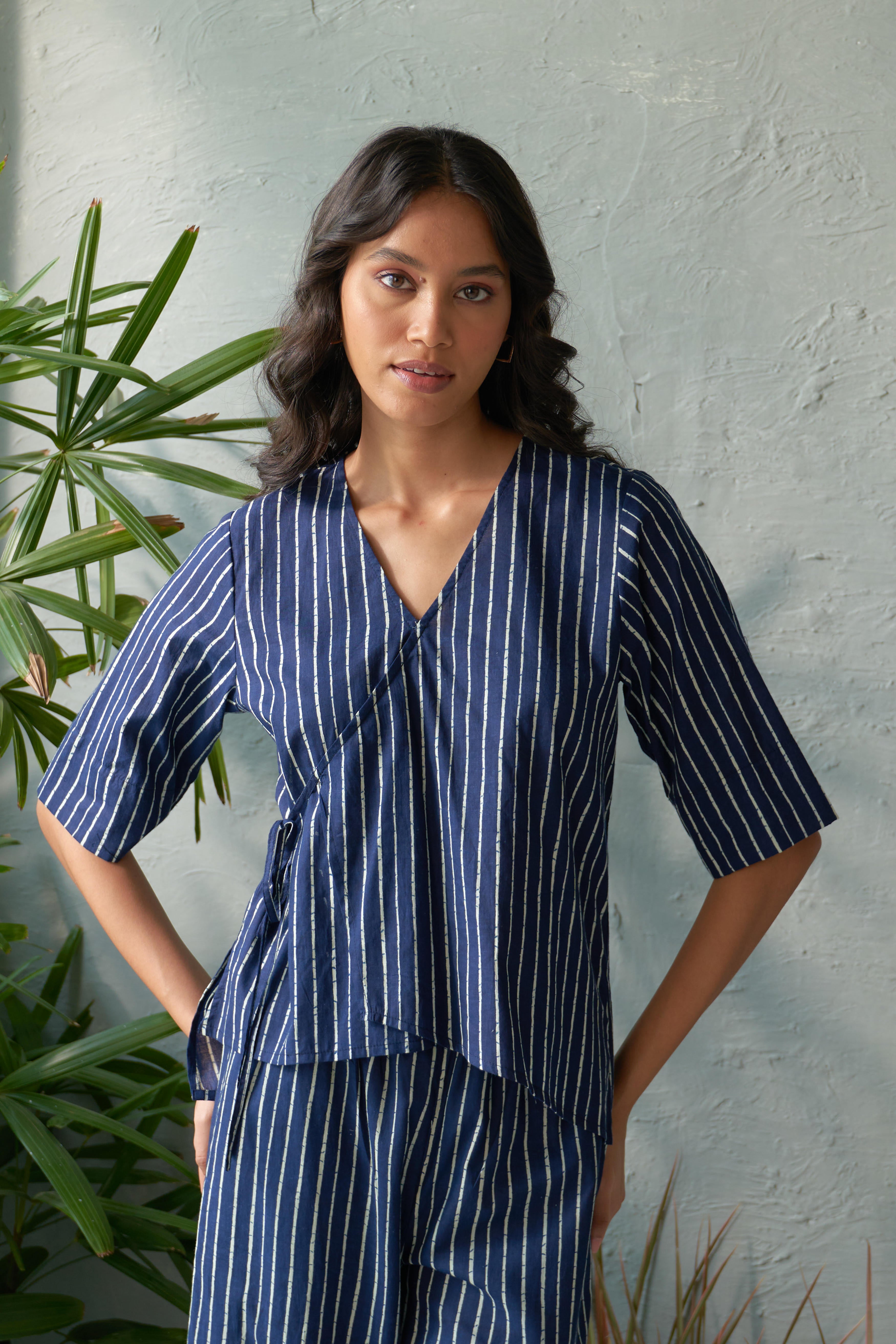 Stay chic and comfortable with the Breeze Wrap Top, crafted from lightweight, breathable cotton in an indigo stripe print. This elegant design features a flattering V-neckline and a side string tie-up for an adjustable, figure-enhancing fit. Perfect for casual outings or a stylish daytime look, the Breeze Wrap Top effortlessly pairs with jeans, skirts, or shorts for a fresh and fashionable ensemble.