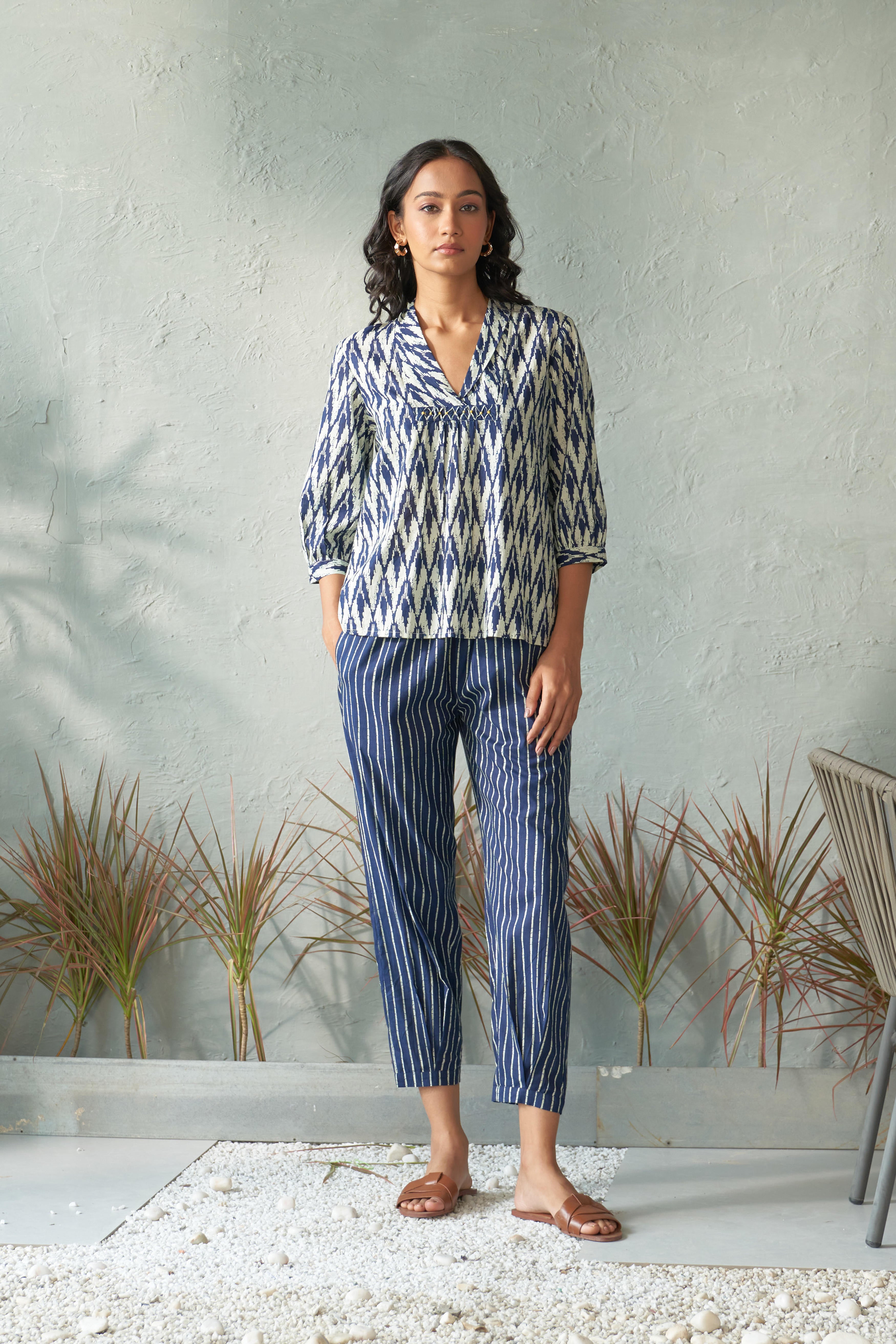 The Cascade set is the perfect combination of relaxed sophistication and chic styling. The Breeze Top, crafted from lightweight cotton with a delicate chevron print, showcases a flattering V-neckline, subtle smocking details at the front, and 3/4th sleeves for an elegant yet casual look. Paired with complementing pleated stripe pants, this co-ord set strikes the perfect balance between structure and comfort. The elasticated waistband and drawstring on the bottoms ensure a customizable fit, making it an ideal outfit for effortless day-to-night transitions.